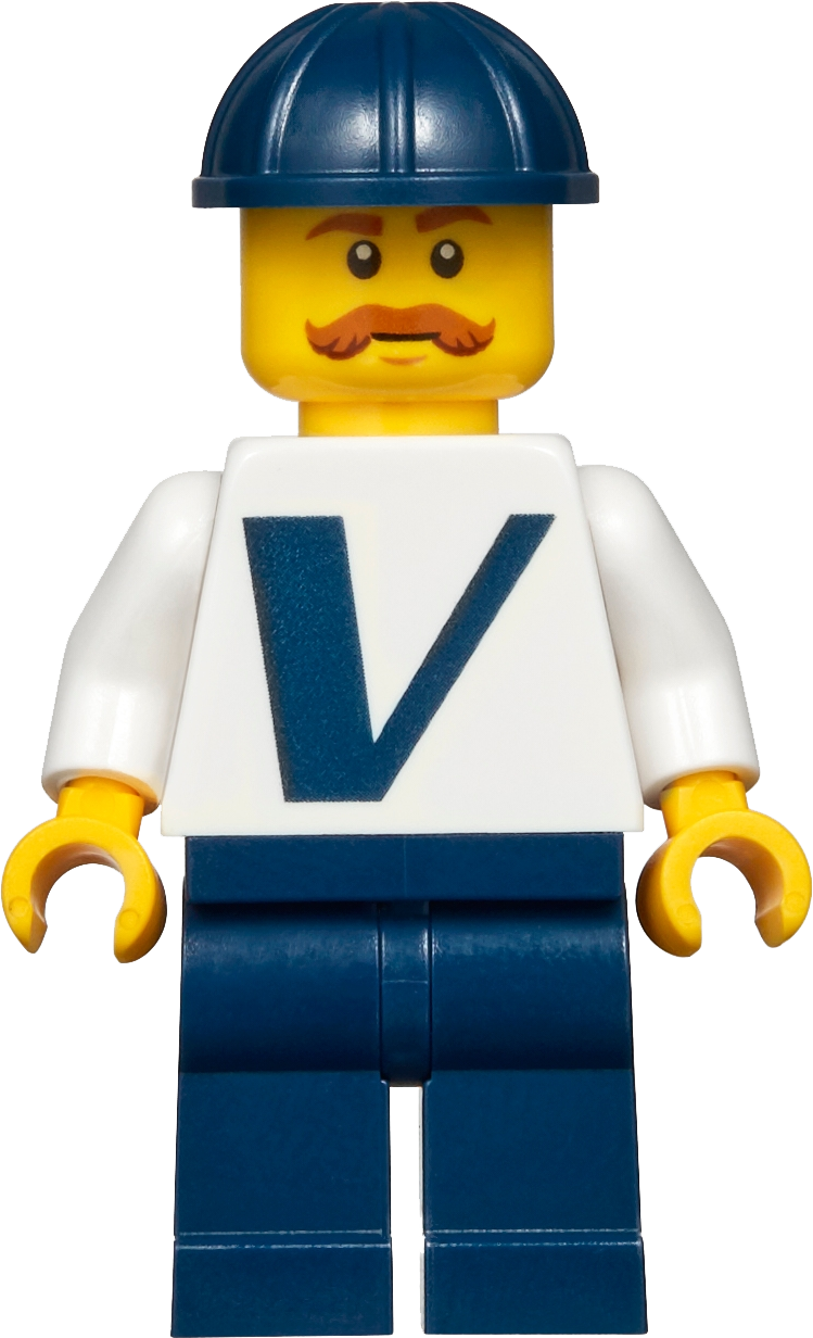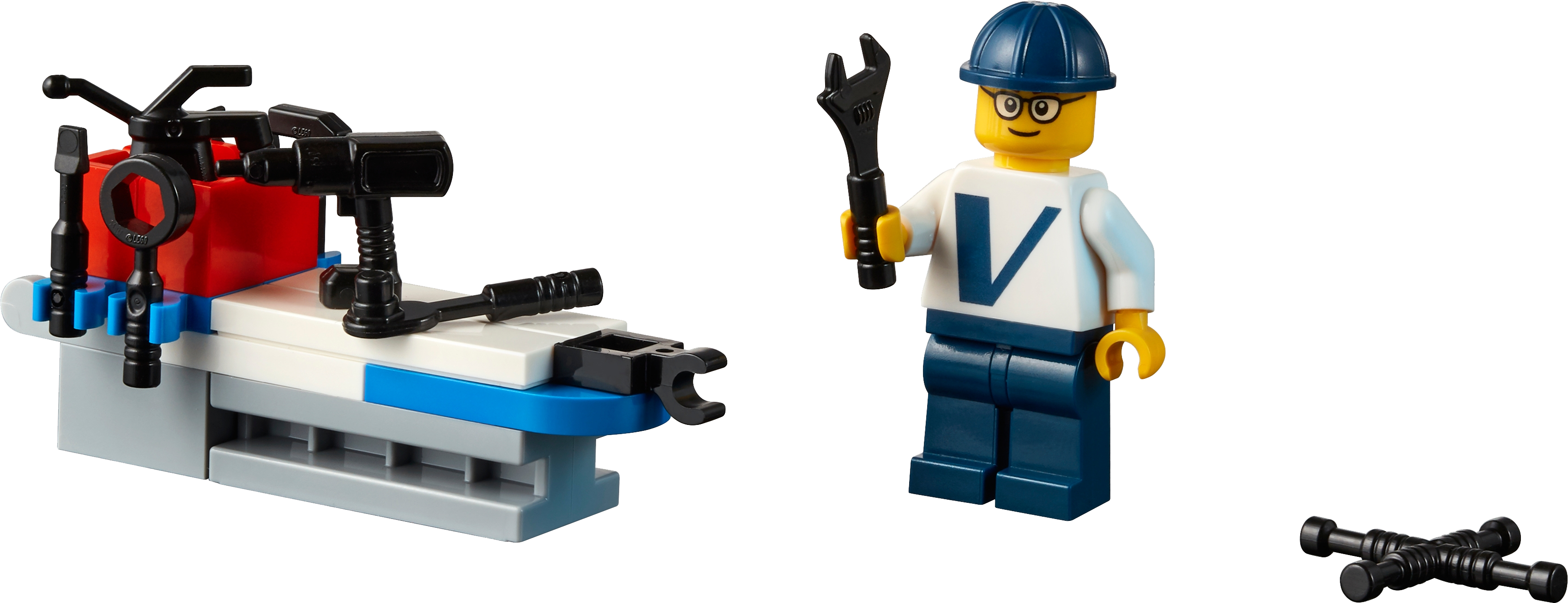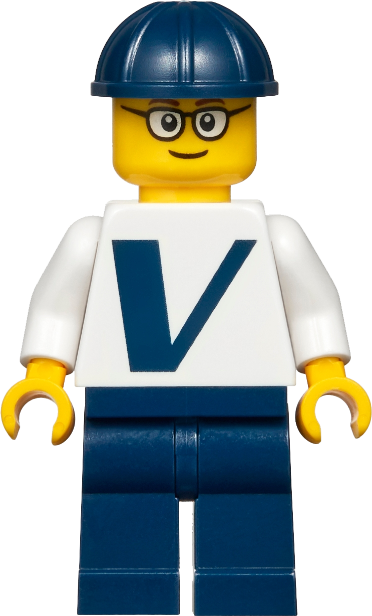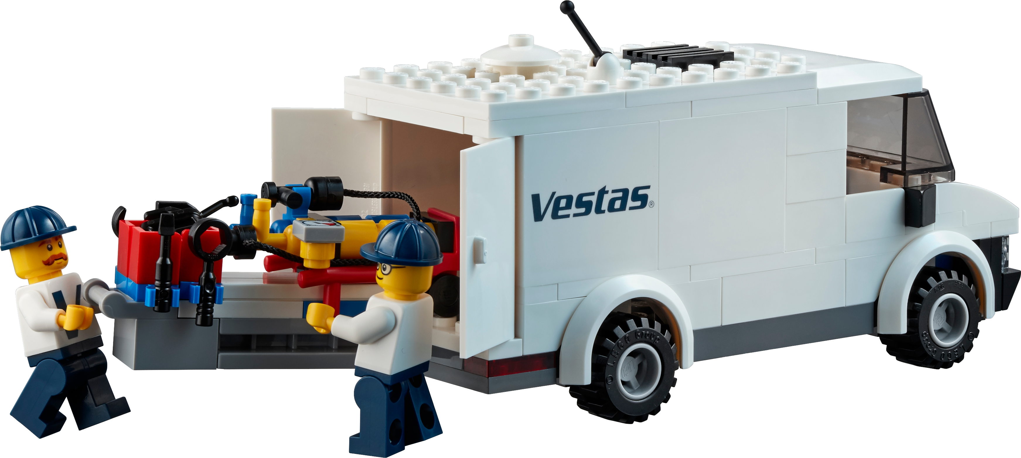 Includes 3 minifigures: a woman and 2 Vestas service technicians with v-printed torsos, plus a dog figure.