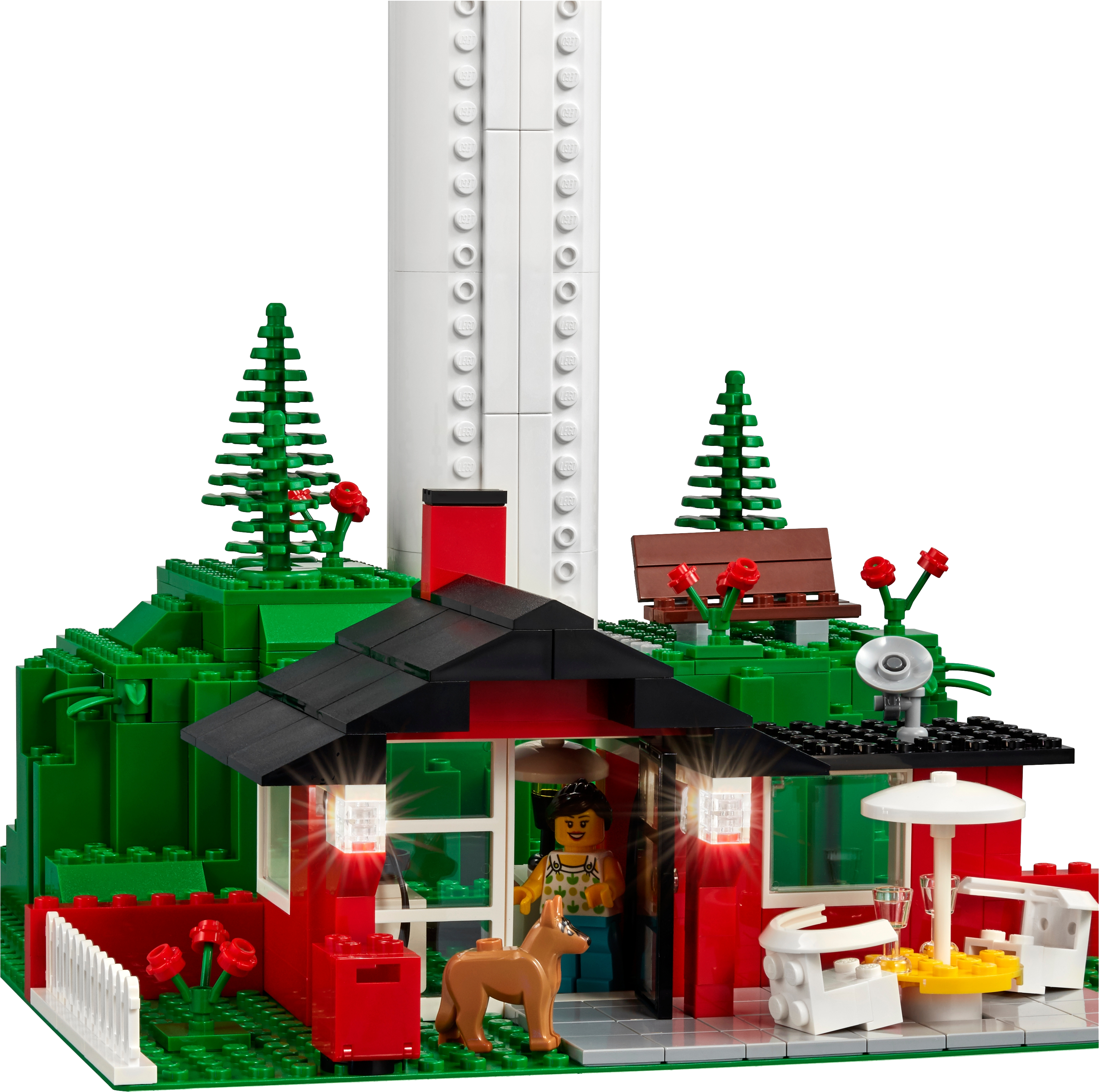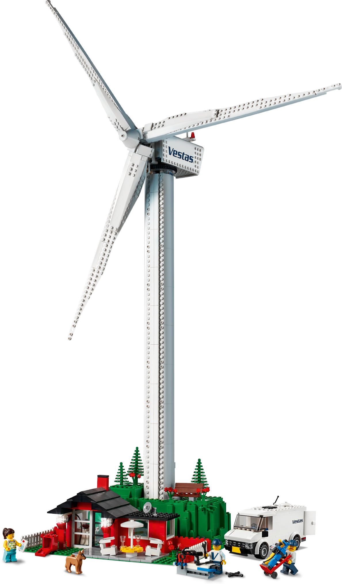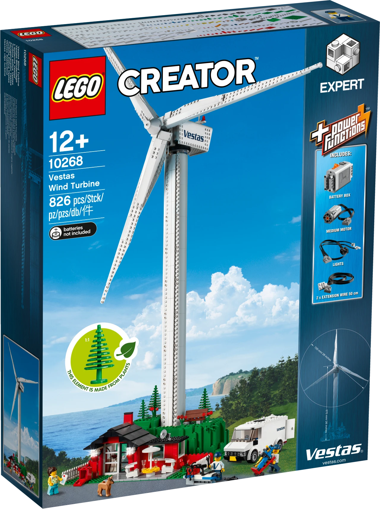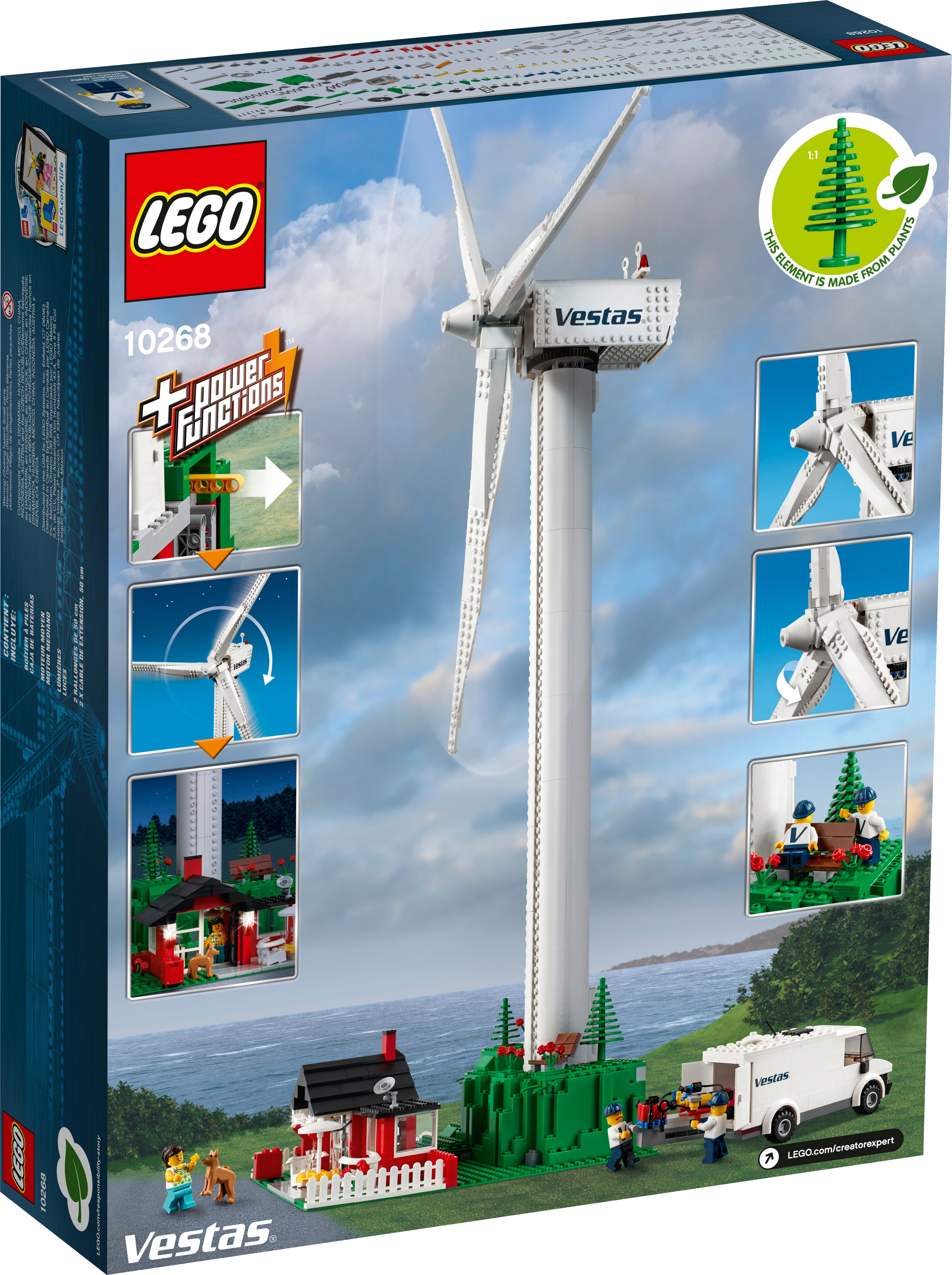 Celebrate green energy innovation with the LEGO® Creator Expert 10268 Vestas Wind Turbine. Developed in partnership with Vestas, this detailed, motorized LEGO model captures the elegance and graceful movement of a traditional wind turbine and features a new-for-January 2019 spruce tree, manufactured from sustainably sourced plant-based plastic. At approximately 39” (1m) high, the structure towers above a wooded hill and a house with furnished patio, mailbox, flowers and a white picket fence. Turn the nacelle left or right and switch on the included Power Functions motor to rotate the adjustable wind turbine blades and illuminate the cottage’s porch light. This collectible model has been designed to provide a challenging and rewarding building experience with a touch of nostalgia and makes a great display piece for the home or office. This big LEGO set also includes a Vestas service vehicle and 3 minifigures: 2 Vestas service technicians kitted out with safety helmets and a woman, plus a dog figure.