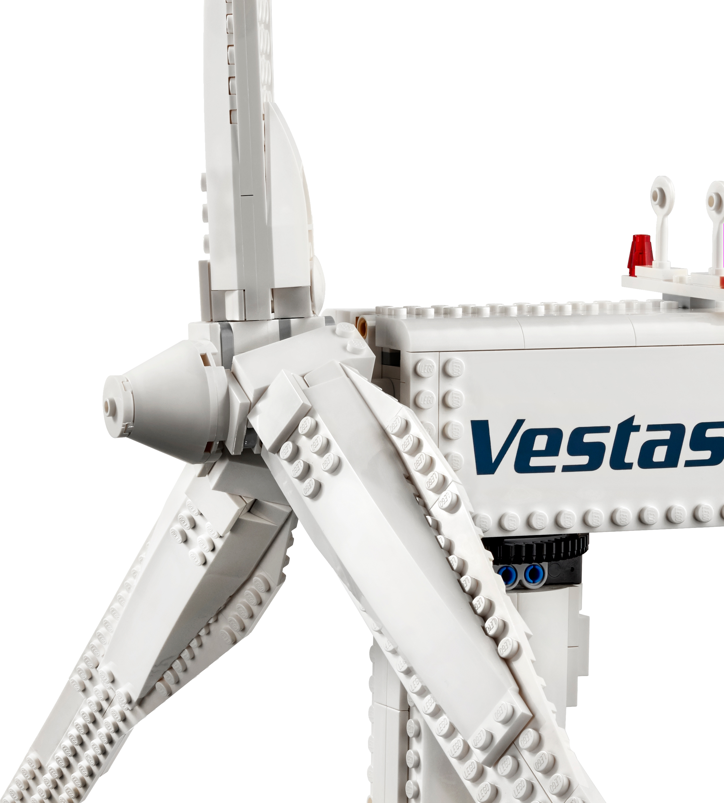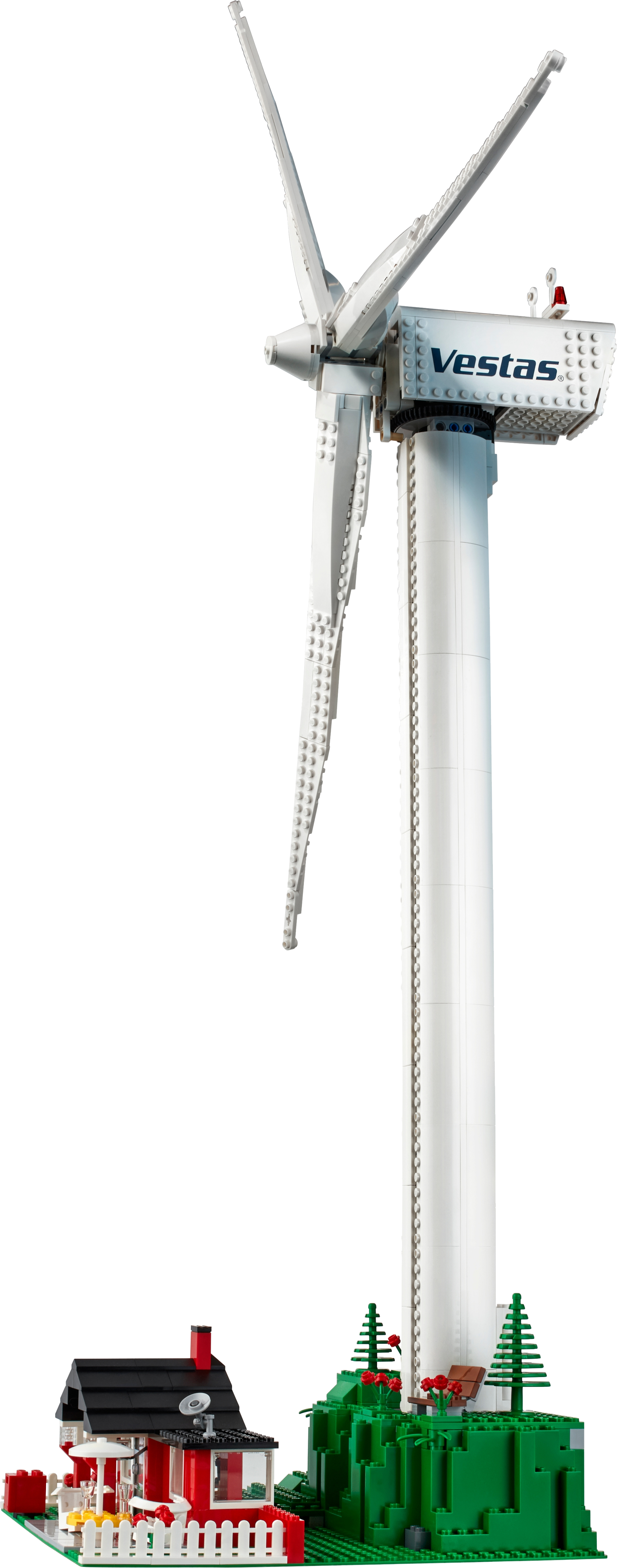 This LEGO® Creator Expert Vestas Wind Turbine set also features adjustable wind turbine blades, detailed tower, movable nacelle with aircraft warning lights, Vestas service vehicle, trees, greenery and a house with garden, flowers, picket fence and a patio with 2 chairs, table and a parasol.