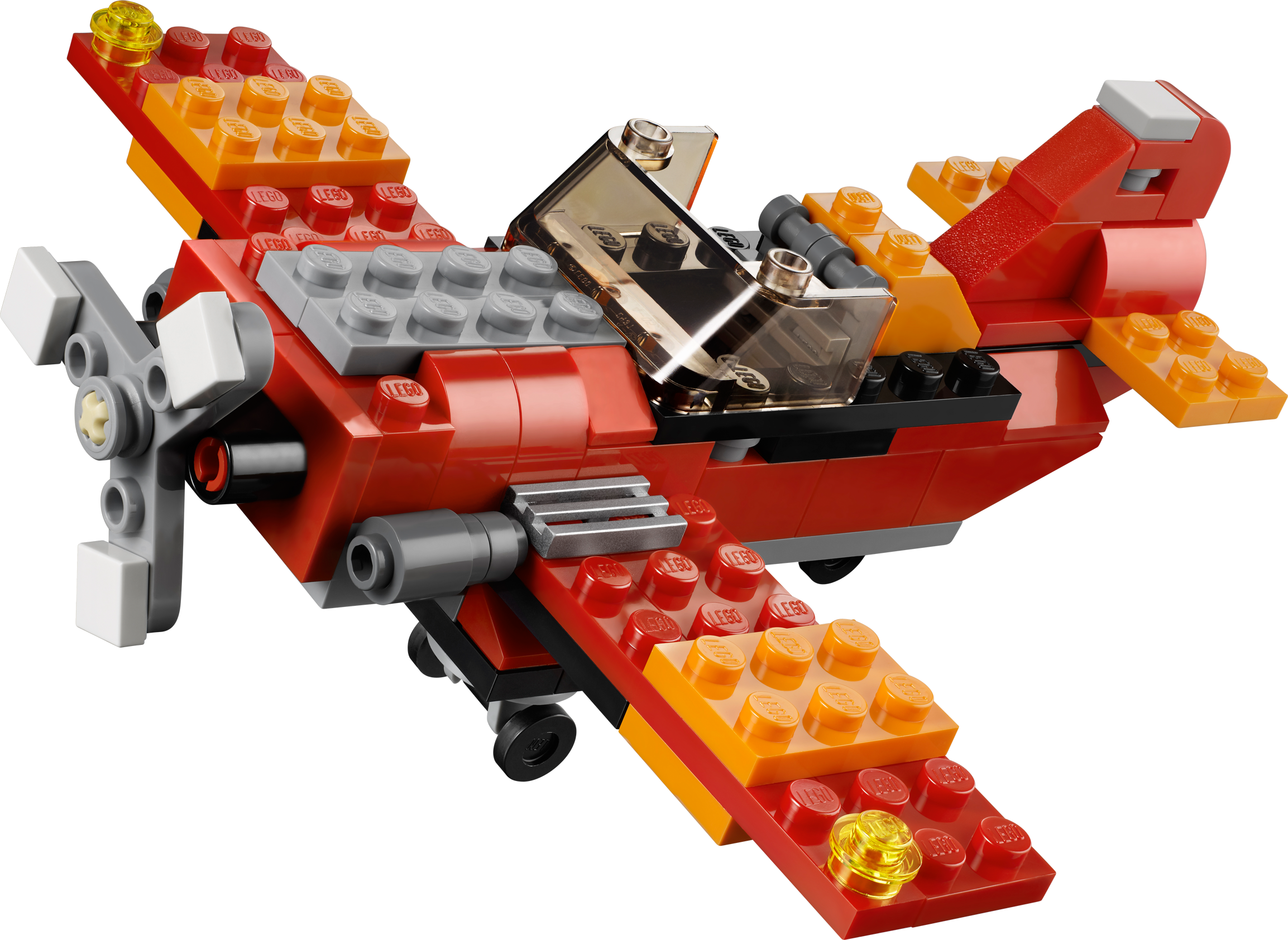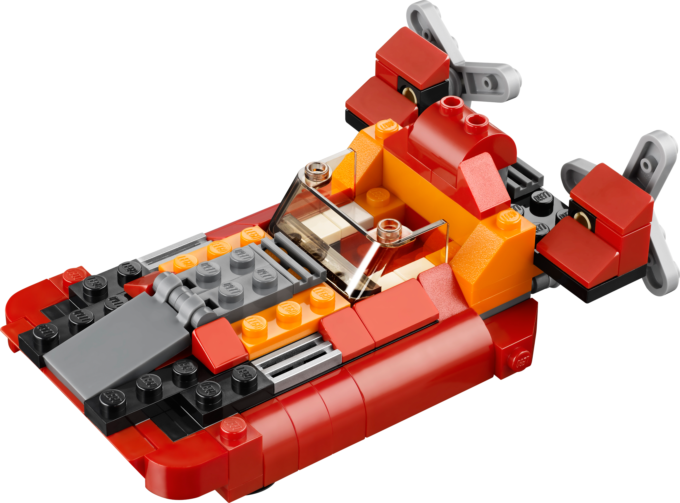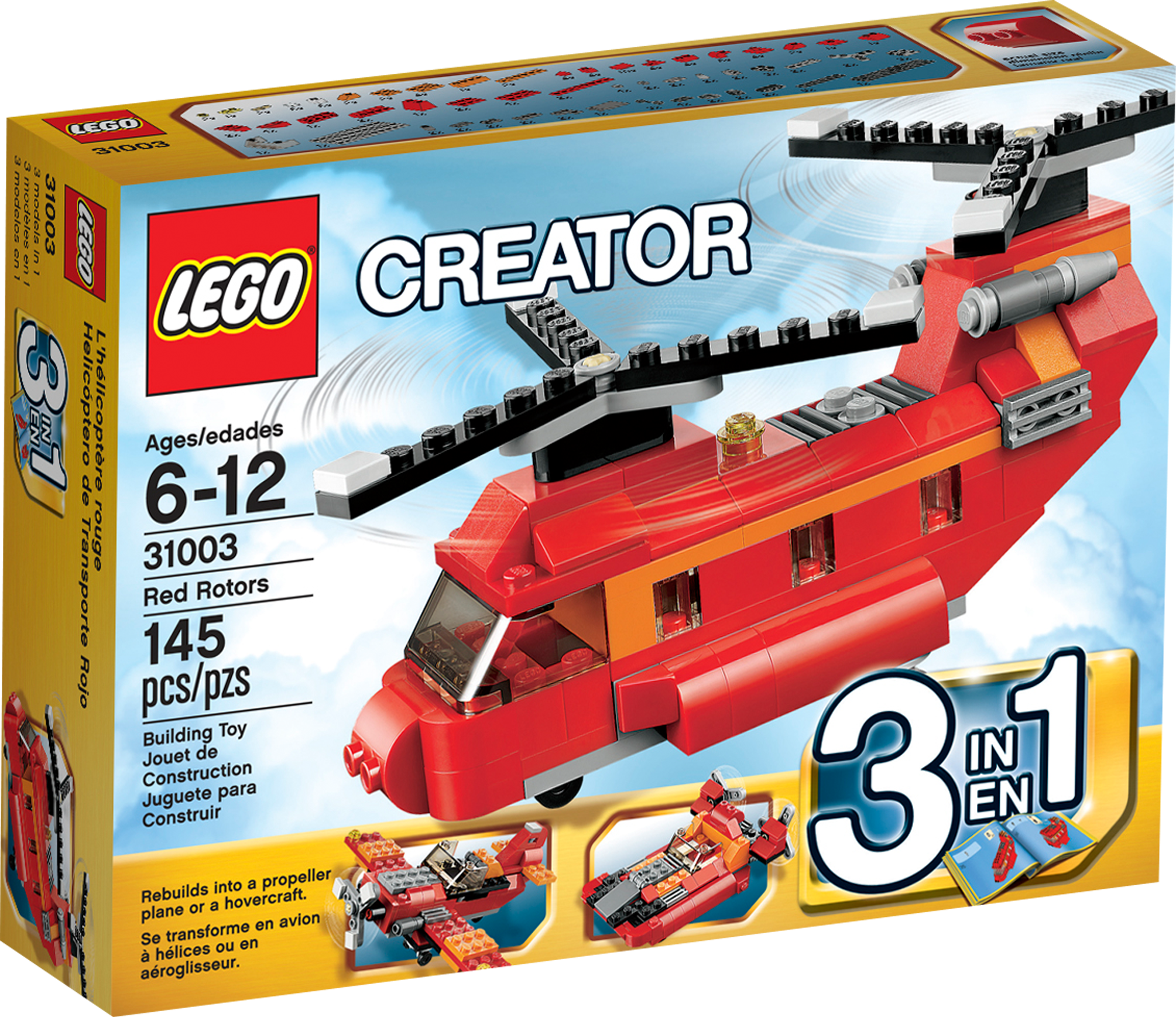 Transport the heaviest loads with the 3-in-1 Red Rotors helicopter! Lower the ramp, load the cargo and taxi to the helipad in the Red Rotors helicopter! With massive twin rotors, no load is too heavy for the heavy-lifting helicopter. Take off from the cool cockpit with a translucent windshield, then touch down on the landing gear to deliver your cargo! Rebuilds into a cool propeller plane or twin-rotor hovercraft.3-in-1 model: rebuilds into a cool propeller plane or twin-rotor hovercraftFeatures bright red and orange design, moving twin rotors, detailed engines, rear cargo ramp and landing gearSpin the twin rotors!Touch down on the landing gear!Lower the ramp to load the cargo!Propeller plane features engine detailing, rotating propeller, and undercarriageHovercraft features detailed engines and twin rotorsMeasures over 3" (8cm) high, 5" (14cm) long and 3" (9cm) widePropeller plane measures over 1" (5cm) high, 5" (13cm) long and 5" (14cm) wideTwin-rotor hovercraft measures over 1" (4cm) high, 4" (12cm) long and 3" (10cm) wide