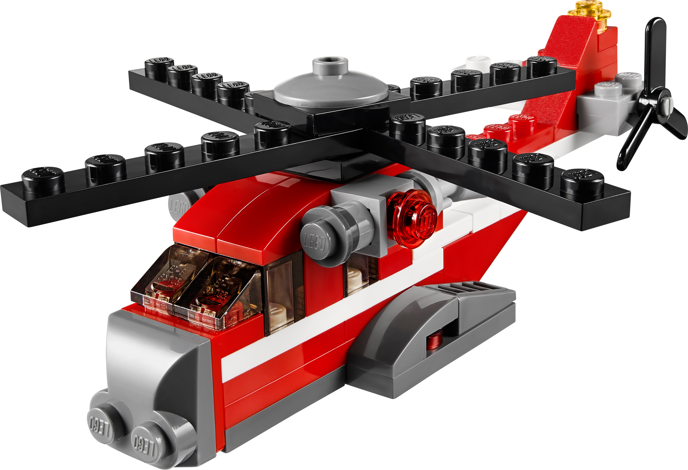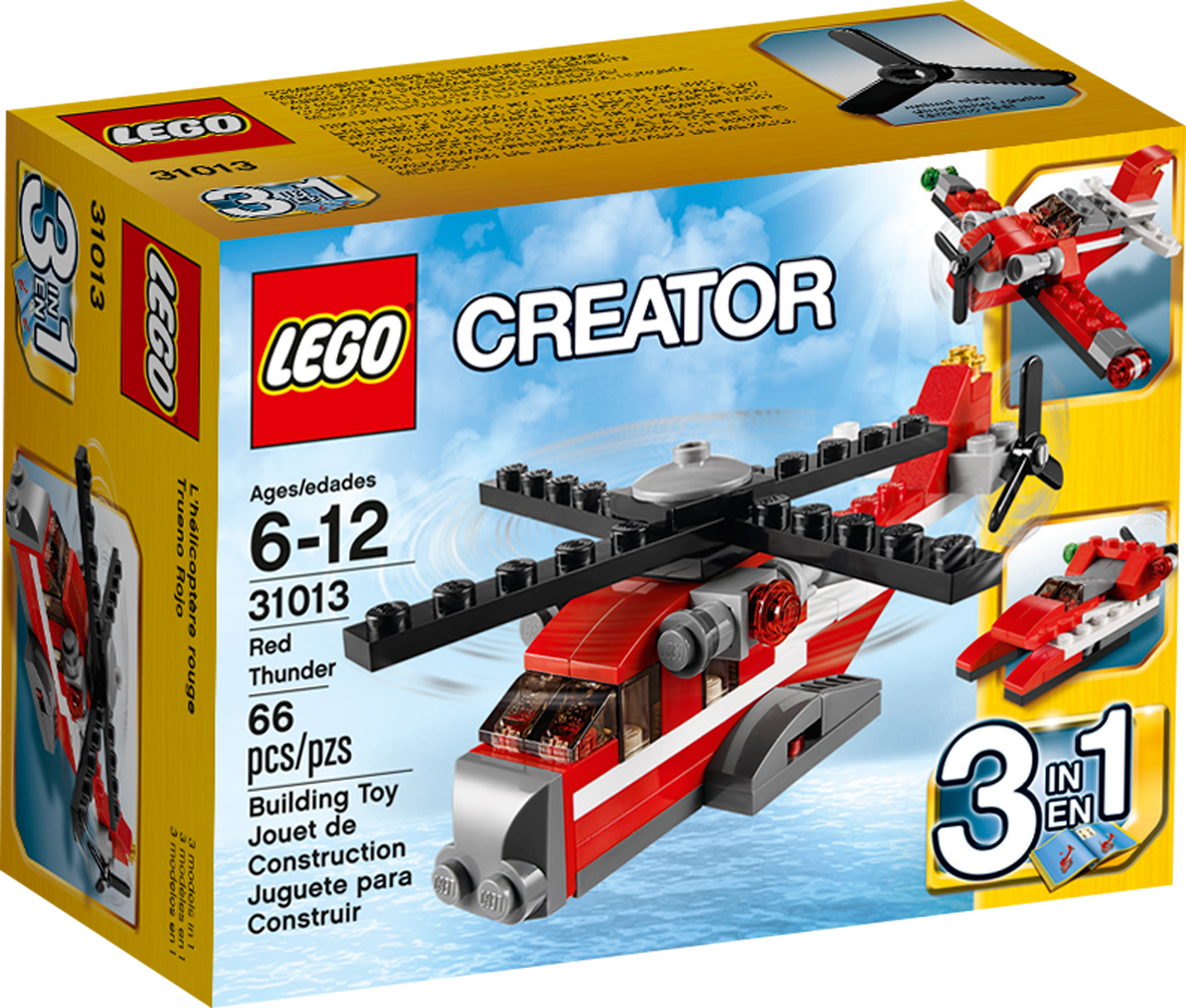 Take control of the high-powered 3-in-1 Helicopter as it heads to a daring rescue! This massive Red Thunder transport helicopter is perfect for getting heavy loads to remote mountain areas. With its high-visibility red, white and grey paint scheme and powerful rotors, it’s also a great rescue helicopter, too. And the best thing is that you can make it into a cool, old-fashioned biplane or a high-powered racing boat.3-in-1 model: rebuilds into a biplane or a racing boatFeatures turning main and tail rotors, engine detail and high-visibility color schemeSpin the propellers and soar into the sky!Red Thunder helicopter measures over 1” (4cm) high, 5” (13cm) long and 1” (3cm) wideBiplane measures over 1” (4cm) high, 3” (8cm) long and 4” (11cm) wideRacing boat measures over 1” (3cm) high, 2” (7cm) long and 1” (4cm) wide