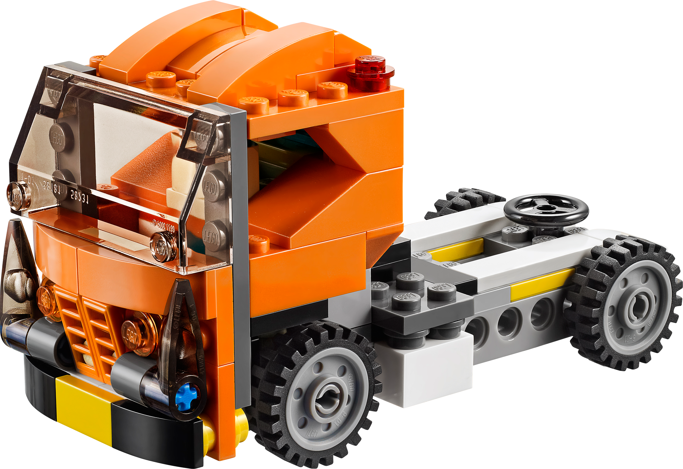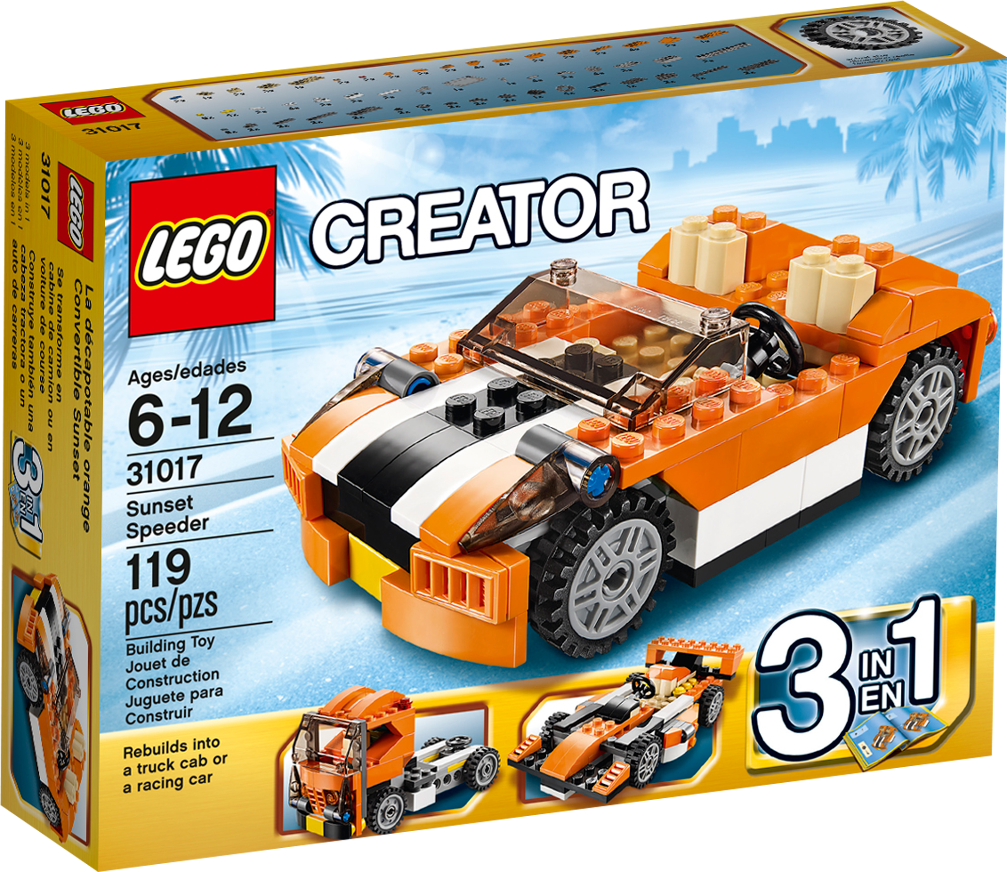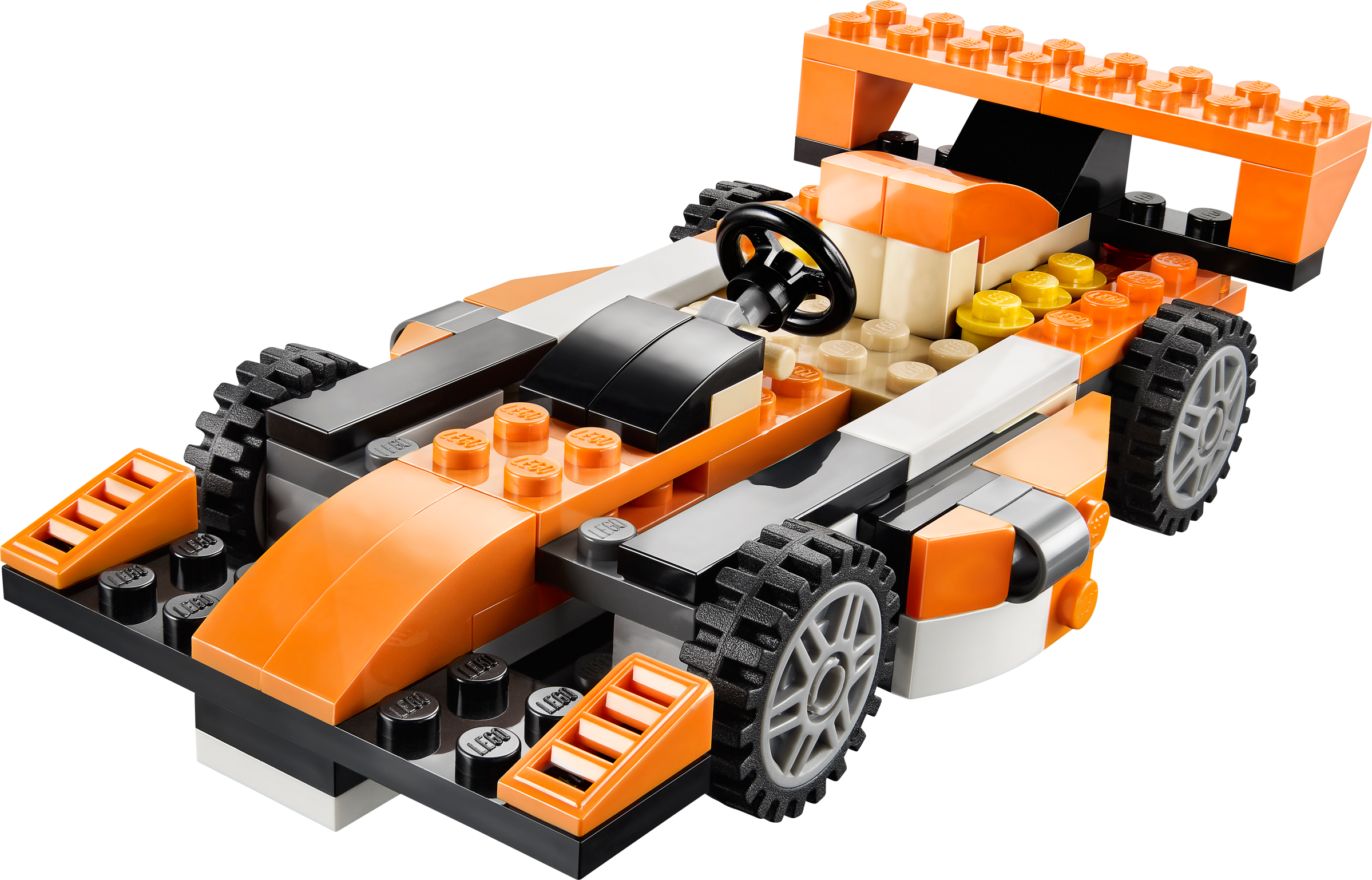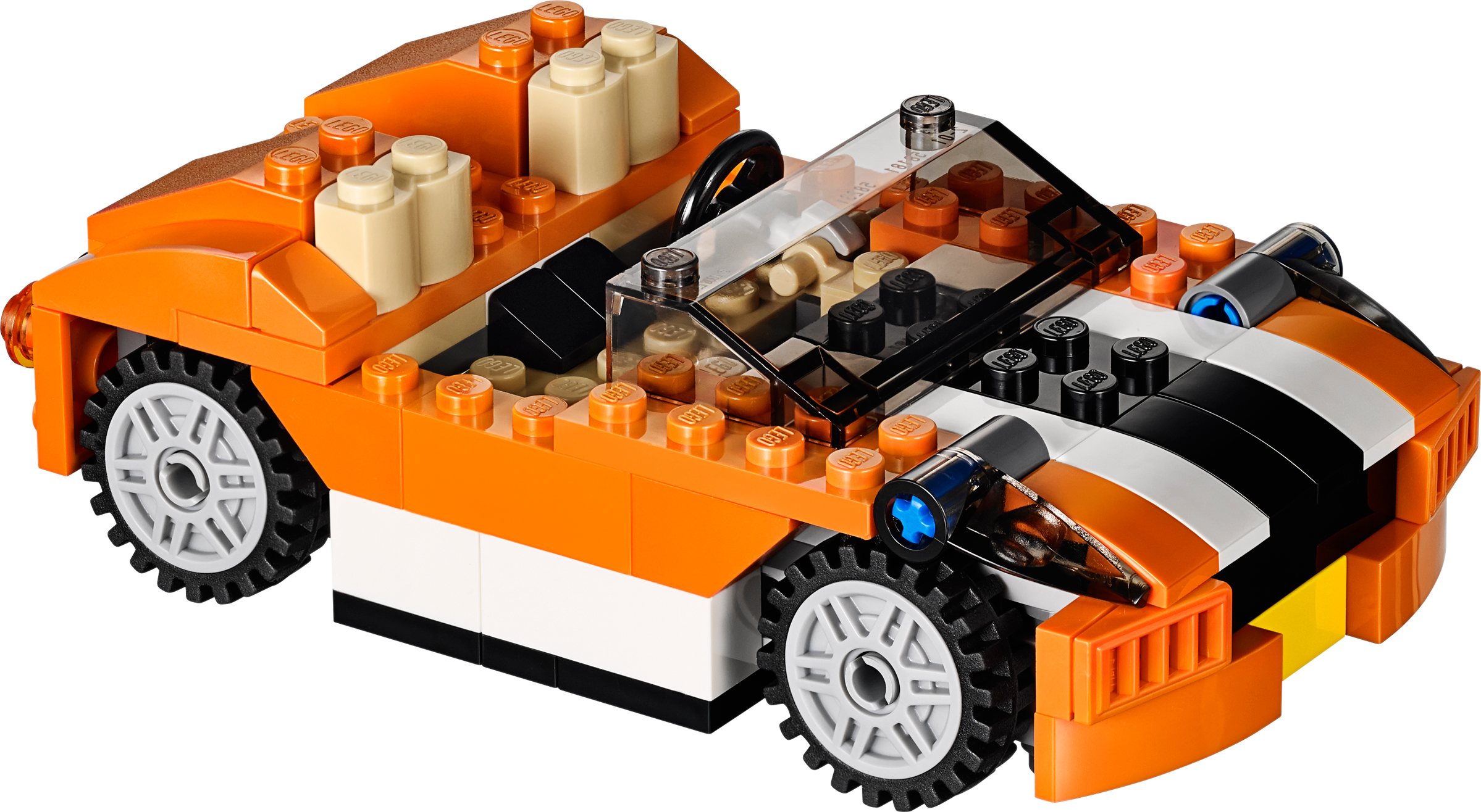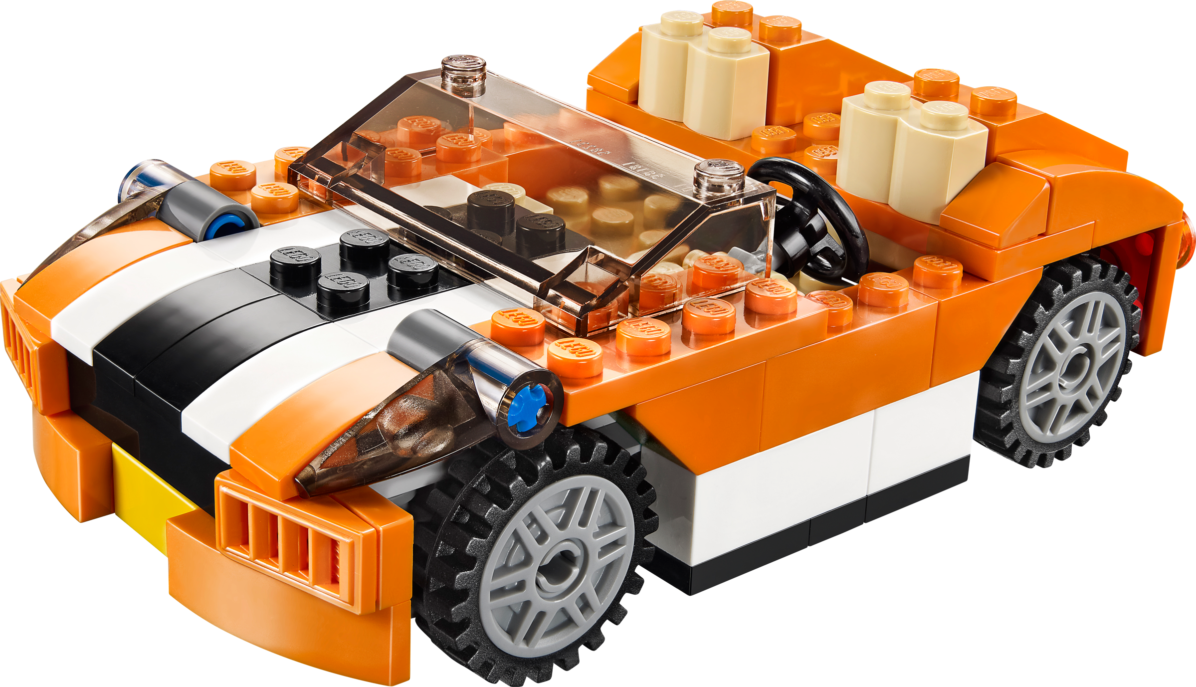 Zoom away with the super-fast 3-in-1 Sunset Speeder! The sleek Sunset Speeder sports car is perfect for cruising the streets. Featuring an orange body with super-distinctive black and white stripe, racing wheels and cool headlights, this is one car that you’ll want in your LEGO® collection. For added variety, rebuild it into a truck cab or an even faster racing car.3-in-1 model: rebuilds into a truck cab or a racing carFeatures sports car styling with orange bodywork and black and white stripe, working doors, racing wheels and headlightsCruise the streets, Sunset Speeder style!Sunset Speeder measures over 1” (4cm) high, 4” (11cm) long and 2” (6cm) wideTruck cab measures over 2” (7cm) high, 4” (12cm) long and 1” (4cm) wide Racing car measures over 1” (4cm) high, 5” (13cm long) and 2” (7cm) wide