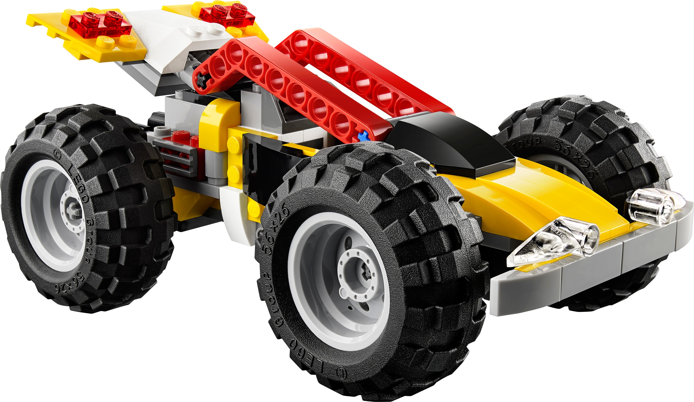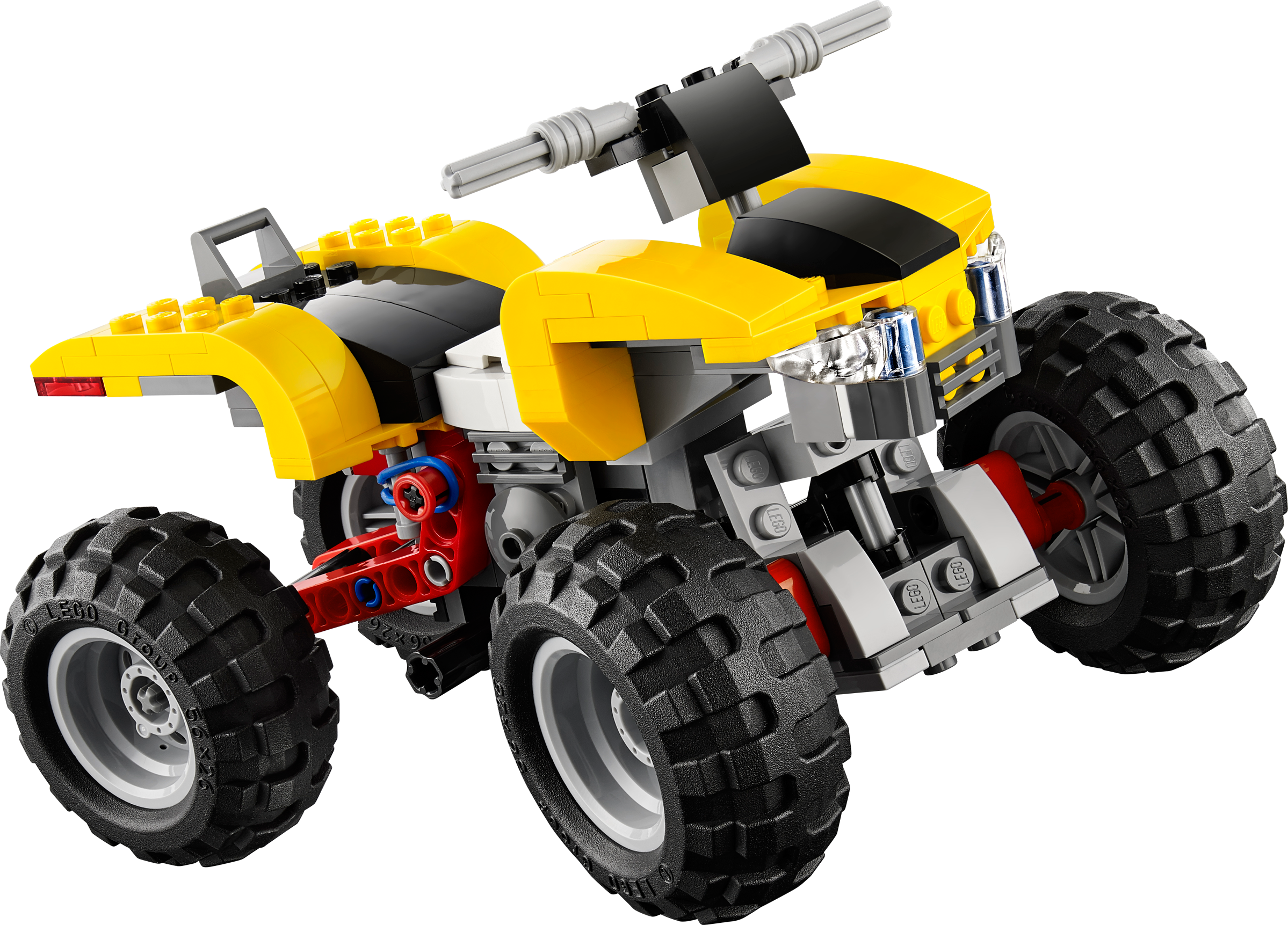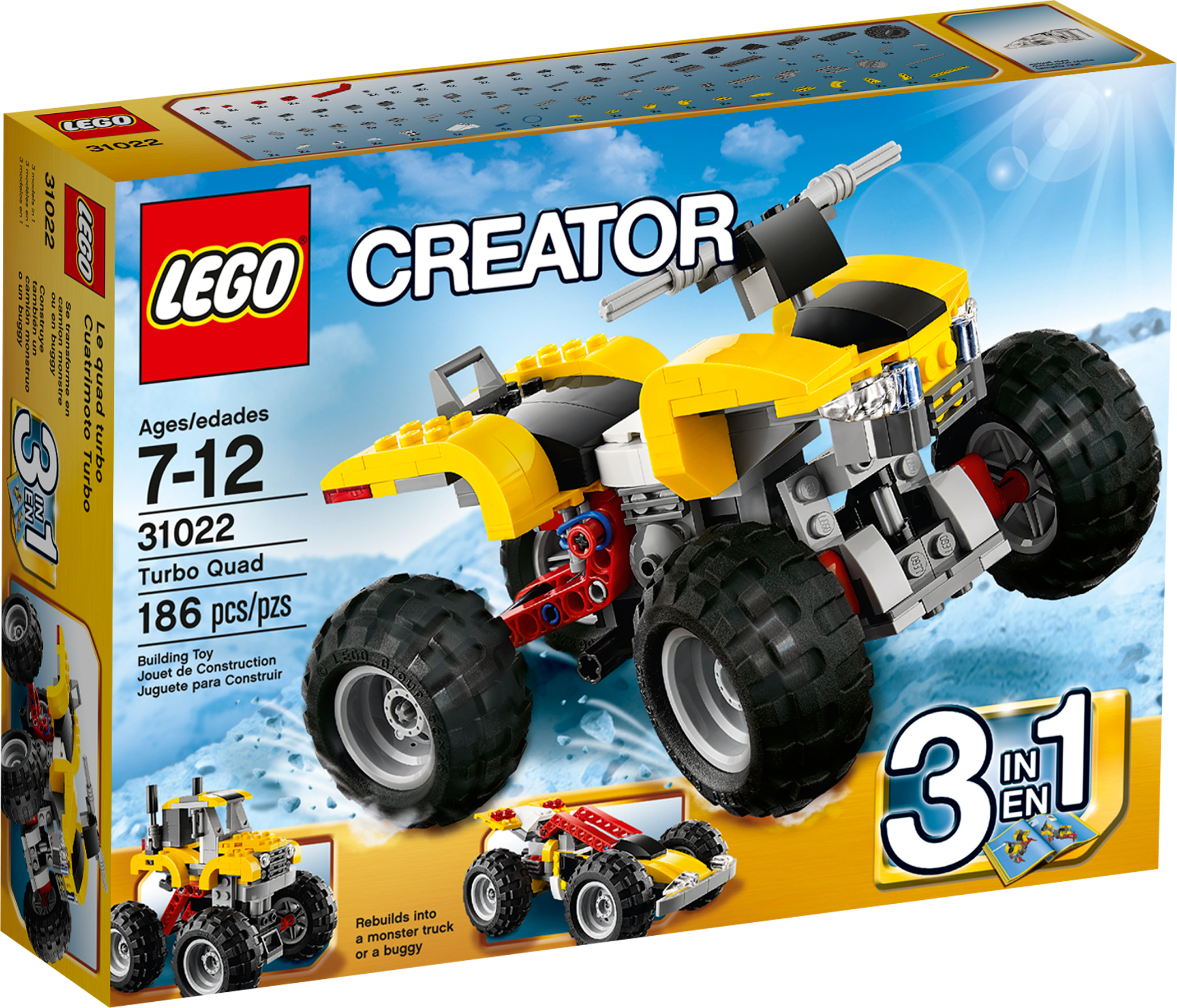 Go off-road with the 3-in-1 Turbo Quad! Get on the Turbo Quad and zoom away for thrilling off-road fun! With the working steering and rear suspension, it’s ready for any challenge. There’s also a detailed engine, headlights and chunky tires to slot into place, so there’s plenty to test your building skills. And when it’s time for a change, rebuild it into a mighty monster truck or a cool buggy.3-in-1 model: rebuilds into a monster truck or a buggyFeatures working steering, rear suspension, chunky tires, detailed engine and headlights Steer clear of off-road obstaclesCruise over bumpy terrain with the chunky tires and rear suspensionTurbo Quad measures over 3” (10cm) high, 6” (16cm) long and 3” (10cm) wideMonster truck measures over 4” (12cm) high, 5” (13cm) long and 3” (10cm) wideBuggy measures over 3” (8cm) high, 6” (17cm) long and 3” (10cm) wide