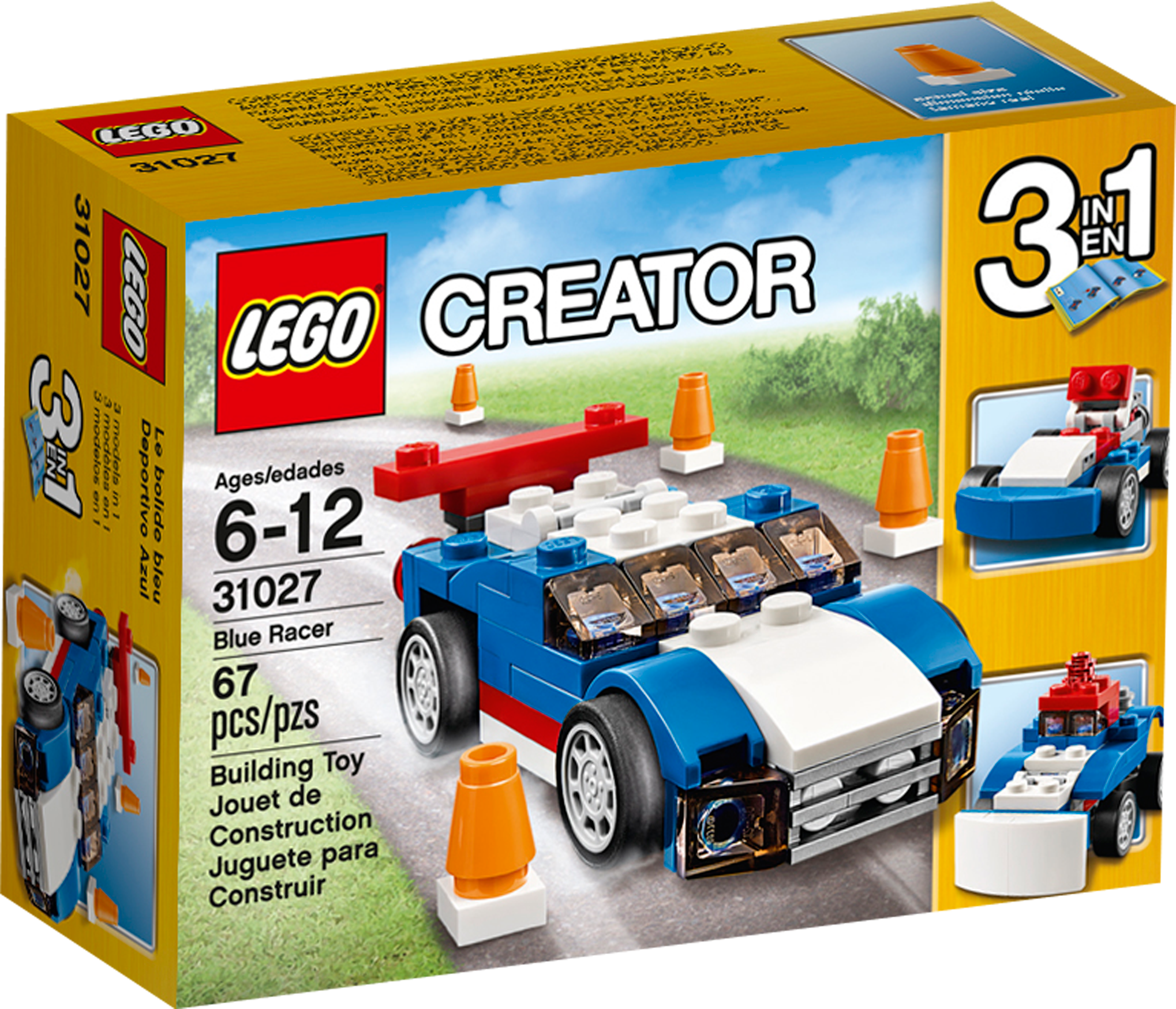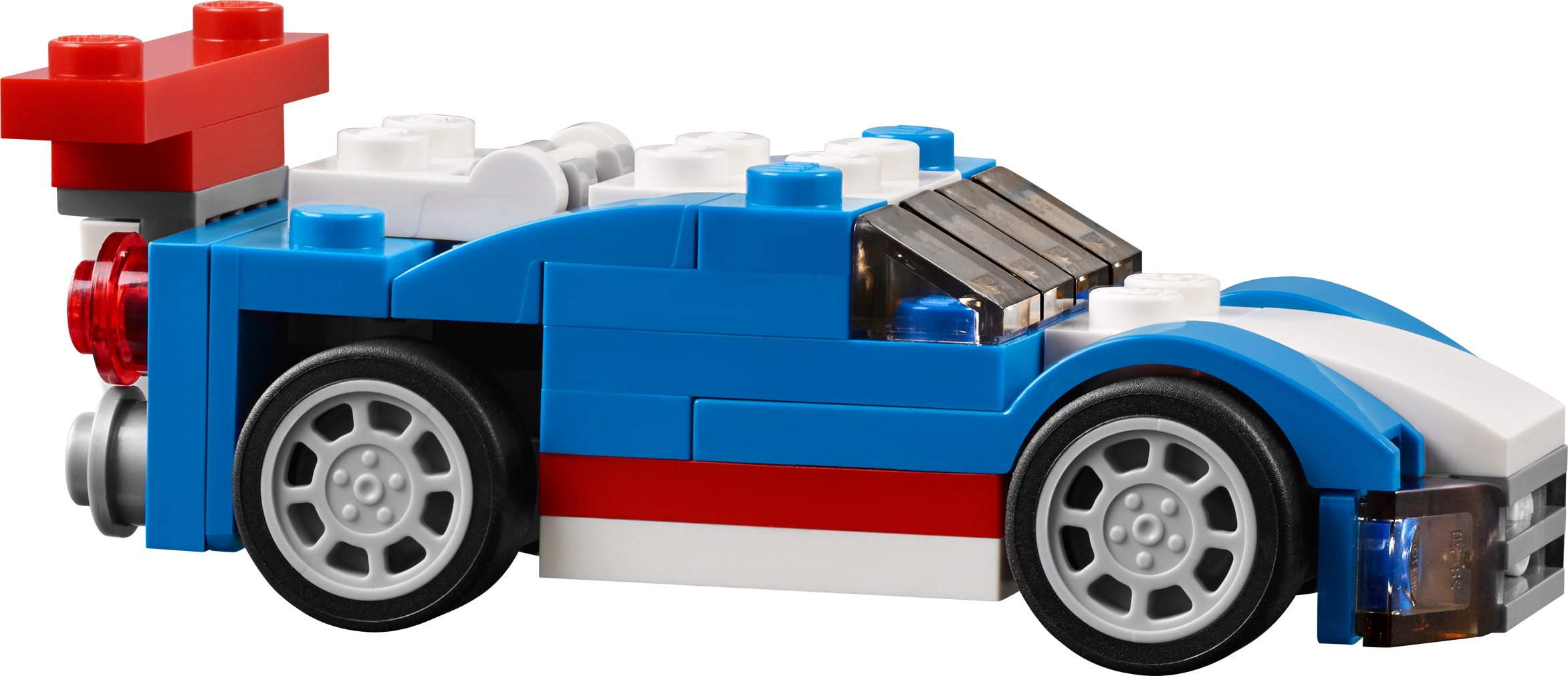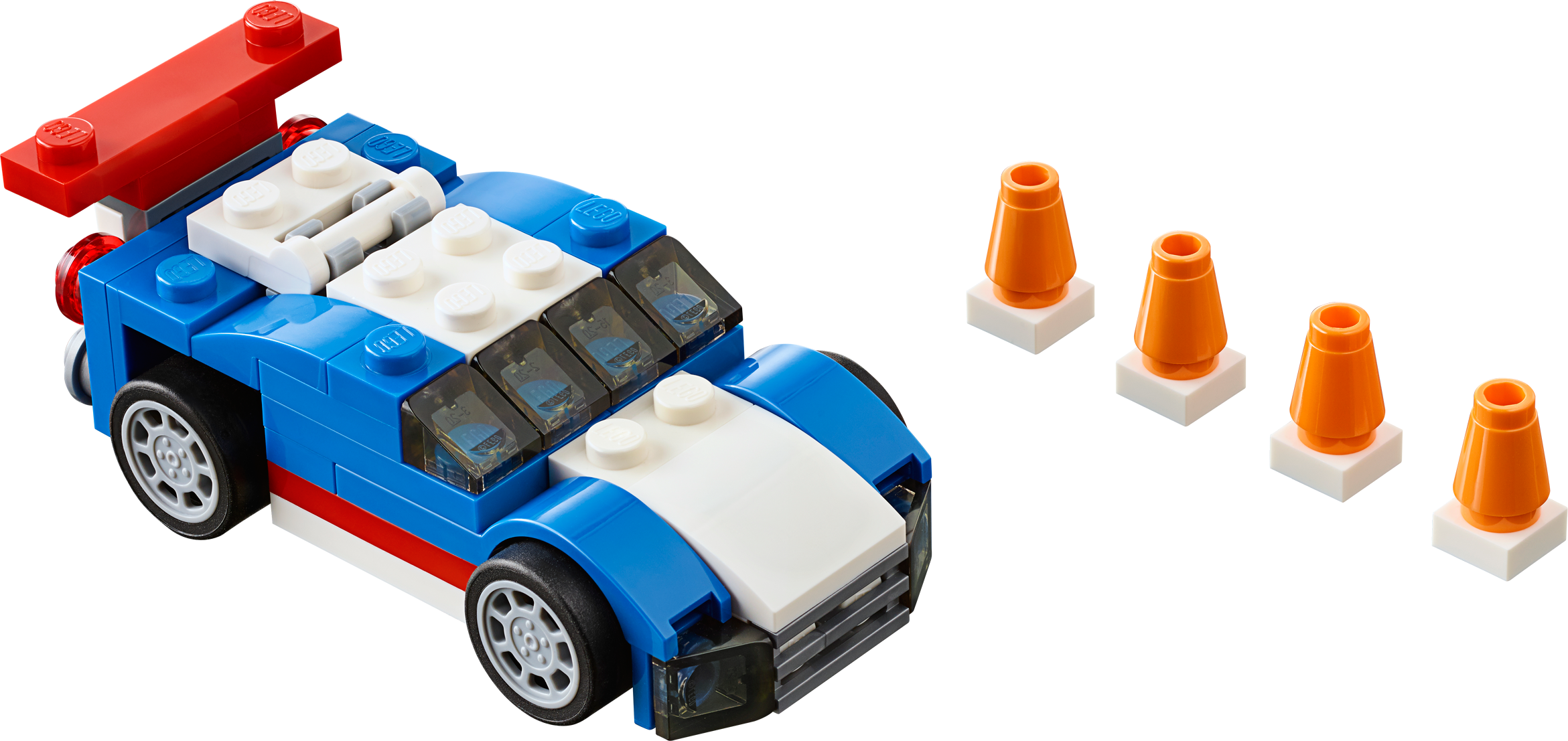 Test your driving skills with the super-cool 3-in-1 Blue Racer! Take the sleek 3-in-1 Blue Racer for a spin. Test your driving skills as you weave through the orange traffic cones at high speed. Features a sporty blue, white and red color scheme, beefy exhausts, cool alloy-look rims and a smart rear spoiler panel that opens to reveal a detailed engine. When you’re done racing, rebuild it into a powerful snowplow with movable snow shovel or a cool buggy with awesome rear engine detailing. Features hinged rear spoiler panel, detailed engine, 4 orange traffic cones and alloy-look rims Check out the sporty blue, white and red color scheme! Weave through the orange traffic cones! 3-in-1 model: rebuilds into a smart snowplow or a cool buggy Buggy can accommodate a minifigure Blue Racer measures over 2” (7cm) long, 1” (3cm) wide and under 1” (2cm) high Snowplow measures over 1” (4cm) high, 2” (7cm) long and 1” (3cm) wide Buggy measures over 1” (3cm) high, 2” (6cm) longand 1” (3cm) wide Combine with the 31029 Cargo Heli and 31033 Vehicle Transporter for even more action