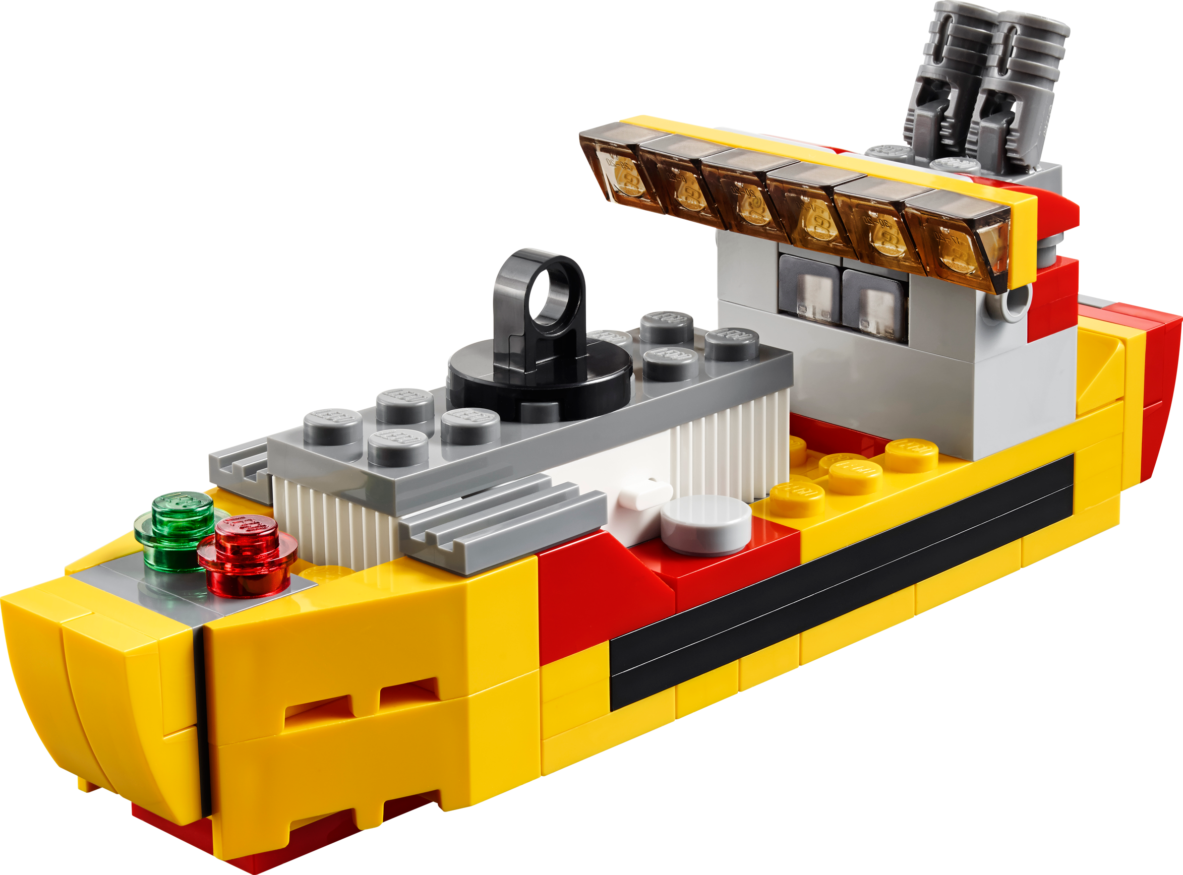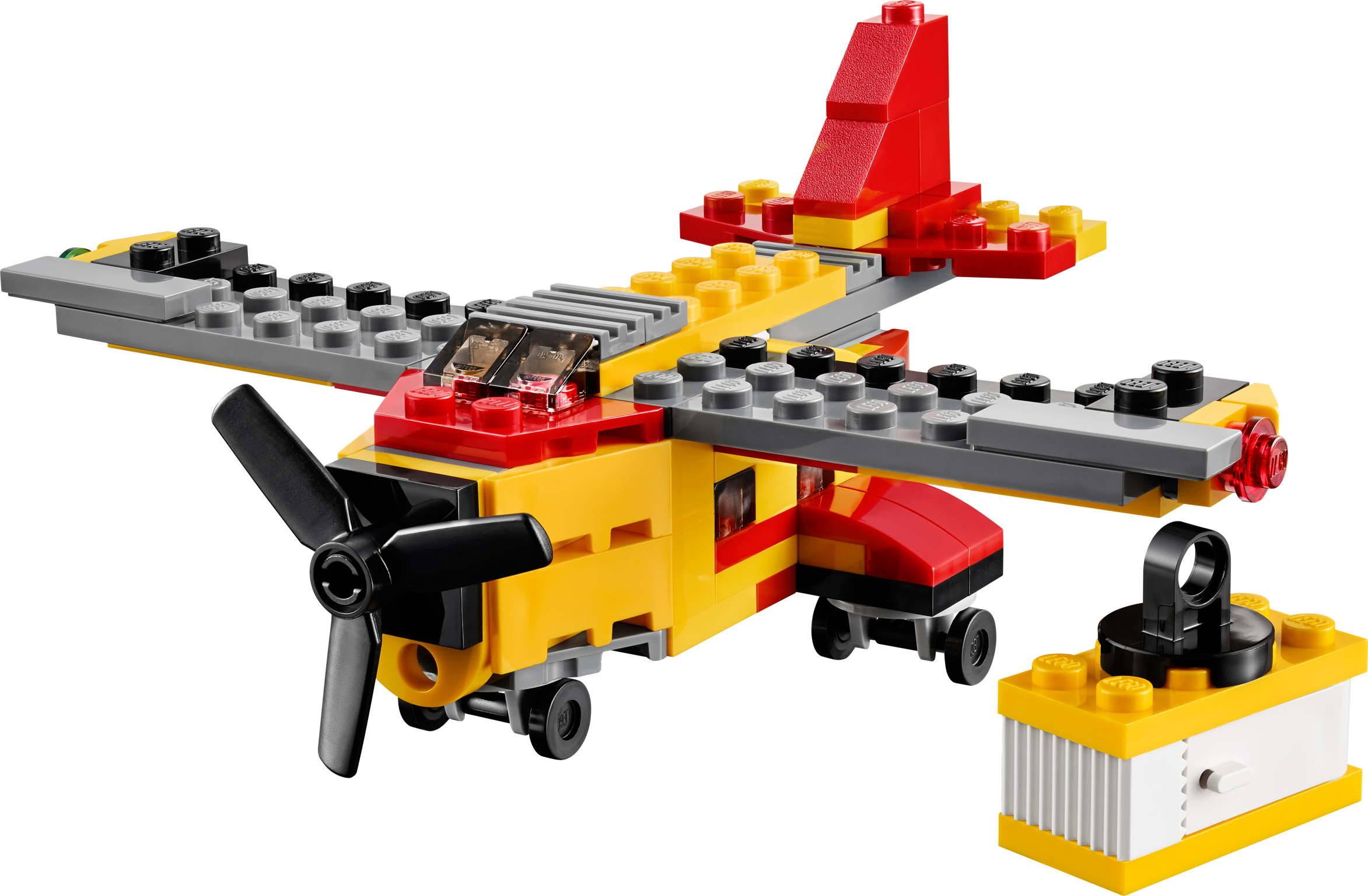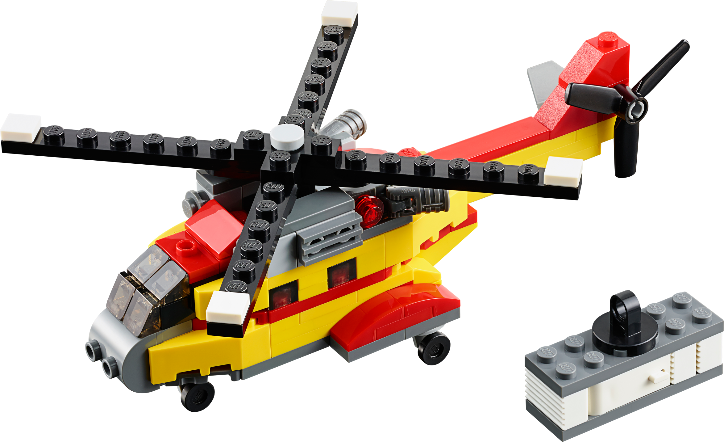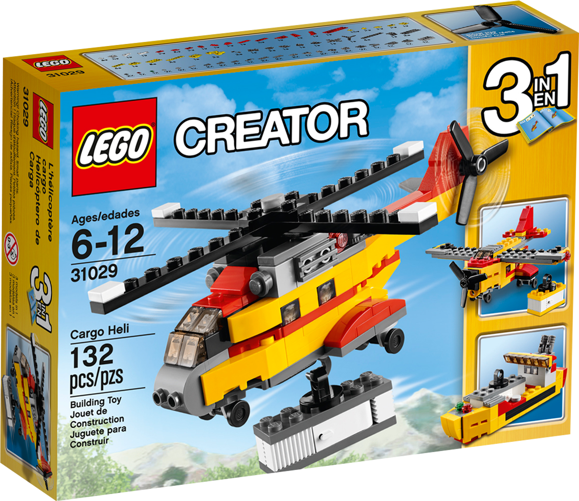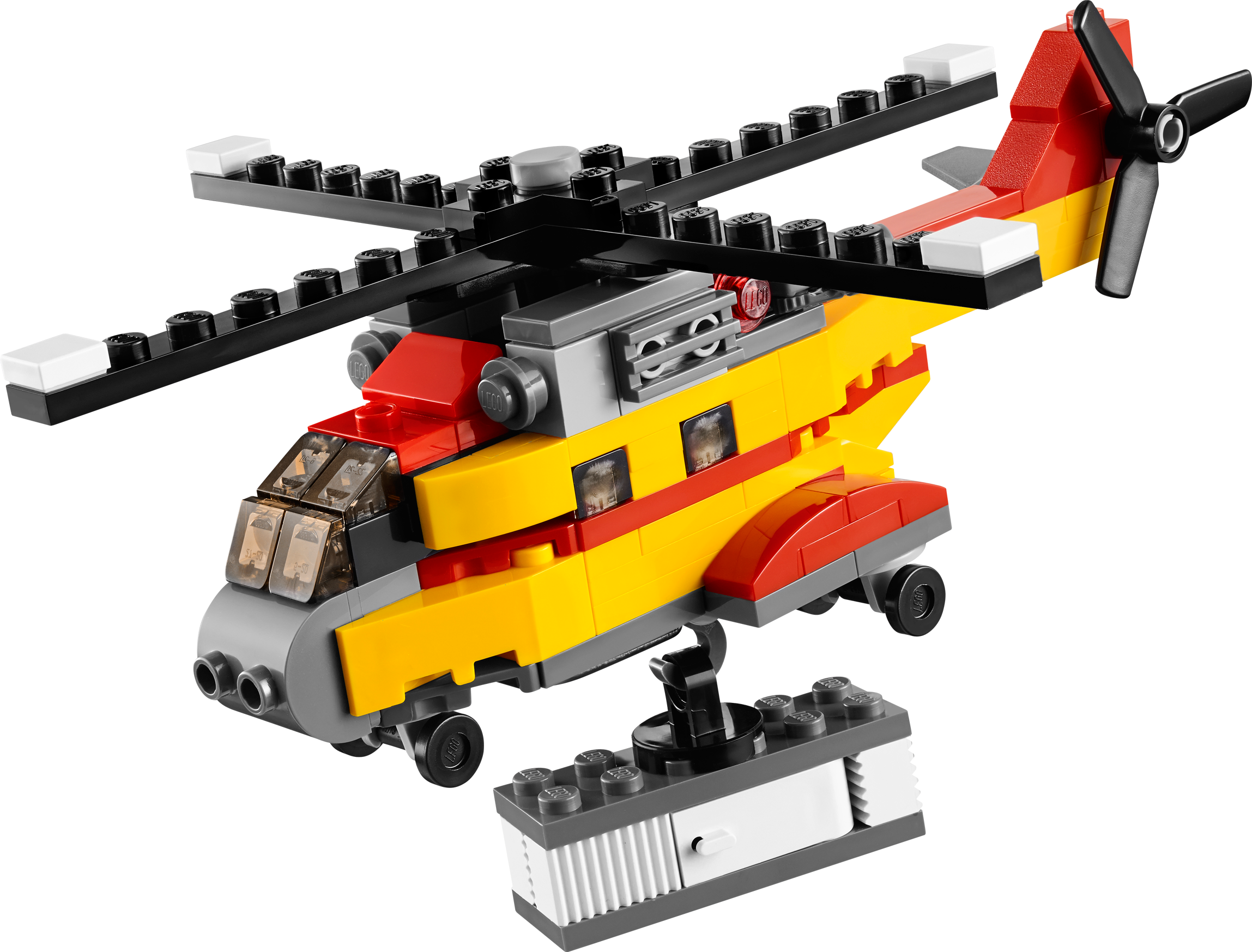 Airlift vital supplies with the awesome 3-in-1 Cargo Heli! Airlift heavy loads with the high-powered 3-in-1 Cargo Heli! Taxi to the helipad and prepare for takeoff. When you’re airborne, hover into position, lower the winch hook and carefully lift the cargo container. Features a smart red and yellow color scheme, working main rotor and tail rotor, 2 detailed engines, navigation lights, wheeled undercarriage, winch hook and a cargo container with opening doors. Now let’s get this cargo delivered! Rebuilds into a cool cargo ship or an awesome cargo plane. Features a turning main rotor and tail rotor, 2 detailed engines, navigation lights, wheeled undercarriage, winch hook and a cargo container with opening doors Check out the awesome red and yellow color scheme Taxi to the runway Lower the winch hook Lift the cargo container 3-in-1 model: rebuilds into a cargo ship or a cargo plane Cargo Heli measures over 2” (6cm) high, 6” (17cm) long and 5” (13cm) wide Cargo plane measures over 2” (6cm) high, 4” (11cm) long and 5” (14cm)wide Cargo ship measures over 1” (5cm) high, 4” (12cm) long and 1” (4cm) wide Combine with the 31027 LEGO® Creator Blue Racer and 31033 LEGO® Creator Vehicle Transporter for even more action