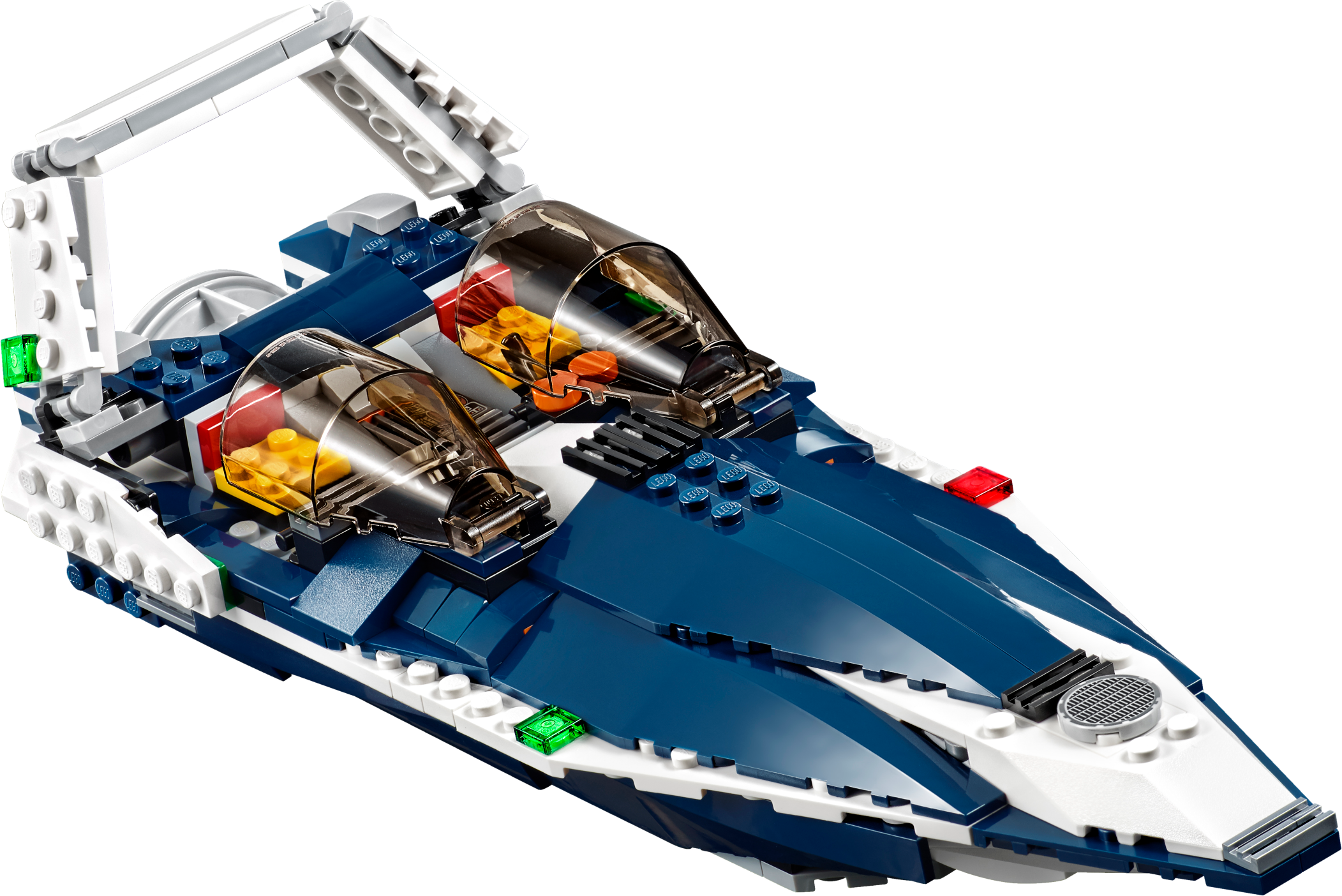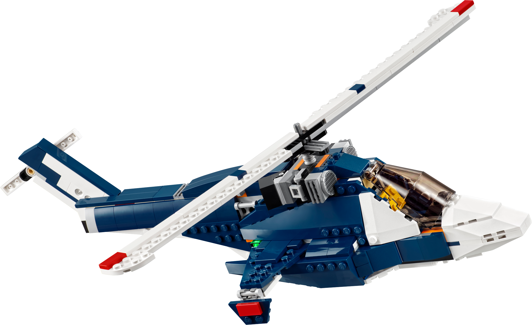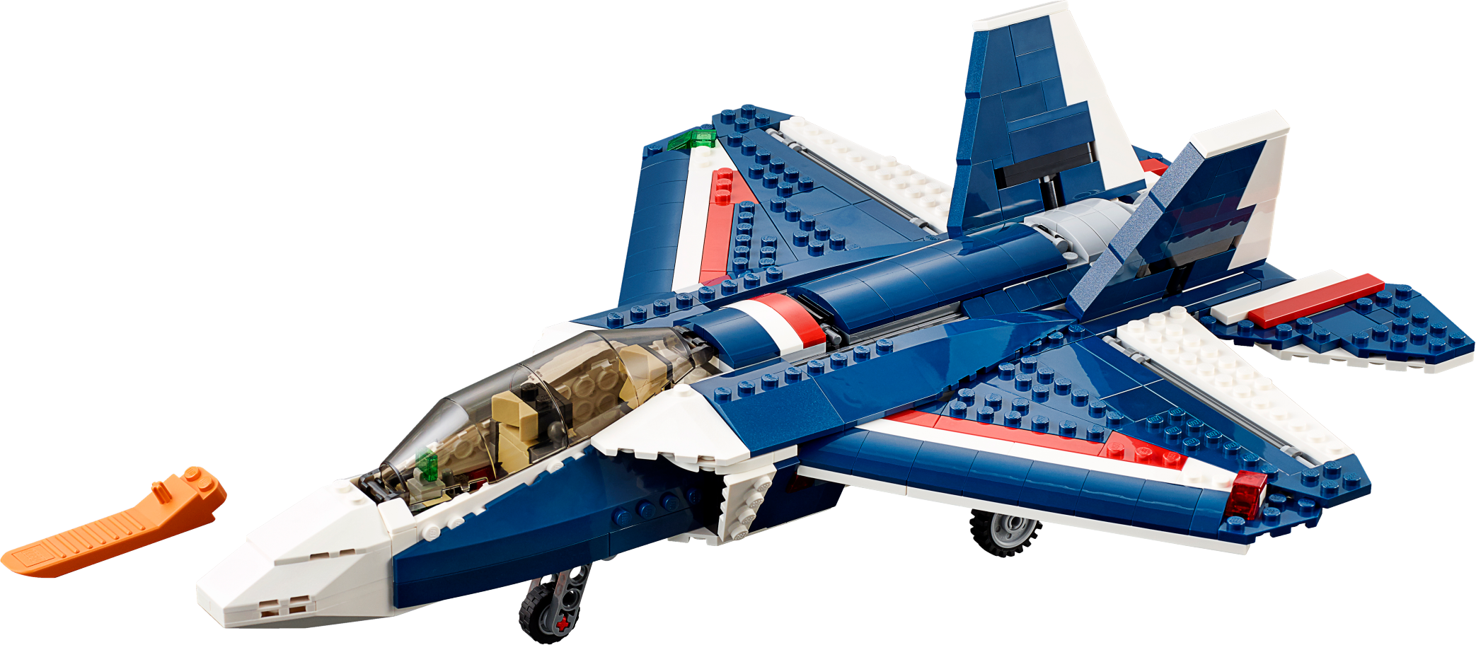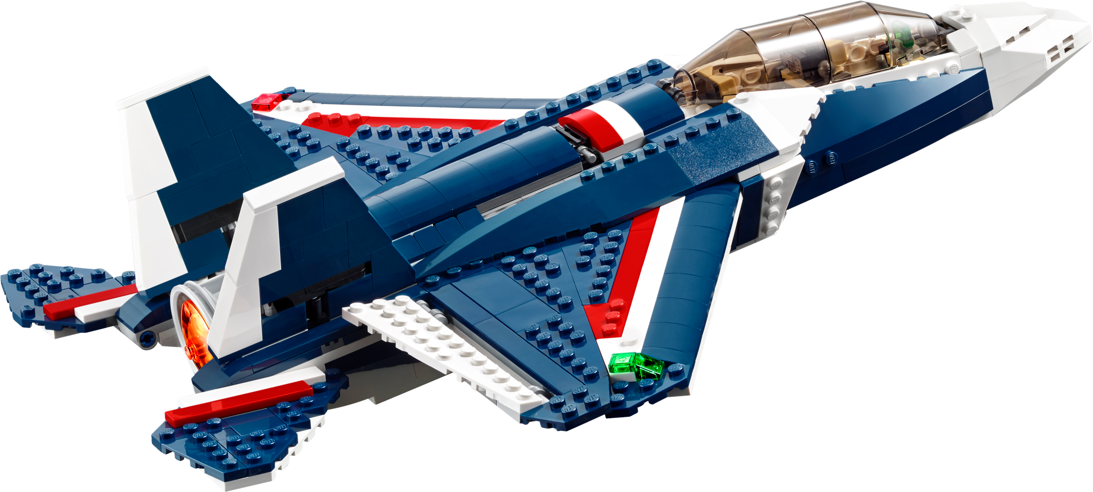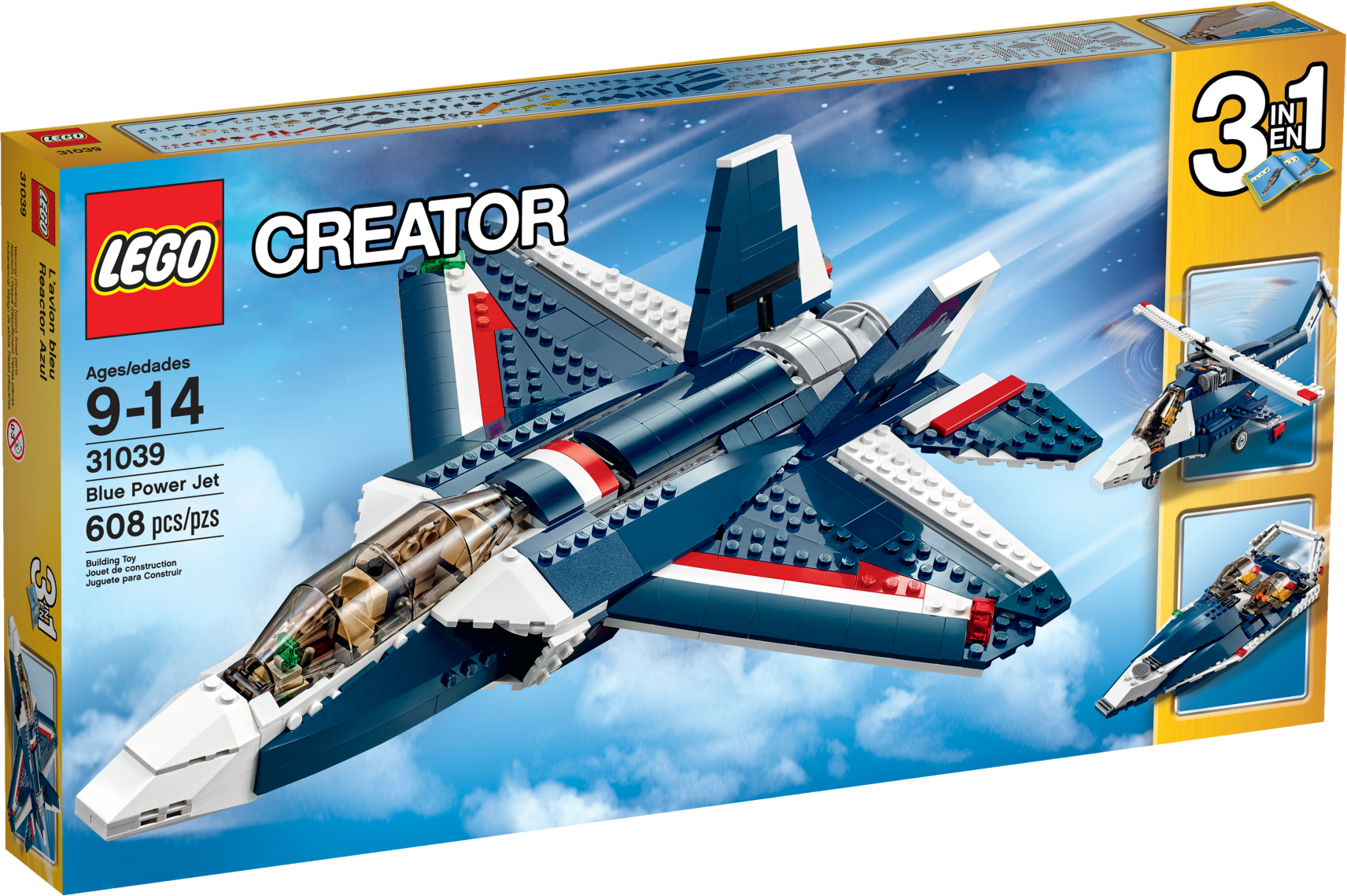 Thunder over land and sea with the 3-in-1 Blue Power Jet! Thunder over land and sea with the 3-in-1 LEGO® Creator Blue Power Jet! This awesome model comes with a dark-blue, white and red color scheme and an array of exciting features, including movable wings, ailerons and flaps, folding undercarriage and an accessible engine compartment. Realistic details such as twin vertical stabilizers, large tinted cockpit, semicircular air intakes, navigation lights and a huge exhaust make this model a joy to build and play with. When you feel like a new challenge, rebuild it into a cool, high-tech helicopter or a super, aerodynamic hovercraft with twin cockpits. All this from one set of bricks… now that’s what you call a three-in-one! Features movable wings, ailerons and rudders, folding undercarriage, accessible engine compartment, twin vertical stabilizers with movable flaps, a large tinted cockpit, semicircular air intakes, navigation lights and a huge exhaust Check out the cool dark-blue, white and red color scheme Cockpit can accommodate a minifigure (not included) Thunder over land and sea! Movable ailerons and flaps Enjoy a building challenge! 3-in-1 model: rebuilds into a huge high-tech helicopteror an aerodynamic hovercraft with twin cockpits Blue Power Jet measures over 5” (13cm) high, 14” (38cm) long and 12” (32cm) wide Helicopter (excluding rotors) measures over 5” (15cm) high, 15” (39cm) long and 6” (16cm) wide Hovercraft measures over 3” (9cm) high, 11” (28cm) long and 3” (10cm) wide