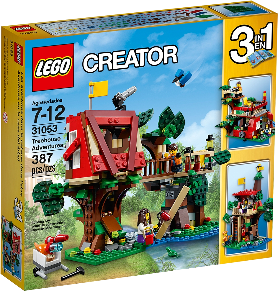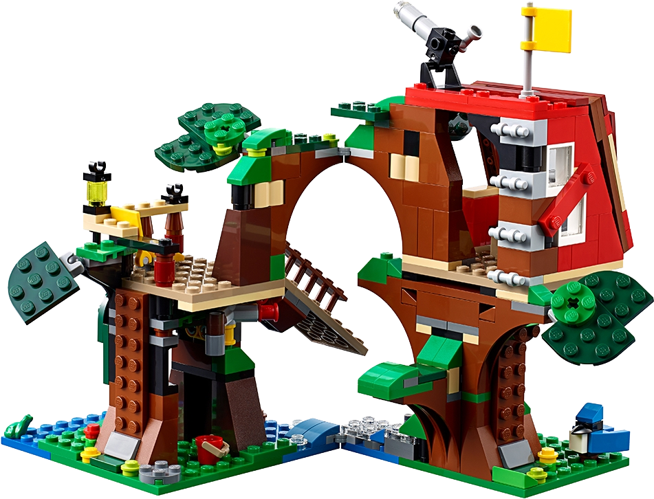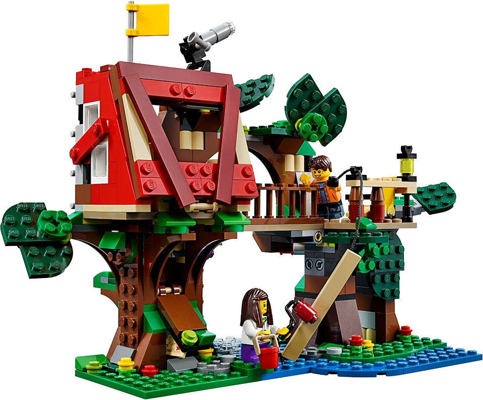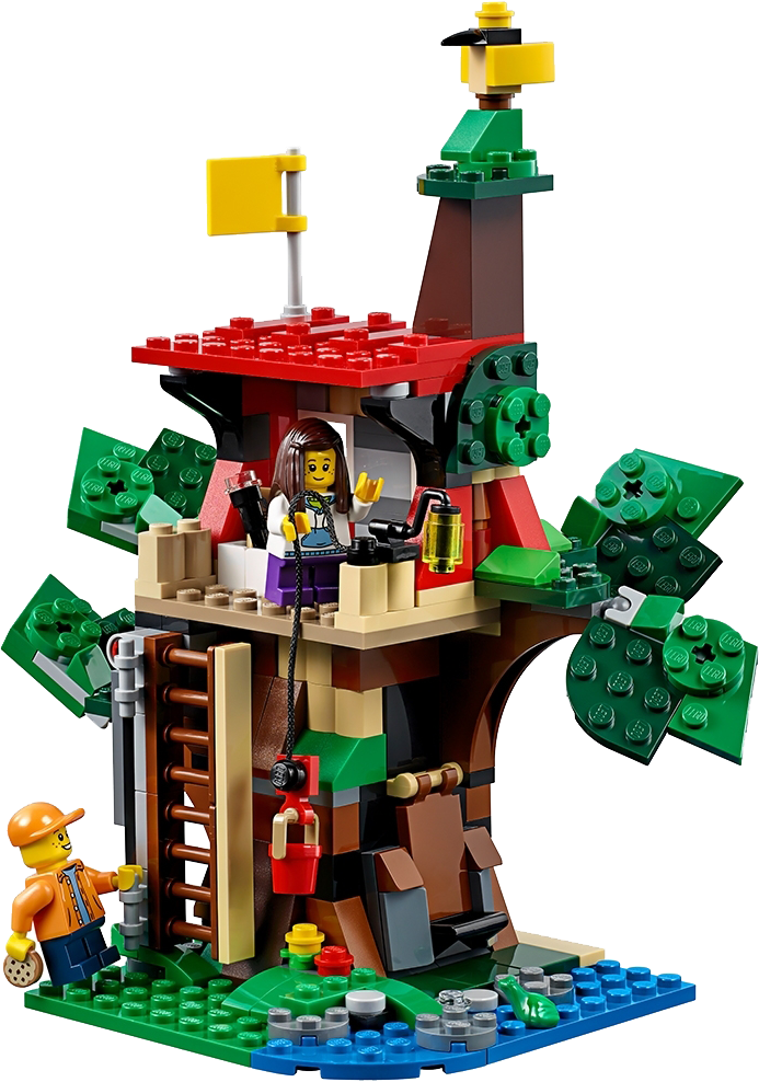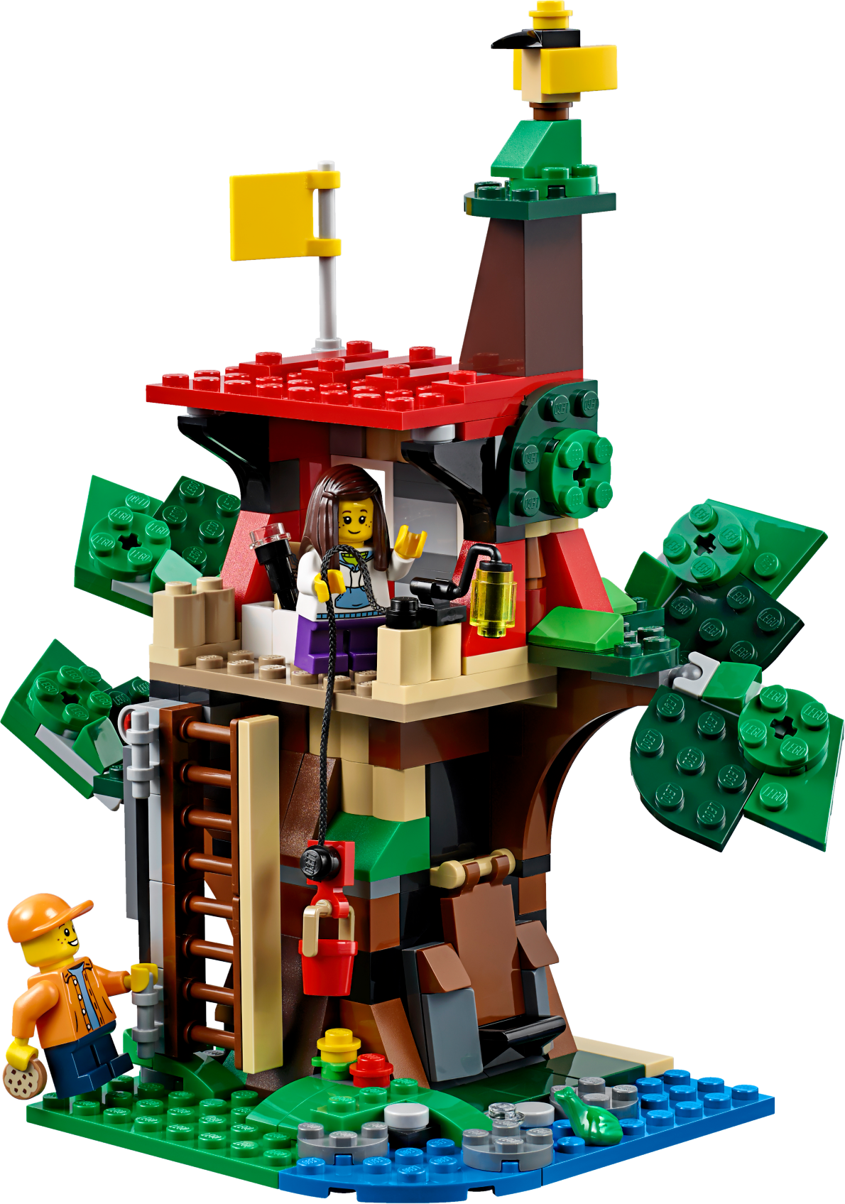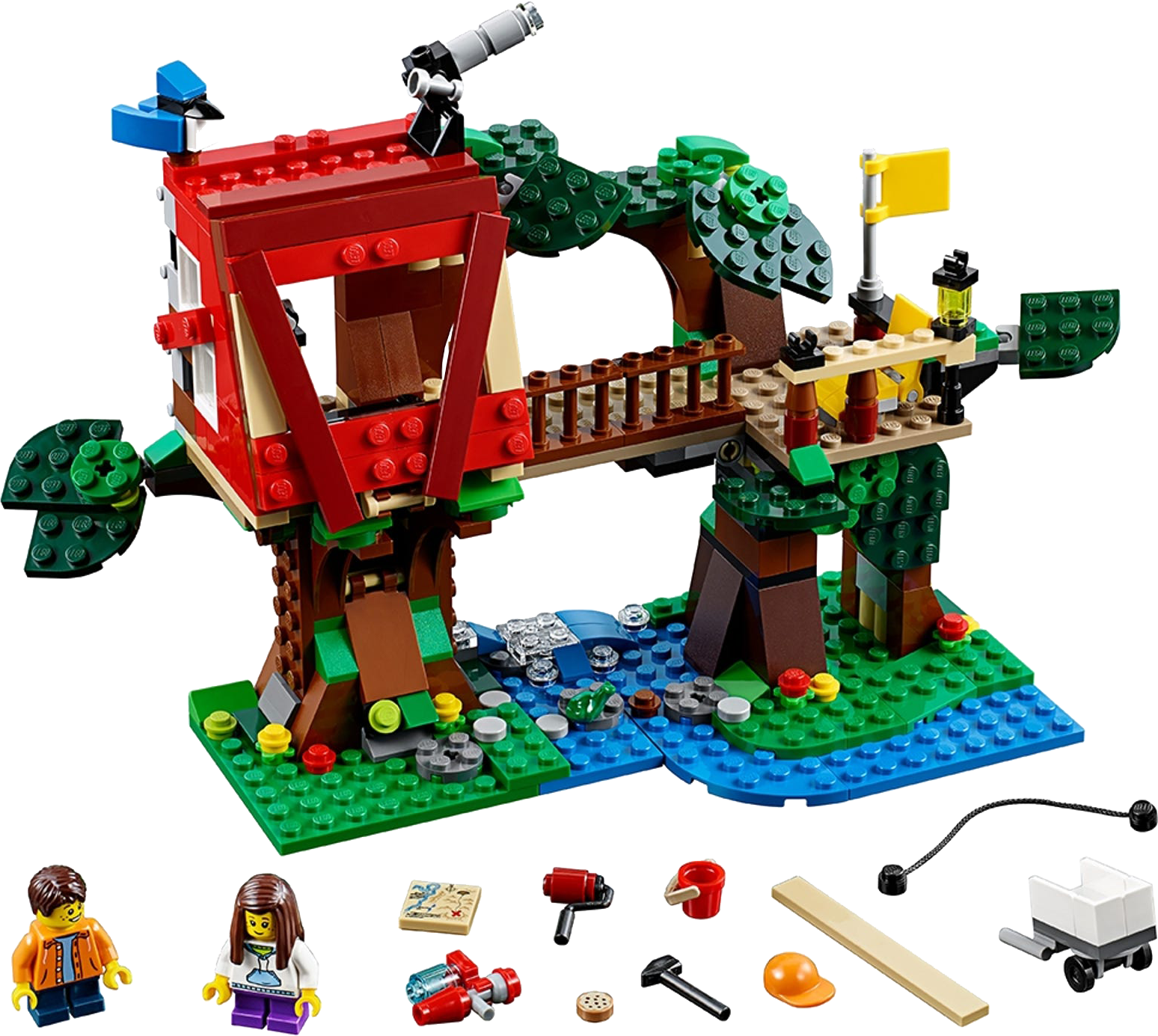 Spend happy days playing in the amazing treehouse! Enjoy exciting adventures with this colorful 3-in-1 LEGO® Creator model. Help the children build the treehouse. Lower the pulley to hoist up the planks, hammer the wood together and use the paint roller to add the final touches. When you're done building, put your tools in the secret hiding place and hoist the treehouse flag! Use the squirt gun to ward off invaders and have fun looking after the tiny blue jay and the frog that live in the tree. Rebuild to create a cool clubhouse or an awesome tree fort.Includes 2 minifigures, plus a blue jay and a frog.Features a colorful red-themed treehouse with ladder, hoist, telescope, flag, 2 lamps, secret compartment and a detailed interior.Open the hinged front to access the detailed interior.Fold out to create 2 treehouses with a connecting bridge.Keep a lookout with the telescope.Fetch new building materials in the wheelbarrow.Accessory elements include a wheelbarrow, hard hat, treasure map, squirt gun, hammer, paint bucket, paint roller, unpainted plank of wood, chair and a cookie.This set offers an age-appropriate building experience for ages 7-12.This set includes over 360 LEGO® pieces.3-in-1 model: rebuilds into a clubhouse or a tree fort.Treehouse measures over 6” (17cm) high, 10” (26cm) wide and 5” (13cm) deep.Clubhouse measures over 5” (13cm) high, 7” (18cm) wide and 5” (15cm) deep.Tree fort measures over 7” (20cm) high, 7” (19cm) wide and 5” (15cm) deep.