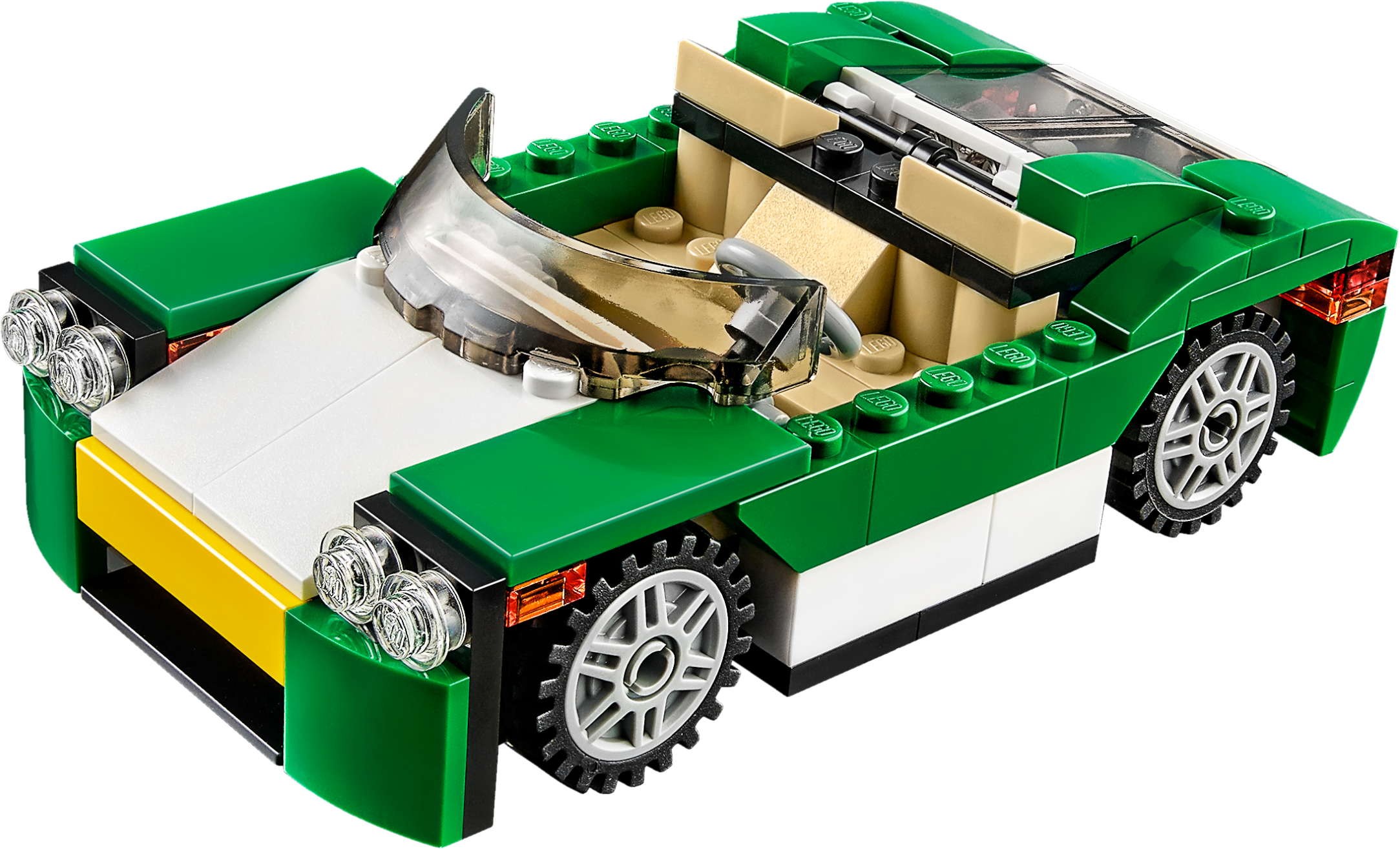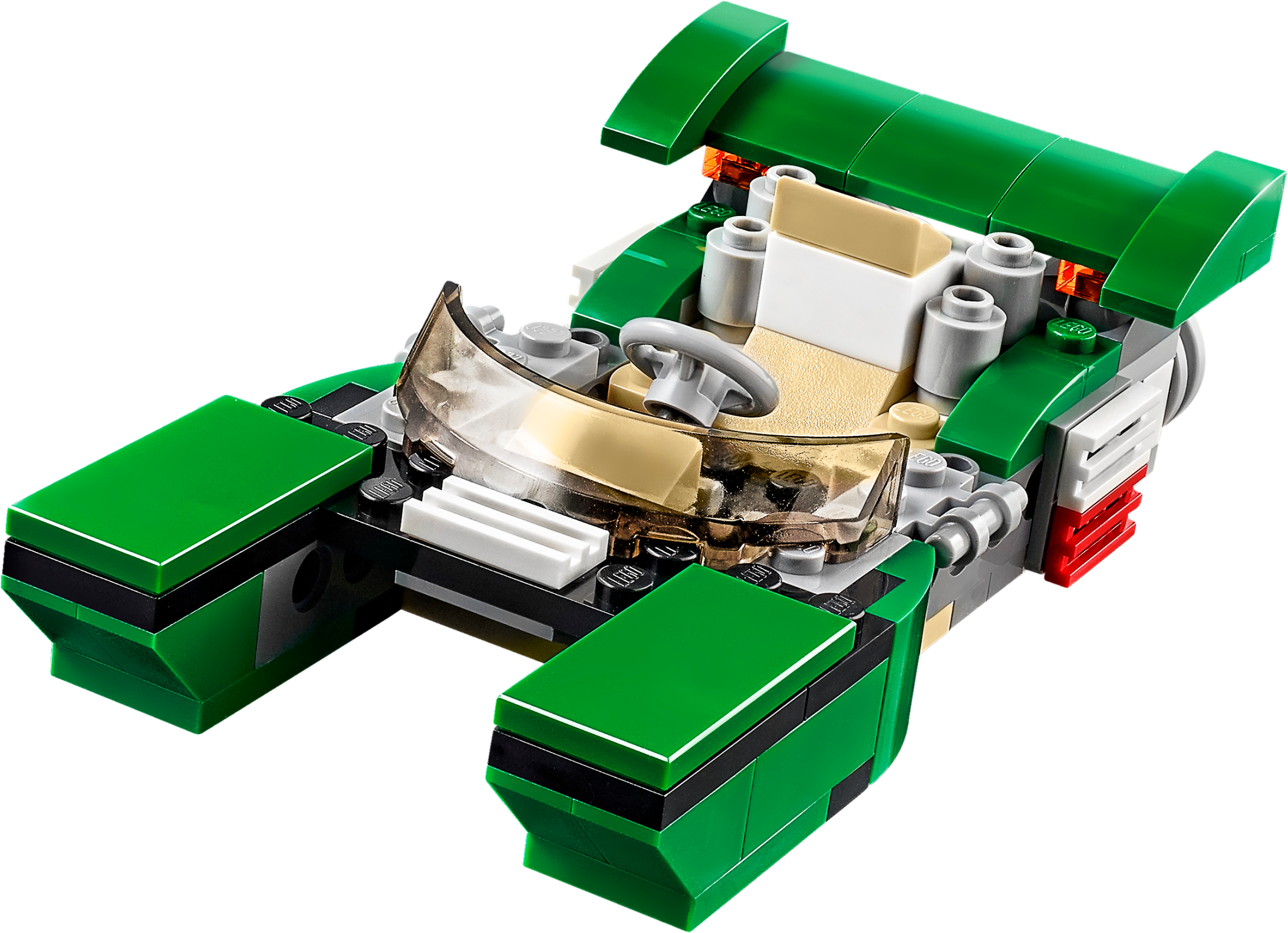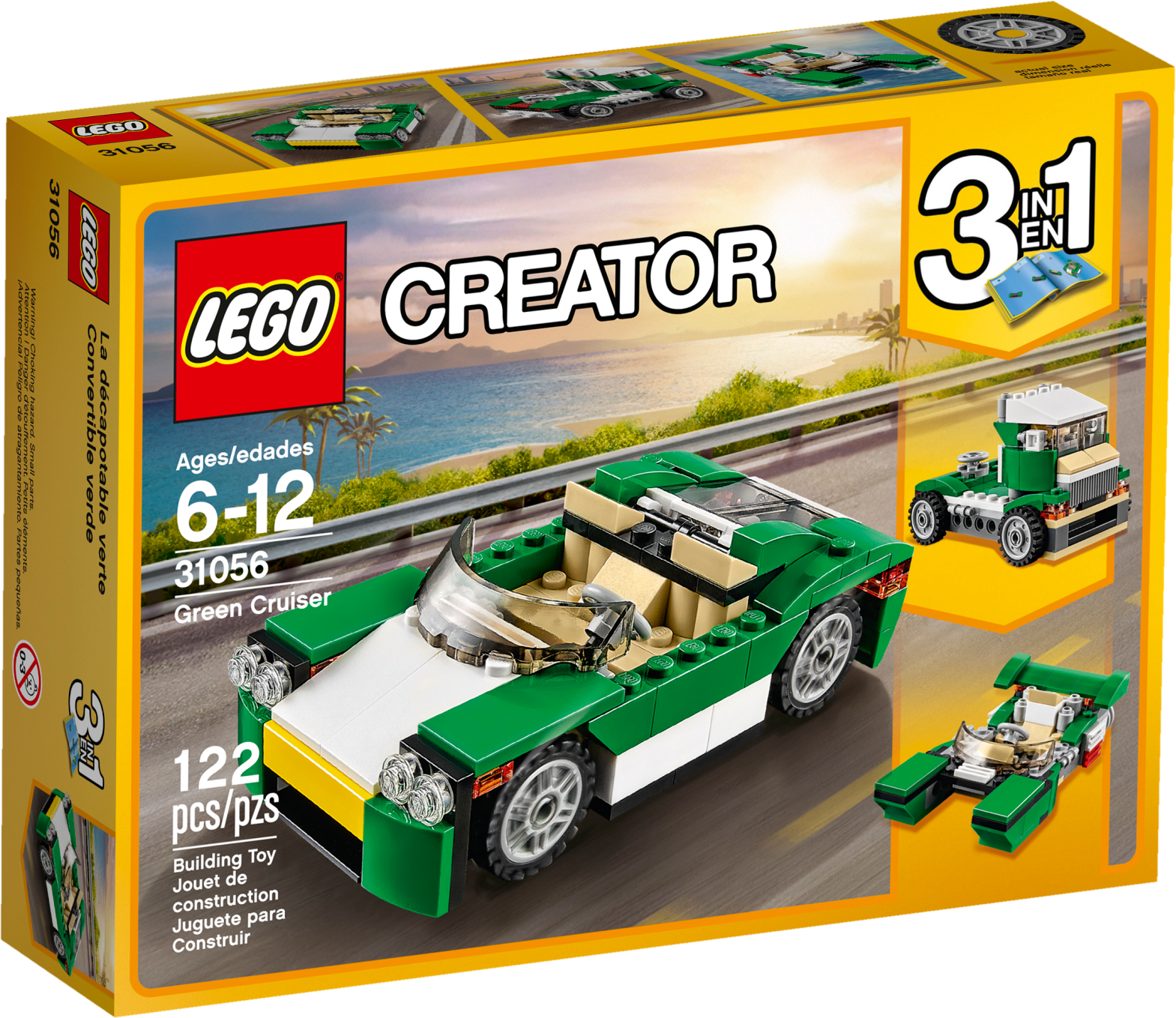 Drive in style with this sleek open-top Green Cruiser, featuring a green, white and black color scheme, tinted windshield, opening front trunk and rear hood, detailed engine, and a large two-minifigure cockpit with detailed dashboard and steering wheel. The 3-in-1 LEGO® Creator model has a three-part modular design for quick model reconfiguration, and rebuilds into a Fast Boat or a Truck. Features a tinted windshield, detailed dashboard, opening front trunk and opening, transparent rear hood with detailed engine. Check out the fresh green, white and black color scheme. Large cockpit with room for two minifigures (not included). Easy three-part modular design for quick model reconfiguration. This set includes over 120 pieces and offers an age-appropriate build and play experience for ages 6-12. 3-in-1 model: rebuilds into a Fast Boat or a rugged Truck. Green Cruiser measures over 1” (3cm) high, 4” (12cm) long and 2” (6cm) wide. Fast Boat measures over 1” (3cm) high, 4” (12cm) long and 2” (6cm) wide. Truck measures over 2” (6cm) high, 3” (10cm) long and 2” (6cm) wide.