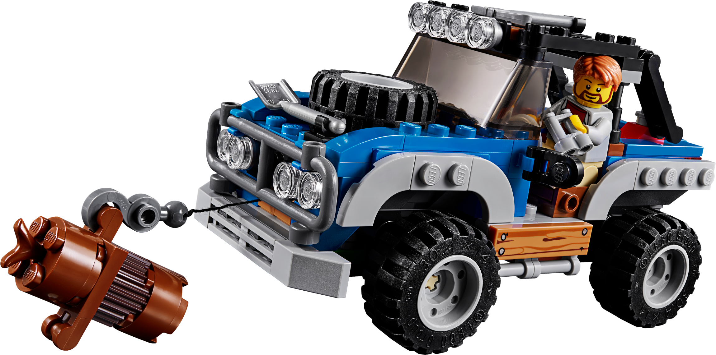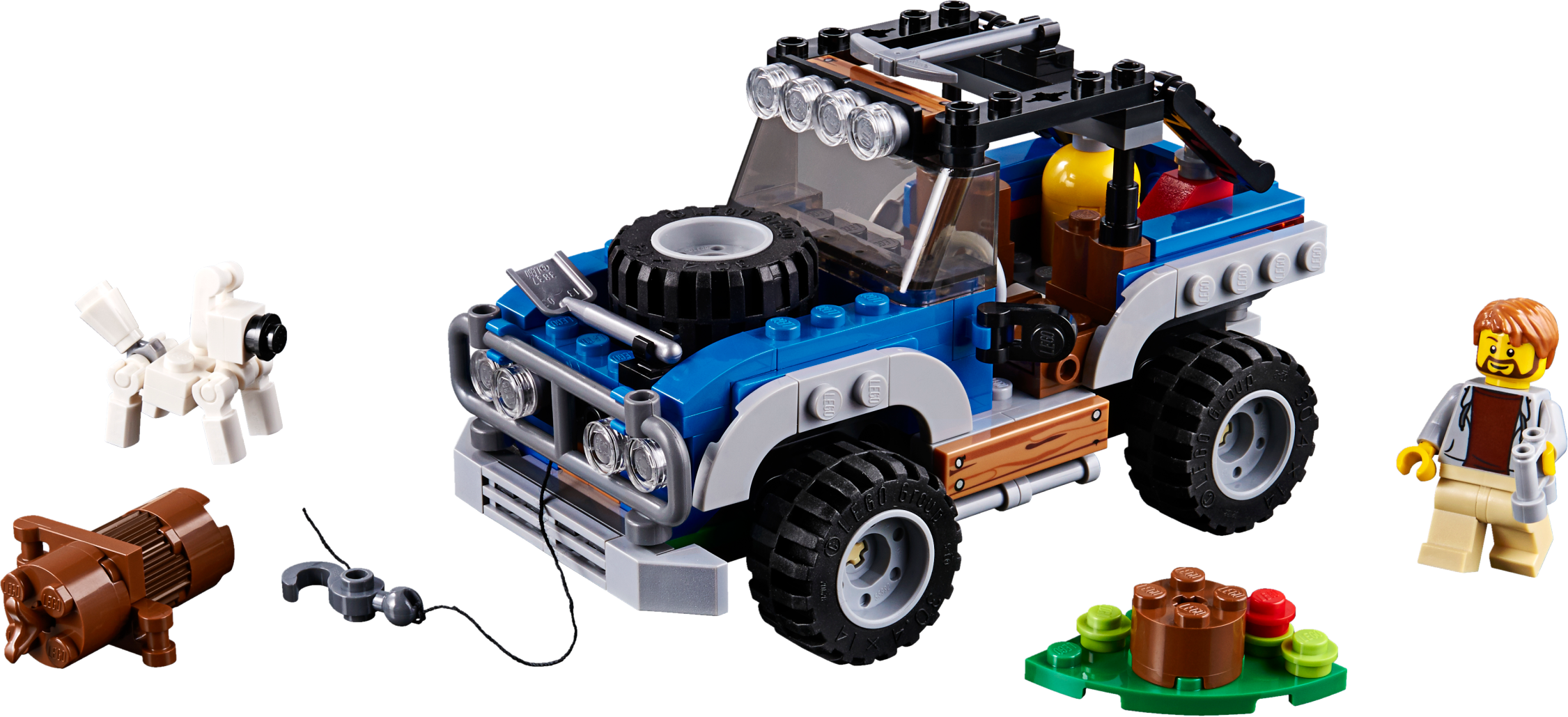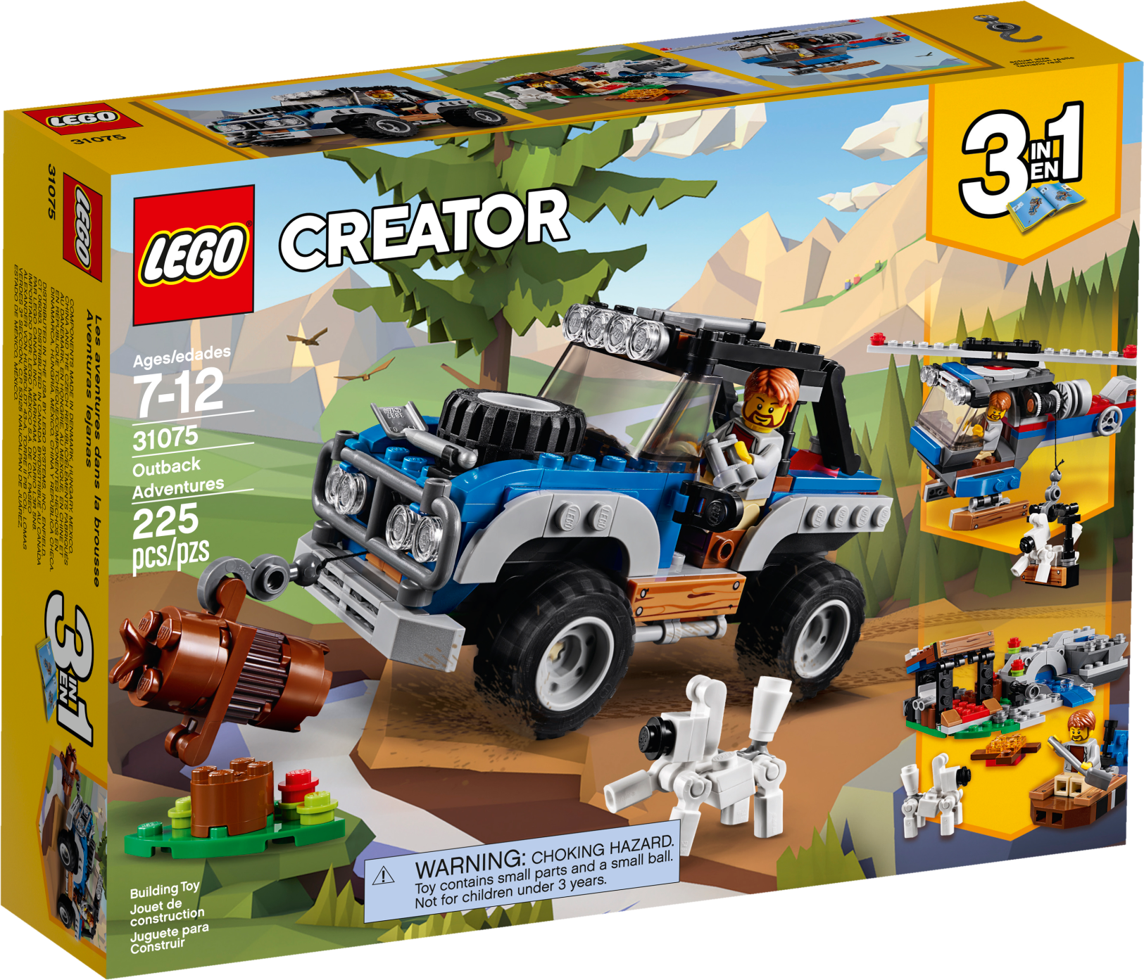 Set off on Outback Adventures with this awesome 3-in-1 set, featuring a classic Off-roader vehicle with roof spots, hood-mounted spare wheel, bull bar, minifigure cab with roll cage, and wide rims with chunky tires, plus a working winch and a buildable tree trunk and greenery. This LEGO® Creator toy for boys and girls rebuilds to create a Wilderness Campsite or a Winch Helicopter for even more excitement, and includes an explorer minifigure ready for adventure with his faithful buildable dog.