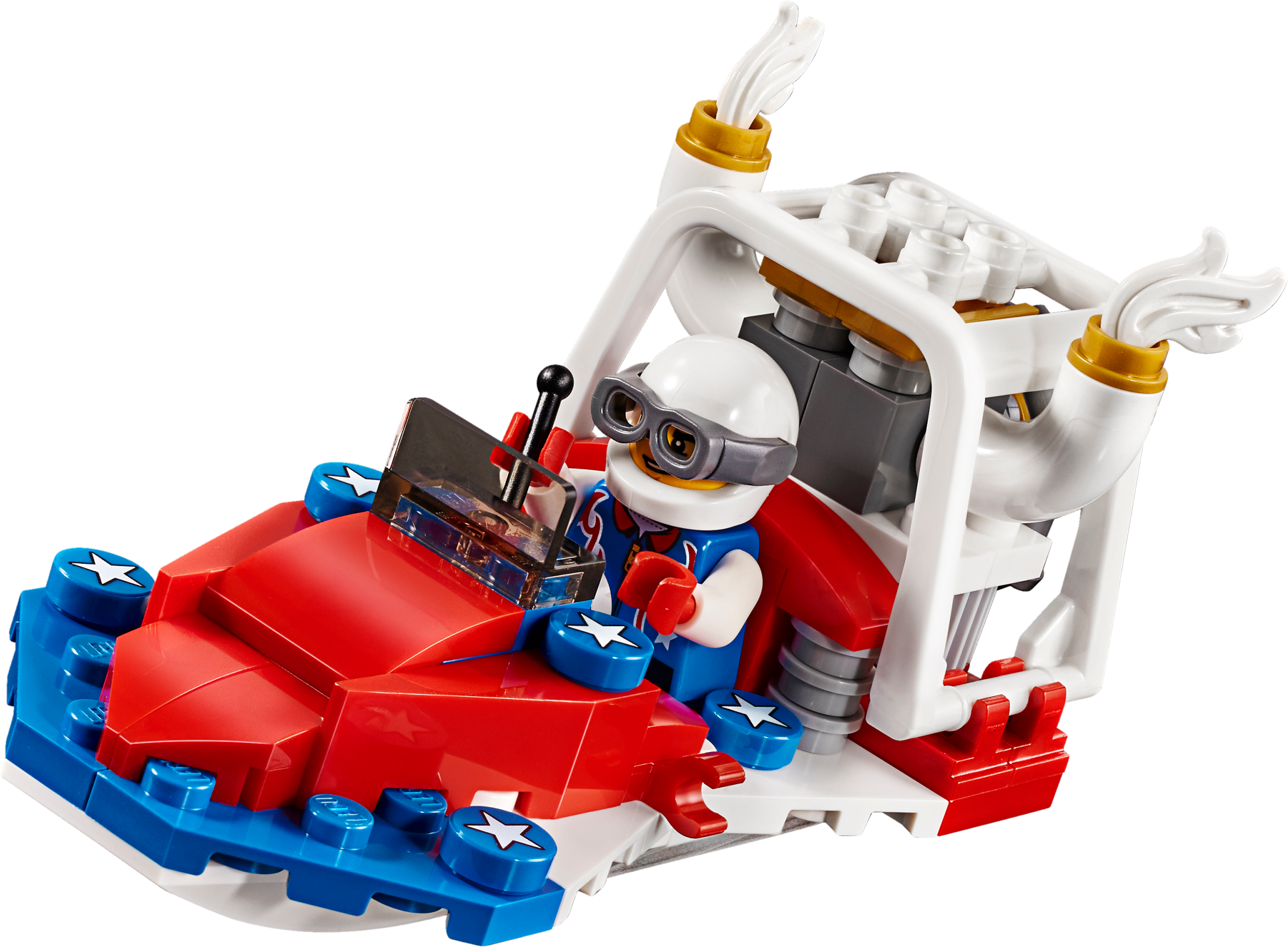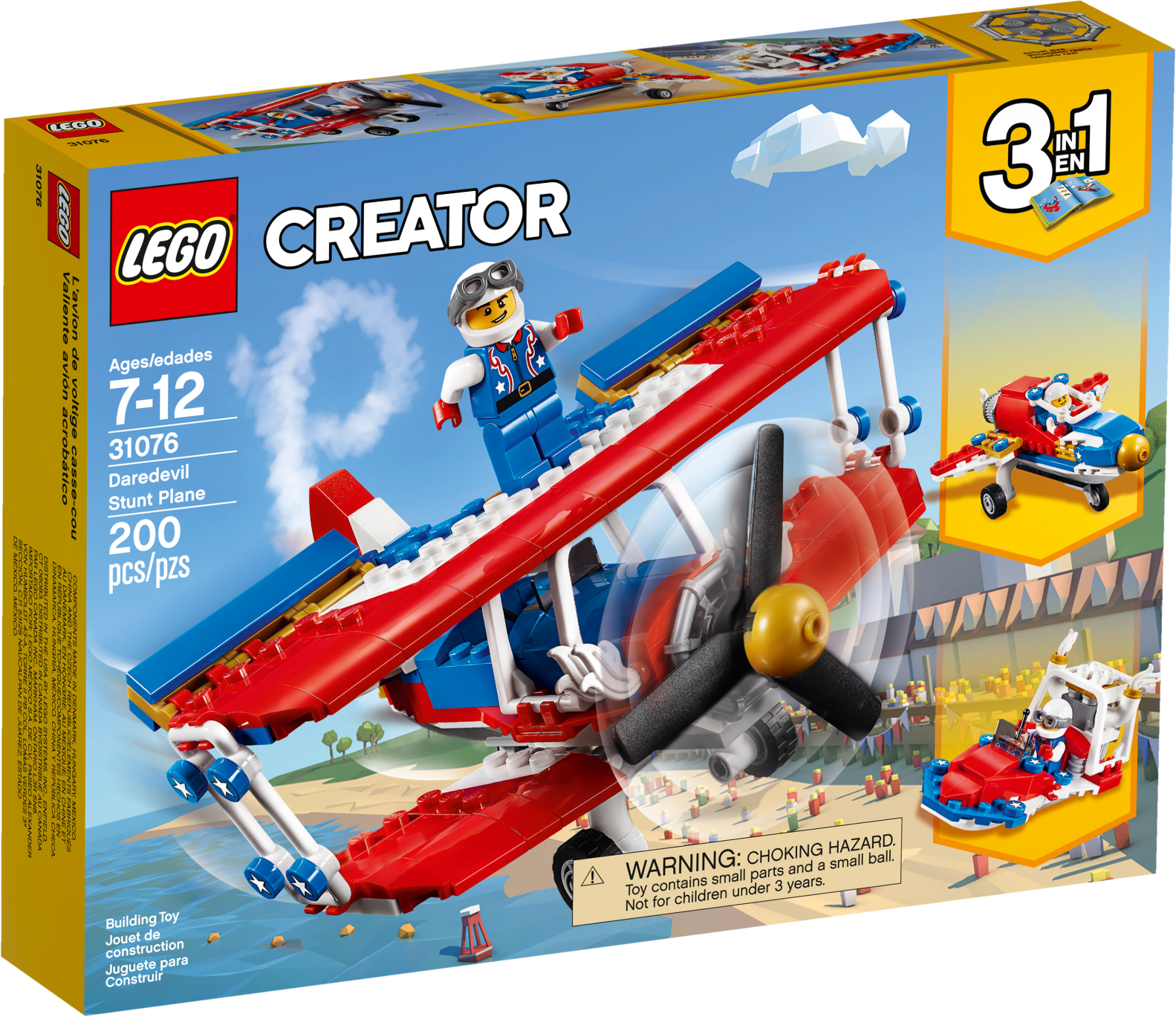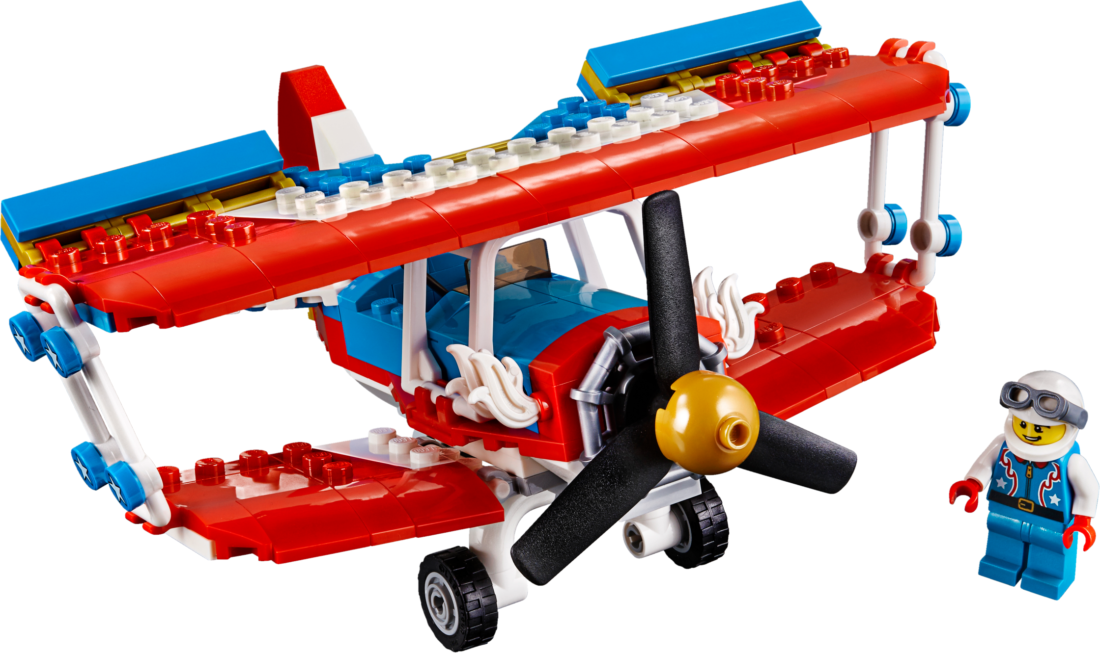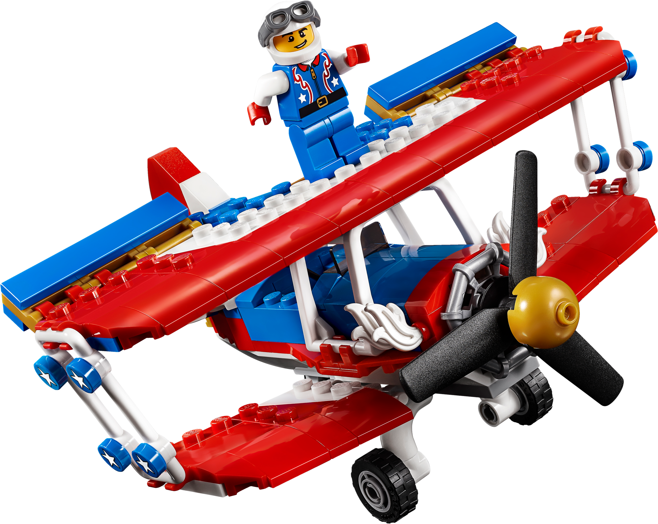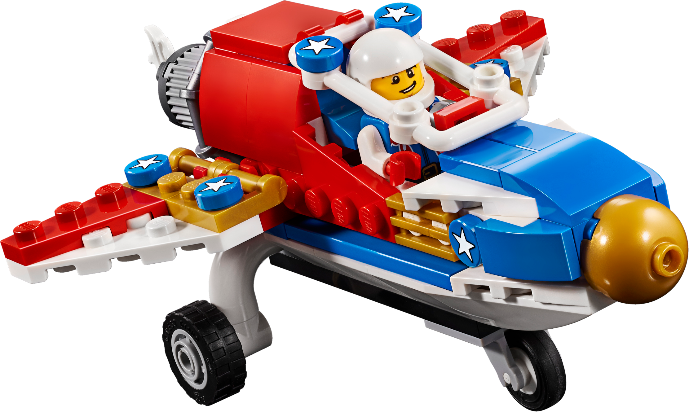 Perform amazing stunts with the Daredevil Stunt Plane set, featuring a classic biplane with a bright red, white and blue color scheme with star-printed elements and golden accents, minifigure cockpit, spinning propeller and a wheeled undercarriage. This 3-in-1 LEGO® Creator building toy rebuilds into a Rocket Car or a Rocket Boat for more exciting stunts and adventures, and includes a stuntman minifigure, ready to perform in his colorful stuntman suit, helmet and goggles.