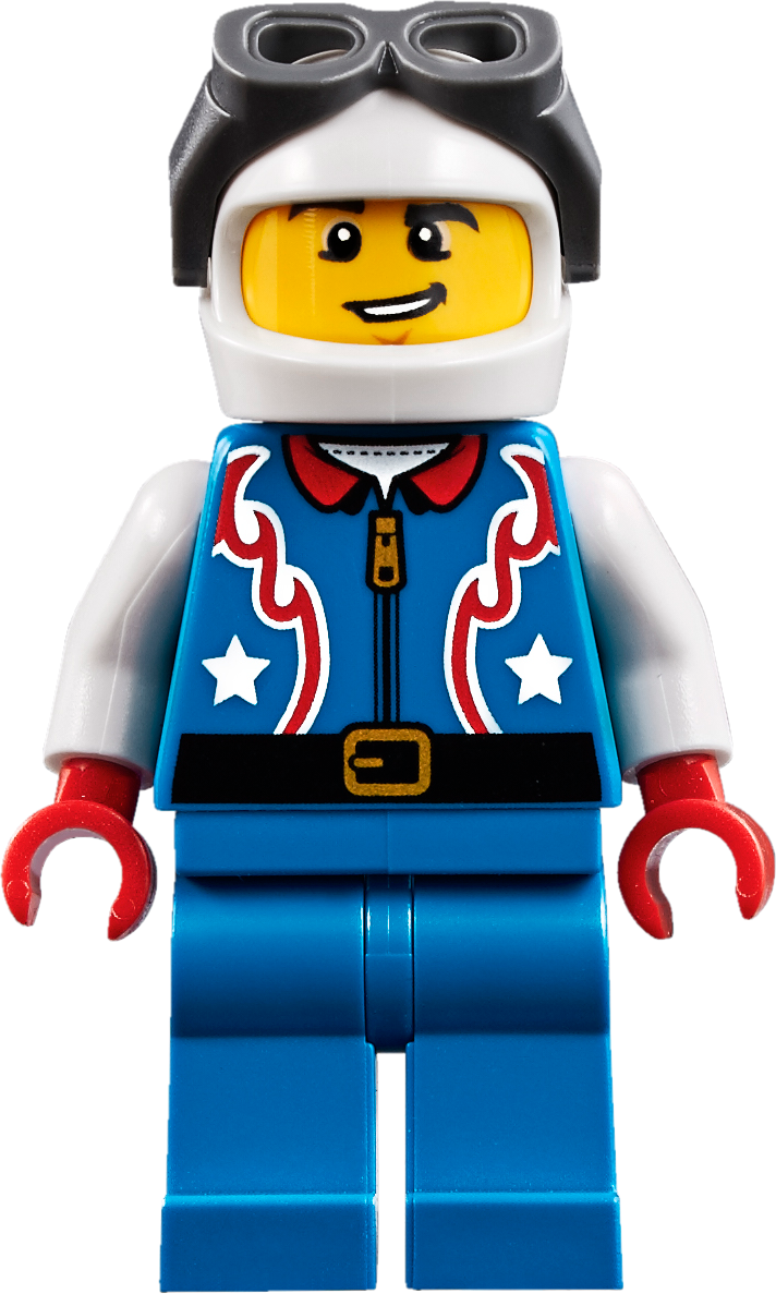 Includes a stuntman minifigure with a colorful stuntman suit, plus a safety helmet and goggles.