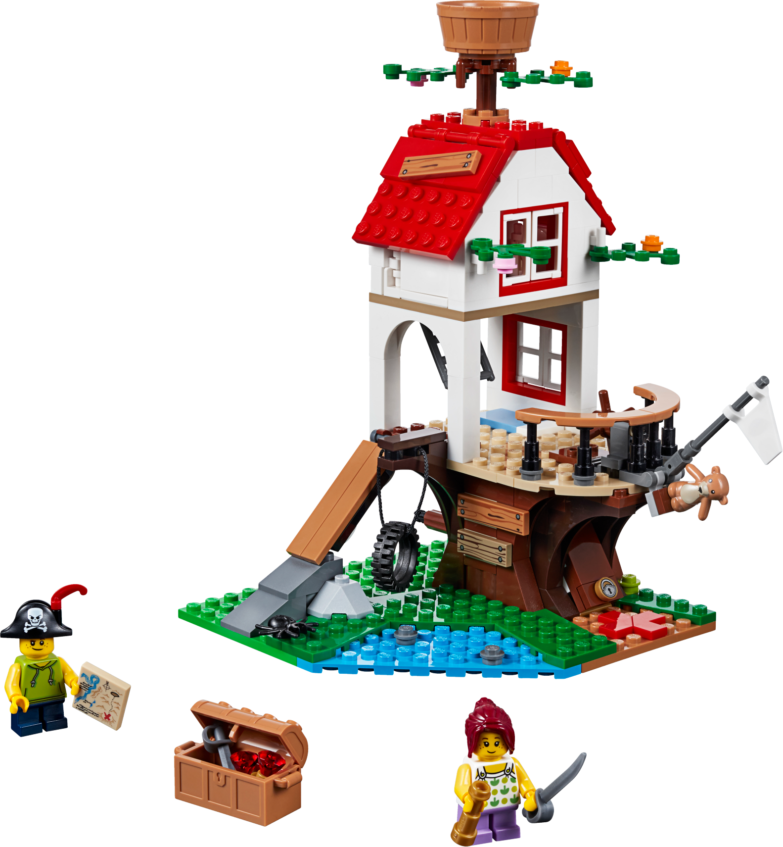 Includes 2 minifigures: a girl and a boy rigged out for pirate adventures, plus spider and teddy bear figures.