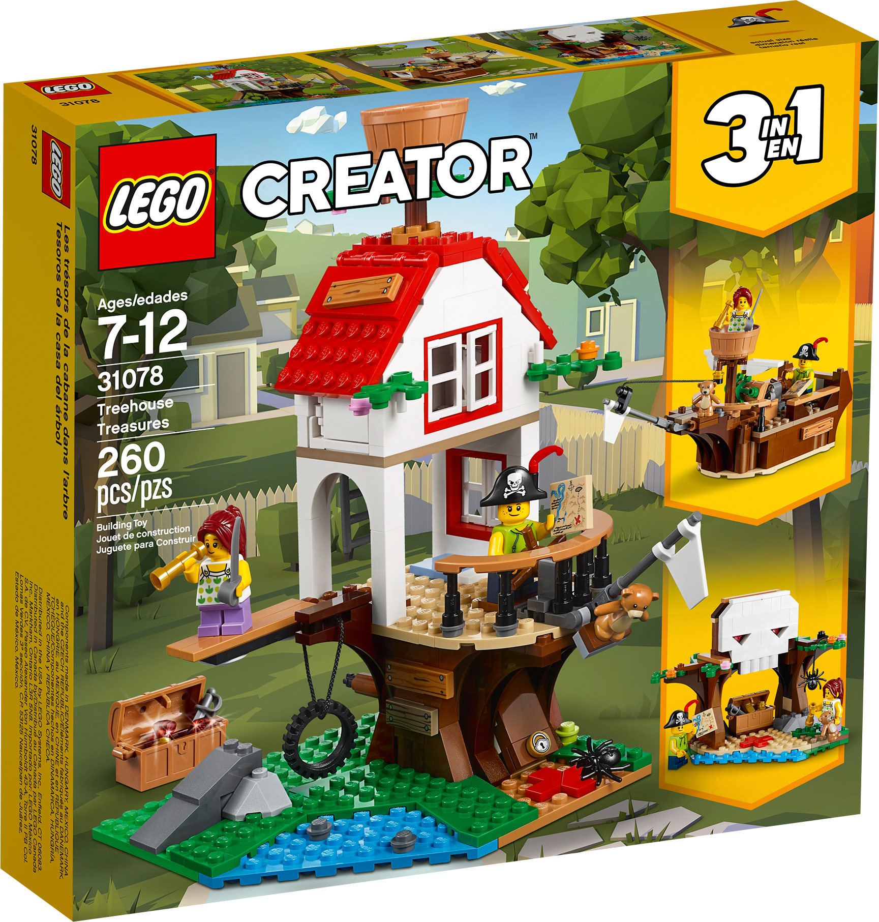 Enjoy imaginative pirate adventures with this LEGO® Creator 3in1 31078 Treehouse Treasures set, featuring a 3-level pirate ship treehouse with a ship deck, ship’s wheel, treasure chest hideaway function, bowsprit with flag and teddy bear, crow’s nest, tire swing and an upper-level den. Pirate accessories include a hat, telescope and 2 swords. This 3in1 model rebuilds into a Pirate Ship or a Skull Cave for more pirating fun, and includes 2 minifigures rigged out for pirate adventures, plus a scary spider figure.