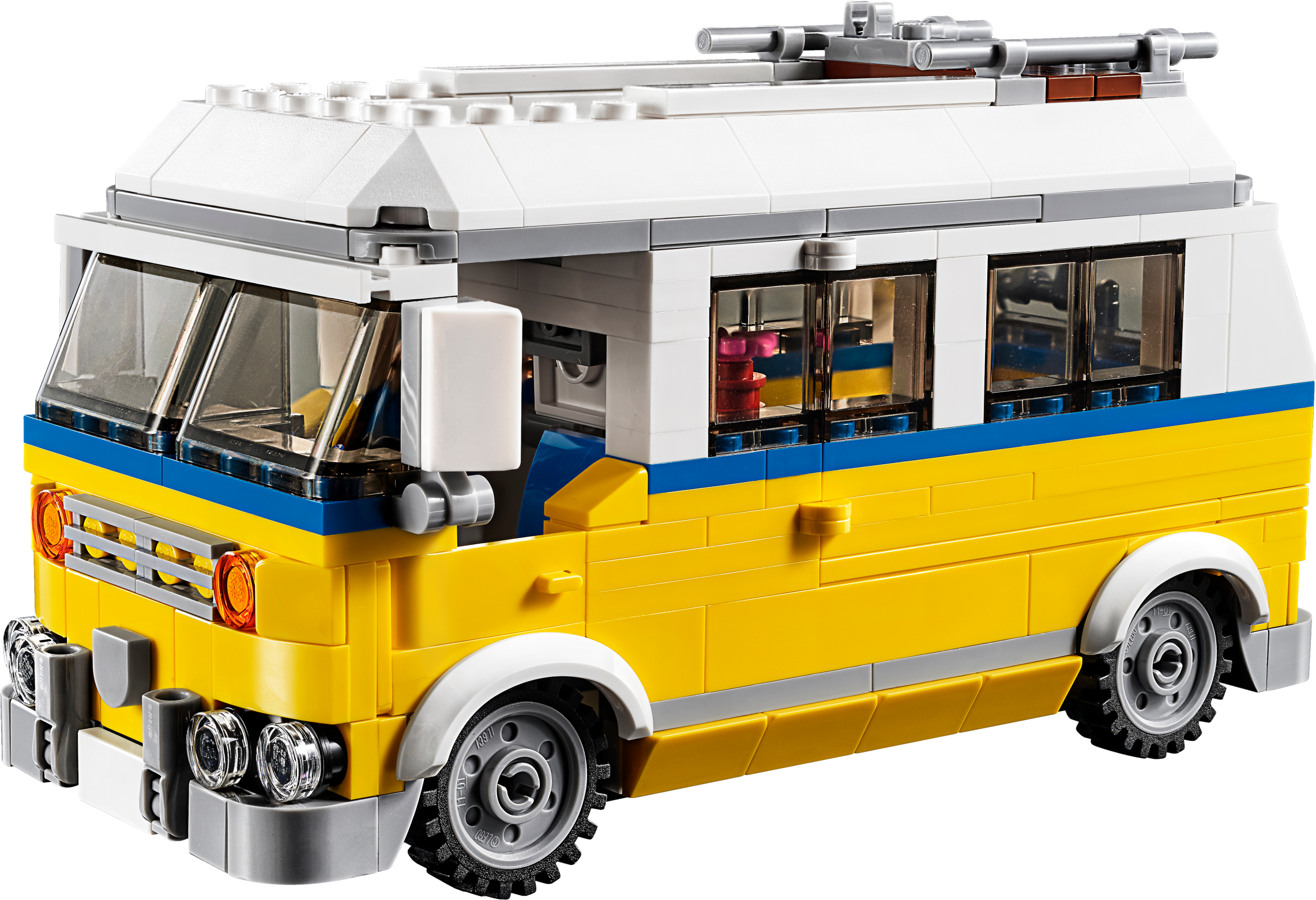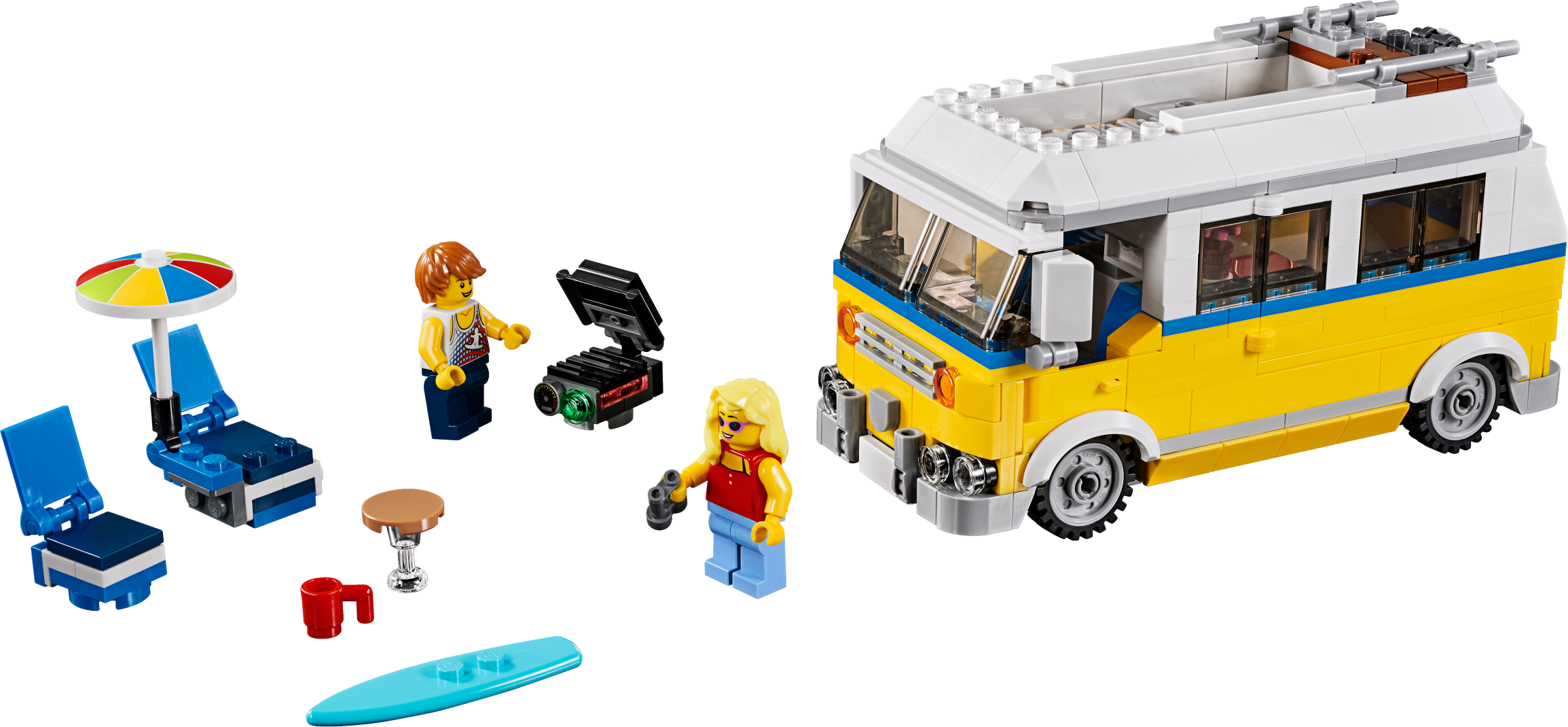 Head out on summer adventures with the Sunshine Surfer Van set, featuring a camper with a bright yellow, white and blue color scheme, and a host of realistic details including a roof rack for storing the included surfboard, foldaway sun lounger and chair, parasol, table and barbecue. Remove the roof and side section for access to the detailed interior, complete with fold-down bed, TV and kitchenette. This 3-in-1 LEGO® Creator construction toy rebuilds into a Lifeguard Tower or a Beach Buggy for even more seaside fun, and includes 2 minifigures, both ready for summer adventures.