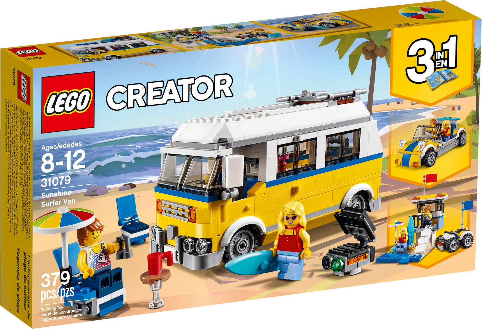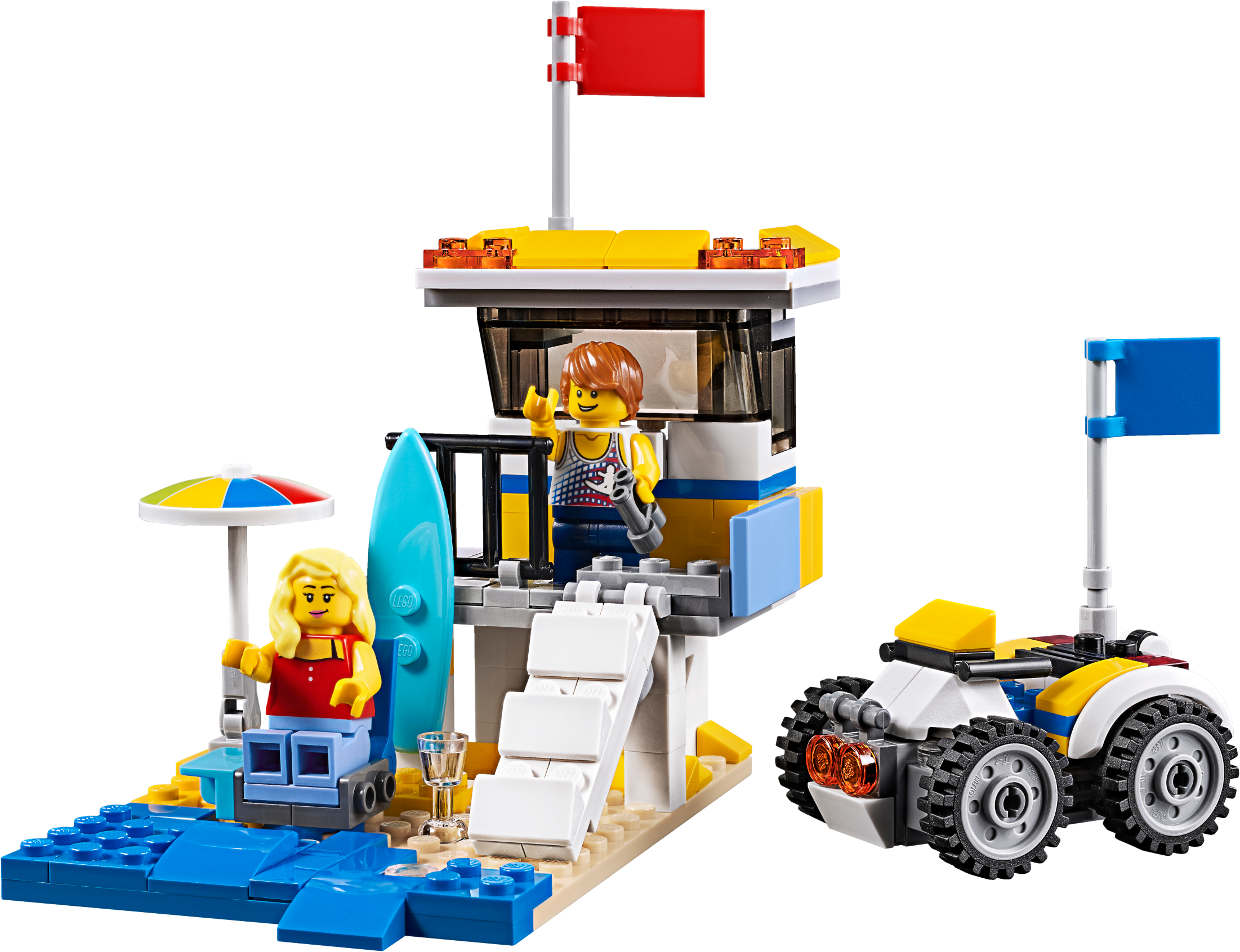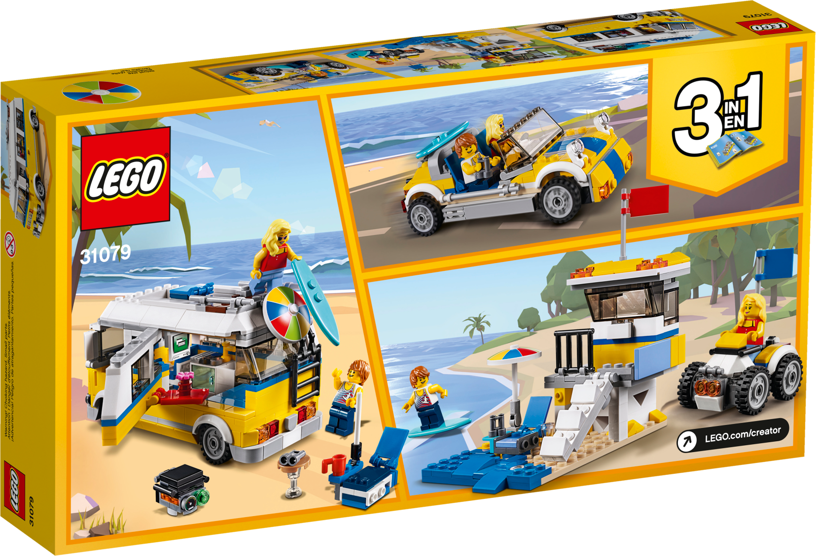 Continue the adventure with this 3-in-1 model. Rebuild the Sunshine Surfer Van to create a Lifeguard Tower and rush to the rescue on a cool quad bike, or create an awesome Beach Buggy for racing over the dunes.