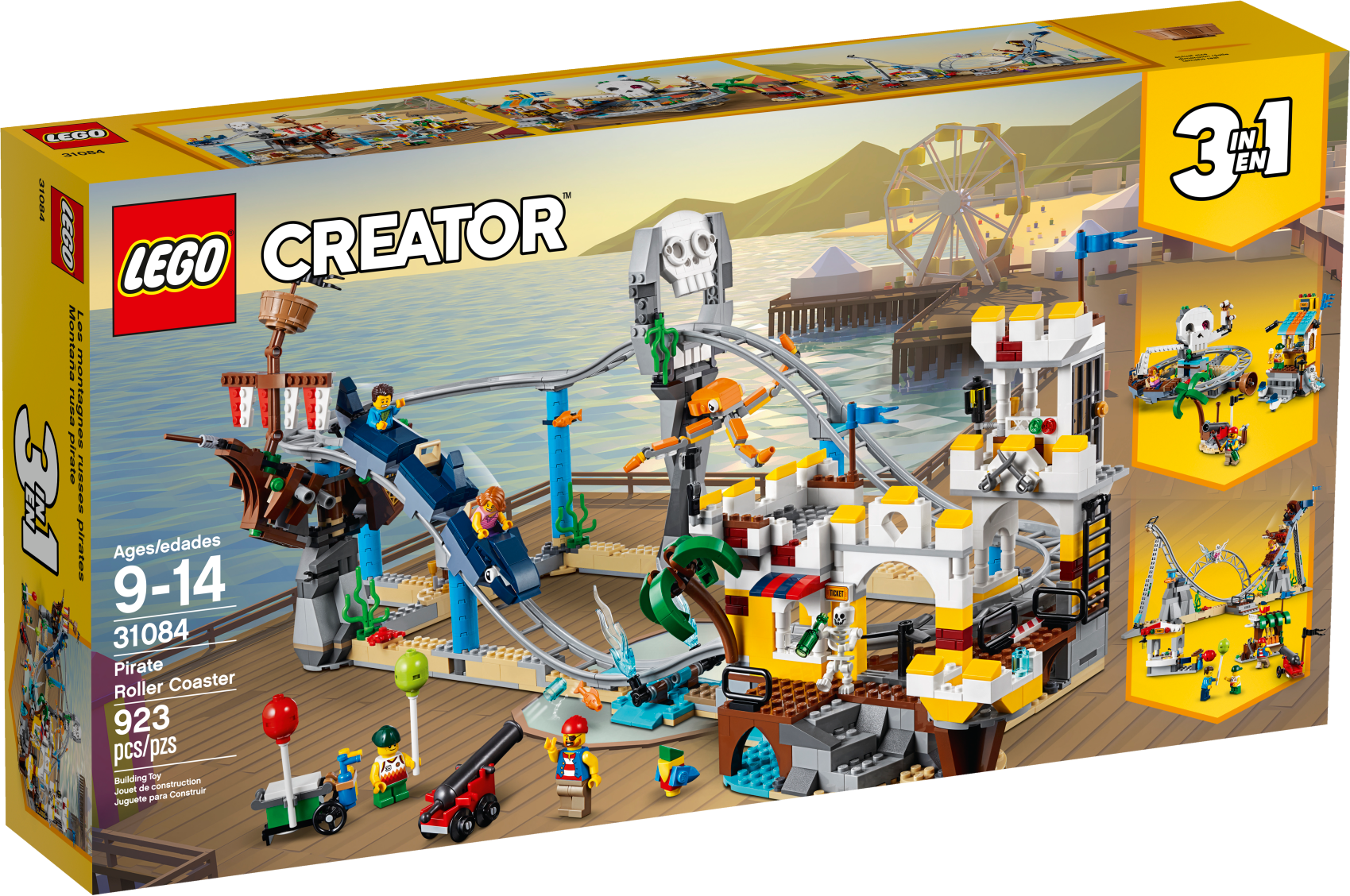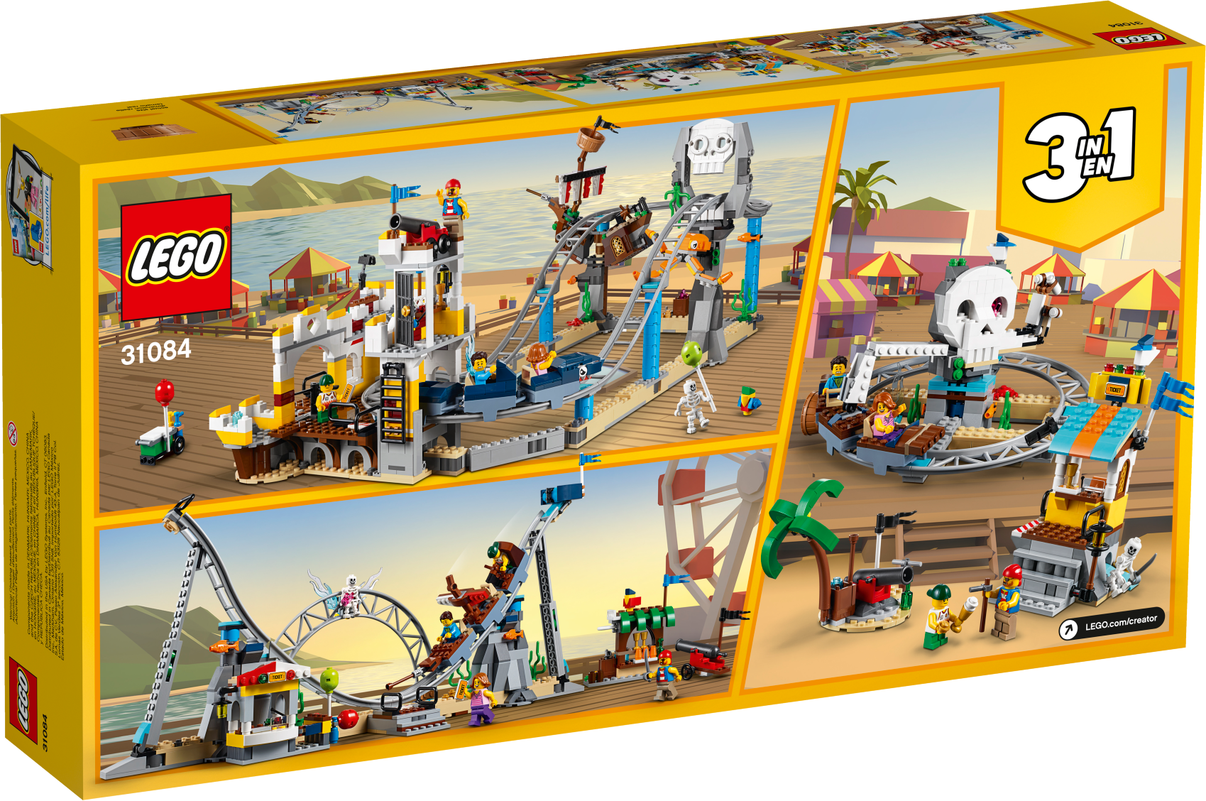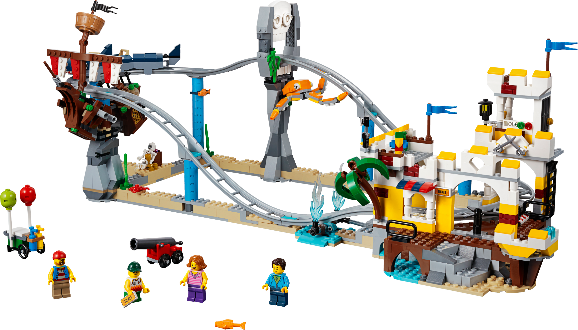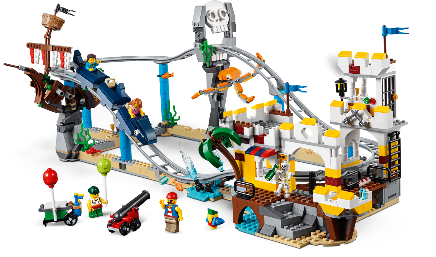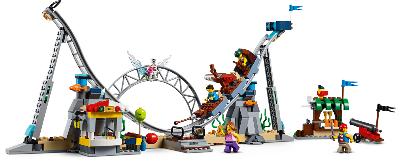 Hold tight and prepare to scream as you set out on a LEGO® Creator 3in1 31084 Pirate Roller Coaster adventure. This amazing set features a functional roller coaster with pirate-themed props, including a sunken galleon, skull archway, palm tree and an octopus. The working carriages are shark-themed and the ride's main drop has a water splash feature and a cannon that fires water elements. Other features include a ticket booth and a balloon stand. This set can be rebuilt for further LEGO fairground adventures aboard The Skull Ride or The Ship Ride, and comes with 4 minifigures ready for the fun of the fairground, plus a skeleton figure.