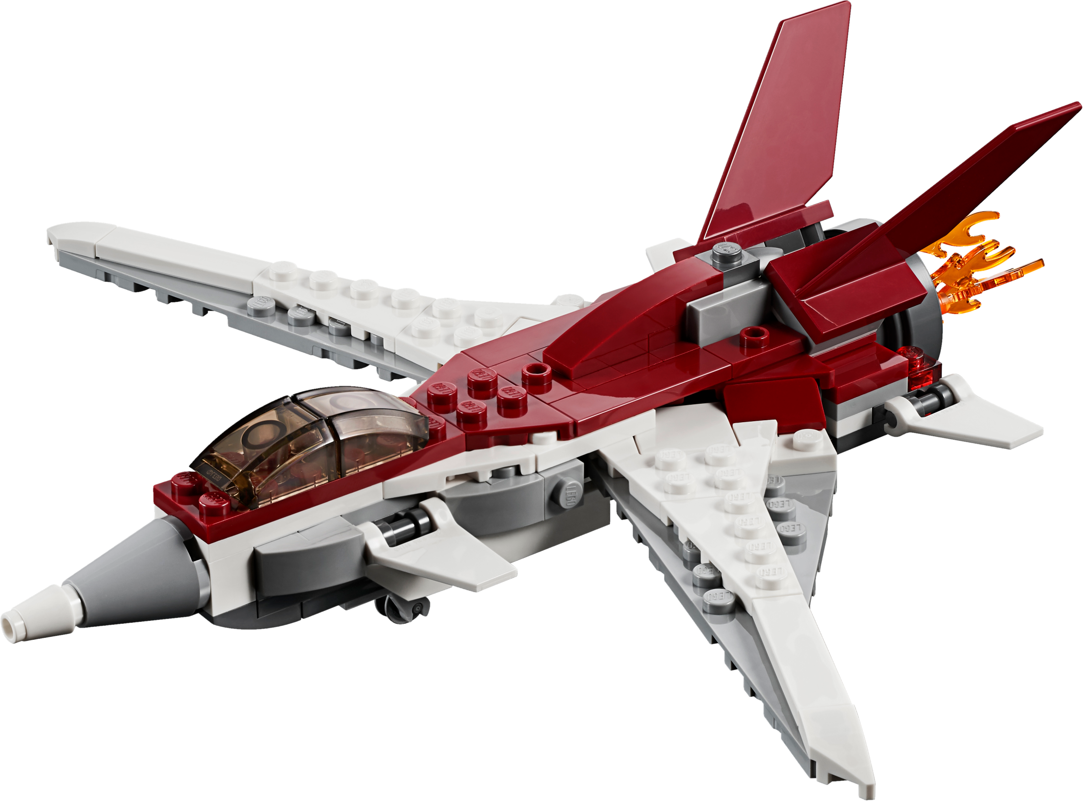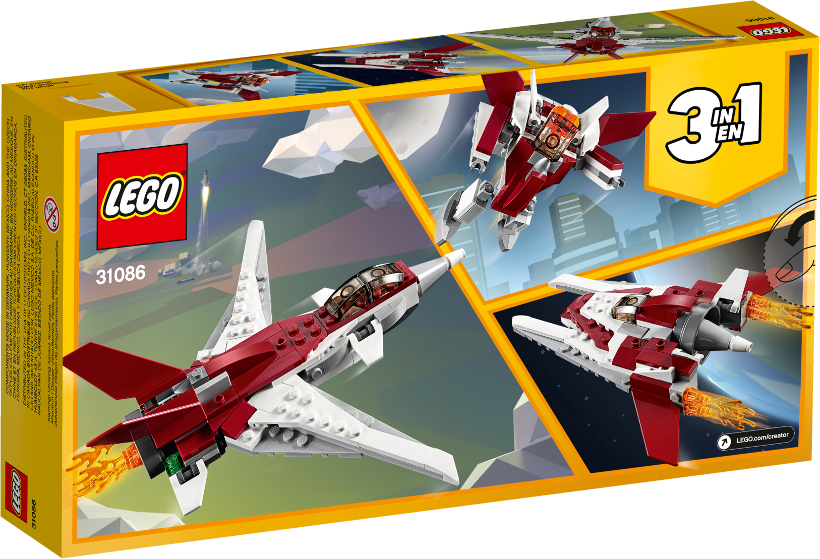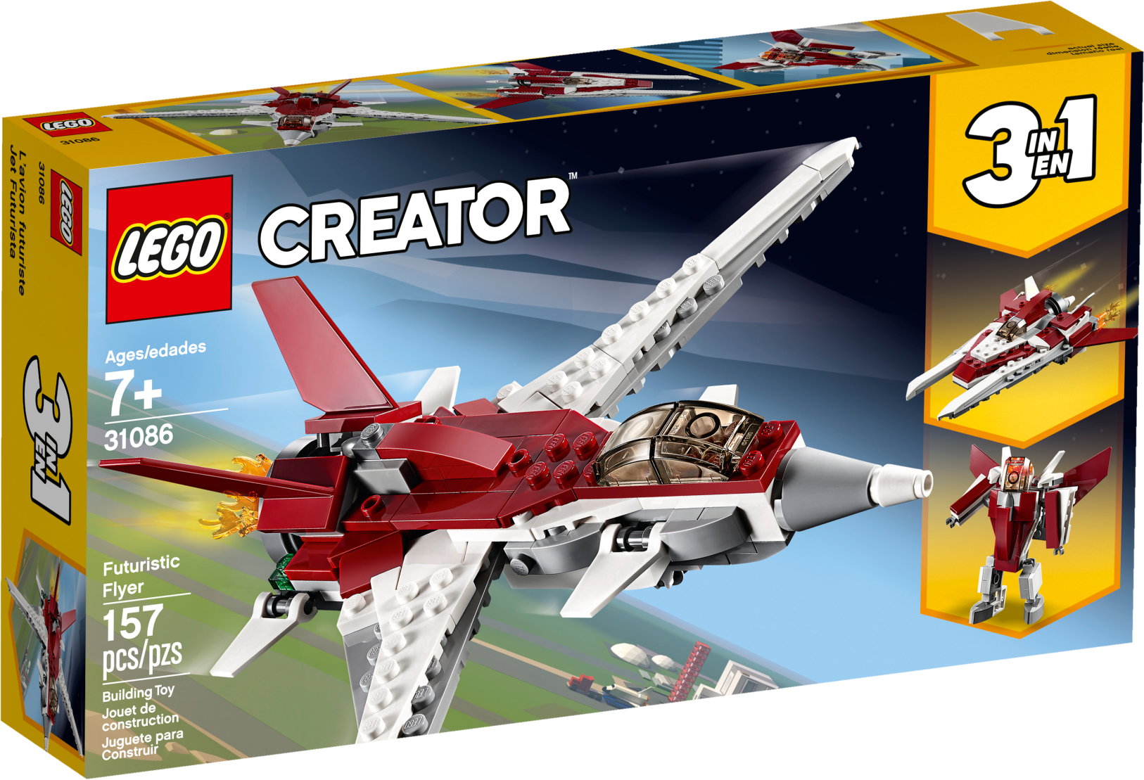 Get set for supersonic fun with the LEGO® Creator 3in1 31086 Futuristic Flyer, featuring an awesome dark red and white color scheme, forward swept wings, tinted cockpit, fixed landing gear and a flaming jet engine. With this LEGO Creator 3in1 set you get 3 different build and play experiences. Build the Futuristic Flyer and then rebuild it into a Futuristic Spaceship toy or a Futuristic LEGO Robot with wings and backpack for more sci-fi fun. Enjoy 3 building opportunities with this LEGO® Creator 3in1 set. Build the Futuristic Flyer, then rebuild and head into space with a Futuristic Spaceship or enjoy sci-fi adventures with a flying Futuristic Robot. The Futuristic Flyer features forward swept wings, a tinted cockpit, fixed landing gear and a flaming jet engine. Check out the futuristic flyer's dark red and white color scheme. Take control of this awesome plane and head for the skies for supersonic jet adventures. Futuristic Flyer measures over 2” (7cm) high, 7” (20cm) long and 8” (22cm) wide. Futuristic Spaceship measures over 1” (4cm) high, 6” (17cm) long and 5” (14cm) wide. Futuristic Robot stands over 3” (10cm) high.
