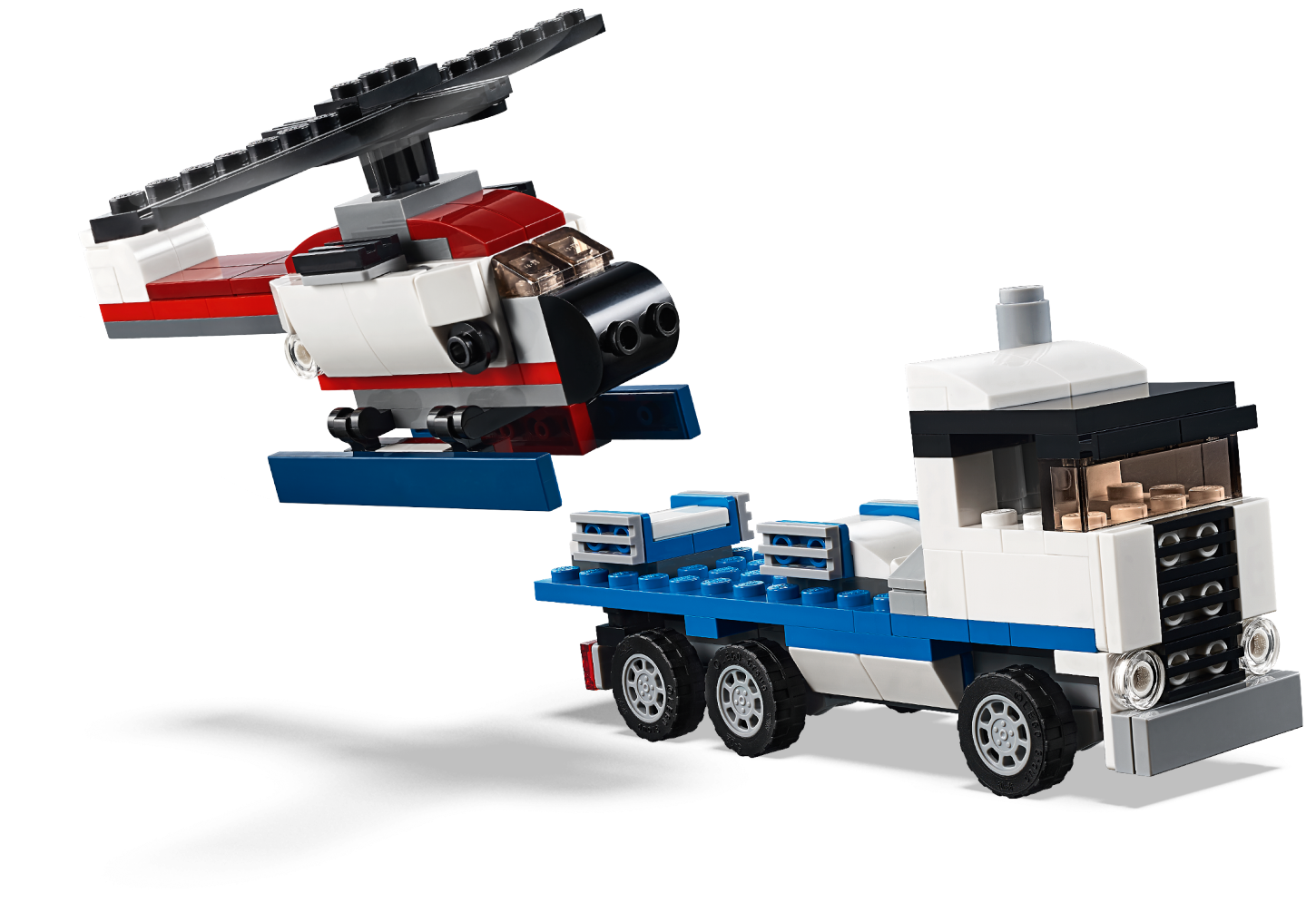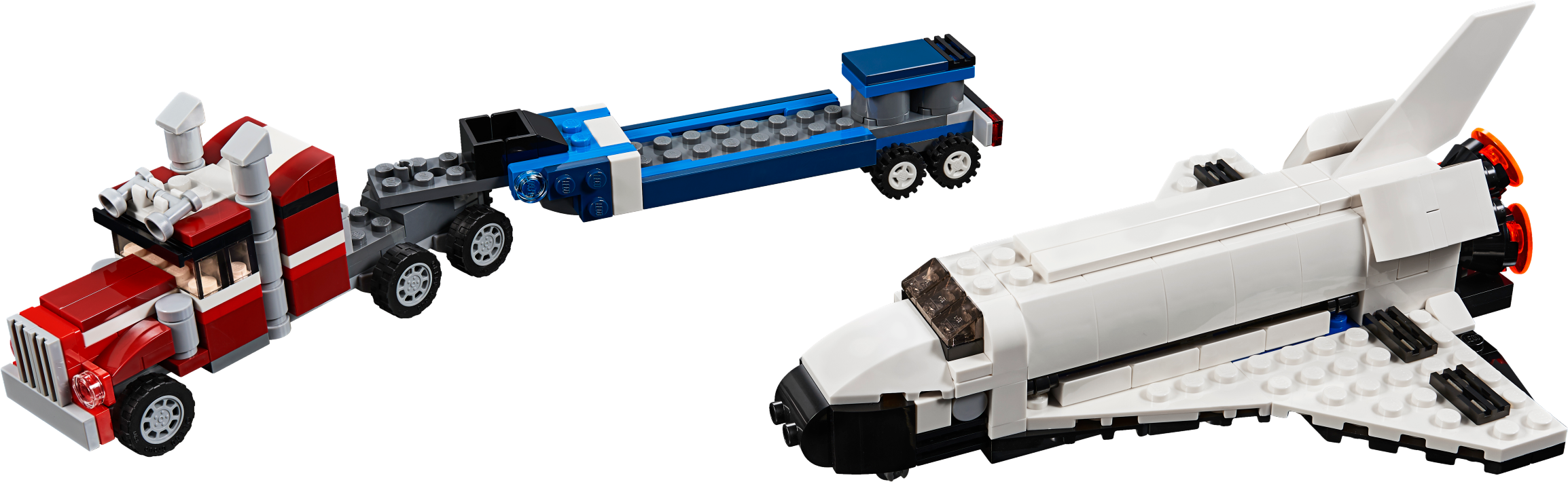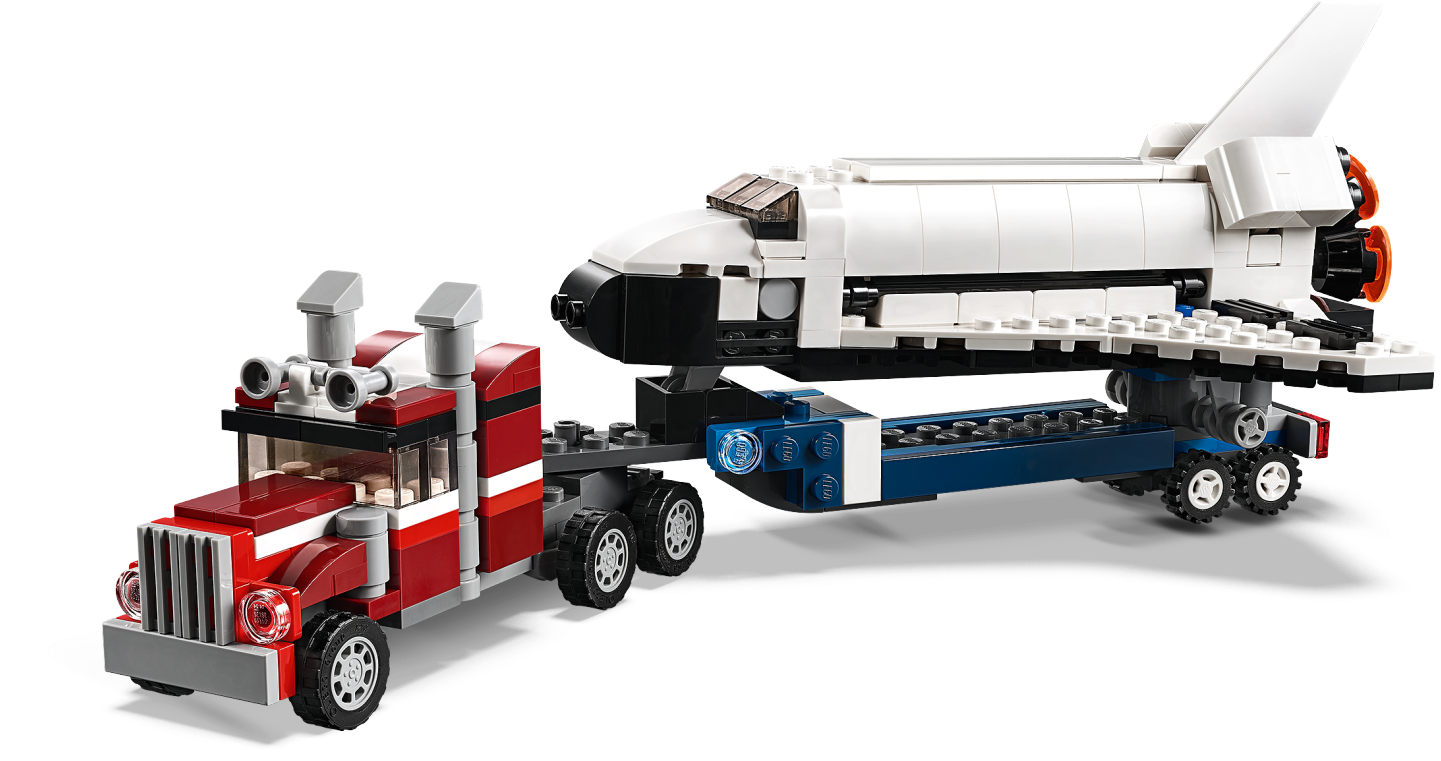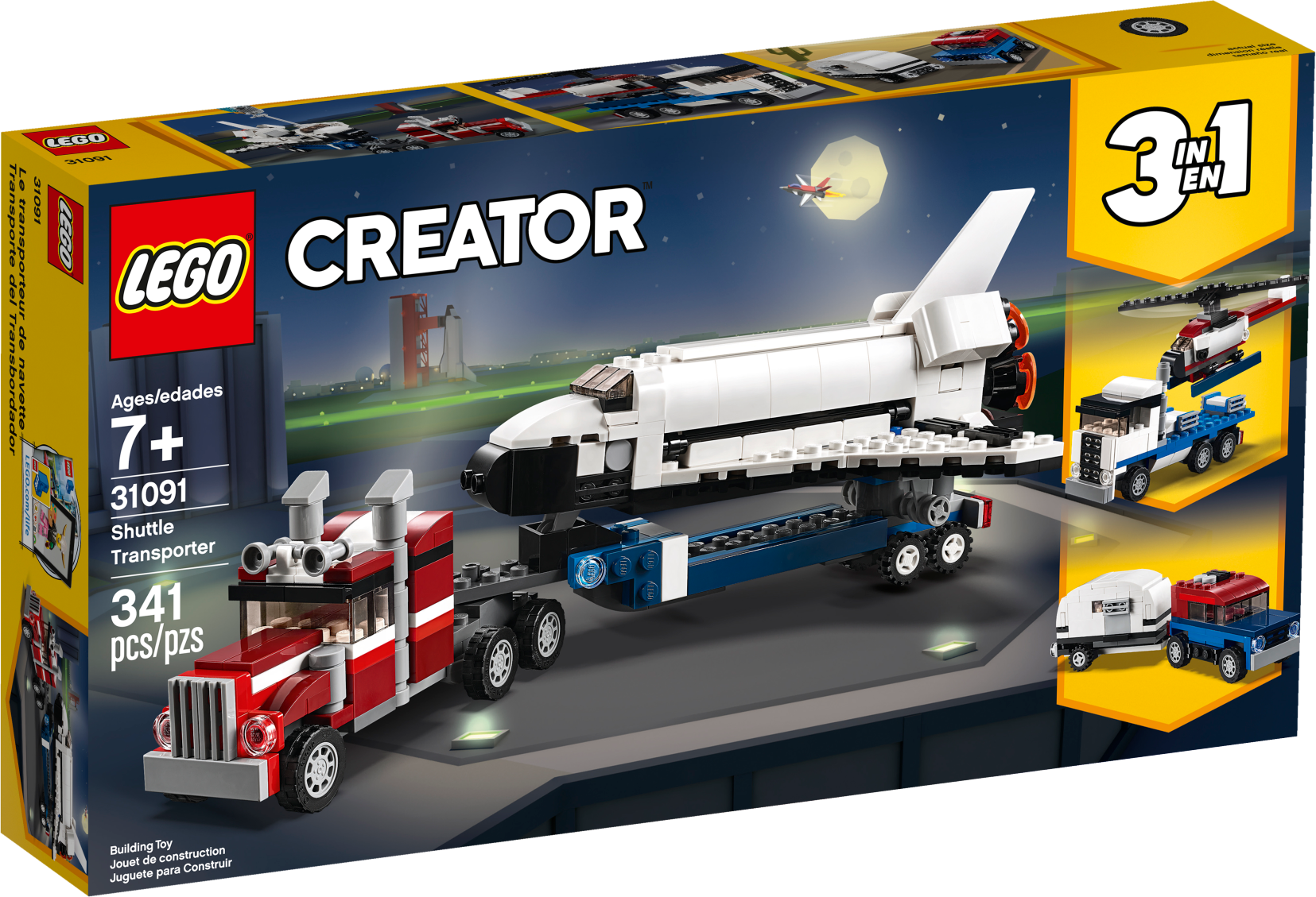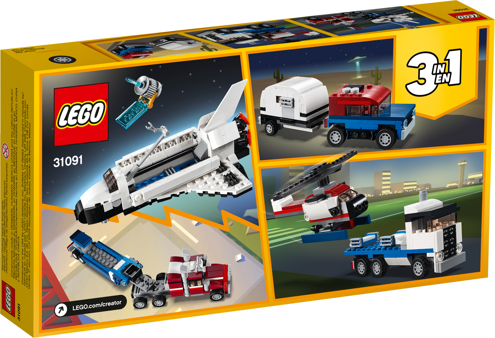 Head for the launch site with the powerful LEGO® Creator 3in1 31091 Shuttle Transporter, featuring a flatbed truck and trailer with vertical exhaust stacks, roof-mounted horns, tinted windshield and 10 sturdy wheels with chunky tires, plus a space shuttle toy with large engines, opening payload bay doors, working crane and a satellite. With LEGO Creator 3in1 sets you get 3 different build and play experiences. Build the Shuttle Transporter and then rebuild it to create a toy Helicopter Transporter or a Car with Caravan model, for even more fun and adventures. Enjoy 3 building opportunities with this LEGO® Creator 3in1 set. Build the Shuttle Transporter and then rebuild to create a cool Helicopter Transporter or a Car with Caravan. The Shuttle Transporter features a flatbed truck and trailer, plus a space shuttle and a satellite. Flatbed Truck and trailer features vertical exhaust stacks, roof-mounted horns, tinted windshield and 10 wheels with rubber tires. Space shuttle features an authentic color scheme, tinted windshield, large engines, opening payload bay doors and a working crane. Load the space shuttle onto the heavy-duty truck and head for the launch site. Blast off into space, open the payload doors and use the crane to put the satellite into orbit, before heading back to earth for a perfect landing! Shuttle Transporter (with shuttle) measures over 3” (10cm) high, 11” (28cm) long and 4” (12cm) wide. Helicopter Transporter measures over 3” (8cm) high, 6” (17cm) long and 1” (3cm) wide. Car with Caravan measures over 1” (4cm) high, 6” (16cm) long and 1” (3cm) wide.