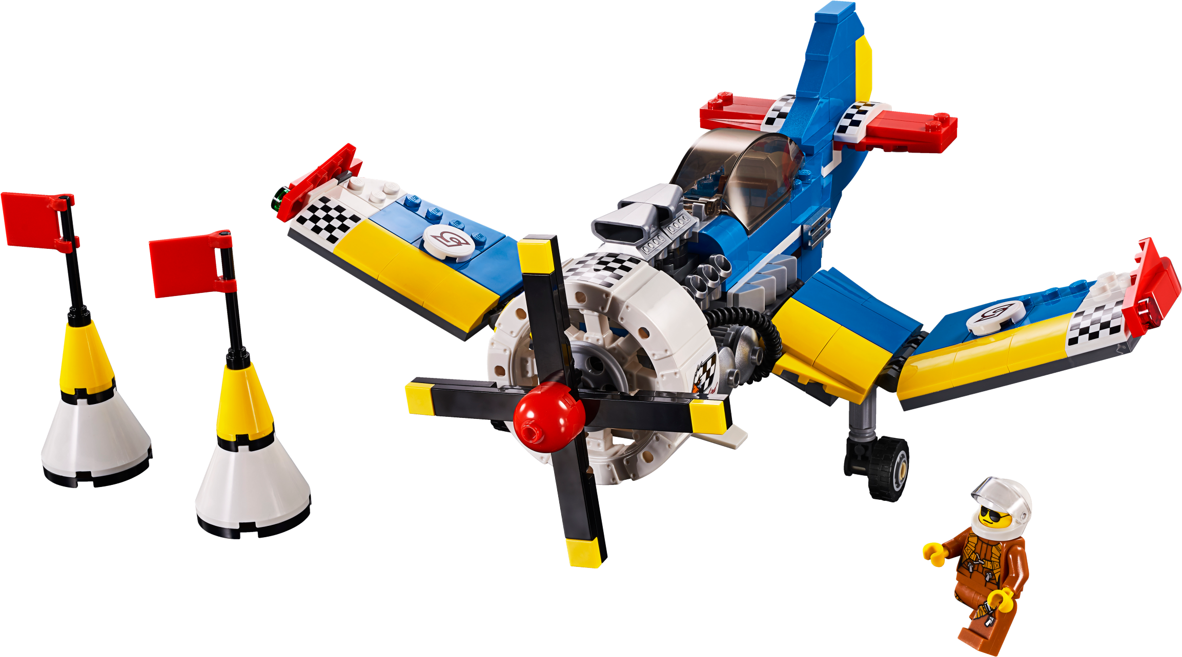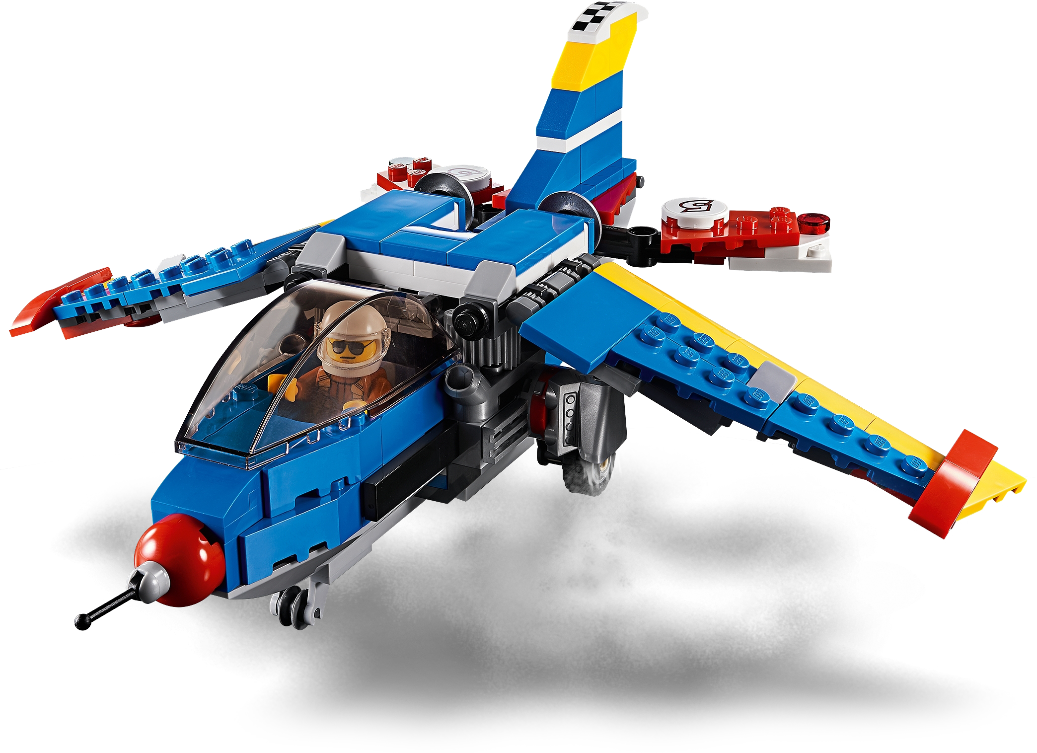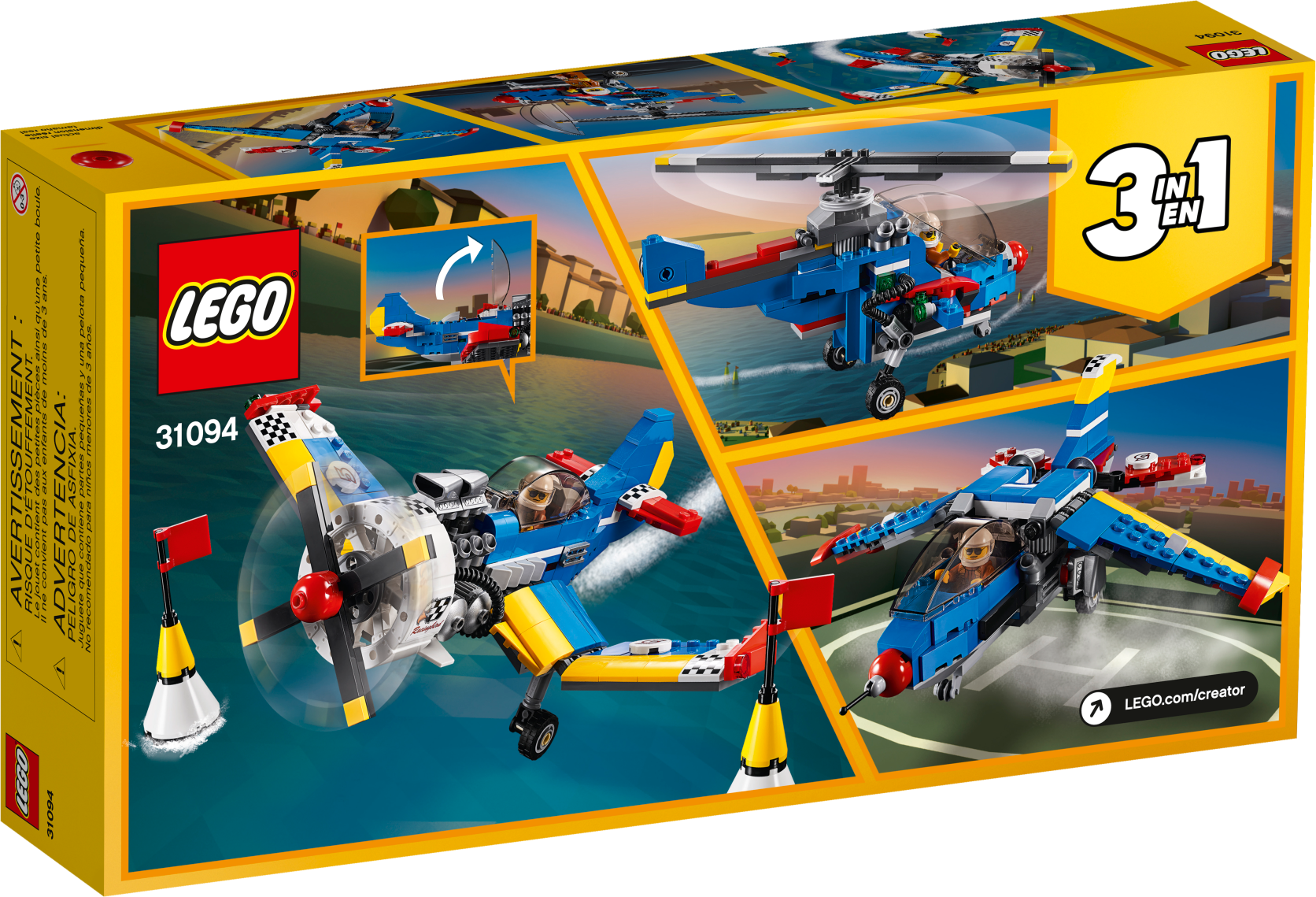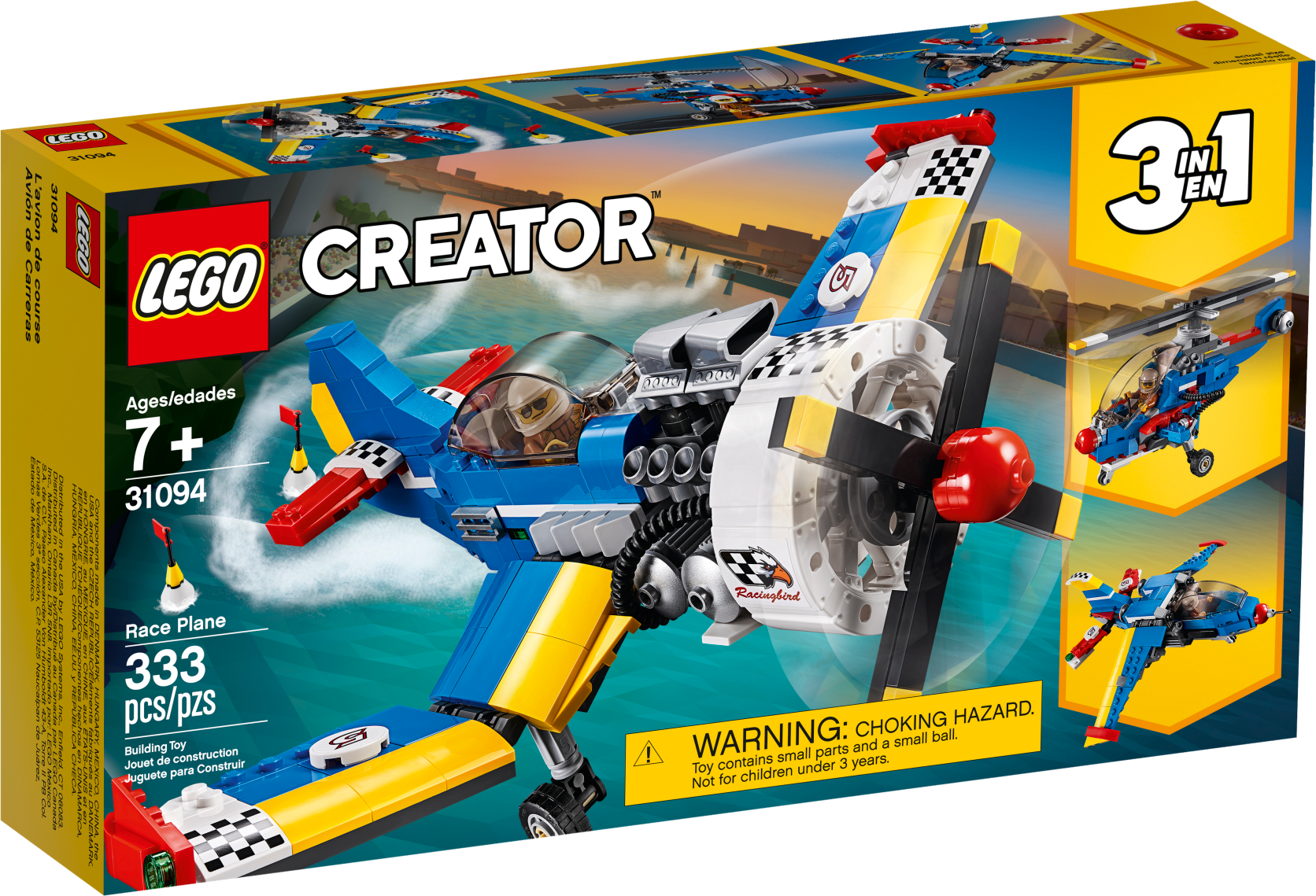 Enjoy vintage flying adventures with the classically designed LEGO® Creator 3in1 31094 Race Plane, featuring a blue, white, yellow and red color scheme with cool racing stickers, visible detailed engine with pipes and cylinders, fixed landing gear, large aircraft propeller, sporty hinged wings and adjustable tail elevators. This impressive toy airplane also features an opening cockpit and comes with a pilot minifigure, complete with a printed flight suit and a helmet. With LEGO Creator 3in1 sets you get 3 different build and play experiences. Build this propeller plane toy and then rebuild it to create a toy helicopter or a toy jet for more aerial action and adventure. Enjoy 3 building opportunities with this LEGO® Creator 3in1 set. Build the Race Plane and then rebuild for more aerial action with a powerful Helicopter or a fast Jet with rotating thrusters. The Race Plane features a visible engine with pipes and cylinders, fixed landing gear, large spinnable aircraft propeller, hinged wings, opening cockpit and adjustable tail elevators, plus 2 race pylons with flags. Check out the Race Plane's awesome blue, white, yellow and red color scheme with cool racing stickers. Includes a pilot minifigure with printed flight suit and a helmet. Open the tinted canopy to access the aircraft cockpit, adjust the tail elevators and spin the propeller. Take to the sky, then swoop and zoom between the race pylons at high speed! Race Plane measures over 3” (10cm) high, 9” (23cm) long and 10” (26cm) wide. Helicopter measures over 4” (11cm) high, 7” (19cm) long and 3” (8cm) wide. Jet measures over 3” (10cm) high, 8” (22cm) long and 9” (24cm) wide.