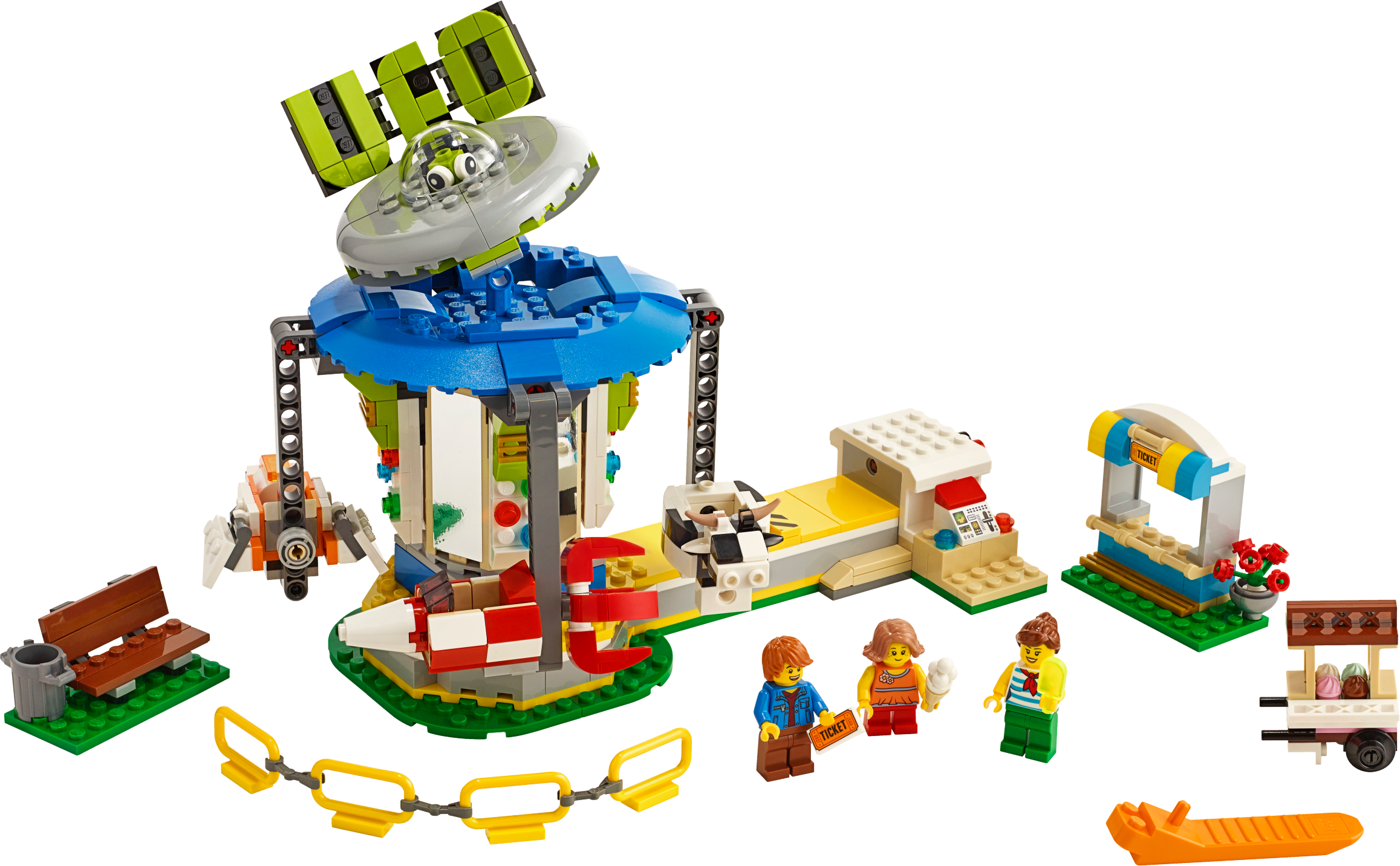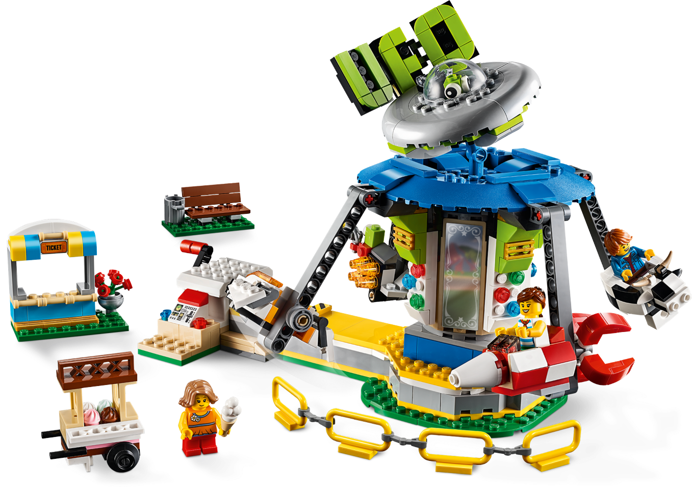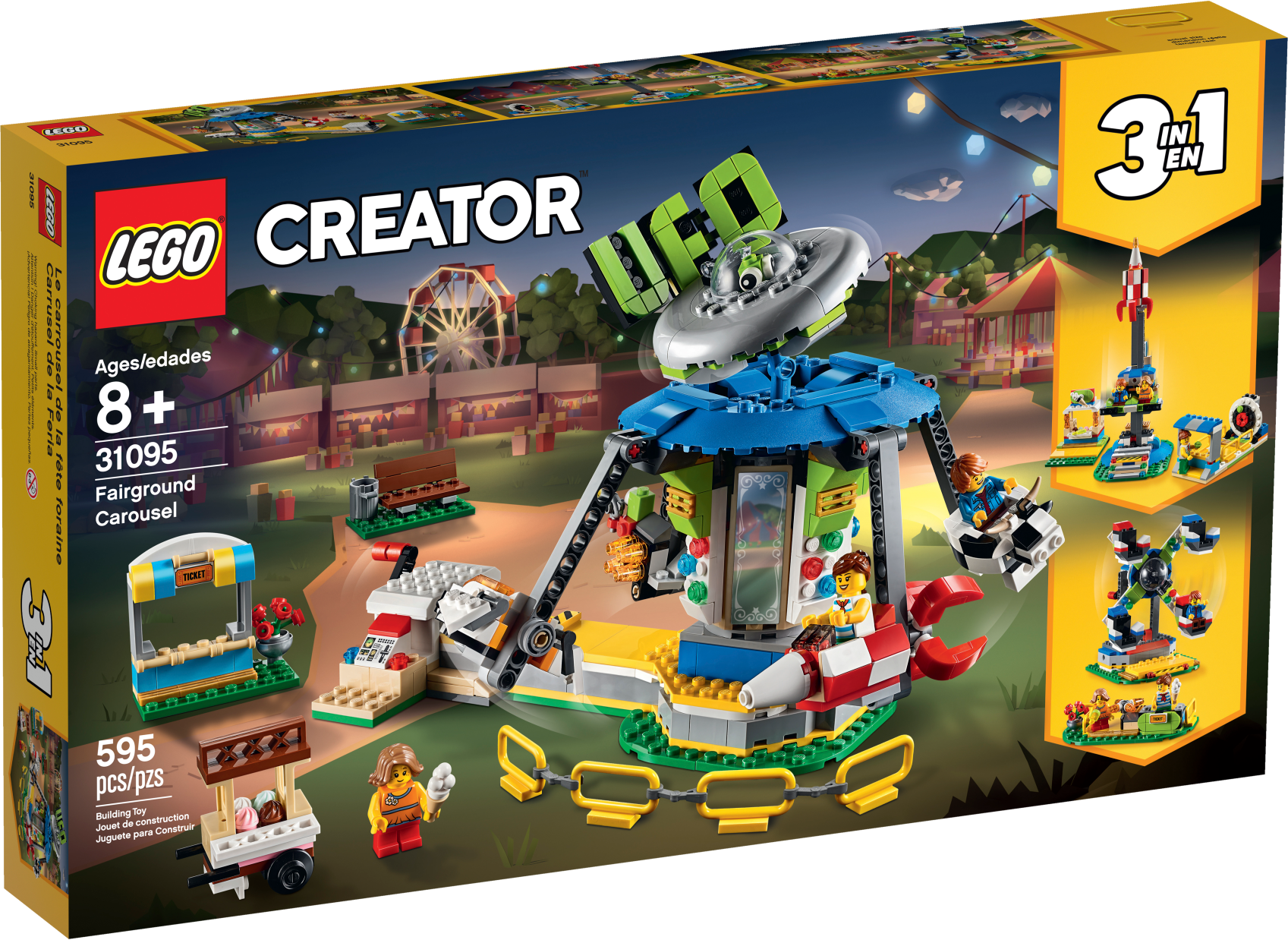 Create a world of magical fairground adventures with this LEGO® Creator 3in1 31095 Fairground Carousel playset, featuring a space-themed carousel model with UFO signage, plus a ticket stall, ice cream cart and park bench. Kids can choose between 4 suspended carriages, including a rocket, space shuttle, alien craft and a funny spotted cow, and then turn the red handle to see them rise into the air as the Carousel spins. With this LEGO Creator 3in1 toy construction set children can build and play with 3 different carnival rides. You can build the Carousel and then rebuild it into a Free Fall Ride or LEGO Ferris Wheel toy. Includes 3 minifigures, all ready for fun at the fair. Enjoy 3 building opportunities with this LEGO® Creator 3in1 playset. Build the Carousel and then rebuild it for more fairground fun aboard the Free Fall Ride or wonderful Ferris Wheel. The Fairground Carousel LEGO® set features a space-themed merry-go-round with UFO signage and 4 suspended carriages: a rocket, space shuttle, alien craft and spotted cow. This construction toy also includes a brick-built ticket stall, park bench and an ice cream cart with buildable ice creams. Turn the red handle and see the carriages rise into the air as the Carousel spins! Includes 3 minifigures: 1 boy and 2 girls, all ready for the fun of the fair. Check out the cool UFO sign complete with flying saucer and alien pilot. Fairground Carousel measures over 7” (20cm) high, 11” (29cm) wide and 7” (18cm) deep. Free Fall Ride measures over 10” (26cm) high, 4” (12cm) wide and 3” (9cm) deep. Ferris Wheel measures over 6” (16cm) high, 5” (14cm) wide and 4” (12cm) deep.