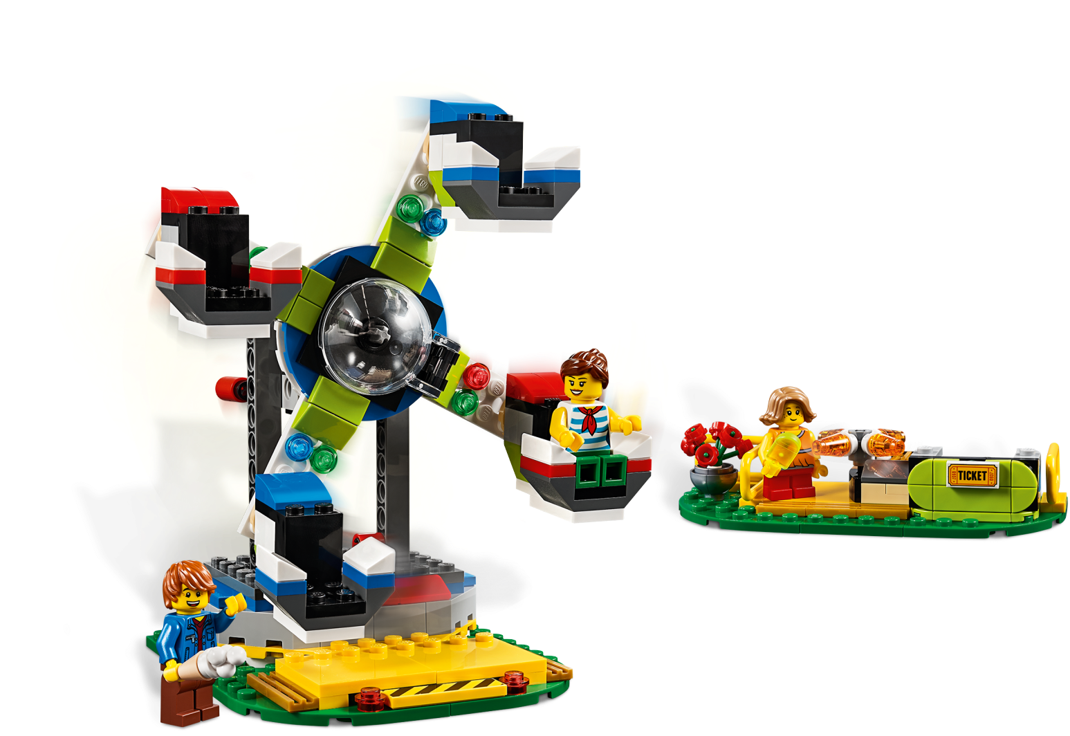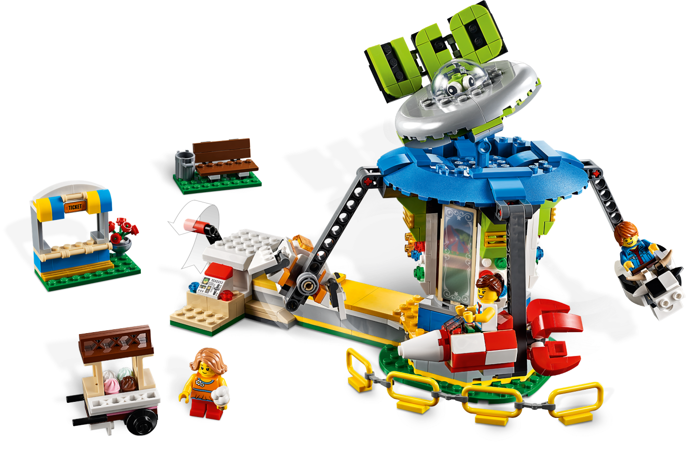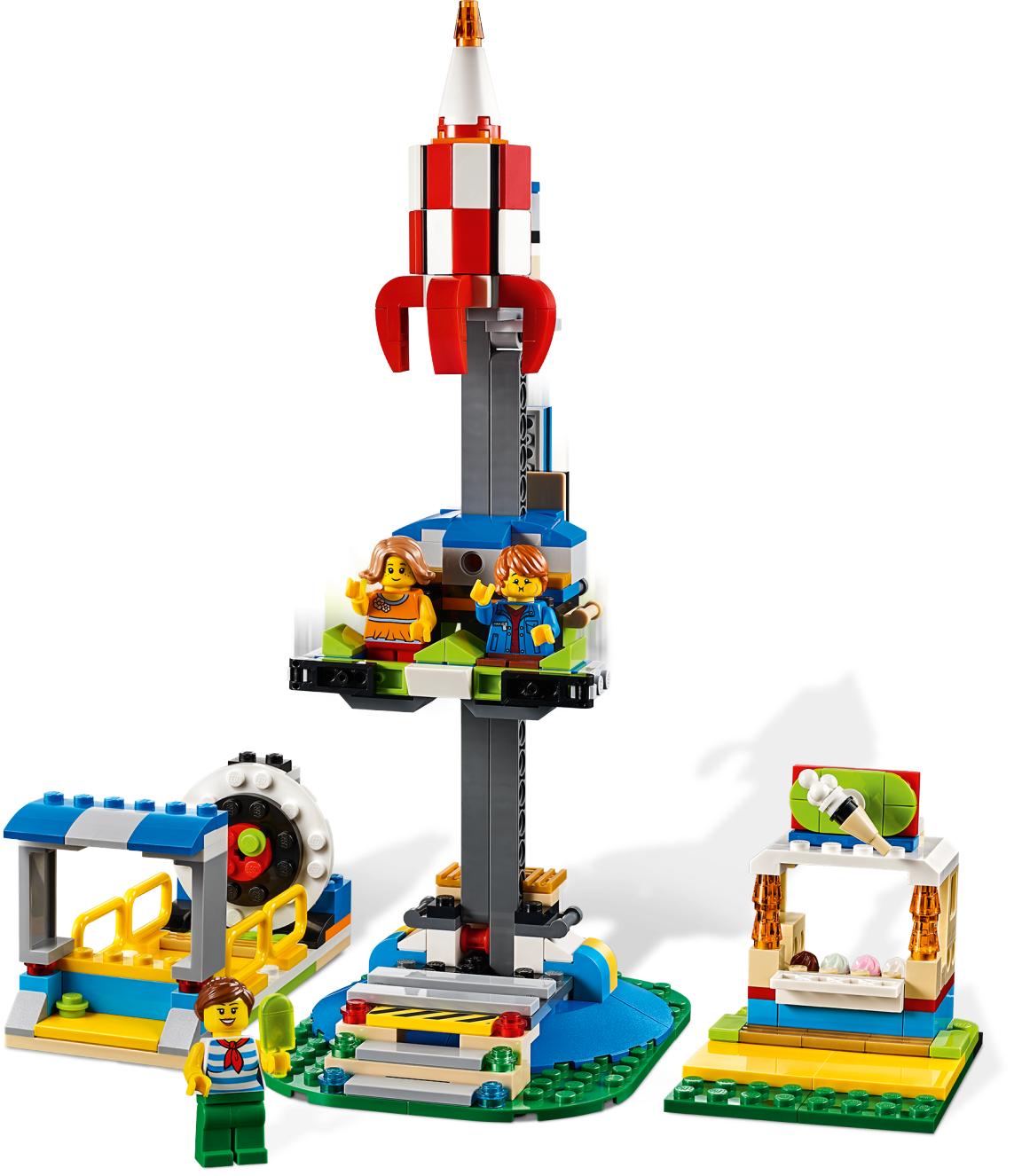 Create a world of magical fairground adventures with this LEGO® Creator 3in1 31095 Fairground Carousel playset, featuring a space-themed carousel model with UFO signage, plus a ticket stall, ice cream cart and park bench. Kids can choose between 4 suspended carriages, including a rocket, space shuttle, alien craft and a funny spotted cow, and then turn the red handle to see them rise into the air as the Carousel spins. With this LEGO Creator 3in1 toy construction set children can build and play with 3 different carnival rides. You can build the Carousel and then rebuild it into a Free Fall Ride or LEGO Ferris Wheel toy. Includes 3 minifigures, all ready for fun at the fair. Enjoy 3 building opportunities with this LEGO® Creator 3in1 playset. Build the Carousel and then rebuild it for more fairground fun aboard the Free Fall Ride or wonderful Ferris Wheel. The Fairground Carousel LEGO® set features a space-themed merry-go-round with UFO signage and 4 suspended carriages: a rocket, space shuttle, alien craft and spotted cow. This construction toy also includes a brick-built ticket stall, park bench and an ice cream cart with buildable ice creams. Turn the red handle and see the carriages rise into the air as the Carousel spins! Includes 3 minifigures: 1 boy and 2 girls, all ready for the fun of the fair. Check out the cool UFO sign complete with flying saucer and alien pilot. Fairground Carousel measures over 7” (20cm) high, 11” (29cm) wide and 7” (18cm) deep. Free Fall Ride measures over 10” (26cm) high, 4” (12cm) wide and 3” (9cm) deep. Ferris Wheel measures over 6” (16cm) high, 5” (14cm) wide and 4” (12cm) deep.