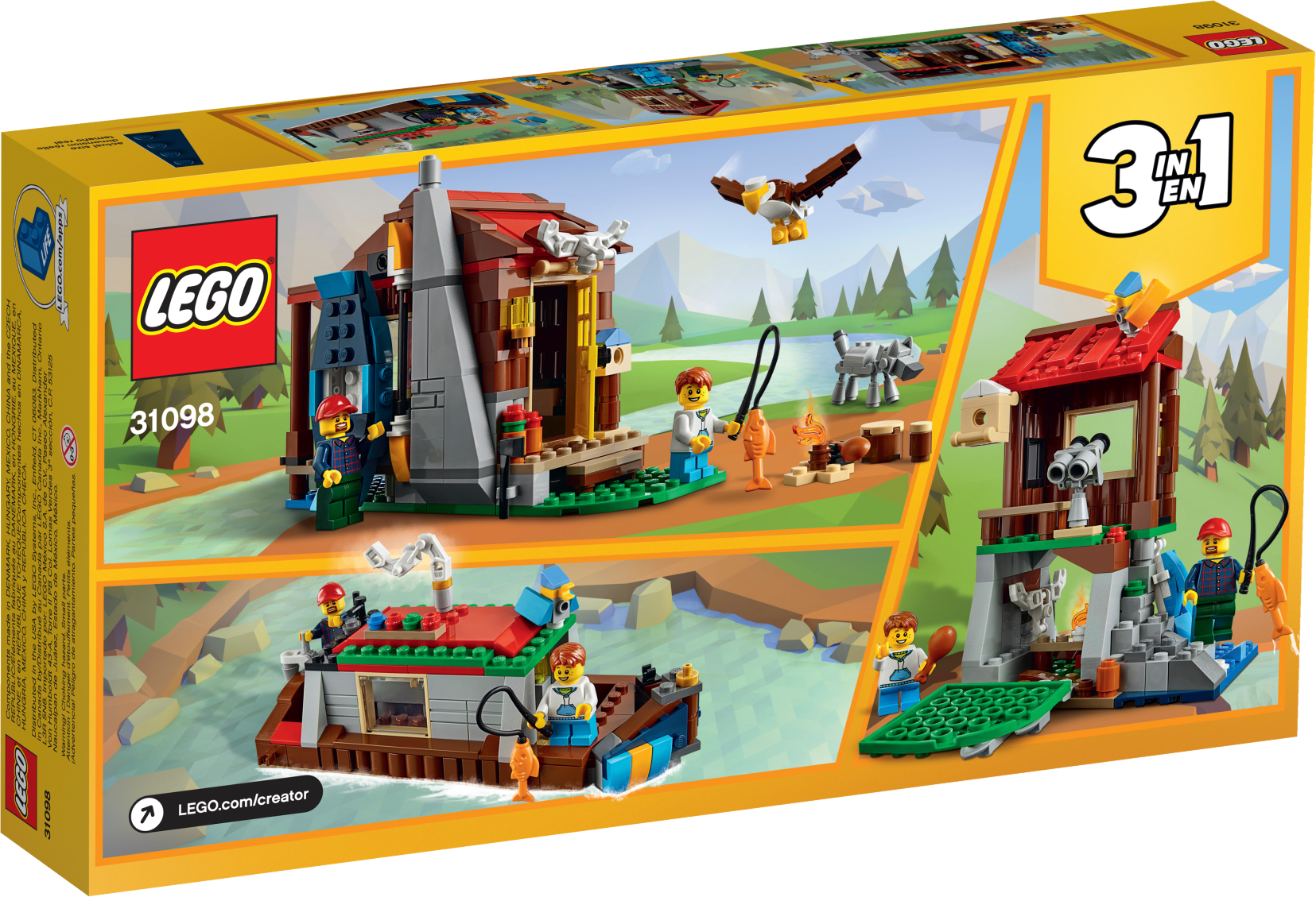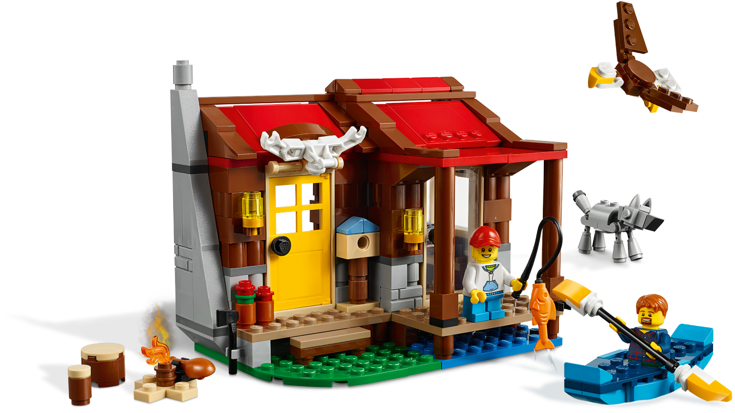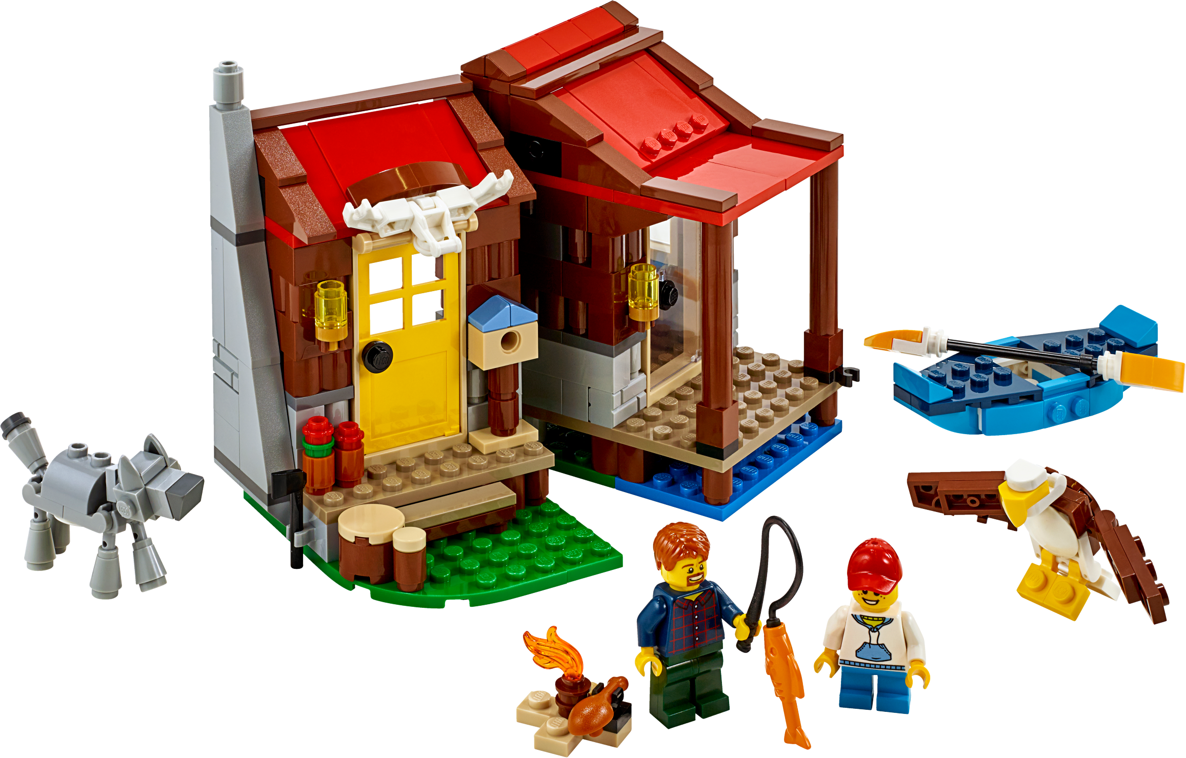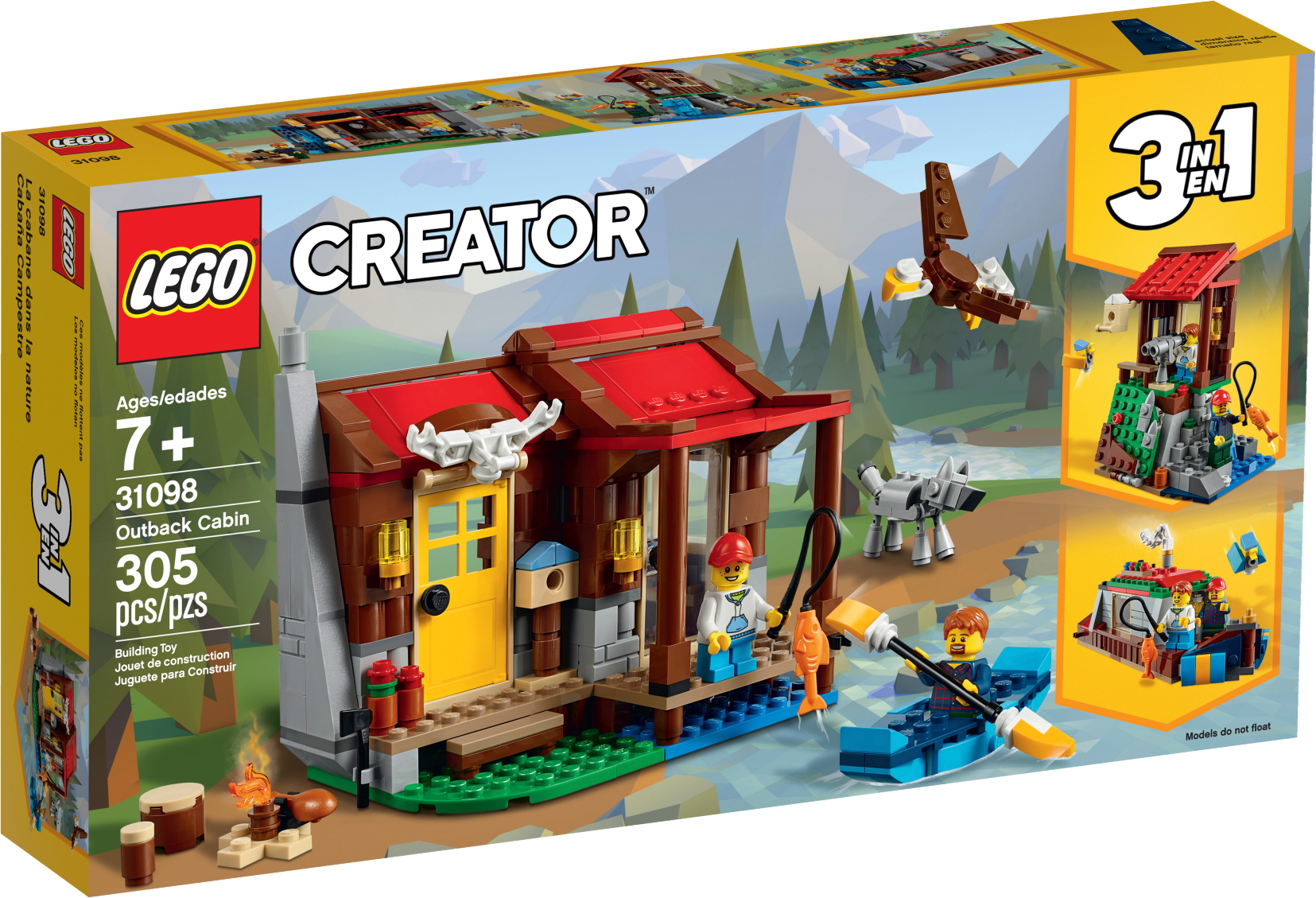 Head for the wild yonder with the LEGO® Creator 3in1 31098 Outback Cabin playset. Kids can play out their own outback adventures with this fun model, featuring a log cabin with a waterside terrace, kayak and campfire, plus brick-built eagle and wolf animal figurines. Fold out the cabin to access the interior, complete with wall clock, radio and a cozy attic bedroom. With 3in1 LEGO Creator sets children get 3 different build and play experiences. Build the Outback Cabin and then rebuild it into Bird Watching Viewpoint with a secret hideout or a Canal Boat with a well-equipped galley. Includes 2 minifigures, ready for adventure. Enjoy 3 building opportunities with this 3in1 LEGO® Creator set. Build the Outback Cabin and then rebuild to create a Bird Watching Viewpoint with a secret hideout or a Canal Boat with a well-equipped galley. The Outback Cabin features a toy cabin with a waterside terrace, plus a kayak and campfire. Cabin interior features a wall clock, radio and a cozy attic bedroom. Includes 2 minifigures, ready for outback adventures, plus brick-built eagle and wolf animal figurines. Try a spot of fishing from the log cabin’s waterside terrace, ride the kayak and roast chicken on the campfire, but watch out for the hungry wolf and eagle! Continue the outdoor LEGO® adventures with this 3in1 set. Rebuild the Outback Cabin to create a Bird Watching Viewpoint or a Canal Boat. Outback Cabin measures over 4” (11cm) high, 5” (14cm) wide and 3” (8cm) deep. Bird Watching Viewpoint measures over 8” (13cm) high, 3” (9cm) wide and 3” (8cm) deep. Canal Boat measures over 3” (9cm) high, 7” (18cm) long and 3” (8cm) wide.
