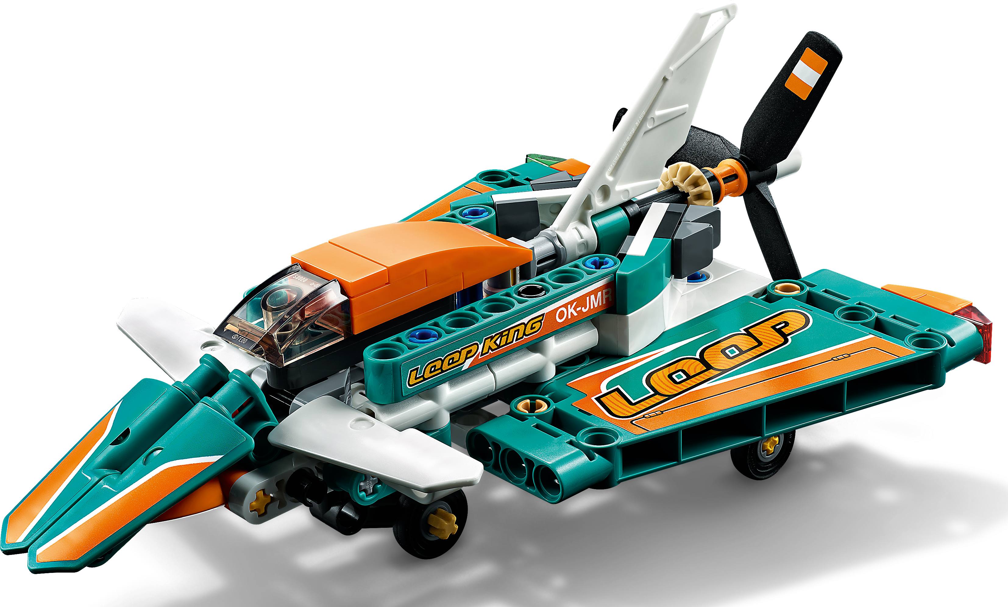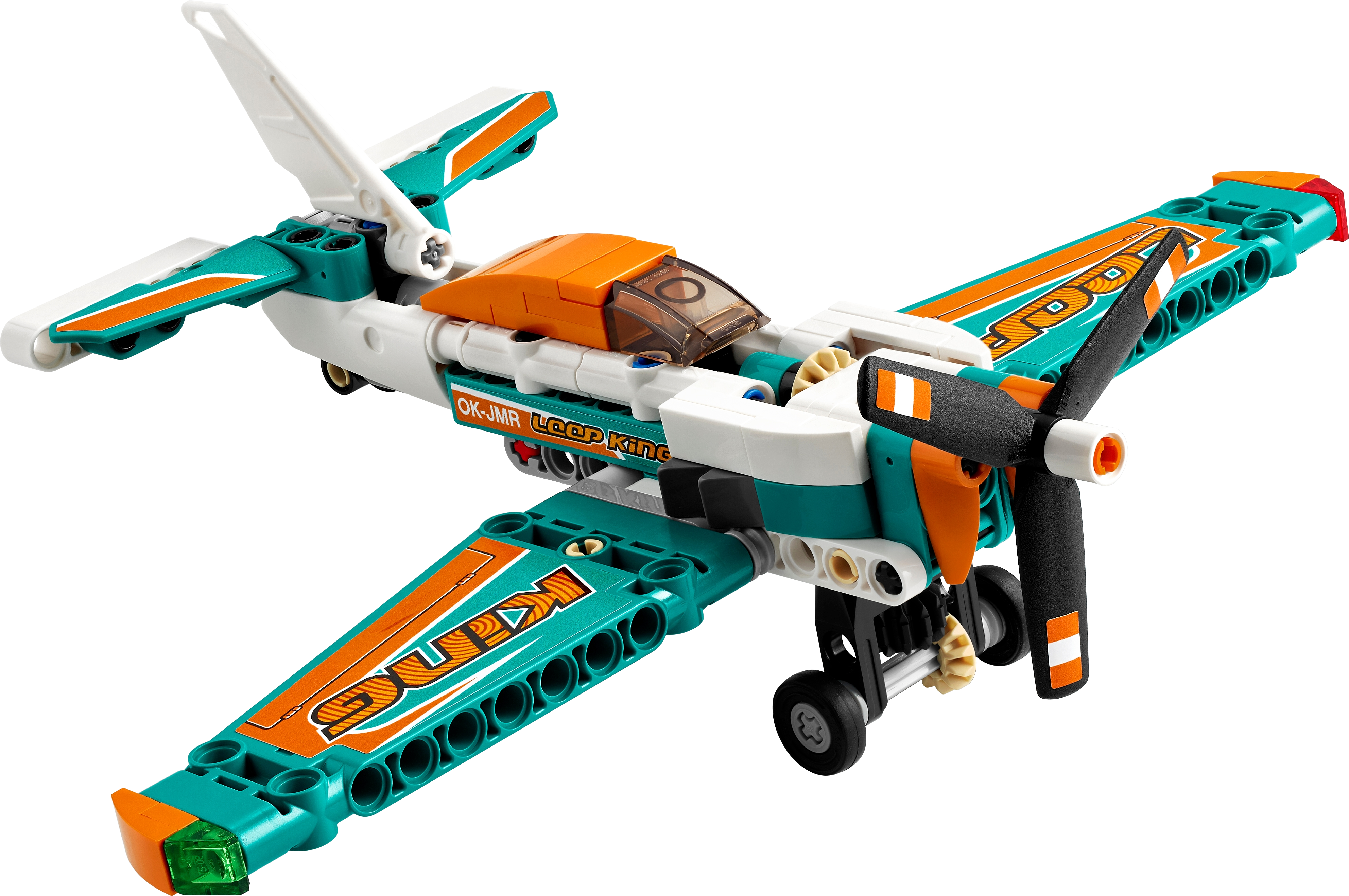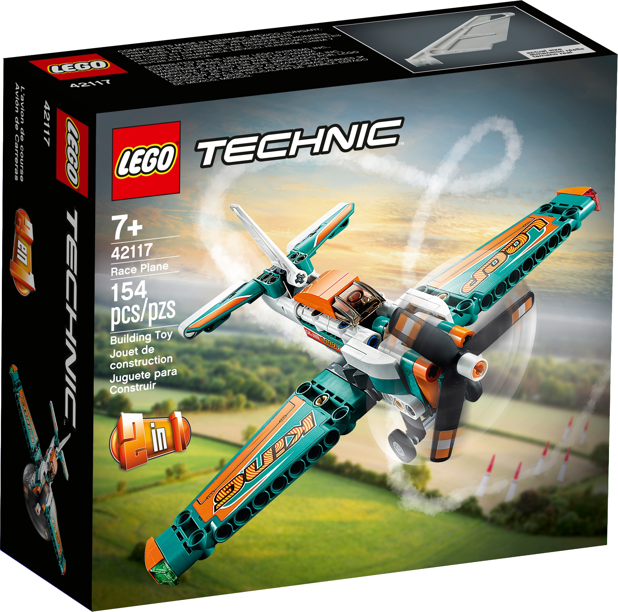 Bring the thrilling world of stunt planes to life with this LEGO® Technic™ Race Plane (42117). This treat for boys and girls aged 7 and up includes details like a propeller that spins when the plane is pushed along, plus opening engine covers. The eye-catching, teal and orange color scheme with sponsor details completes a cool little gift for any occasion – it's just like a real race plane!2-in-1 modelThis toy airplane rebuilds into a Jet Airplane so kids can enjoy even more building fun.It's easy to get started since this set comes with Instructions PLUS. Available in the free LEGO Building Instructions app, this interactive guide includes zoom and rotate tools, plus ghost mode, to help children build independently.Hours of creative playThe LEGO Technic universe offers advanced building toys for young LEGO fans who are ready for their next challenge. With vehicles that look and function like the real thing, these sets offer a great introduction to engineering and mechanics.Give aspiring pilots a treat with this LEGO® Technic™ Race Plane (42117) toy. With vibrant colors, sponsor details and a spinning propeller, it looks just like the real thing.There are lots of details to discover for kids who love flying toys. Check out the opening engine covers, landing gear and spinning propeller for plane racing role play.Kids will love building this durable aerobatic aircraft toy before rebuilding it into a Jet Airplane for even more creative fun.Makes a great holiday or birthday gift or an anytime treat for kids aged 7 and up who love stunt plane toys.The Race Plane model measures over 3 in. (9 cm) high (including propeller), 7 in. (18 cm) long and 9 in. (23 cm) wide.Instructions PLUS is an interactive guide that makes building extra fun. Available in the free LEGO® Building Instructions app, it has zoom and rotate tools to help children build independently.The LEGO® Technic™ universe offers advanced building toys for young LEGO fans who are ready for their next building challenge.LEGO® Technic™ components meet stringent industry standards to ensure they are consistent, compatible and connect securely every time – it’s been that way since 1958.LEGO® Technic™ components are dropped, heated, crushed, twisted and analyzed to make sure they meet stringent global safety standards.