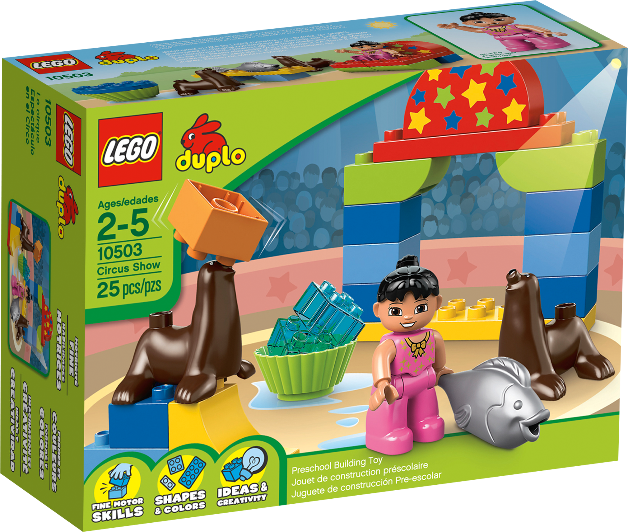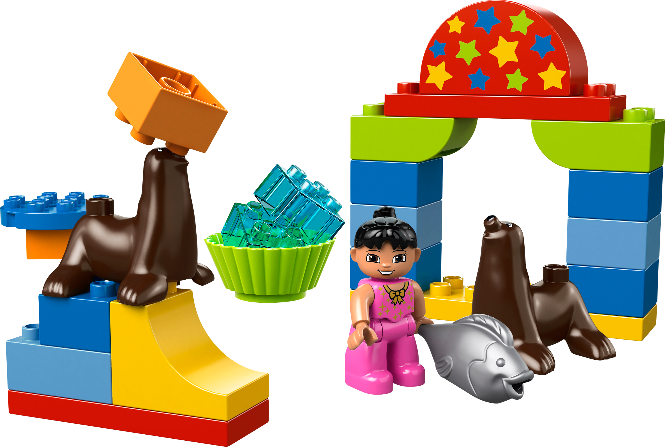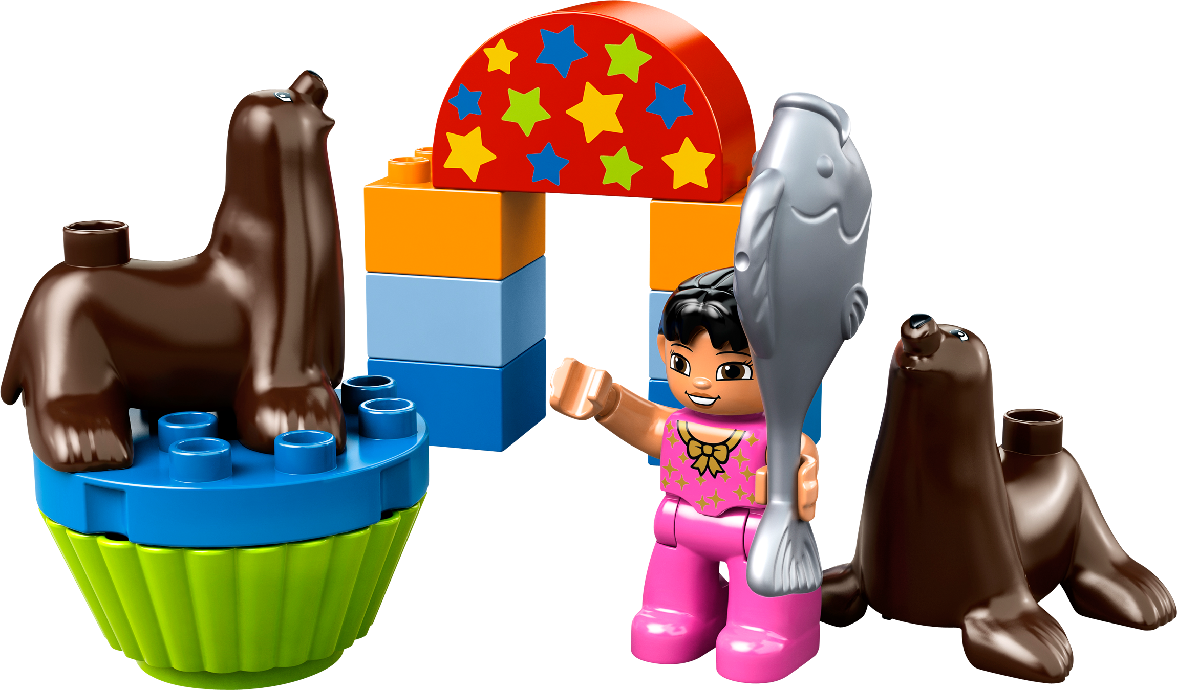 Train the sea lions to perform at the amazing Circus Show! The circus girl is training her sea lions for the big Circus Show! Help her to command their big performance on the podium! When they can balance bricks on the tips of their noses, toss them a tasty fish as a reward. Includes circus girl LEGO® DUPLO® figure.Includes circus girl LEGO® DUPLO® figureFeatures 2 sea lionsIncludes a fish, tub and rounded elementsStar-decorated, transparent and other assorted bricks also includedFamiliar circus theme encourages hours of creative role playDUPLO products are fun and safe for younger handsCombine with 10504 Big Circus and 10550 Circus Transport for even more circus-themed creative play!