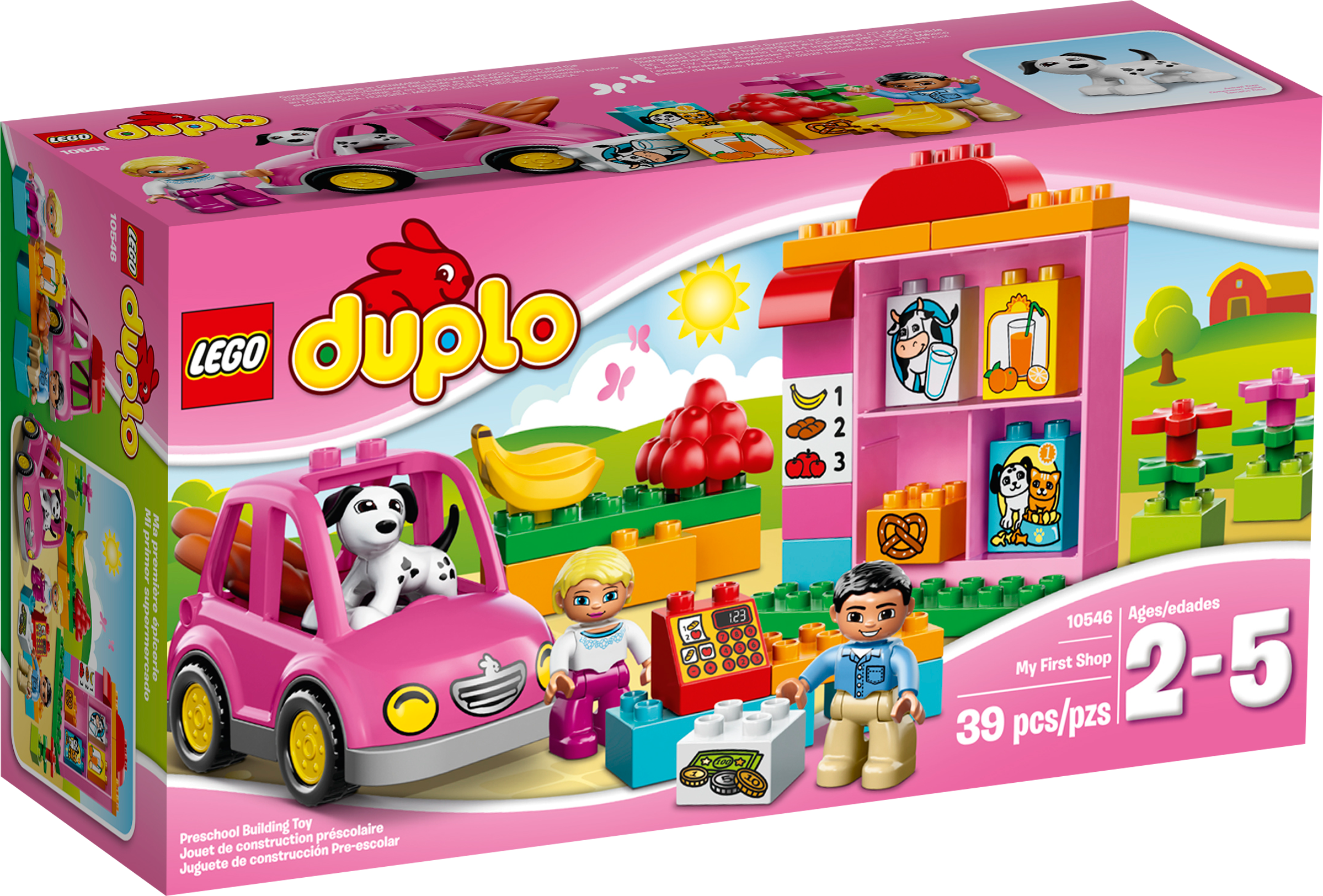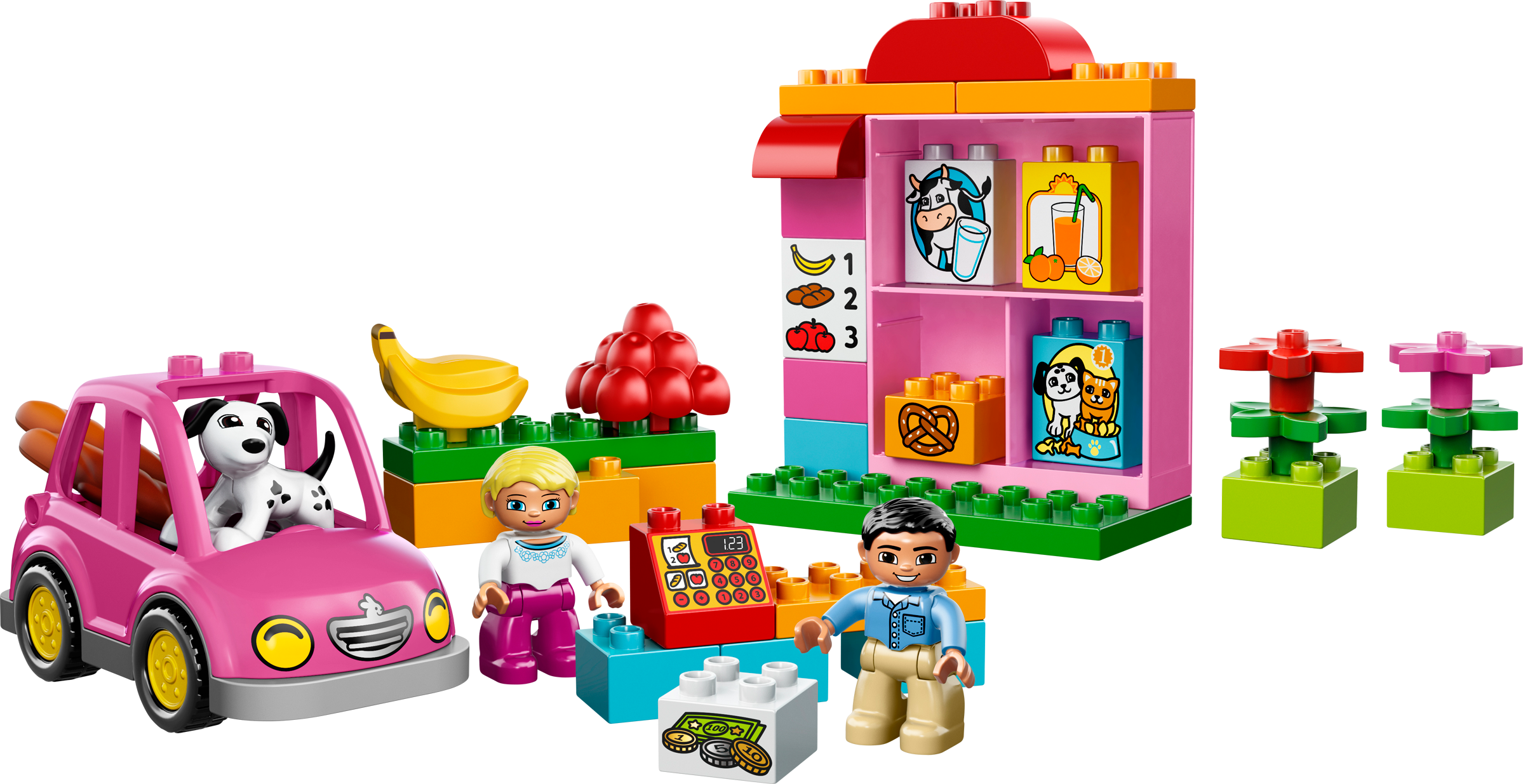 Drive to the shop and buy lots of groceries! The customer is busy buying groceries at the fully stocked shop. The friendly shopkeeper has everything she needs, from yummy fruit, vegetables and bread, to milk, flowers and food for her pet dog. After paying at the checkout counter, it’s time to load up the car and drive home again. Includes 2 LEGO® DUPLO® figures: a shopkeeper and a customer.Includes 2 LEGO® DUPLO® figures: a shopkeeper and a customerFeatures a checkout counter, area for vegetables and flowers, shelf and a buildable LEGO® DUPLO® carAlso includes a dogAccessories include vegetables, bread and a selection of decorated bricks featuring juice, money, pet food, milk, pretzels and vegetablesGreet the friendly shopkeeperStock up with groceries and take them home in the pink carGirls will love the bright pink car and shop elementsEncourage role play with the shopkeeper, customer and all the productsDUPLO products are fun and safe for younger handsMakes an ideal addition to any DUPLO town collectionCar measures over 3” (9cm) high, 5” (15cm) long and 3” (8cm) wideShop shelf measures over 6” (16cm) high, 5” (13cm) wide and 2” (6cm) deep