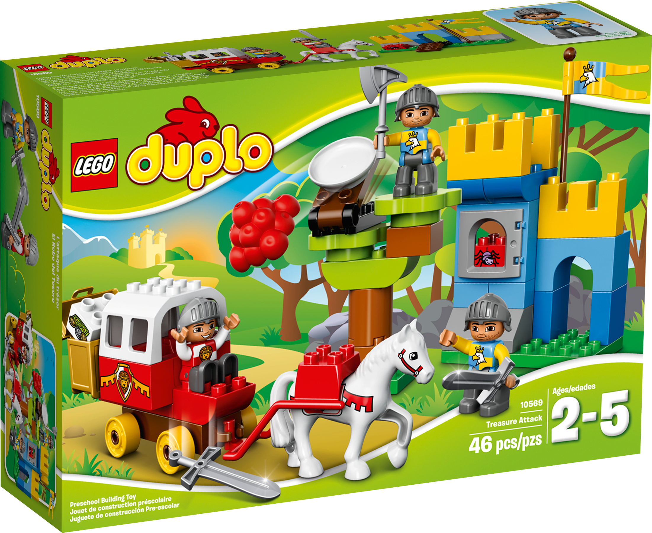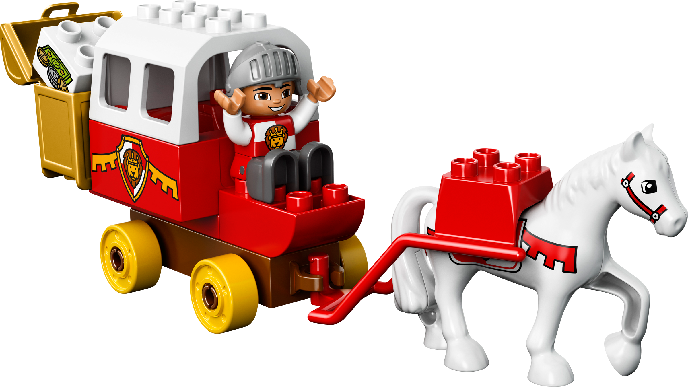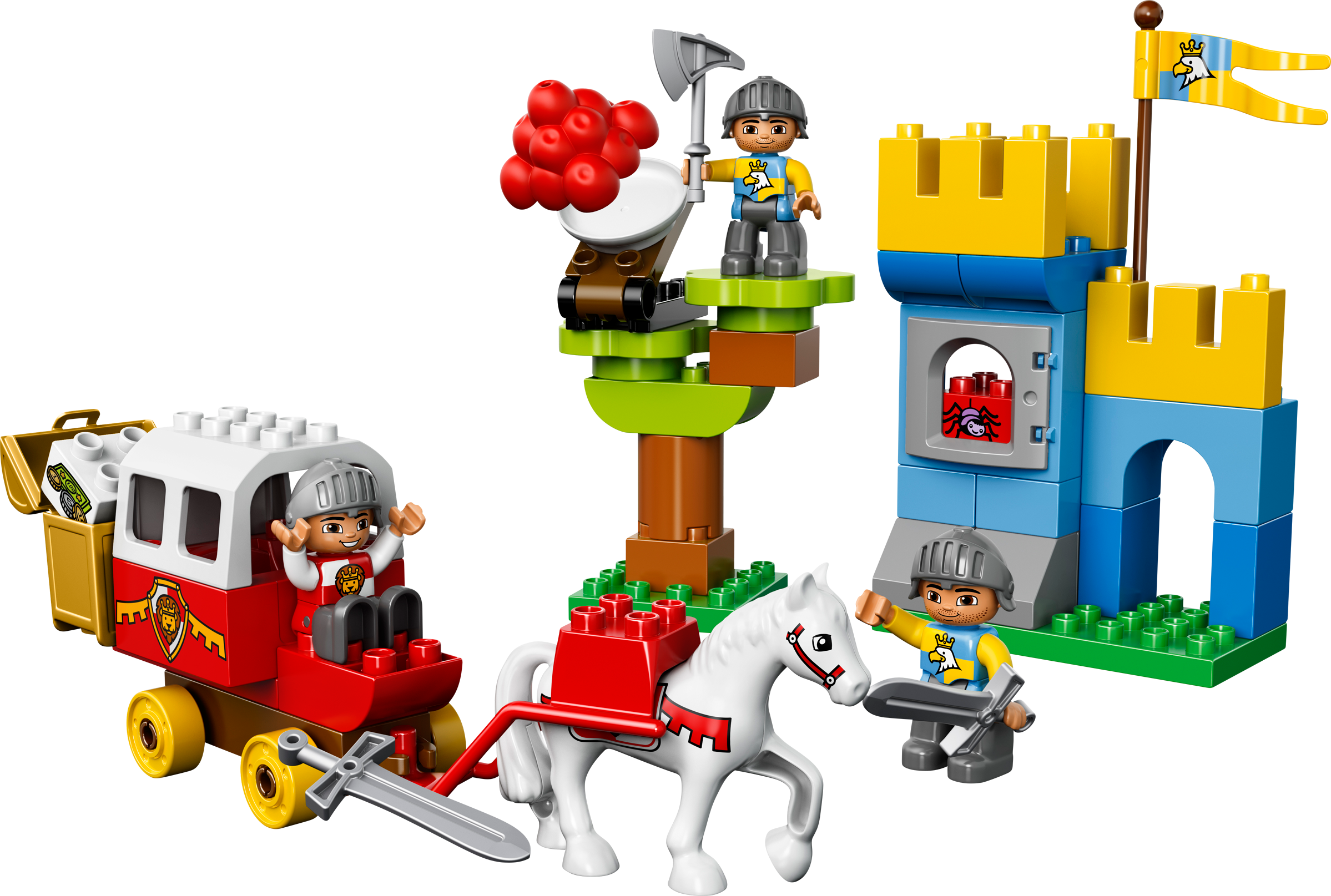 Launch an attack from the castle to steal the traveling knight’s treasure! Hide in the tree and launch apples from the catapult to seize the treasure from the traveling knight and his horse-drawn carriage! Then rush back to the castle tower to keep it safe and look out for intruders. Introduce young children to history and role-playing with this exciting, knight-themed set. They will love creating endless medieval stories and will master basic construction skills as they build and rebuild this model. Includes 3 knight LEGO® DUPLO® figures.Includes 3 knight LEGO® DUPLO® figuresFeatures a horse-drawn carriage, castle tower and an apple treeCastle tower features an opening windowAccessories include a catapult, flag, 2 swords, axe, apples and a treasure elementDecorated bricks with a spider and coins act as excellent story startersHide out in the apple tree and wait for the traveling knight to approachLaunch the apples from the catapult and steal the treasureClimb the castle tower to look out for intrudersHelp your child create imaginative play with a historical themeLEGO® DUPLO® products are specially designed to be fun and safe for younger handsHorse with carriage measures over 4" (11cm) high, 10" (27cm) long and 2" (6cm) wideCastle tower measures over 6" (17cm) high, 4" (12cm) wide and 2" (6cm) deepApple tree measures over 7" (19cm) high, 3" (10cm) wide and 3" (9cm) deepMakes an ideal addition to any LEGO® DUPLO® town collection