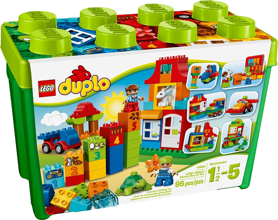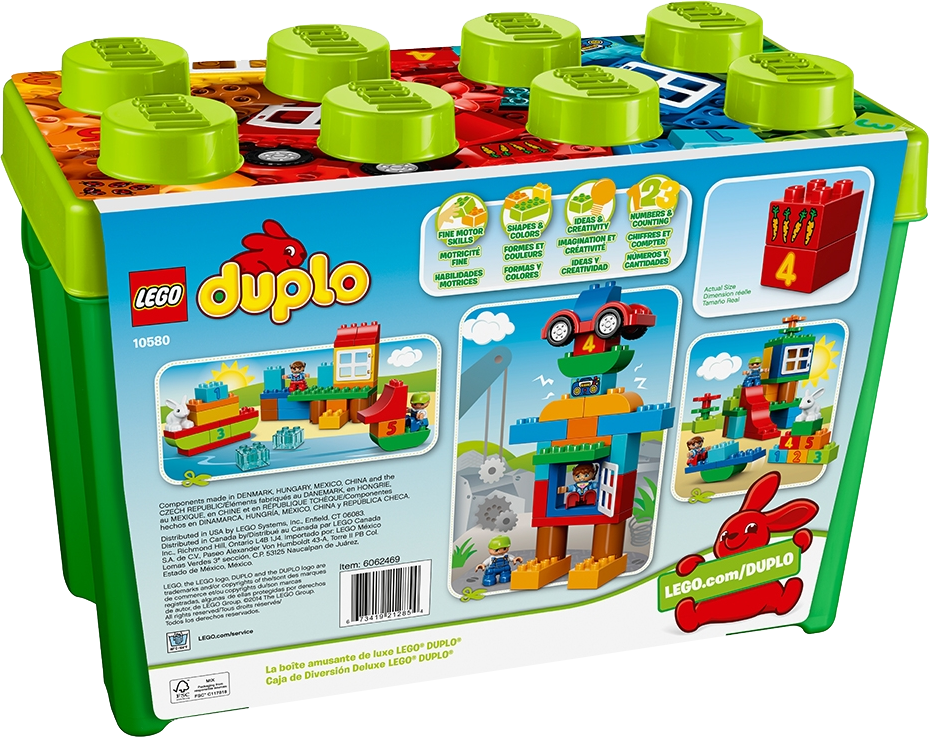 Learn and play all day with the LEGO® DUPLO® Deluxe Box of Fun! Give your child hours of entertainment with the LEGO® DUPLO® Deluxe Box of Fun. This set makes the perfect introduction to LEGO building fun, with a huge range of classic and special DUPLO bricks. From teaching counting with the decorated number blocks to inspiring role play with the DUPLO figures, this box will open up a world of learning and creativity for your young builder. It also includes a wagon base, window and door elements in bright, primary colors that toddlers will love to play with. The whole set comes in a sturdy, iconic LEGO brick-shaped storage box with building inspiration to help you and your child build an exciting tall house and other fun buildings. Includes 2 child DUPLO figures.Includes 2 child LEGO® DUPLO® figuresFeatures a turtle, rabbit, wagon base, 2 window elements, a door element, numbered bricks and a wide selection of classic LEGO® DUPLO® bricksMatch the numbered bricks with the corresponding decorated bricksStore the bricks in the iconic LEGO® brick-shaped storage boxLEGO® DUPLO® products are fun and safe for younger handsTall house measures over 8” (22cm) high, 7” (19cm) wide and 2” (6cm) deepRabbit stands over 1” (4cm) tallTurtle stands over 1” (3cm)Child figures stand over 1” (5cm) tallWagon base measures over 1” (3cm) high, 2” (6cm) wide and 4” (12cm) long