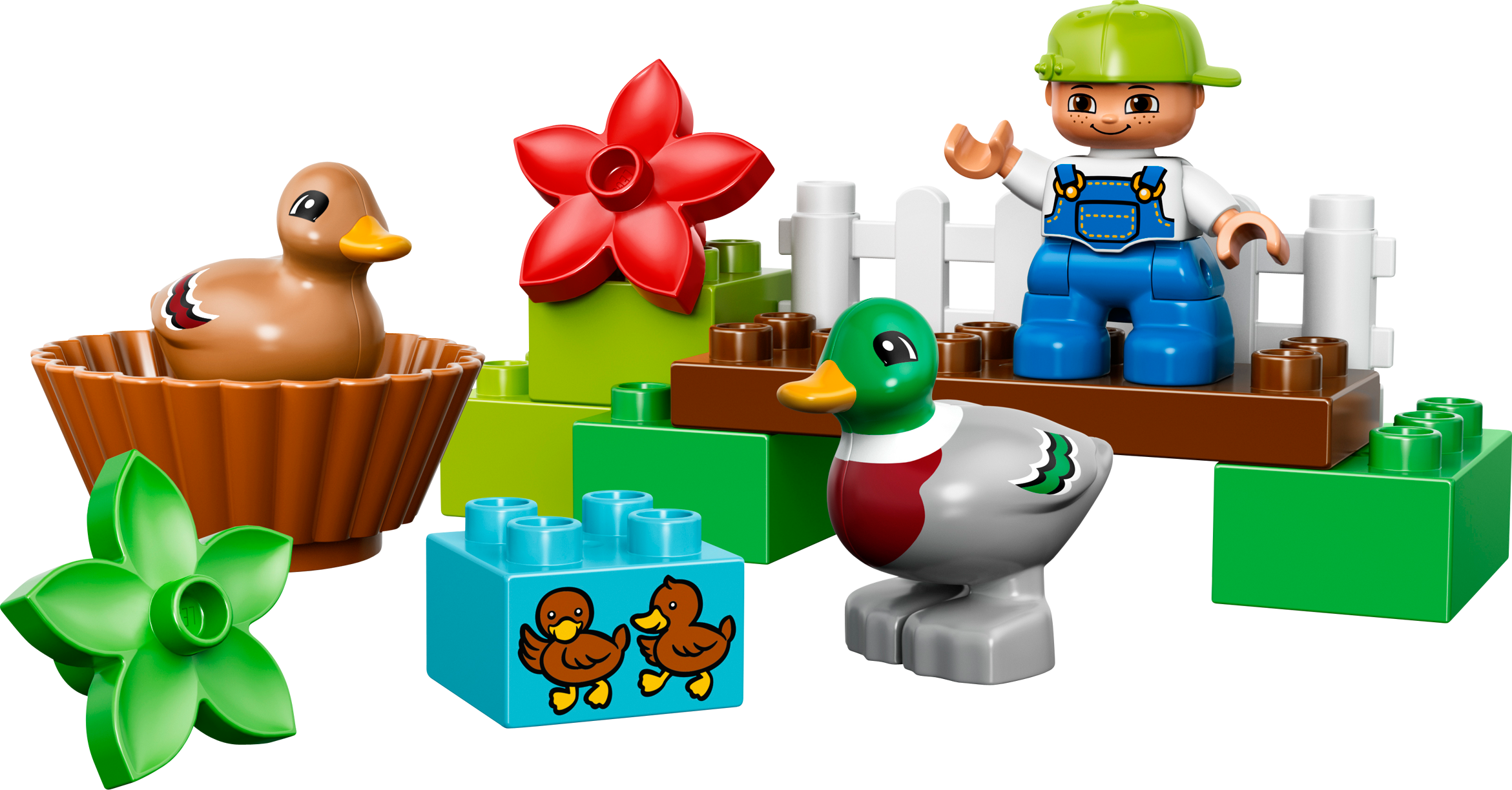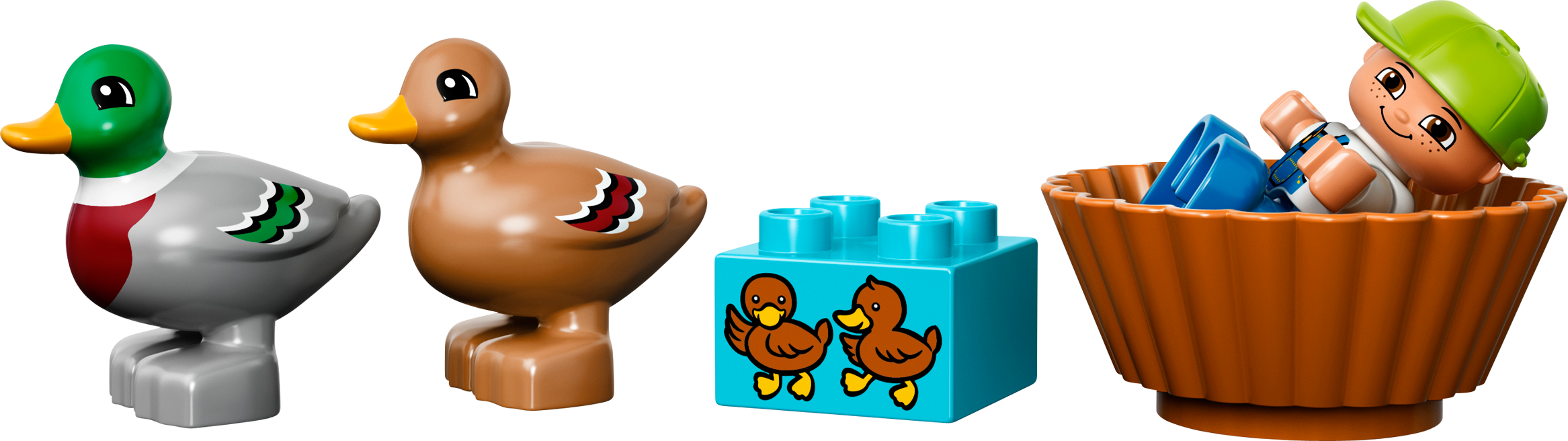 Includes a child LEGO® DUPLO® figure plus a male and a female duck