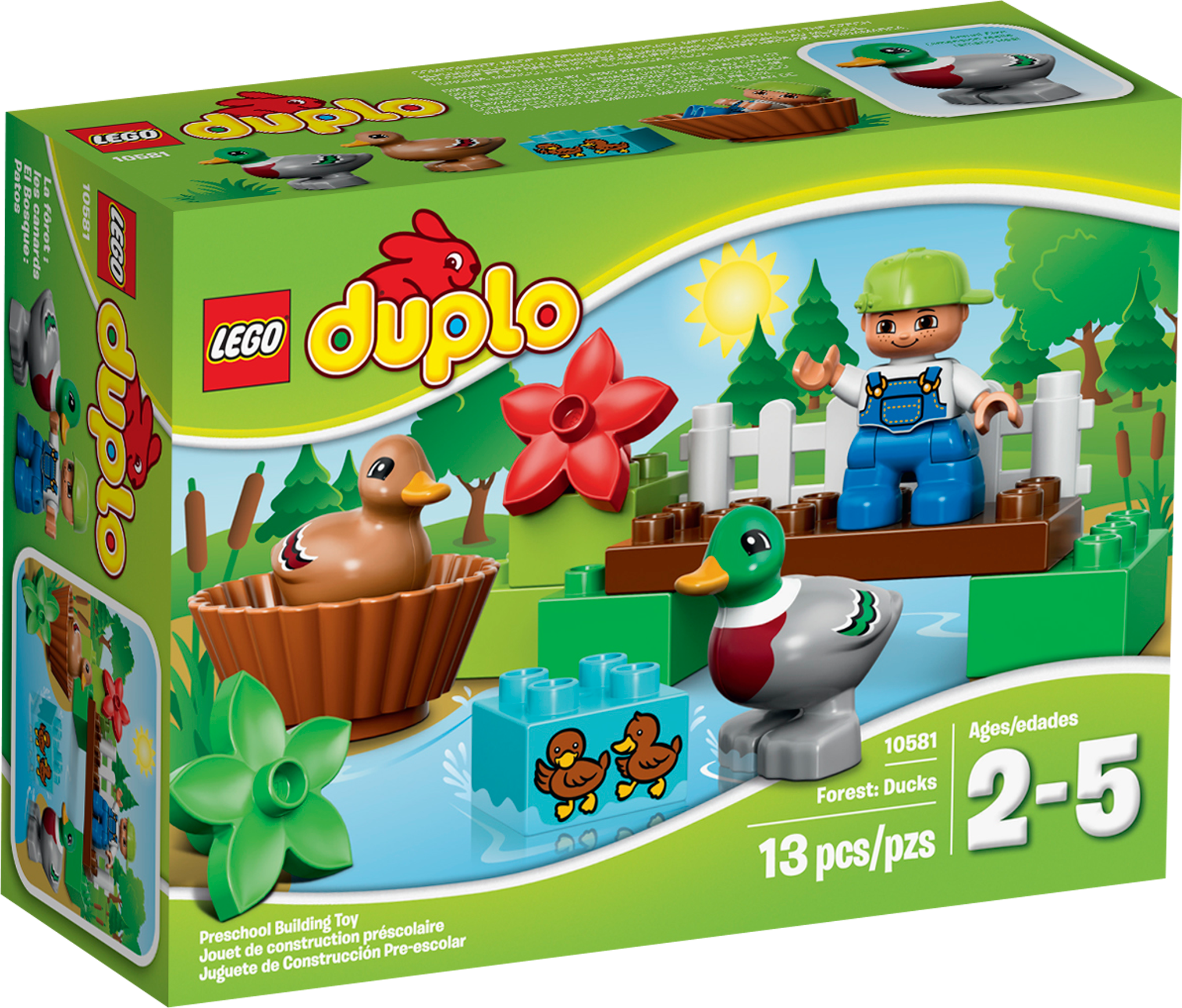 Take a walk through the forest to see the ducks! Build a bridge over the stream and watch the mommy duck and daddy duck play in the water. Can you spot any little ducklings? Young children will love this set that provides lots of role play opportunities as they develop their building skills with the LEGO® DUPLO® elements, which are designed specially to be safe for little hands. Includes a child LEGO DUPLO figure, a male duck and a female duck.