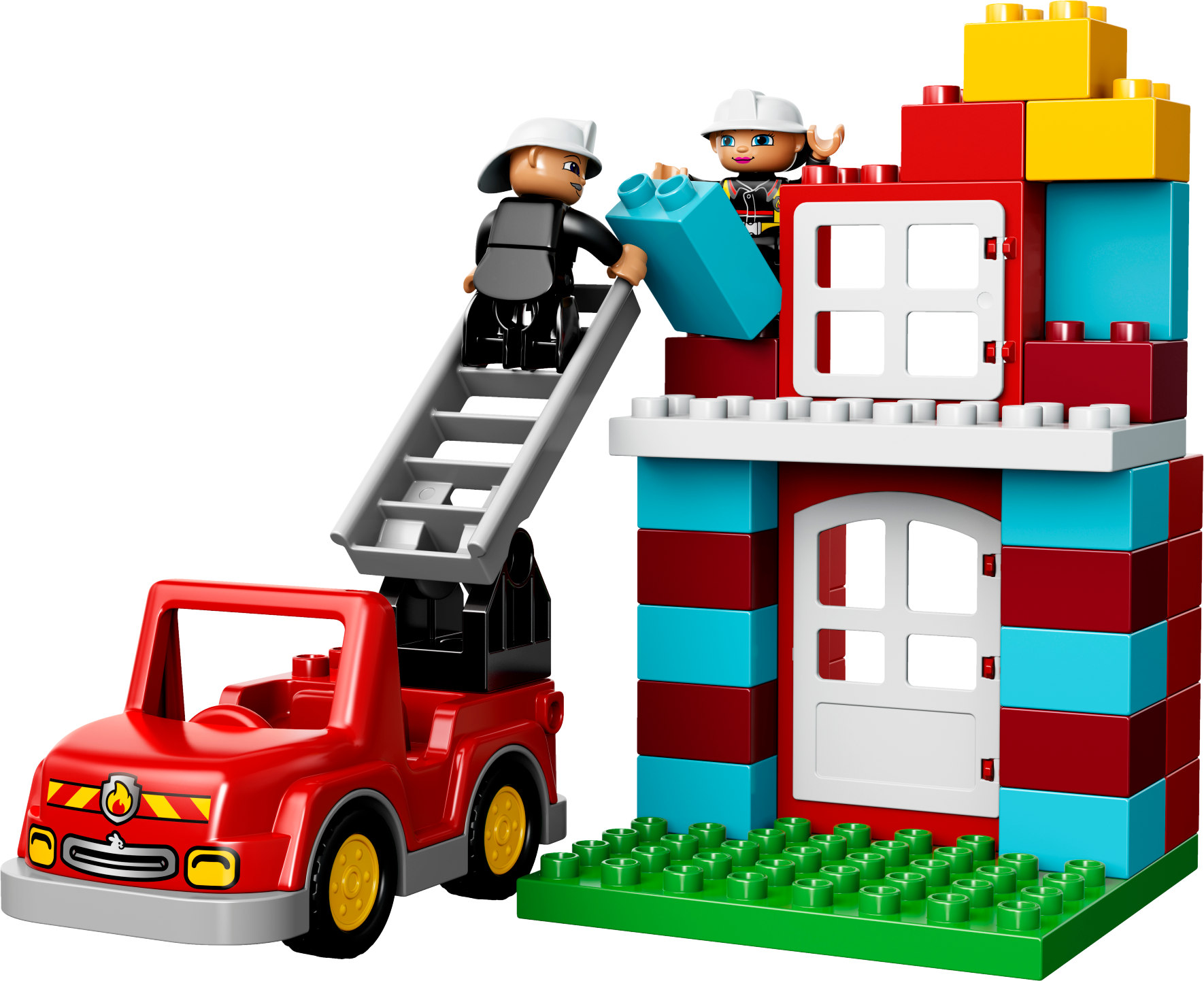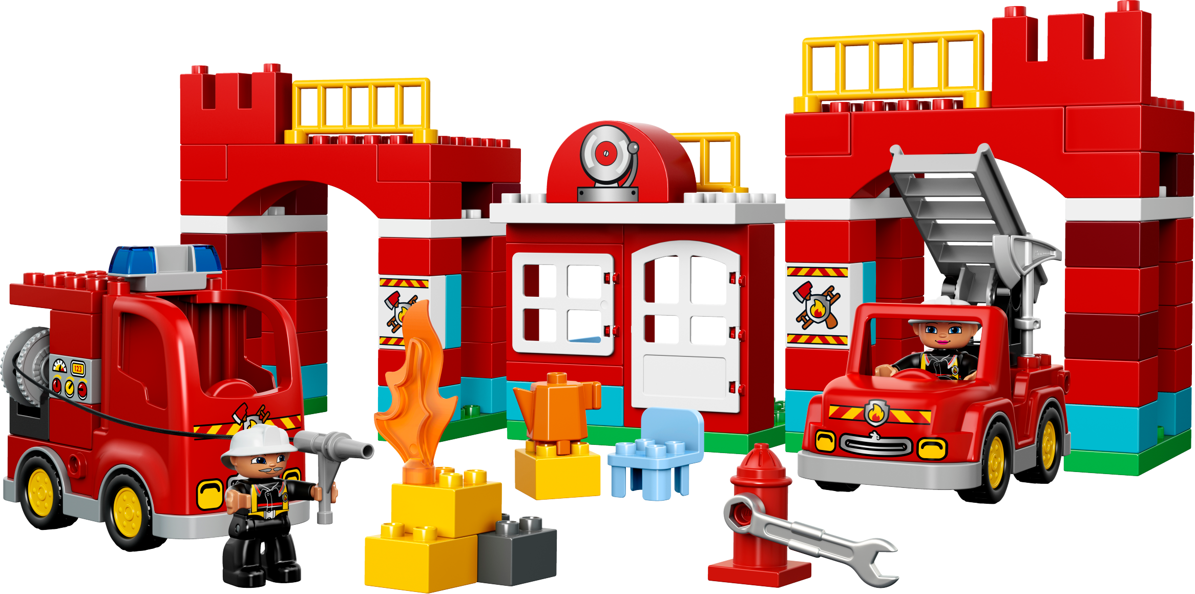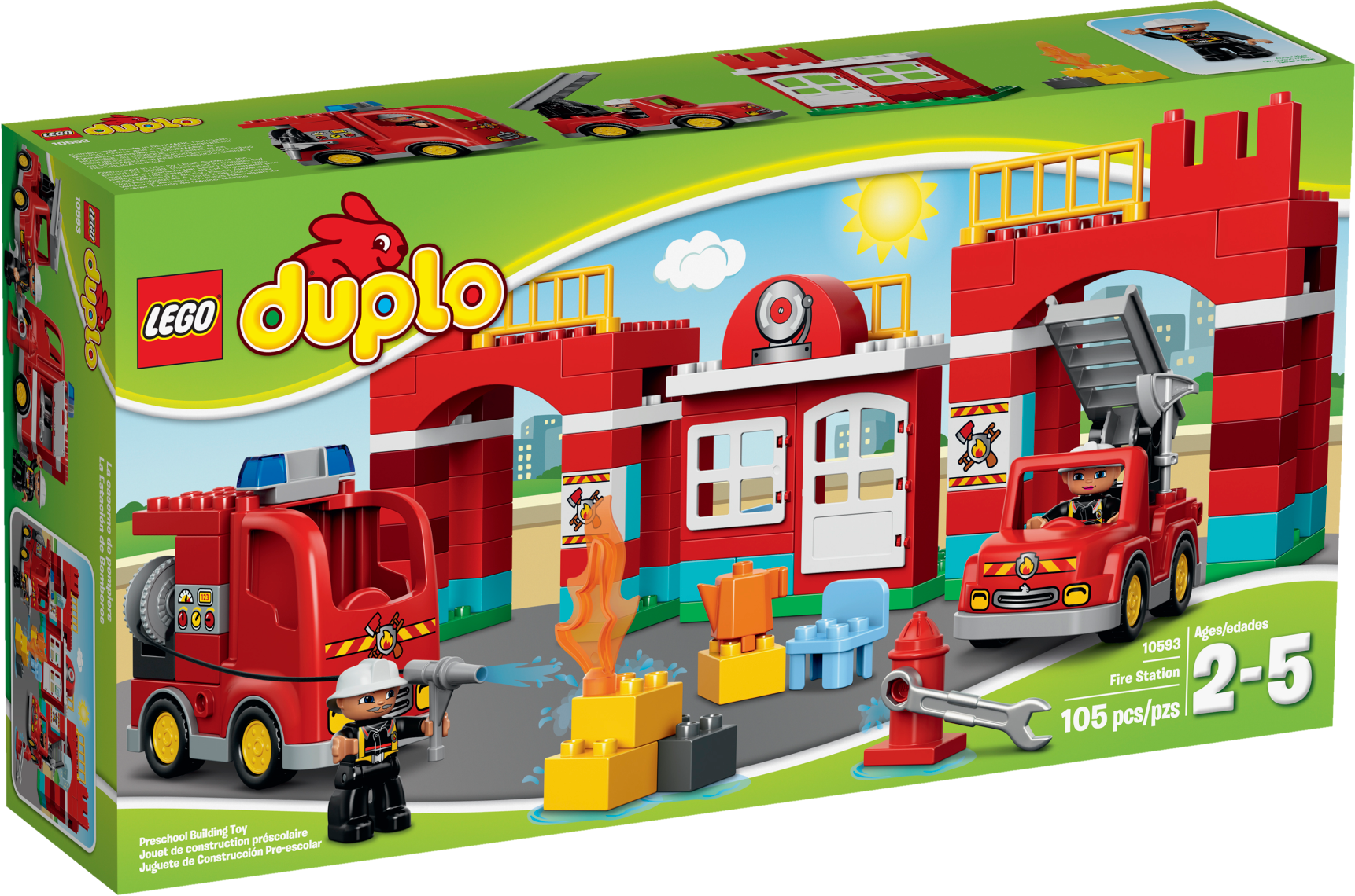 Join the firefighters on duty at the LEGO® DUPLO® Fire Station! Get set for action at the LEGO® DUPLO® Fire Station! Build the station and park the shiny red fire vehicles in their places, ready to go. Do a practice drill and put out the small fire in the station yard. When the fire bell rings, help the firefighters jump into the fire truck and fire car and speed to the rescue! This set will keep any little firefighter entertained as they master early building skills and enjoy exciting vehicle and role play. Use this set to talk to your child about what firefighters do, and the importance of fire safety. DUPLO bricks are brightly colored and designed especially to be safe for smaller hands. Includes 2 firefighter LEGO DUPLO figures. Combine with the 10591 Fire Boat and 10592 Fire Truck for even more fire rescue adventures. Includes 2 firefighter LEGO® DUPLO® figures Features a Fire Station building with garages and opening window and door Features 2 vehicles: a fire truck with retractable hose and a fire car with moving ladder Accessories include a fire-bell-decorated brick, wrench, flame, axe and a water hydrant Get the fire vehicles ready for their next rescue Practice putting out a fire in the station yard Create endless role play action at the Fire Station with this exciting new set Helpyoungchildren master basic building skills Use this set to talk to your child about fire safety LEGO® DUPLO® products are specially designed to be fun and safe for younger hands Makes an ideal addition to any LEGO® DUPLO® Town collection Combine with 10591 Fire Boat and 10592 Fire Truck for even more fire rescue adventures Fire station building measures over 7" (19cm) high, 17" (44cm) wide and 3" (9cm) deep Fire truck measures over 4" (12cm) high, 5" (14cm) long and 2" (7cm) wide Fire car measures over 3" (10cm) high, 5" (14cm) long and 2" (7cm) wide