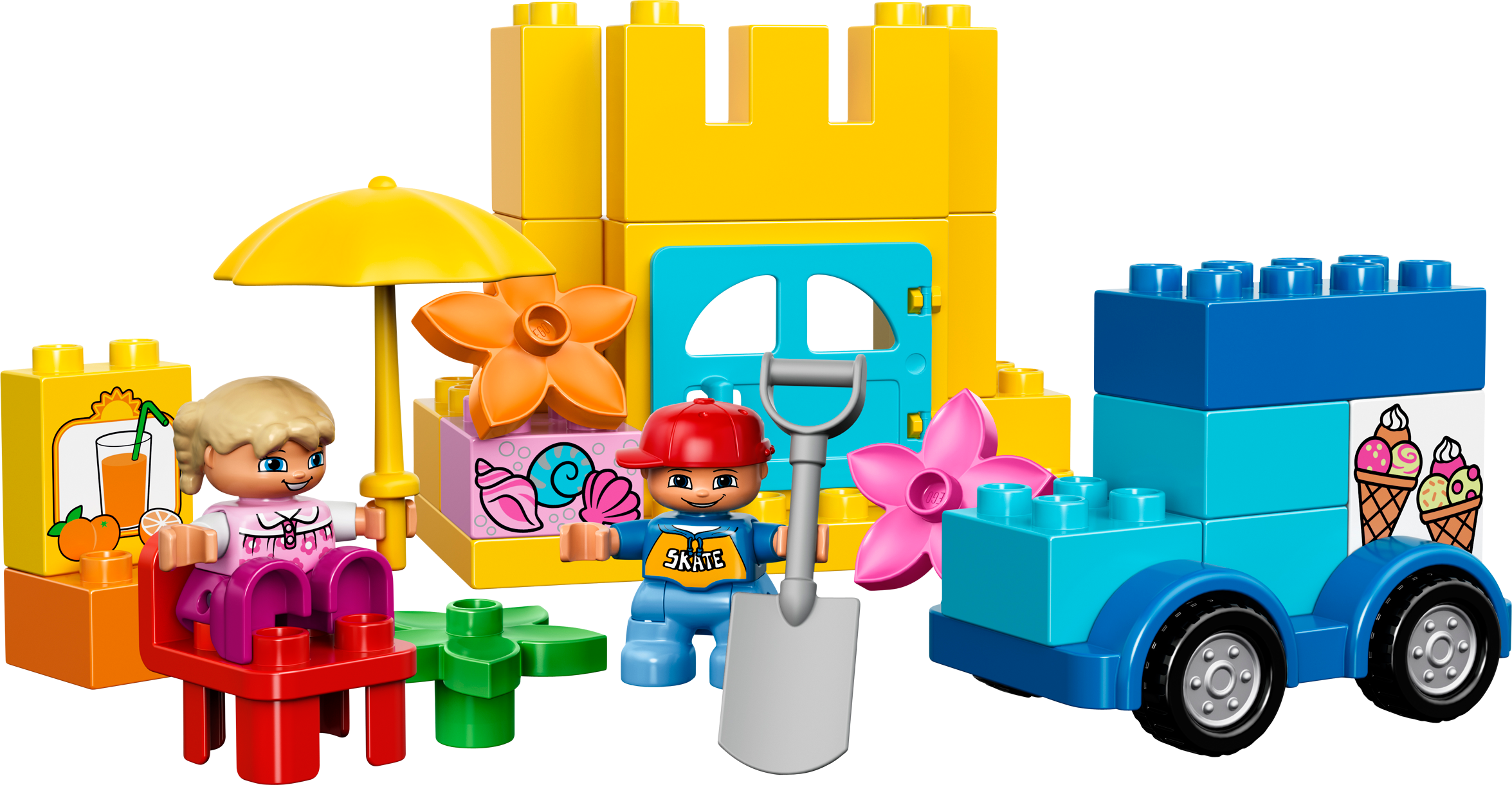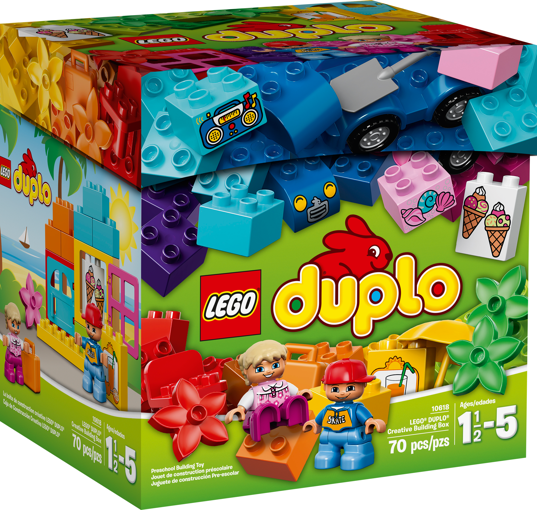 Inspire open-ended building creativity with LEGO® DUPLO®! Get inspired with the LEGO® DUPLO® Creative Building Box! What will your little one create from a box of big and chunky LEGO DUPLO bricks? Start your stories with vacation-themed decorated bricks to help spark their imagination for open-ended building creativity. This set also includes a buildable car with separate wheelbase, opening door and window plus accessories including a parasol, suitcase, chairs and flowers. The brightly colored LEGO DUPLO bricks are designed especially to be safe and suitable for little hands. Includes 2 child LEGO DUPLO figures. Includes 2 child LEGO® DUPLO® figures Features a buildable car with separate wheelbase and an opening door Accessories include a parasol, suitcase, chairs and flowers Includes bricks decorated as ice-cream, sea shells, orange juice and a stereo Let your toddler get inspired and spark their creativity with the vacation-themed bricks Start your stories by building a sand castle, ice-cream van, holiday house or a garden picnic Create fun role play scenarios with the LEGO® DUPLO®figures LEGO® DUPLO® products are specially designed to be safe and suitable for little hands Sand castle measures over 4" (11cm) high, 4" (12cm) wide and 1" (5cm) deep Car measures over 3" (8cm) high, 3" (9cm) long and 2" (6cm) wide