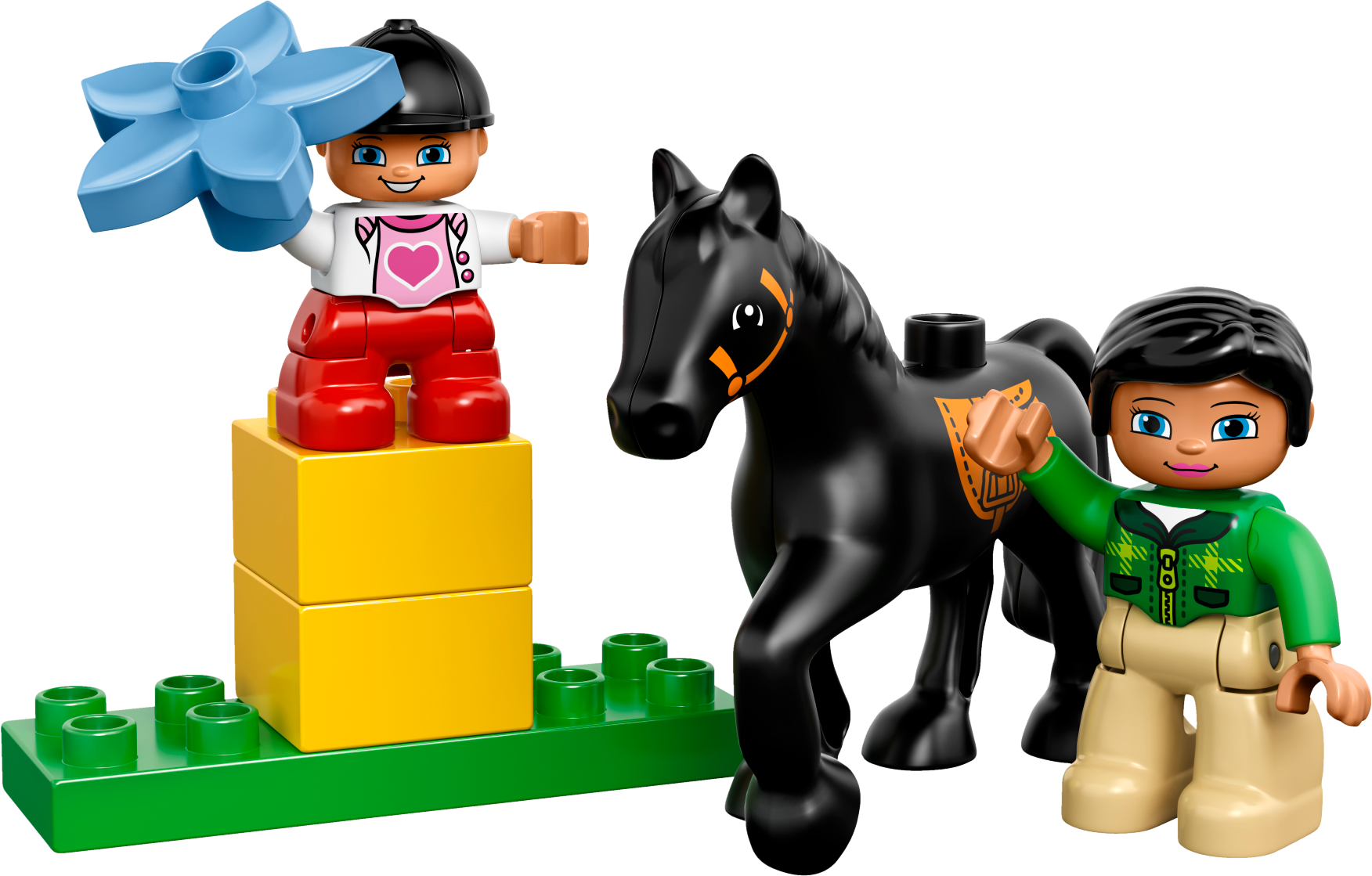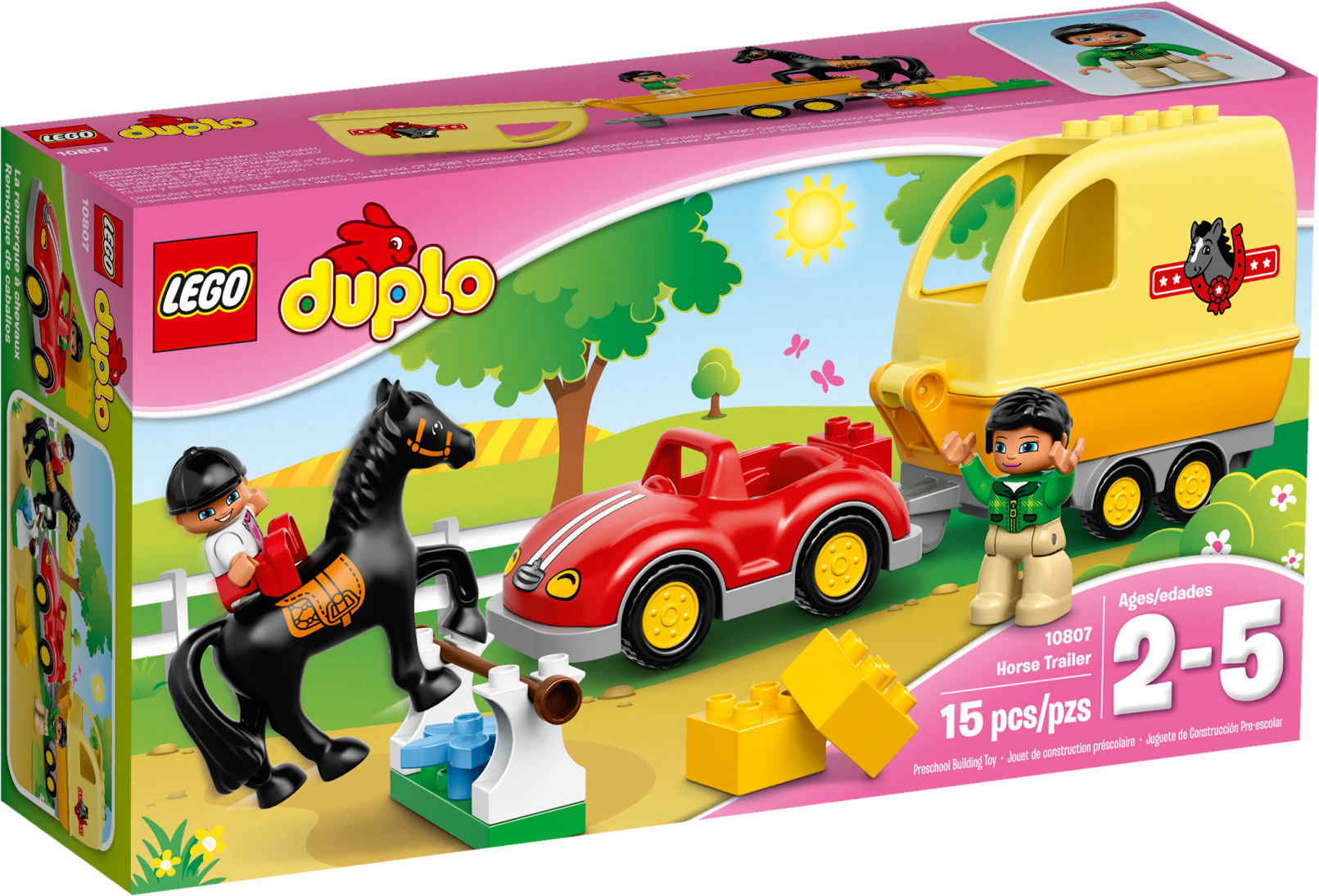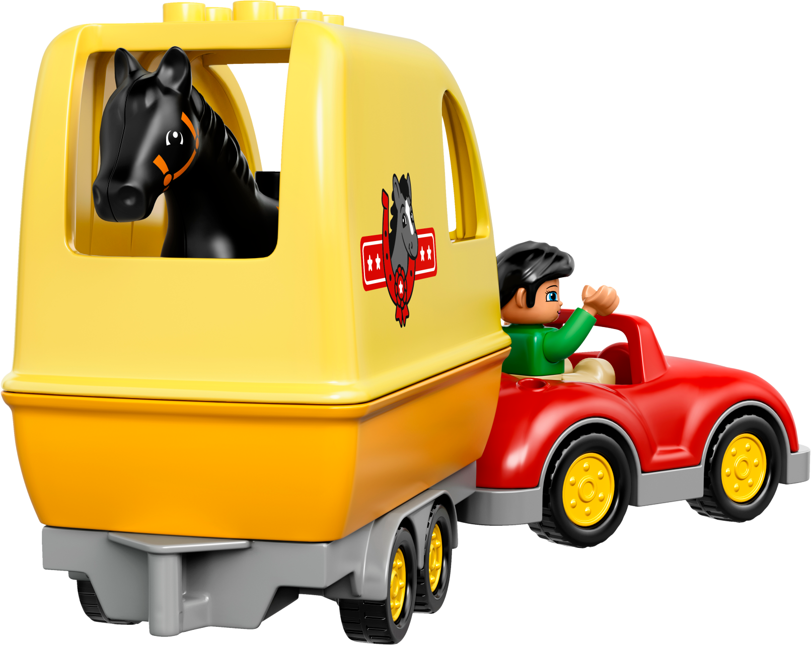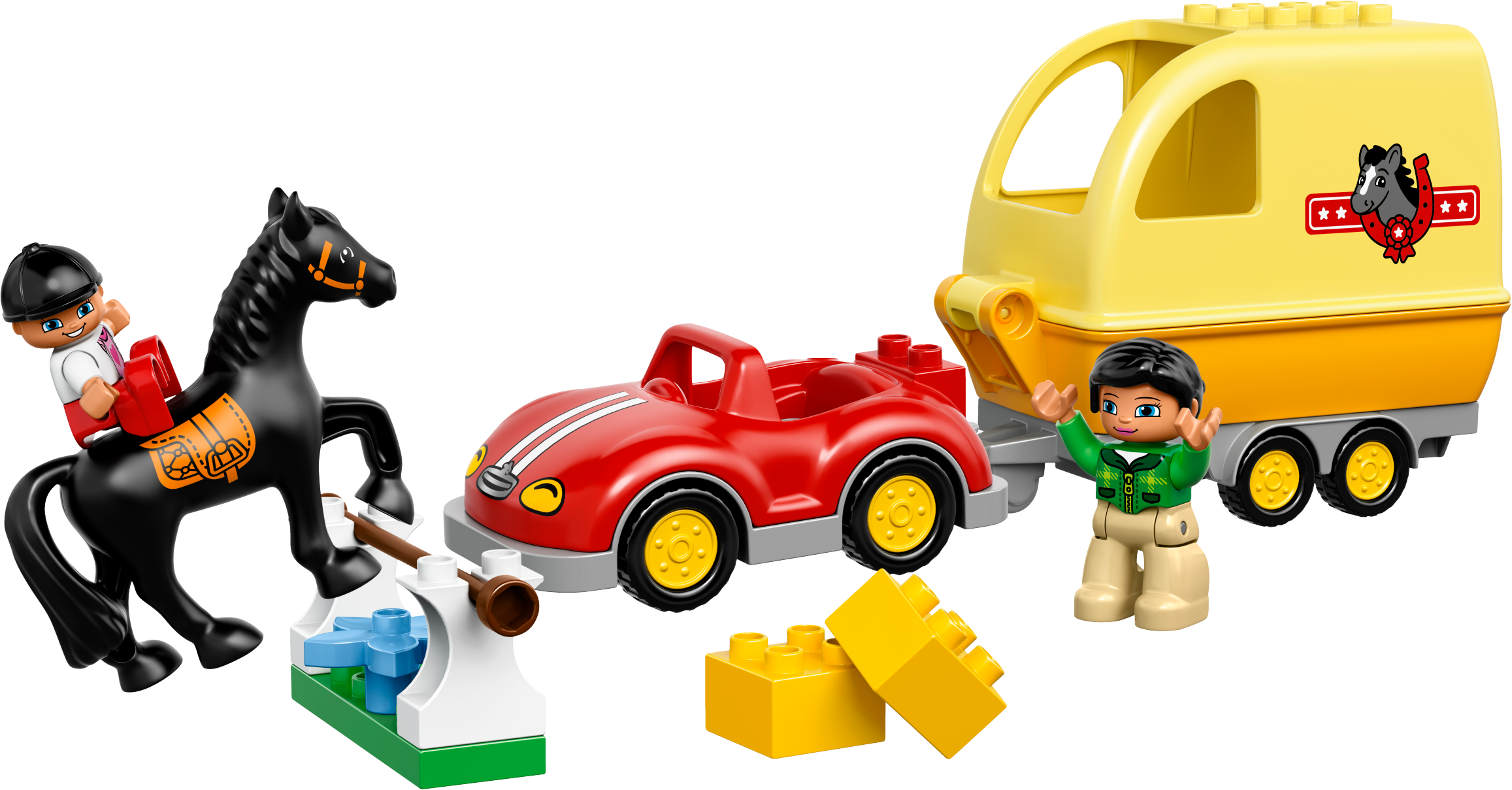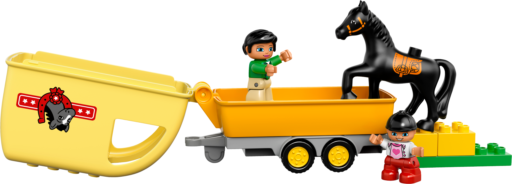 Travel to riding events in the LEGO® DUPLO® Horse Trailer! With this easy-to-build car and horse trailer, you and your horse can get to all the best show jumping events! First, build the jump and practice in the field. Whoops! Your horse knocked the bar off—time to rebuild it and keep trying. Once you and your horse have mastered the jump, hook the trailer up to the car and lead your horse carefully inside and head off to the competition! Includes 2 LEGO® DUPLO® figures: a mom and child, plus a horse. Features a buildable car and horse trailer with opening top as well as a practice jump with a bar that can be knocked off. Lead the horse into the trailer and make sure the top is securely closed before driving off. Use the jump to help your child learn about practicing, then make it higher using the extra bricks. Encourage role-play skills between the LEGO® DUPLO® figures and cute animal. LEGO® DUPLO® products are specially designed to be safe and suitable for little hands. Car measures over 2” (6cm) high, 5” (15cm) long and 2” (7cm) wide. Horse Trailer measures over 5” (14cm) high, 6” (17cm) long and 3” (8cm) wide. Jump measures over 1” (5cm) high, 5” (14cm) wide and 1” (3cm) deep. Combine with the 10806 Horses for even more riding fun.
