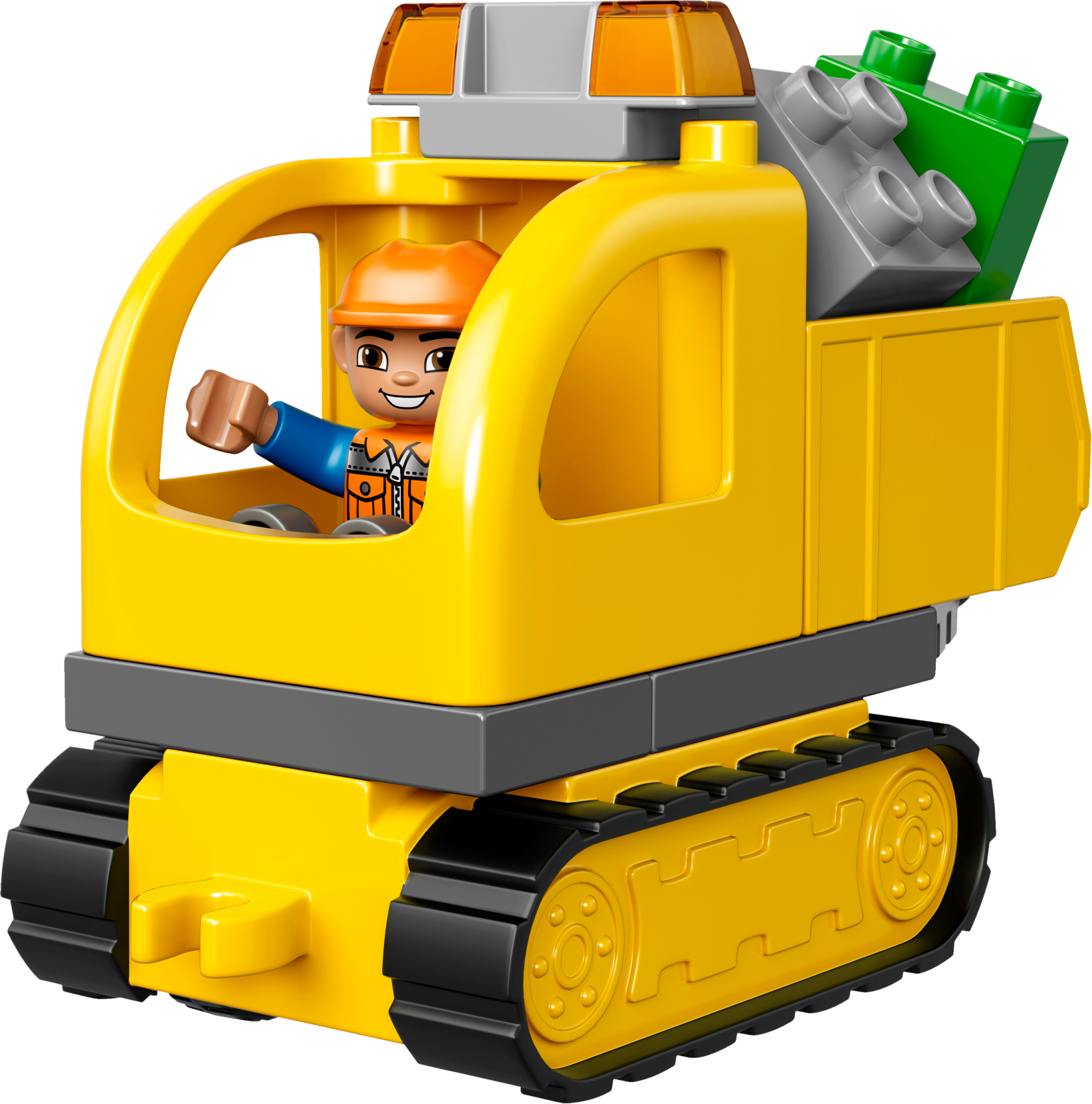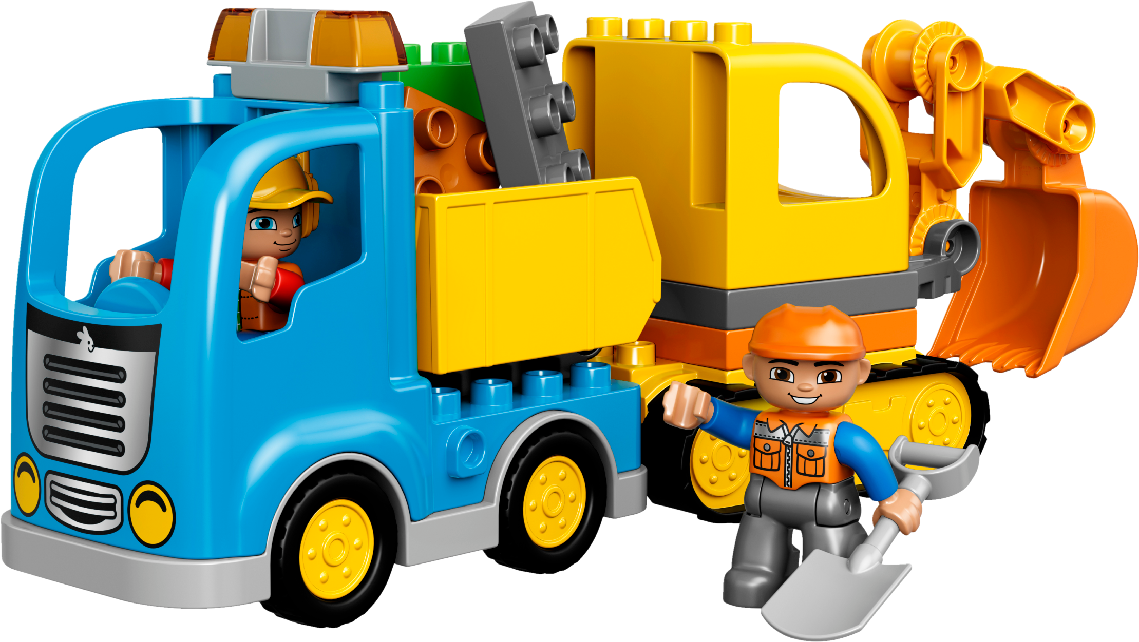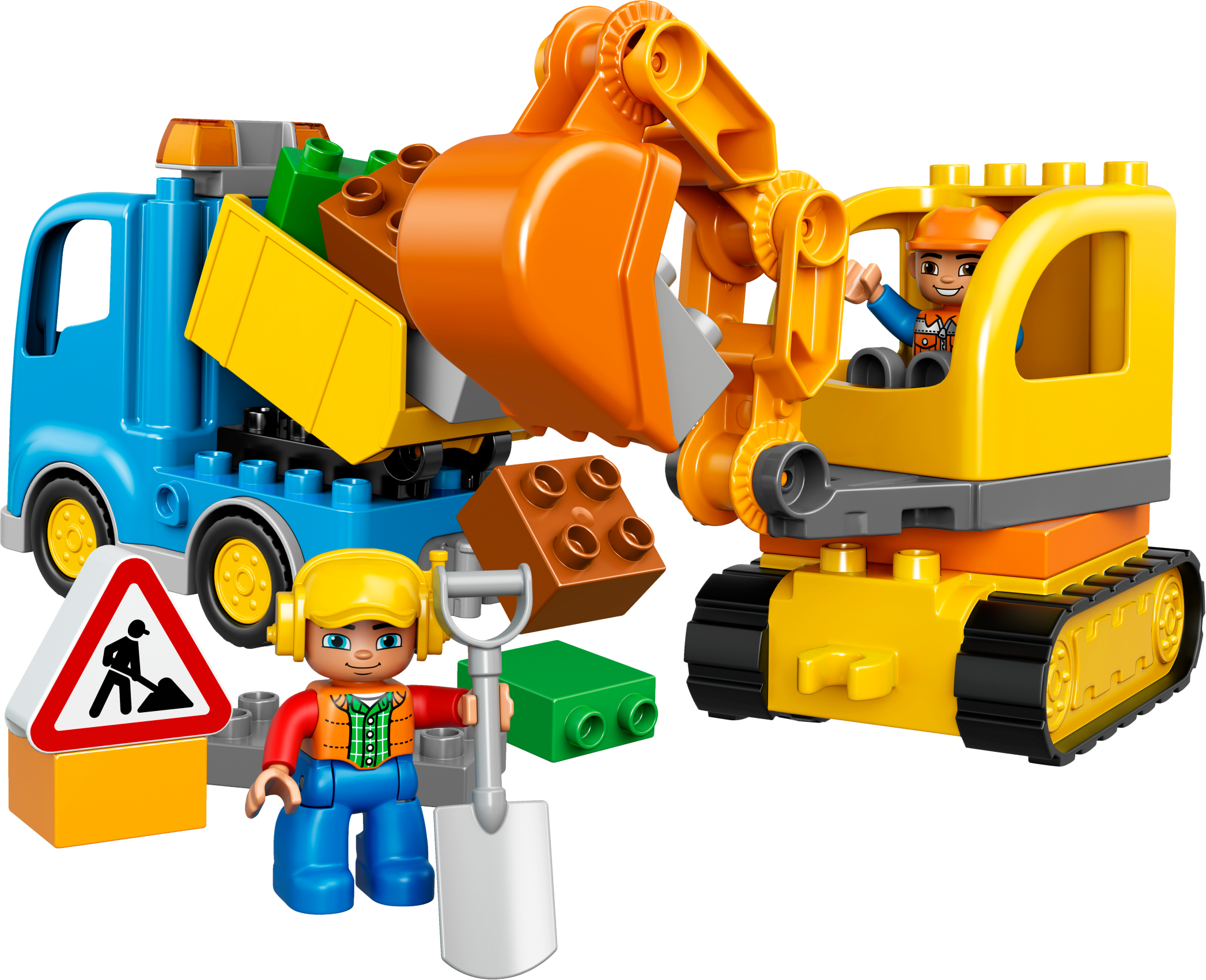 Dig and shovel all day, then drive the rubble away! Little diggers will love operating these easy-to-build construction machines. Move the Tracked Excavator over uneven land and dig with its big shovel. Take its working, flexible arm apart to make it shorter and then load up the Truck with its tipping function to drive the rubble away! LEGO® DUPLO® bricks are specially designed to be safe for little hands. Includes 2 construction worker DUPLO figures. Includes 2 construction worker LEGO® DUPLO® figures with safety helmets. Features a Truck with tipping function and a Tracked Excavator with moving tracks, rotating cabin and big shovel on a posable arm, plus extra bricks for scooping. Help your child construct, bend and flex the special posable arm system on the Tracked Excavator for digging and scooping all day long. Accessories include a roadwork sign and a shovel. Have fun while nurturing early building skills and encouraging role-play with the 2 LEGO® DUPLO® figures. These 2 exciting vehicles are simple to build so the digging can start sooner! LEGO® DUPLO® products are specially designed to be safe and suitable for little hands. Truck measures over 4” (12cm) high, 7” (19cm) long and 2” (7cm) wide. Tracked Excavator measures over 4” (12cm) high, 9” (25cm) long and 2” (7cm) wide. Combine with the 10811 Backhoe Loader and 10813 Big Construction Site for even more digging and building fun.