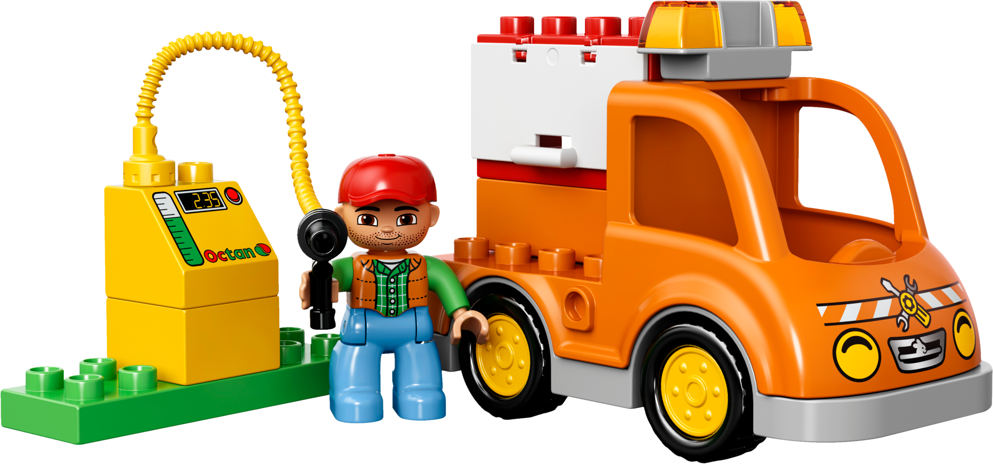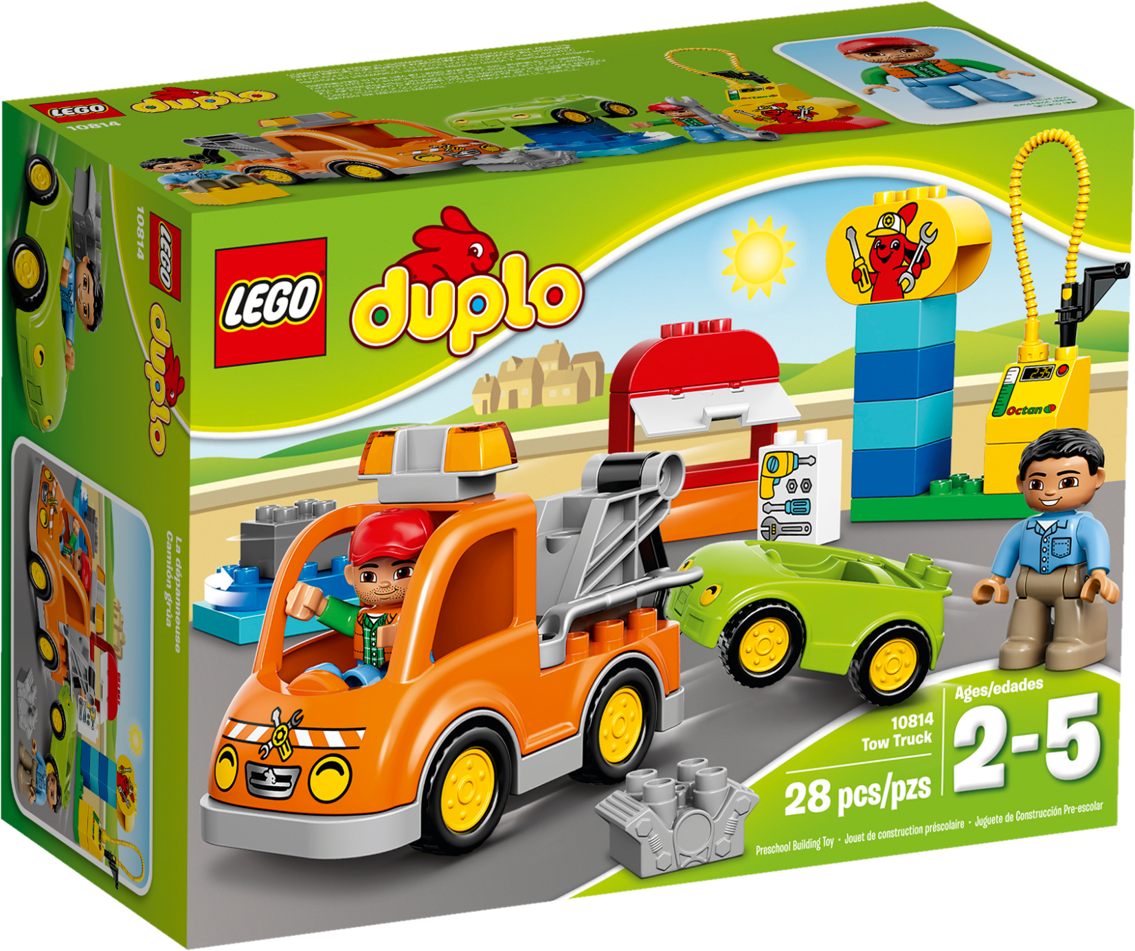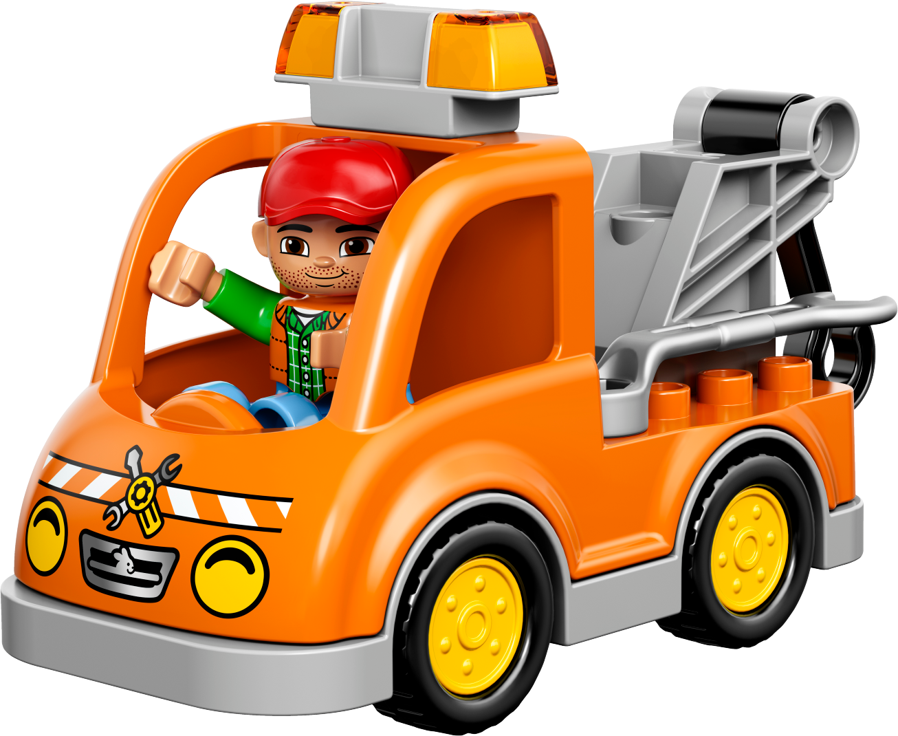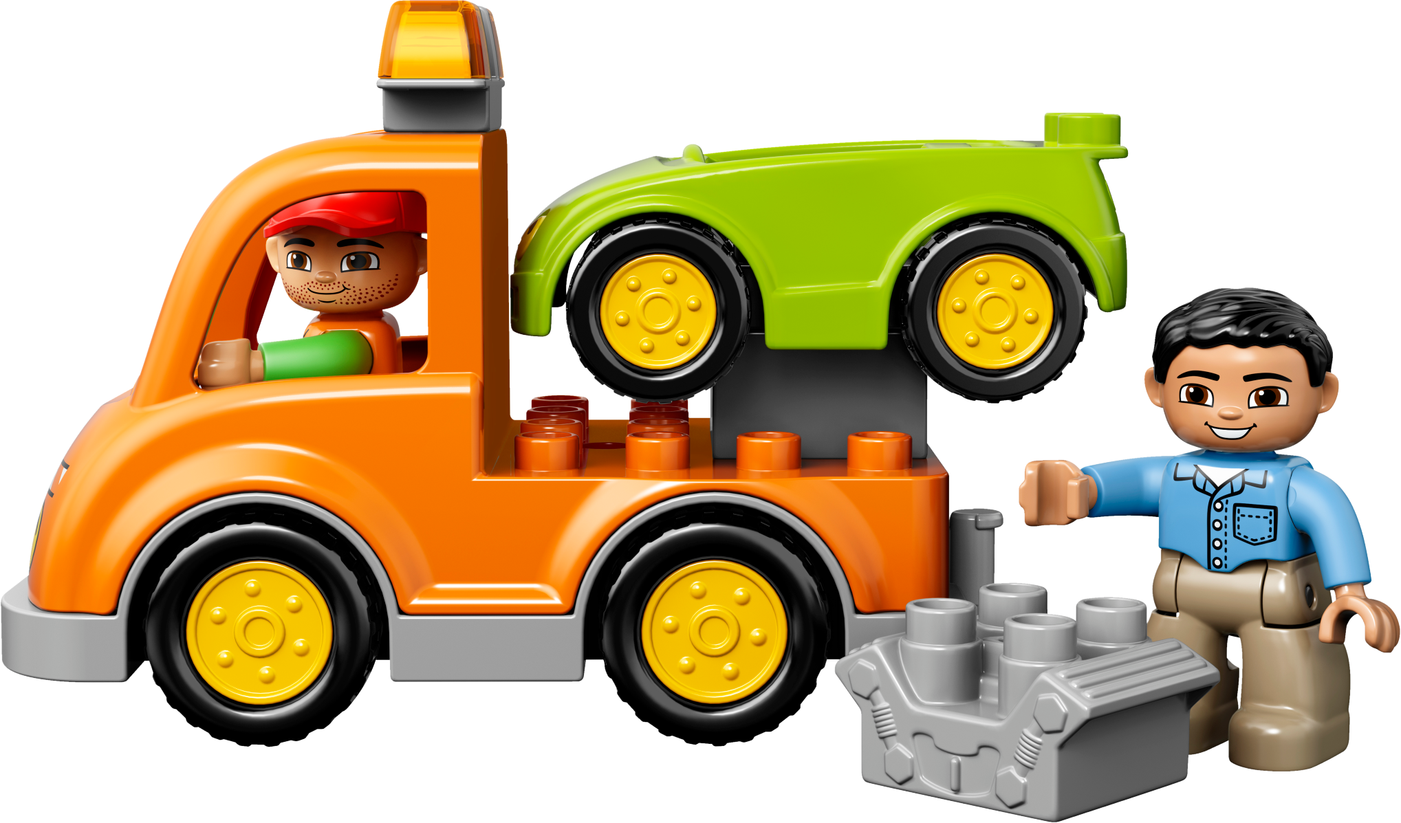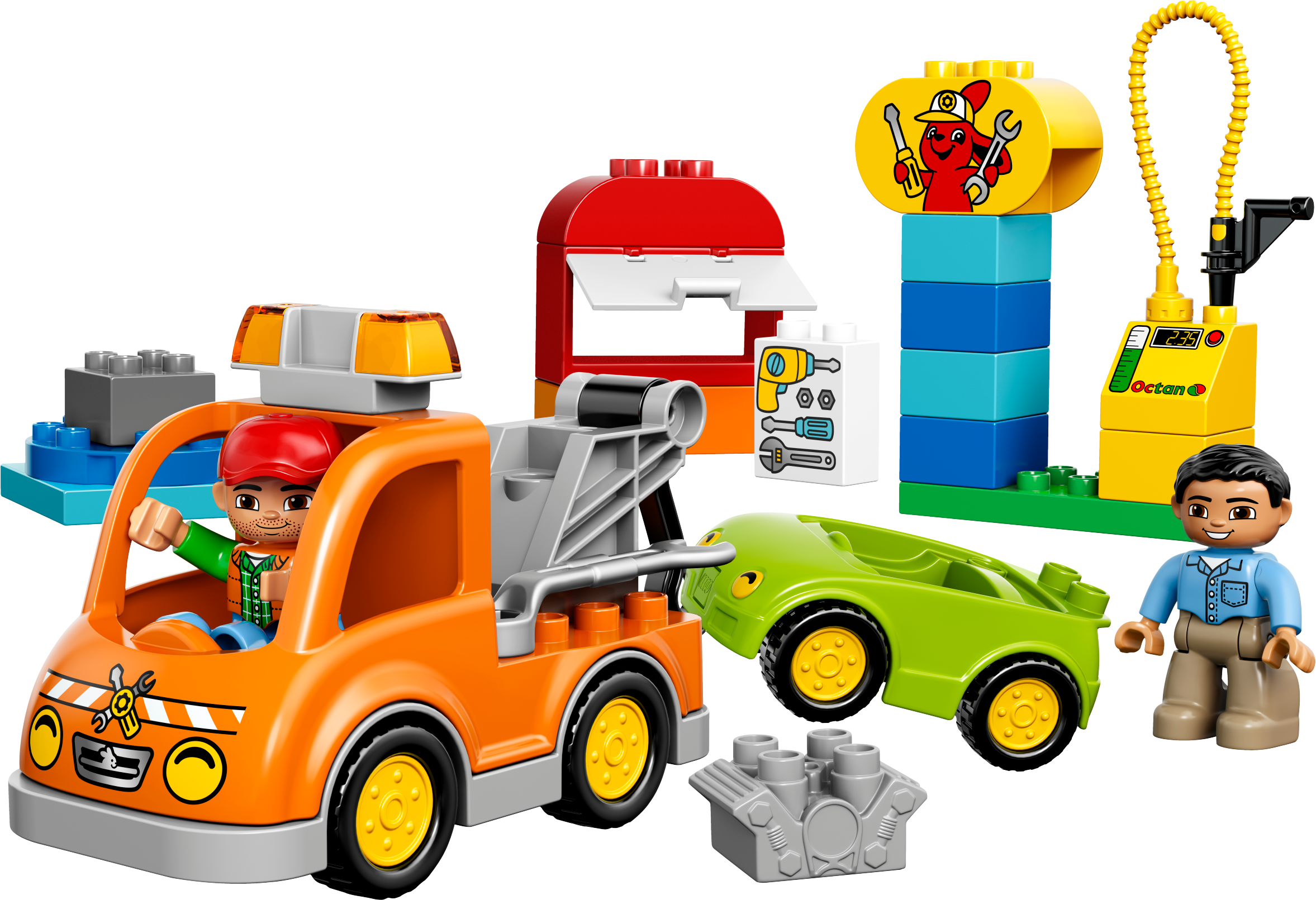 Tow the broken down car with the big orange Tow Truck! A car has broken down in the road! Luckily a friendly mechanic is driving past in his Tow Truck. Hook the car onto the Tow Truck and drive it to the garage to be fixed. There are so many tools to use there. Put the car on the turntable and tighten everything up with the wrench. Then top up the fuel and the car is ready to go! Who can you find to tow next? Includes 2 LEGO® DUPLO® figures: a driver and a mechanic. Features a buildable car and Tow Truck with hook plus garage elements including a turntable. Accessories include a petrol pump, wrench, special toolbox brick and a brick decorated as a garage sign as story starters. Hook the car onto the Tow Truck and help the mechanic tow it away. Toddlers will love creating role-play stories with a vehicle break-down theme. Develop early building skills by stacking the bricks to createthe garage sign. LEGO® DUPLO® products are safe and specially designed to be fun and easy for little hands. Tow Truck measures over 3” (10cm) high, 6” (17cm) long and 2” (7cm) wide. Car measures over 1” (4cm) high, 3” (9cm) long and 2” (6cm) wide. Makes an ideal addition to any LEGO® DUPLO® Town collection.