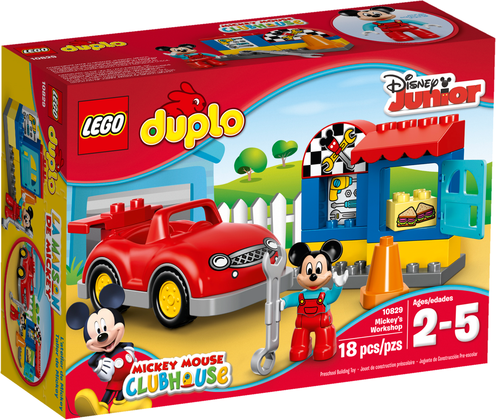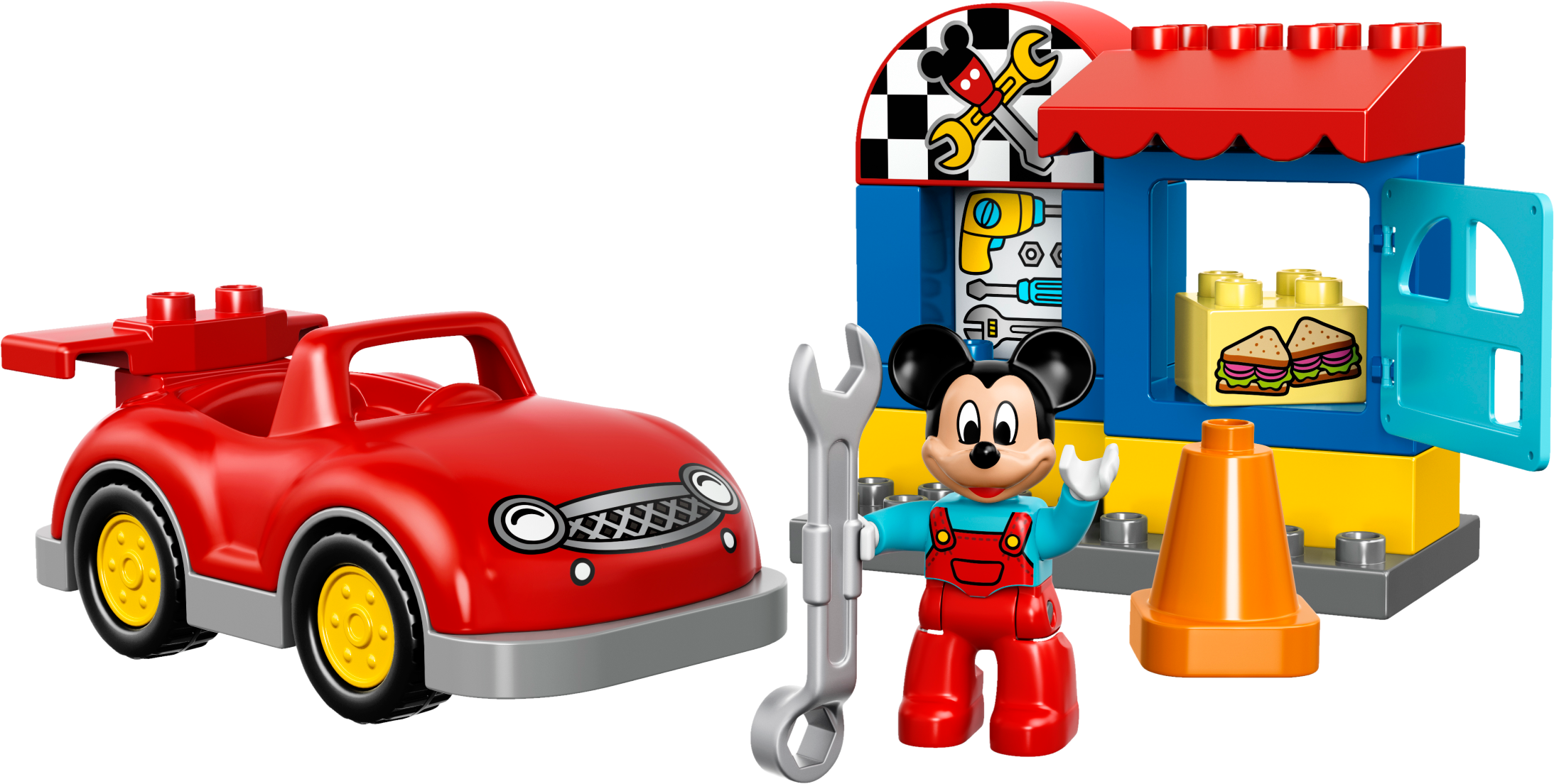 Fix up Mickey Mouse’s car then take it for a spin! Little Disney fans will love to role play in Mickey Mouse’s Workshop. The big red car provides hours of fun and there are special bricks decorated as tools, sandwiches and a workshop sign to help them start their own stories. It’s easy to build with the brightly colored LEGO® DUPLO® bricks designed especially for budding builders. Includes a DUPLO figure: Mickey Mouse. Includes a LEGO® DUPLO® figure: Mickey Mouse. Features a workshop with opening door and a buildable car. Build Mickey Mouse’s cool red car then give it a service with the wrench. Accessory elements include a wrench and a traffic cone. Also includes bricks decorated as tools, sandwiches and a workshop sign as story starters. Have fun creating role-play stories with Disney’s Mickey Mouse. Help your child master basic building skills with this simple model. LEGO® DUPLO® products arespecially designed to be fun and easy for little hands. Workshop façade measures over 3” (10cm) high, 4” (12cm) wide and 2” (6cm) deep. Car measures over 2” (6cm) high, 5” (15cm) long and 2” (7cm) wide.