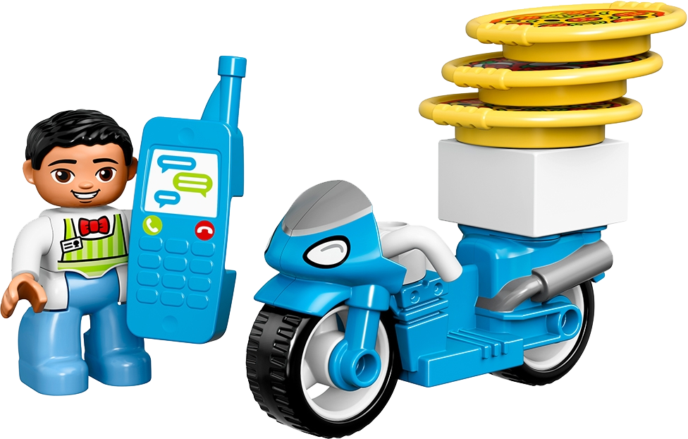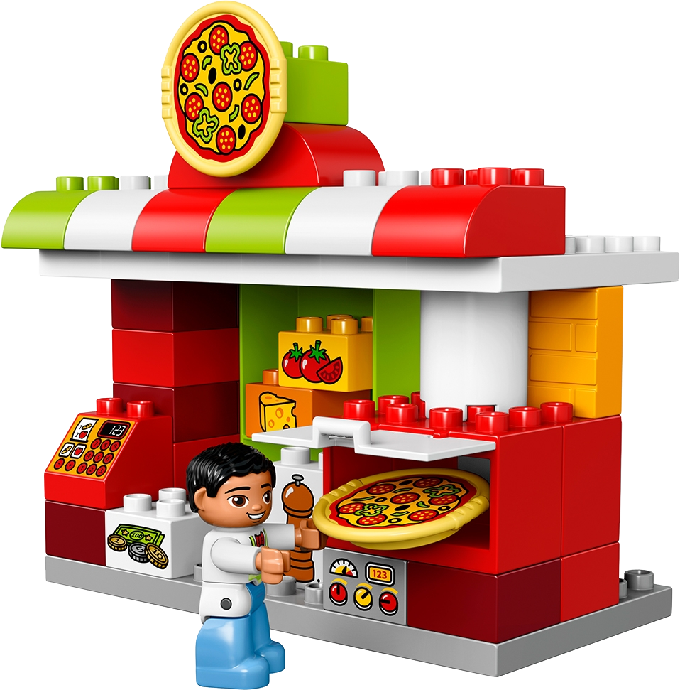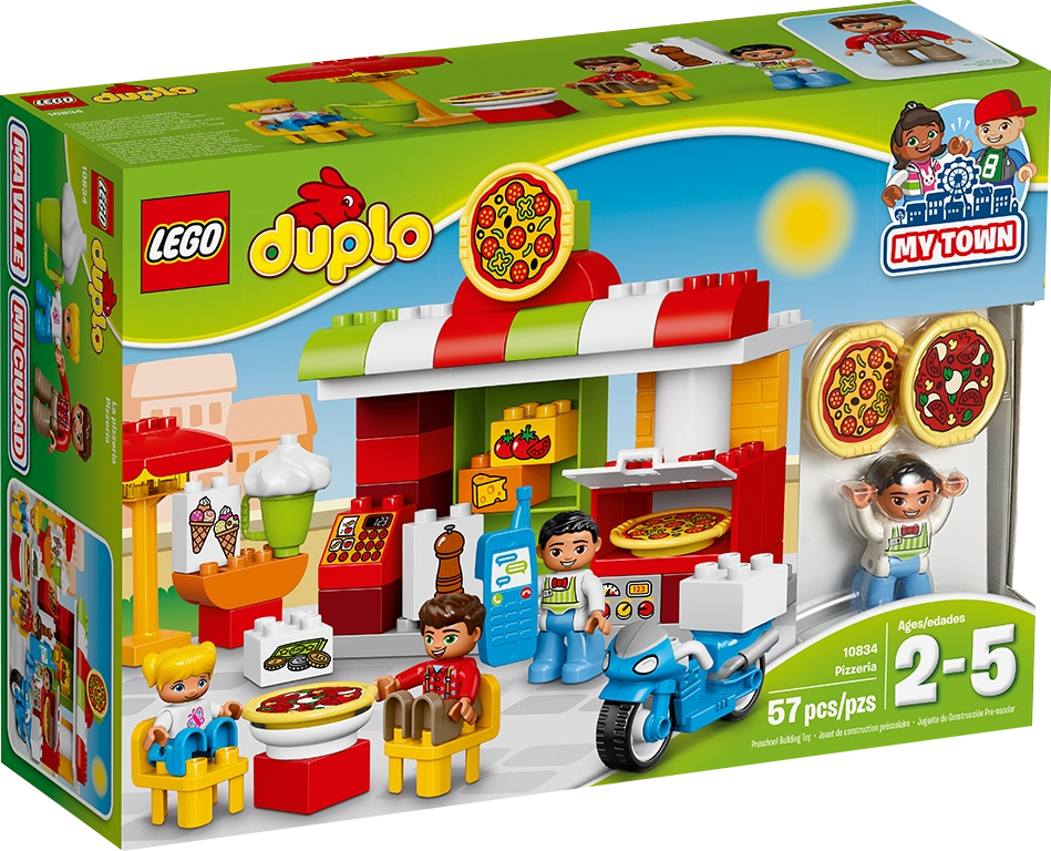 Play out real-life scenarios in LEGO® DUPLO® My Town: a recognizable world with modern DUPLO figures. Toddlers will love serving delicious pizza straight from the oven in this colorful restaurant, while learning the routines and etiquette of eating out. They can also take orders over the phone then load up the bike for delivery. Includes three DUPLO figures. Includes three LEGO® DUPLO® figures: a restaurant owner, dad and a child. Features a buildable pizzeria with opening pizza oven, outdoor seating area with umbrella, ice cream stand and a delivery bike. Includes bricks decorated as tomatoes, cheese, ice cream, pepper grinder, money and oven controls as story starters. Accessory elements include three pizzas with two different toppings, cash register, ice cream, cup, and a mobile phone. Help your child take a delicious pizza out of the oven and serve it to customers in the outdoor seating area. Toddlers will enjoy taking orders over the phone, then driving the bike to deliver them. Use the modern characters, accessories and decorated bricks to have fun while helping your toddler learn the routines and etiquette of eating out. LEGO® DUPLO® products are specially designed to be safe and suitable for small hands. This set offers an age-appropriate build and play experience for ages 2-5. Pizzeria measures over 7”(19cm) high, 7” (19cm) wide and 3” (9cm) deep. Delivery bike measures over 1” (5cm) high, 3” (9cm) long and 1” (4cm) wide. There are several My Town products to collect and play out your child’s everyday life in a recognizable LEGO® DUPLO® world.