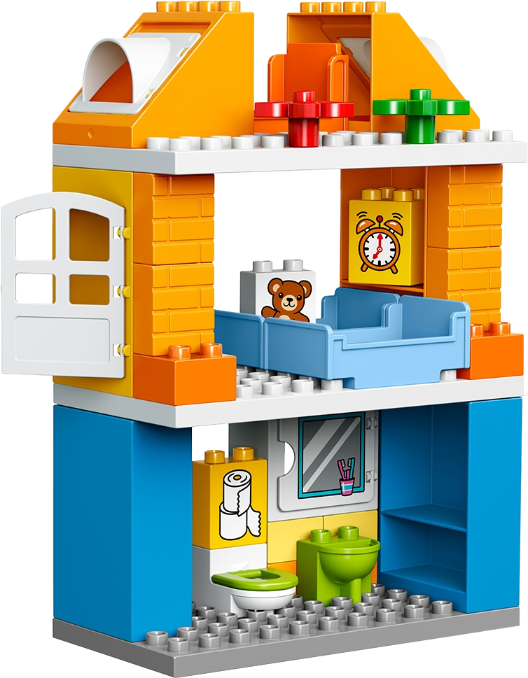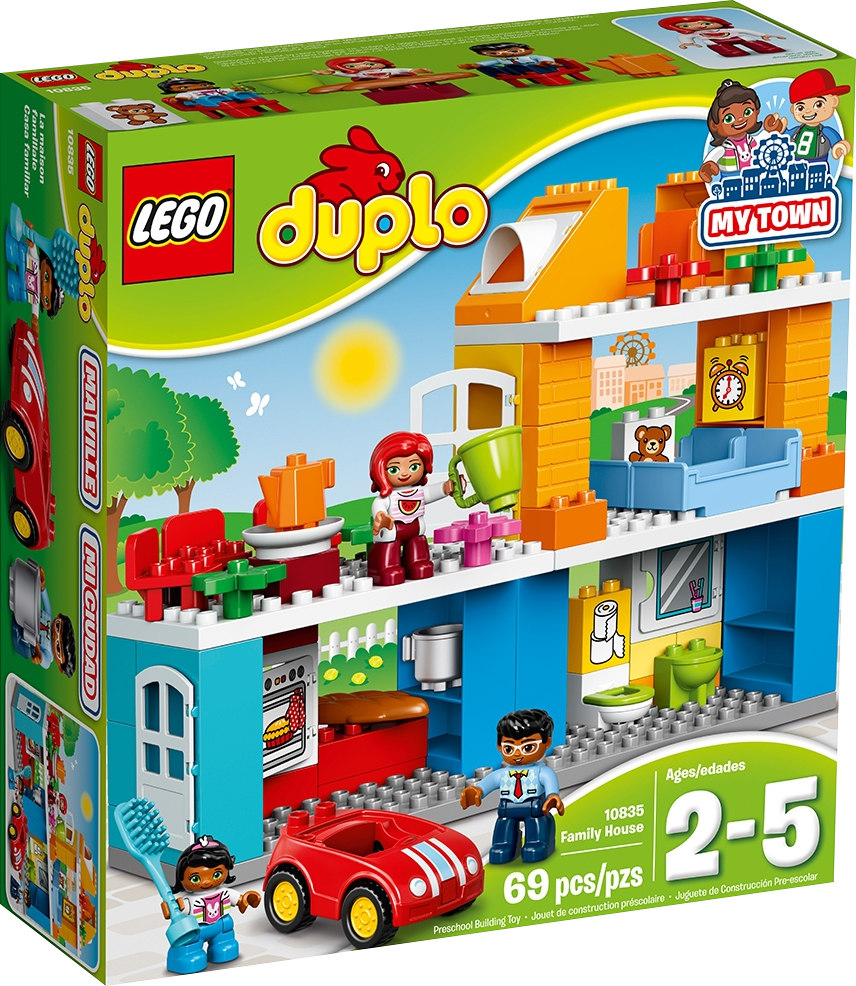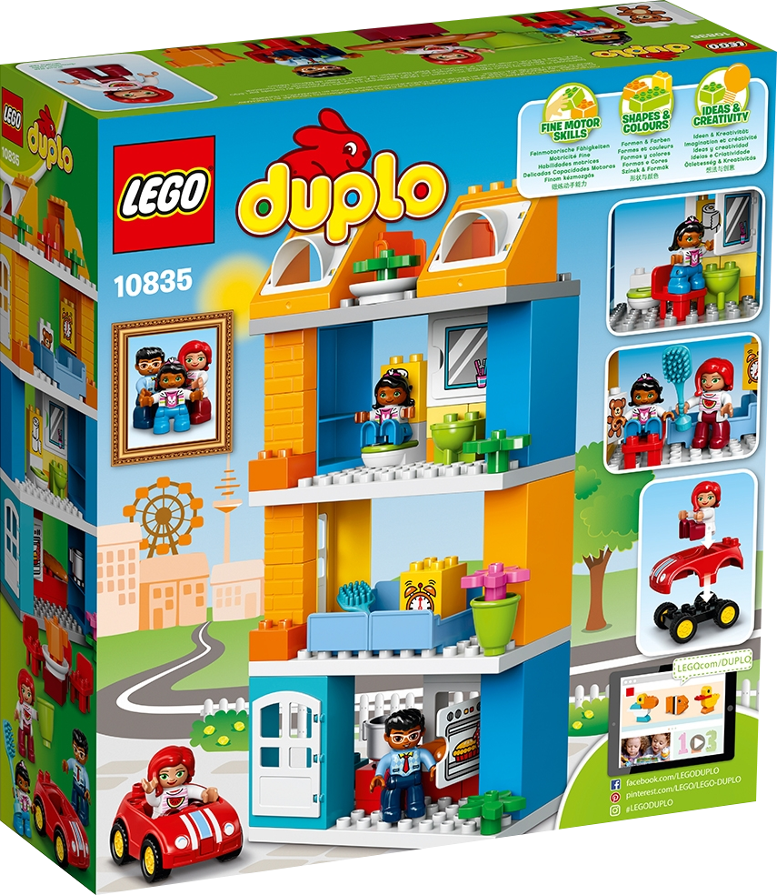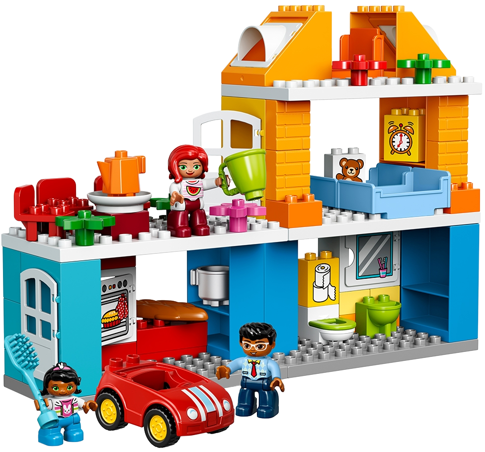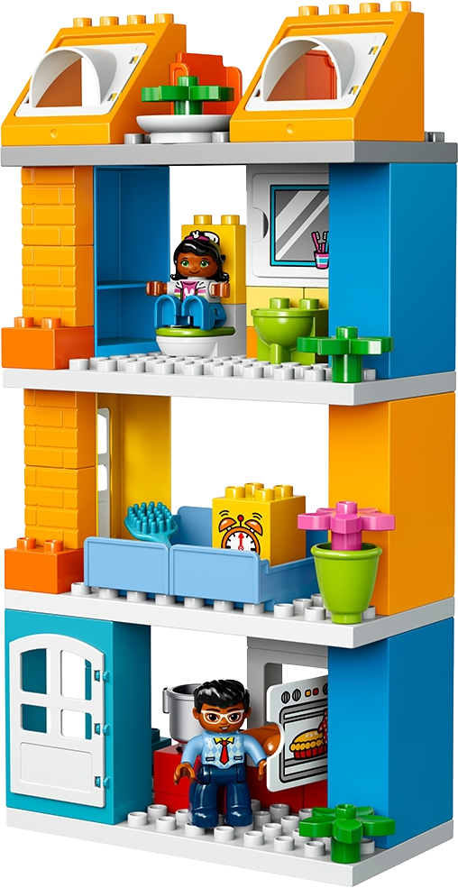 Play out real-life scenarios in LEGO® DUPLO® My Town: a recognizable world with modern DUPLO figures. There are endless play opportunities in this easy-to-build house—toddlers can have fun practicing activities and routines, from getting up in the morning, preparing and eating a meal to washing the car. Watch role-play skills develop as they play out everyday life with three DUPLO figures. Includes three LEGO® DUPLO® figures: a mom, dad and a child. Features a modular house over three levels with a kitchen with opening oven, bathroom with toilet, basin and opening mirror cabinet, bedroom with beds, child’s room with opening dormer windows, roof terrace dining area, interior shelves, opening doors, and a car. Includes bricks decorated as a mirror, toilet paper, alarm clock, oven and a teddy bear as story starters. Accessory elements include a cooking pot, plate, baguettes, jug, cup, brush and flowers. Use the modern characters, accessories and decorated bricks to help reinforce daily routines and play out everyday scenarios with your toddler. This fun and easy-to-build family house encourages early construction skills and presents endless play opportunities. The modular structure means this set can be rearranged and built in lots of different ways. Toddlers will enjoy pretending to help dad wash the car or bake the baguettes in the oven. LEGO® DUPLO® products are specially designed to be safe and suitable for small hands. This set offers an age-appropriate build and play experience for ages 2-5. Family House measures over 11” (28cm) high, 14” (38cm) wide and 3” (9cm) deep. Car measures over 1” (4cm) high, 3” (9cm) long and 2” (6cm) wide. There are several My Town products to collect and play out your child's everyday life in a recognizable LEGO® DUPLO® world.