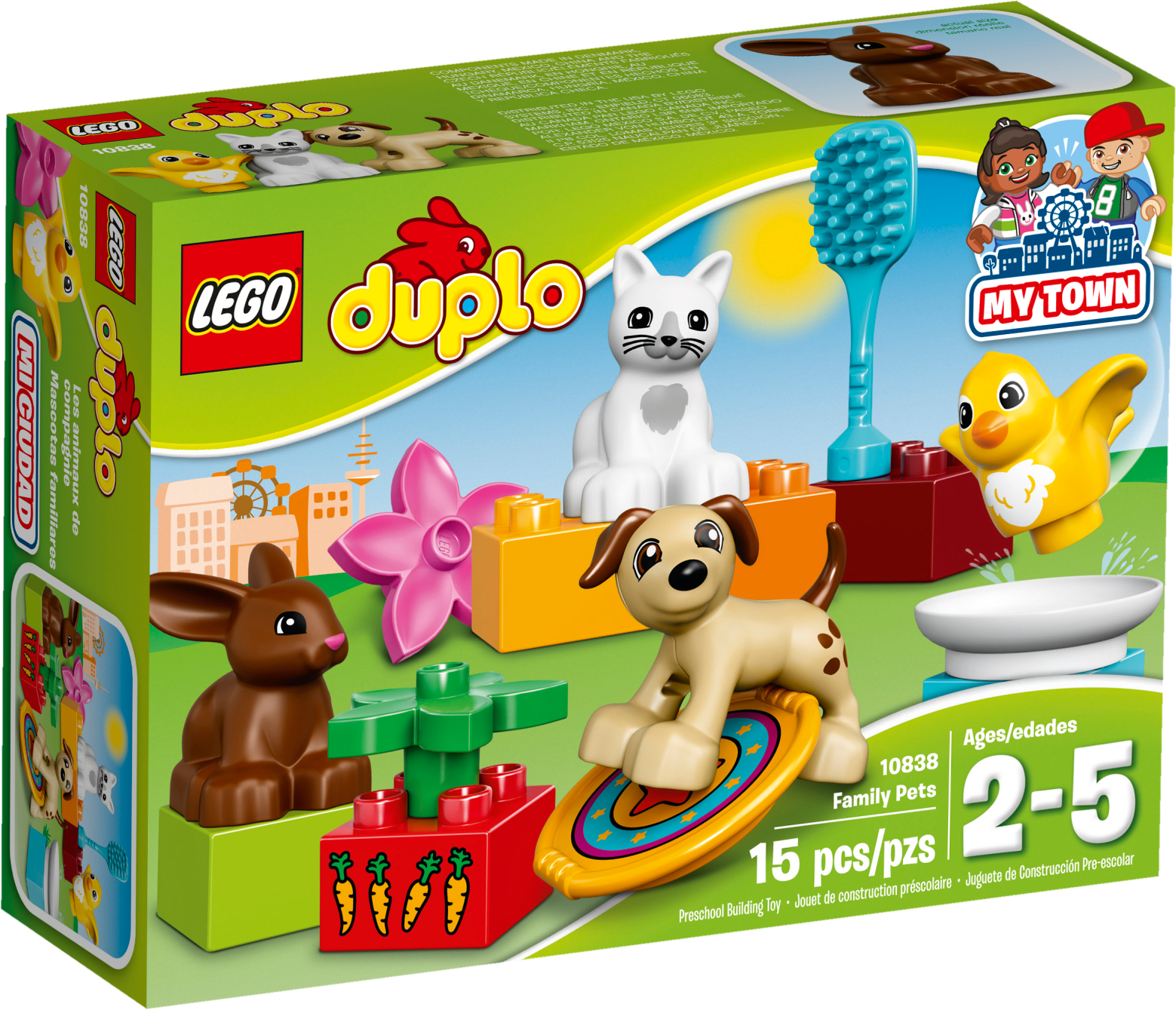 Take a trip to the park to play with all the Family Pets! Young children will love to create stories with this inspiring collection of animal figures—they can throw the flying disc for the dog, groom the cat with the brush, give the bird a bath and feed carrots to the rabbit. Add these loving pets to other LEGO® DUPLO® My Town sets for endless animal fun. Includes dog, cat, rabbit and bird figures. Accessory elements include a flying disc, brush, birdbath, flower and a brick decorated as carrots. Help young children learn how to care for and play with their pets. LEGO® DUPLO® products are specially designed to be safe and suitable for small hands. This set offers an age-appropriate play experience for ages 2-5. There are several My Town products to collect and play out your child's everyday life in a recognizable LEGO® DUPLO® world.