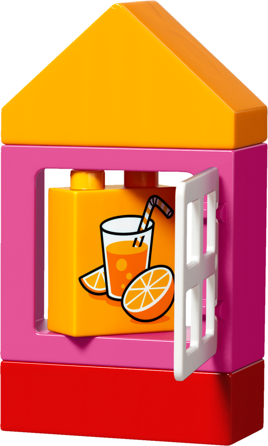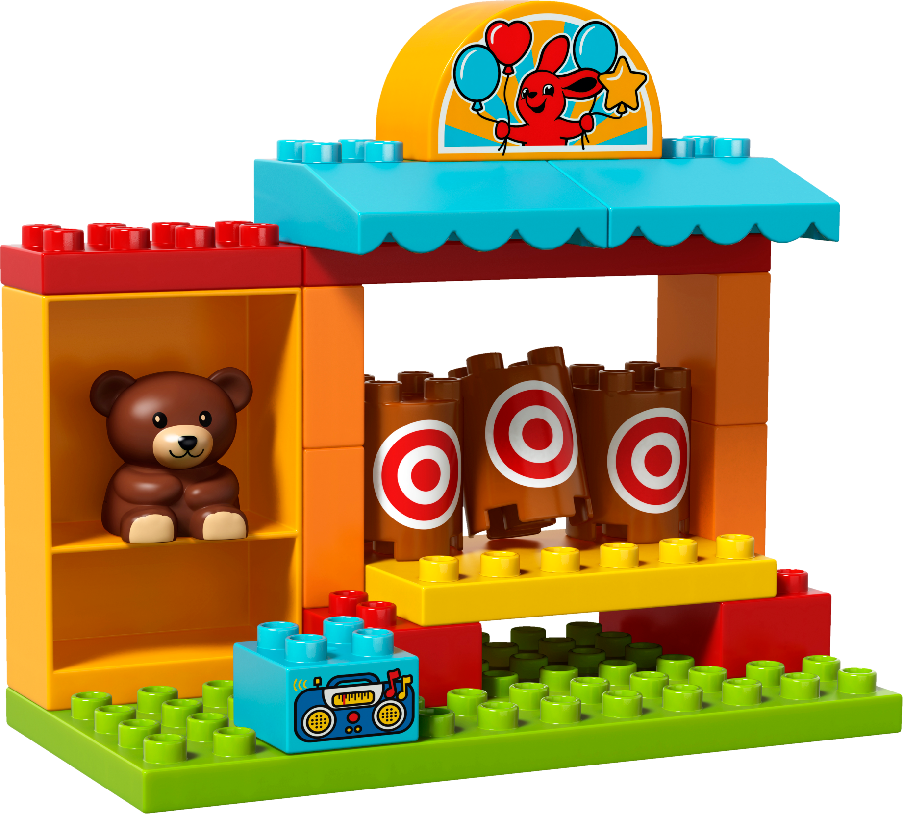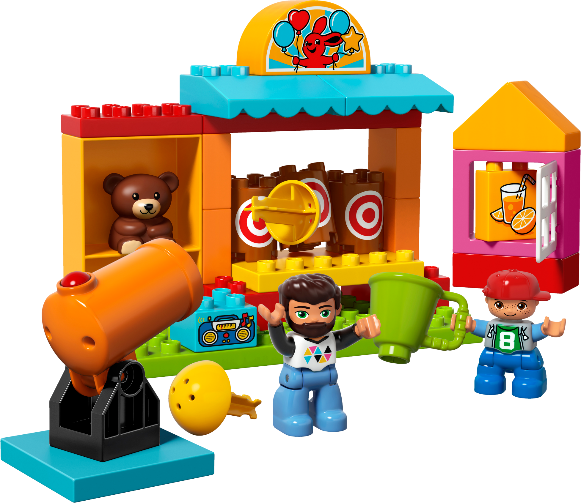 Young children will love to fire the cannon at the 3 targets on the LEGO® DUPLO® Shooting Gallery stall. Encourage them to have fun trying to knock them over, and they can win a prize for one of the 2 DUPLO figures. Help them fetch a drink from the juice kiosk, and then rebuild it together and play all over again!
