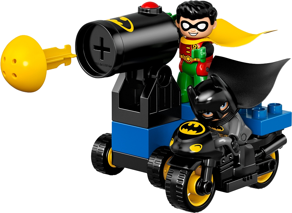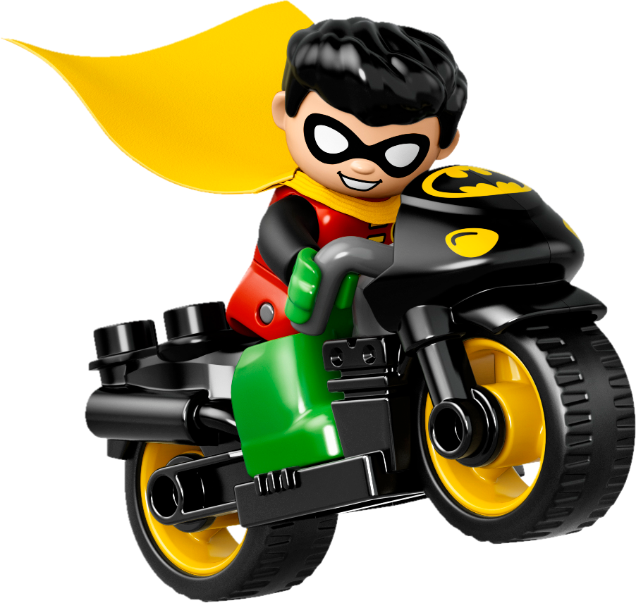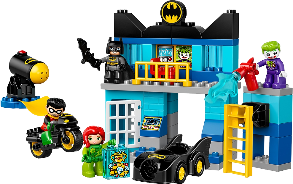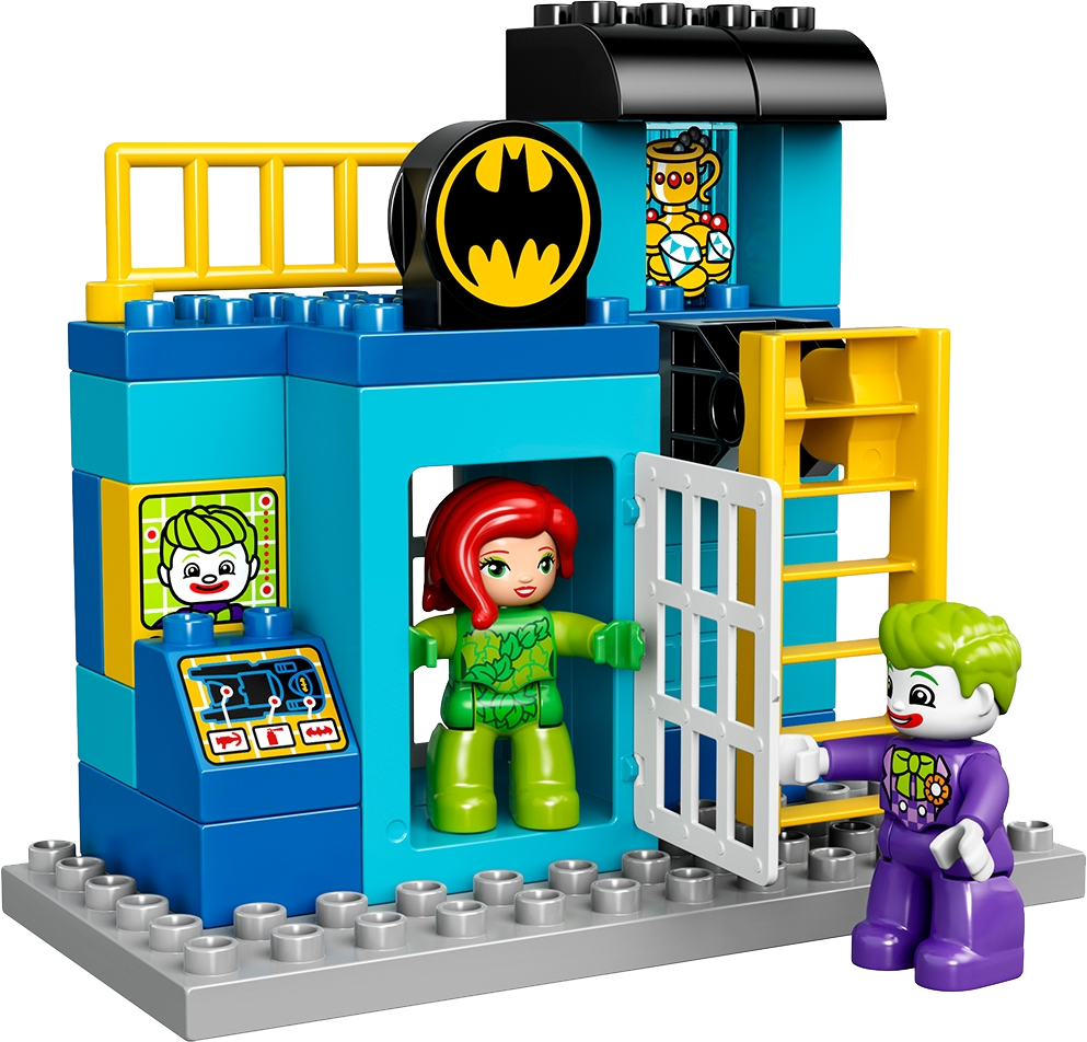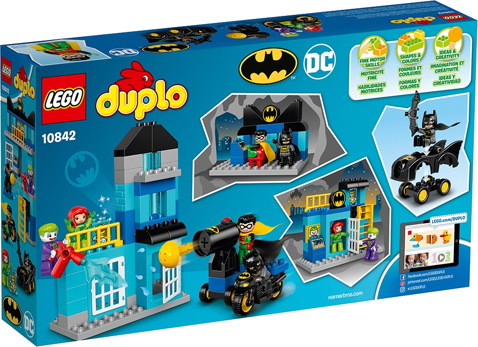 Young Batman™ fans will love playing with these iconic super heroes and super-villains in this colorful LEGO® DUPLO® play set. Your little super hero will love driving the Batmobile™ and Batcycle around the Batcave as they look for The Joker™ and Poison Ivy. Role-play fun action scenes as they capture the two intruders and then place them inside the jail. Includes four LEGO DUPLO figures. Includes four LEGO® DUPLO® figures: Batman™, Robin, The Joker™ and Poison Ivy. Features the Batcave with a cannon, screen control zone and jail, plus Batmobile™ and Batcycle. Also includes bricks decorated as treasure, computer screens, radar and the Batman™ sign as story starters. Encourage team-building skills by teaming up Batman™ and Robin to help them find the intruders. Accessories include a Batarang, water gun, ladder, fence, chair and cannon darts. Build and rebuild theBatcave for hours of action and adventure. Help your child master basic building skills with this Easy to Build model. LEGO® DUPLO® products are specially designed to be safe and suitable for small hands. Combine with the LEGO® DUPLO® 10823 Batwing Adventure set for even more Batman™ fun! This set offers an age-appropriate build and play experience for ages 2-5. Batcave measures over 9” (23cm) high, 3” (9 cm) wide and 7” (19cm) deep. Batmobile™ measures over 1” (4cm) high, 4”(12cm) long and 1” (5cm) wide. Batcycle measures over 1” (5cm) high, 3” (9cm) long and 1” (4cm) wide.