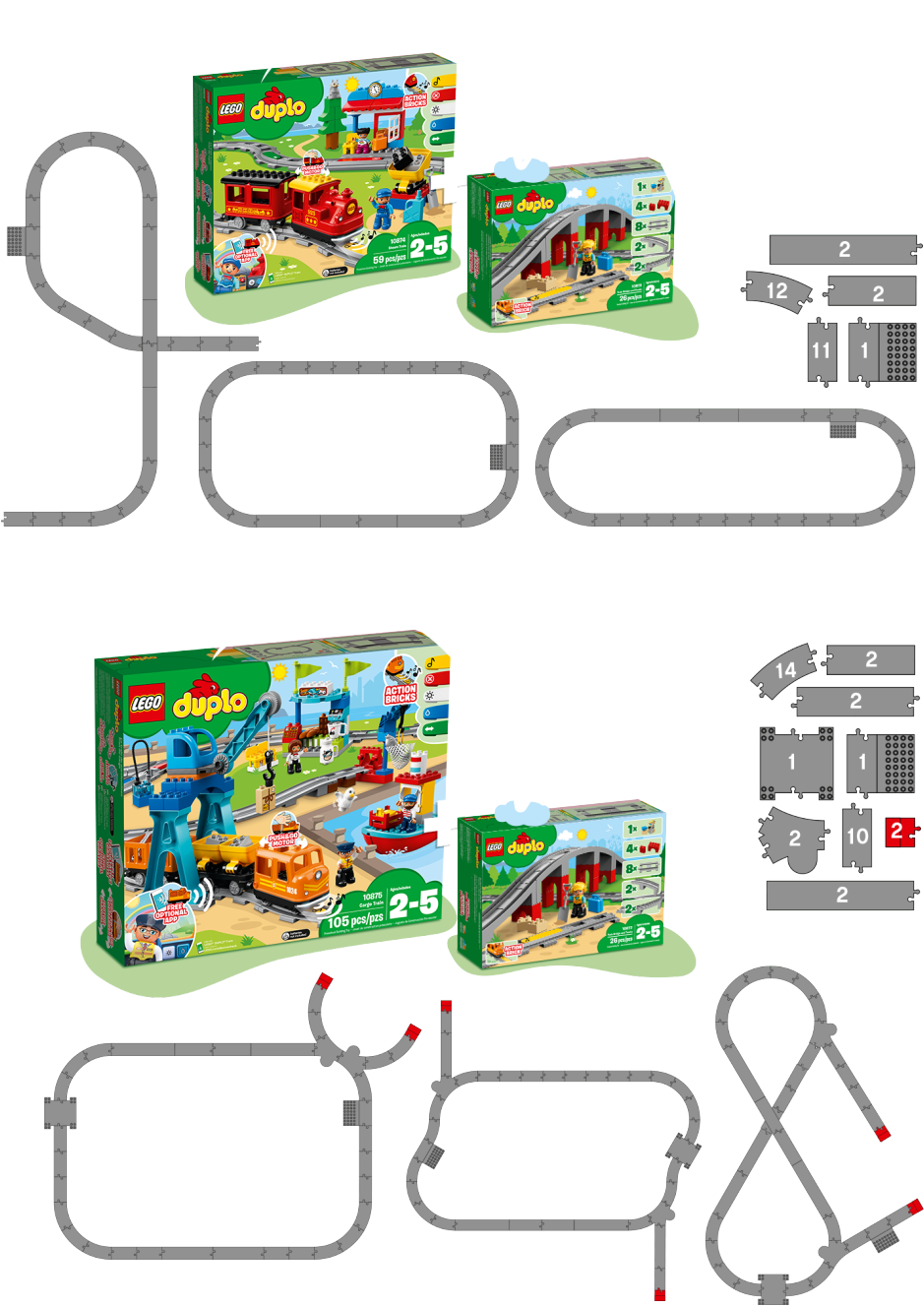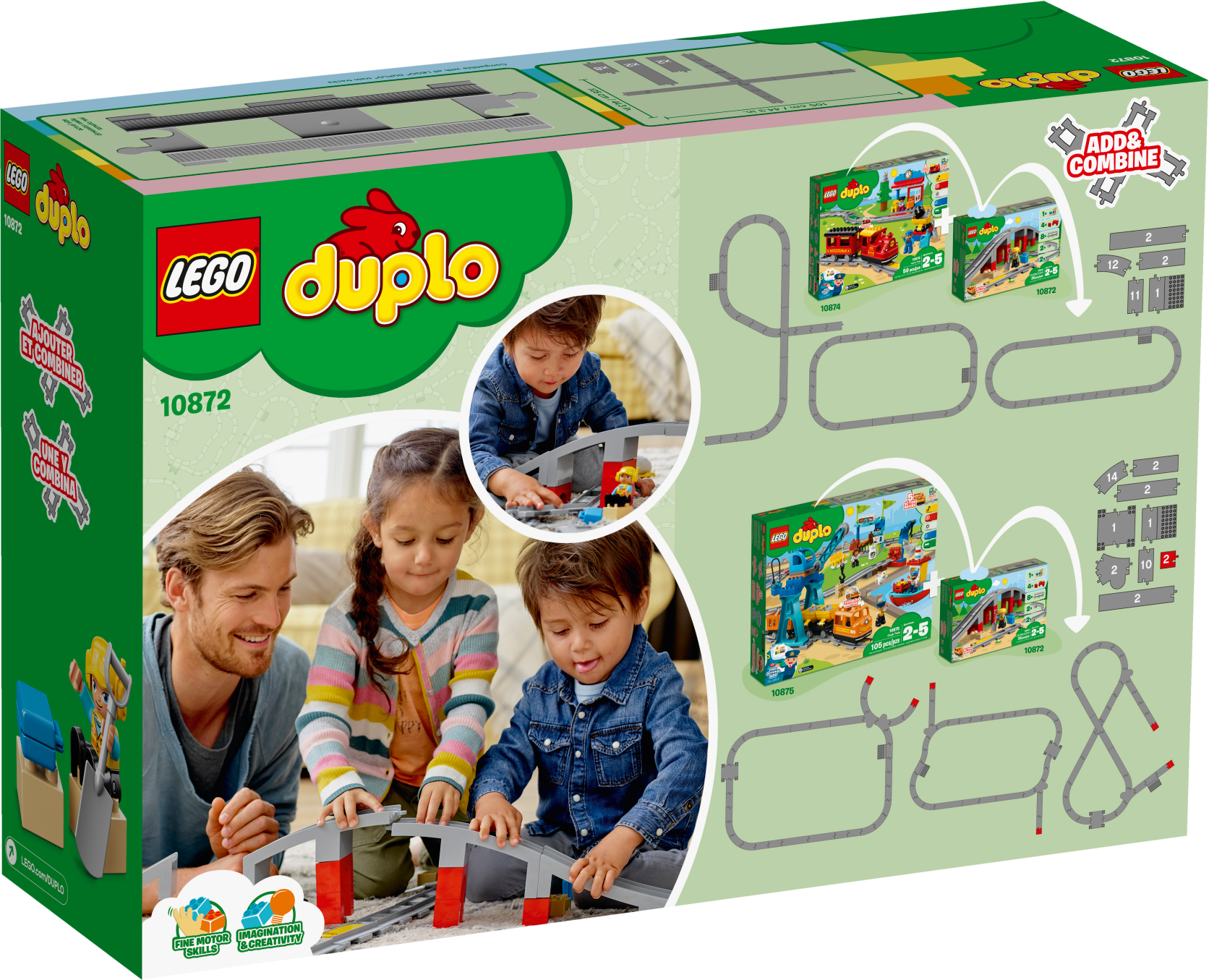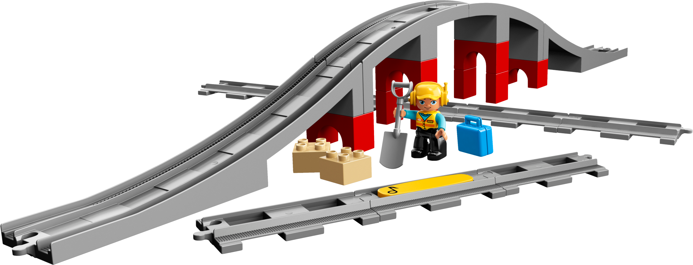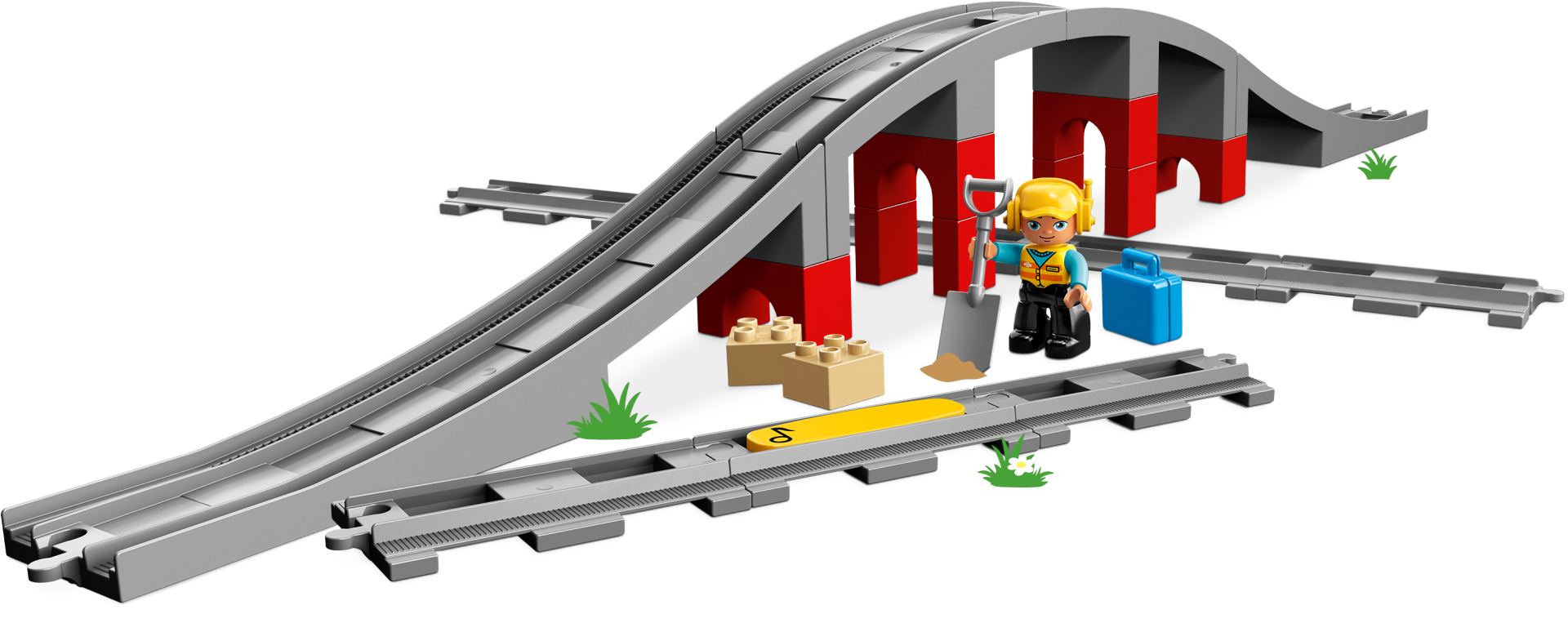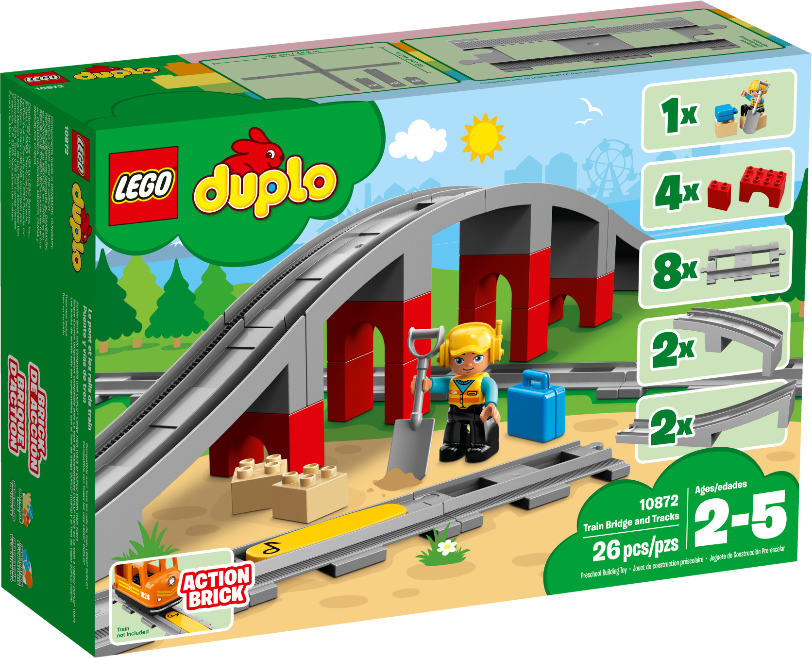 Add this LEGO® DUPLO® 10872 Train Bridge and Tracks set to any new or existing DUPLO train set and develop early construction skills as your toddler builds the tall bridge and arranges the toy train track pieces in any way they like. Help your preschooler place the yellow action brick on the track to make compatible DUPLO trains sound a horn as they drive over it. Also includes a LEGO DUPLO construction worker figure, 2 loose bricks, a spade and a suitcase to extend the role-play and story-telling fun. Includes a construction worker LEGO® DUPLO® figure with spade and suitcase accessory elements. Features 8 straight track pieces, 4 sloped pieces to make the bridge and a yellow (horn sound) action brick. Use this set with the 10874 Steam Train or 10875 Cargo Train to extend the possibilities of your LEGO® DUPLO® train collection. Show your child how easy it is to place the yellow action brick on the track to make any compatible LEGO® DUPLO® train, such as the 10874 Steam Train or 10875 Cargo Train, sound the horn as it passes over. The tracks included in this set are compatible with your child’s existing LEGO® DUPLO® train collection. Includes 2 loose brick, spade and suitcase elements to extend the role-play and story-telling options. These toy train tracks make an ideal gift for preschool train fans. LEGO® DUPLO® products are specially designed to be fun and easy for little hands. Combine with 10882 Train Tracks for even more track combinations and LEGO® DUPLO® train fun. Bridge measures over 4” (12cm) high at its highest point.