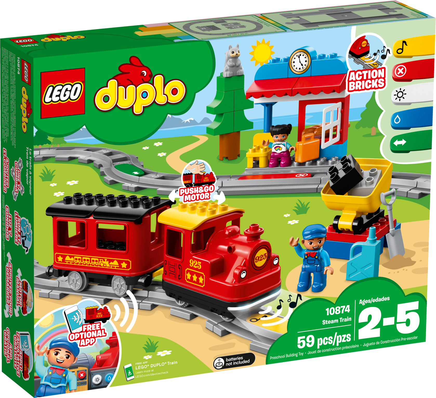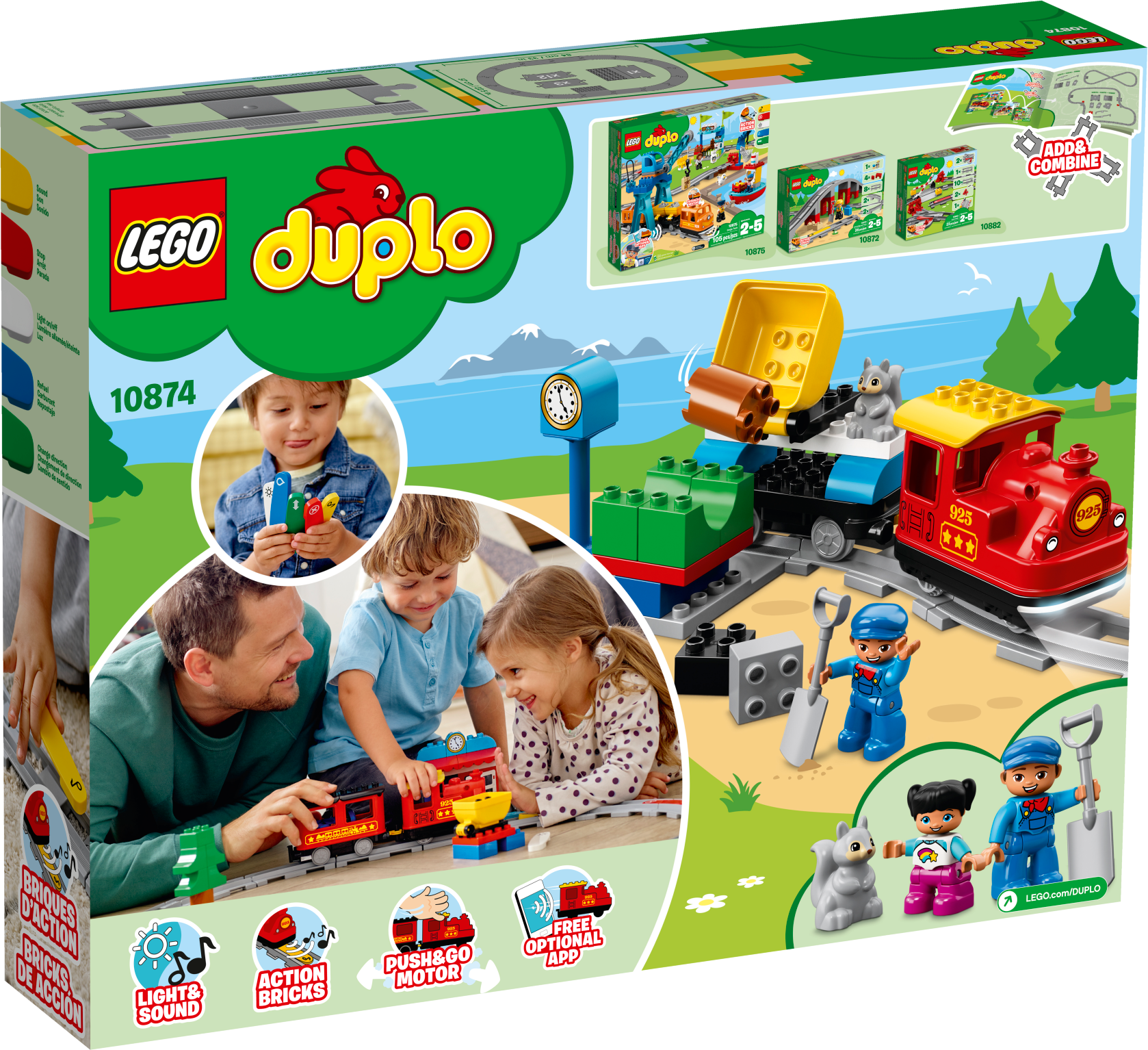 The LEGO® DUPLO® 10874 Steam Train is now even easier for your toddler to control and interact with in multiple ways. Young children can become the train driver with the Push & Go motor — a gentle push either forwards or backwards sends the train on its way and a firm hold or lift off the tracks will make it stop. Help them place the 5 colored action bricks along the track to sound the horn, turn the lights on and off, pause and refuel, change direction and stop the train wherever they like. With a train station, coal tipper, 2 DUPLO figures plus an animal figure and a simple toy train track included in this LEGO DUPLO set, preschoolers can enjoy classic, fun train play. Download the optional app to unlock even more play possibilities, including remote-control function and fun activities to complete with your toddler!
