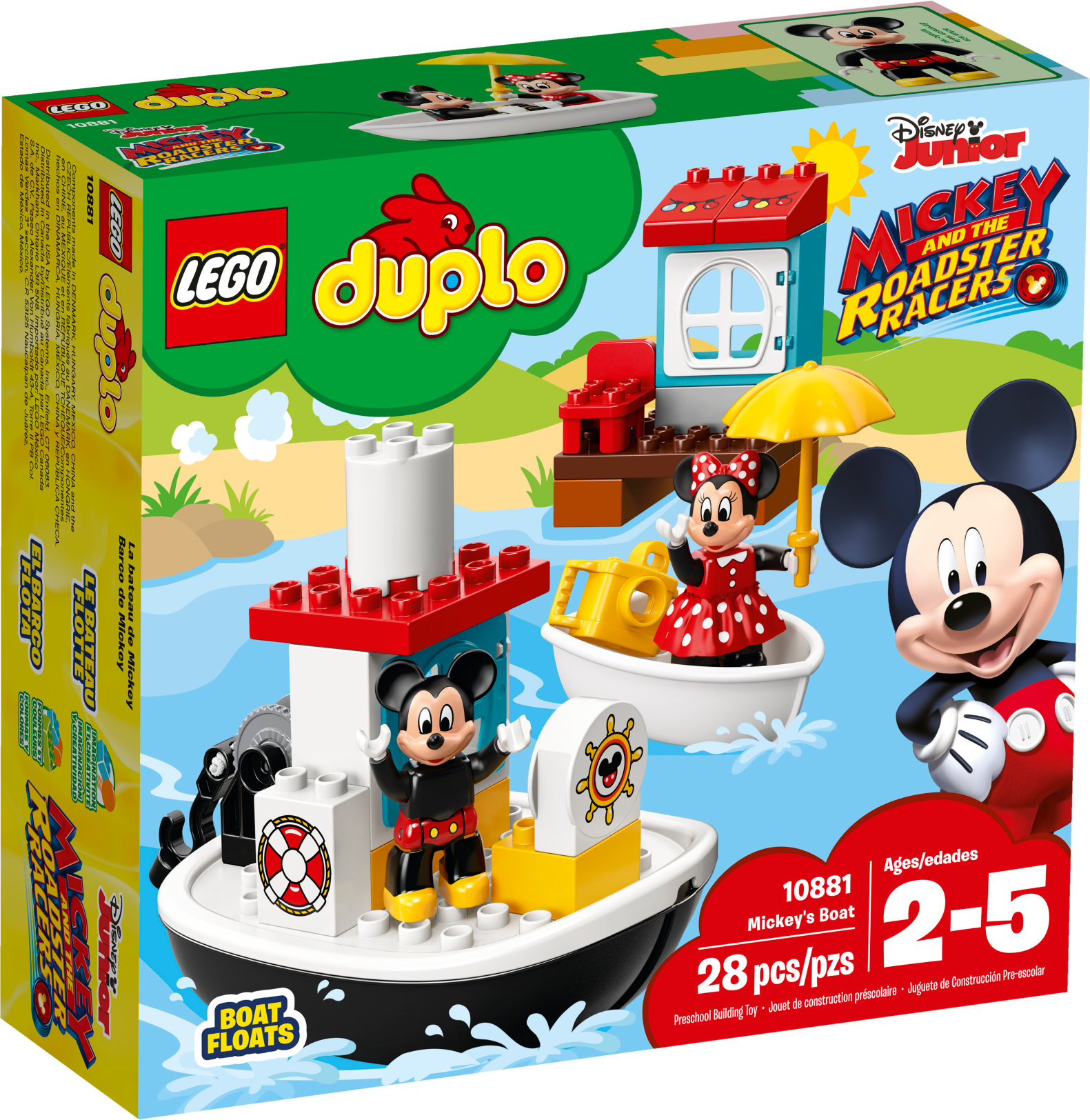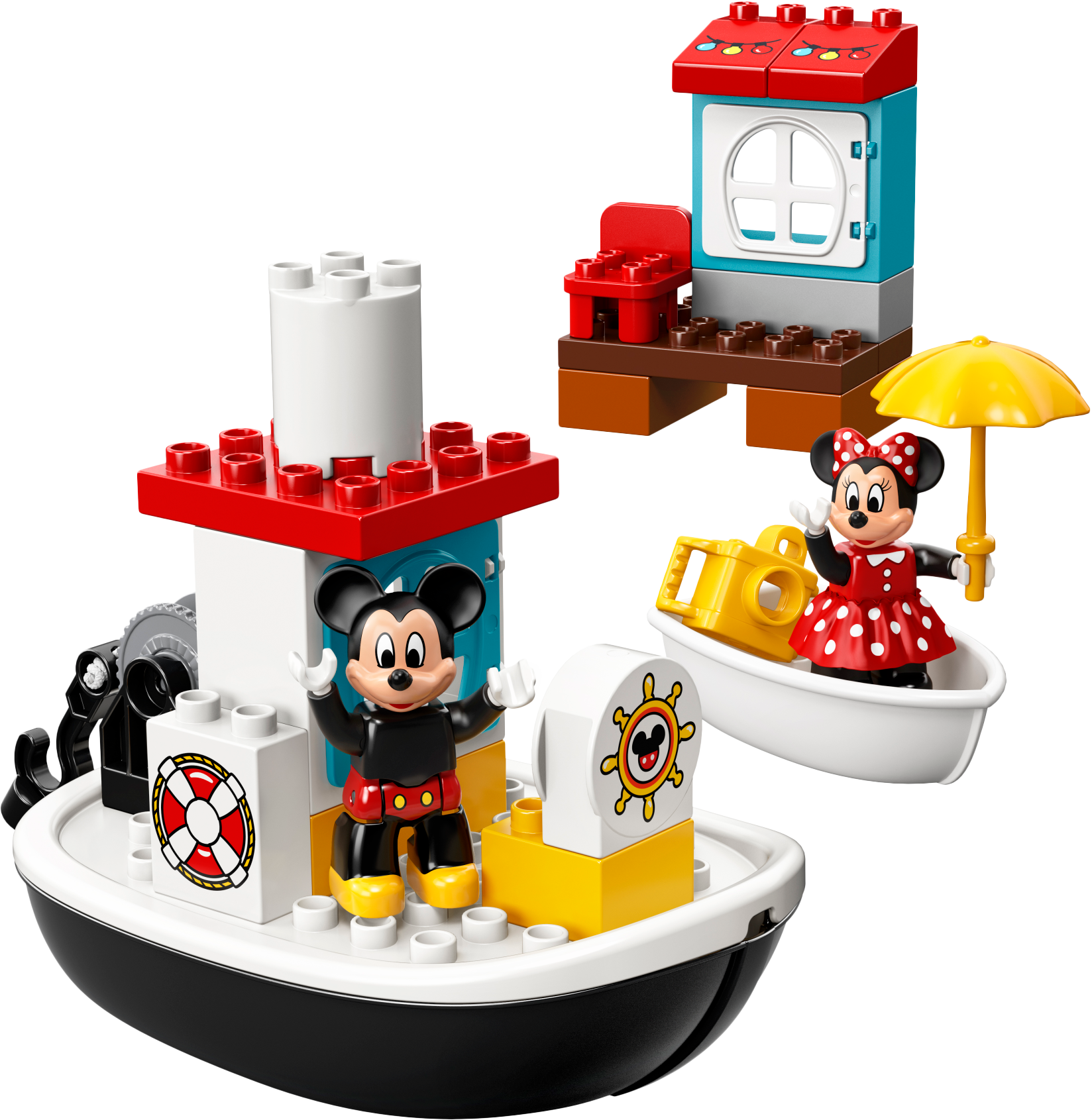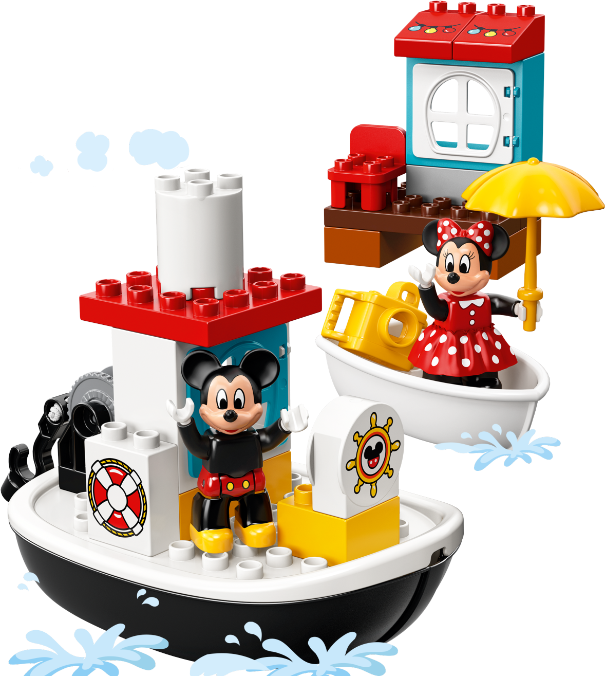 Little Disney fans will love to launch from the pier in LEGO® DUPLO® 10881 Mickey’s Boat for a super fun boat parade on the water. Help your child develop fine motor skills as they build the pier and boat, which has a classic Disney look and feel to it. Play with them as they help Mickey Mouse drive the steamboat and use the pulley function to tow Minnie Mouse with her parasol in the little rowing boat. Then continue the party at the pier with this fun LEGO DUPLO set. Includes 2 DUPLO figures: Mickey Mouse and Minnie Mouse. Includes 2 LEGO® DUPLO® figures: Disney’s Mickey Mouse and Minnie Mouse. Features a steamboat with a brick decorated as a steering wheel and a pulley function, plus a pier with an opening window, chair and festive lighting decoration. Accessory elements include a rowing boat, camera and a parasol. Set sail with Mickey Mouse on his amazing steamboat, and help him use the camera element to pretend to take pictures of the boat parade. Use the pulley rope to tow Minnie Mouse in her rowing boat. Build the pier with its festive lights to add to the party mood! Help your child master basic construction skills with this easy-to-build LEGO® DUPLO® Disney toy. LEGO® DUPLO® products are specially designed to be fun and easy for little hands. Steamboat measures over 6” (16cm) high, 6” (17cm) long and 4” (12cm) wide. Pier measures over 5” (13cm) high, 3” (9cm) wide and 2” (6cm) deep.