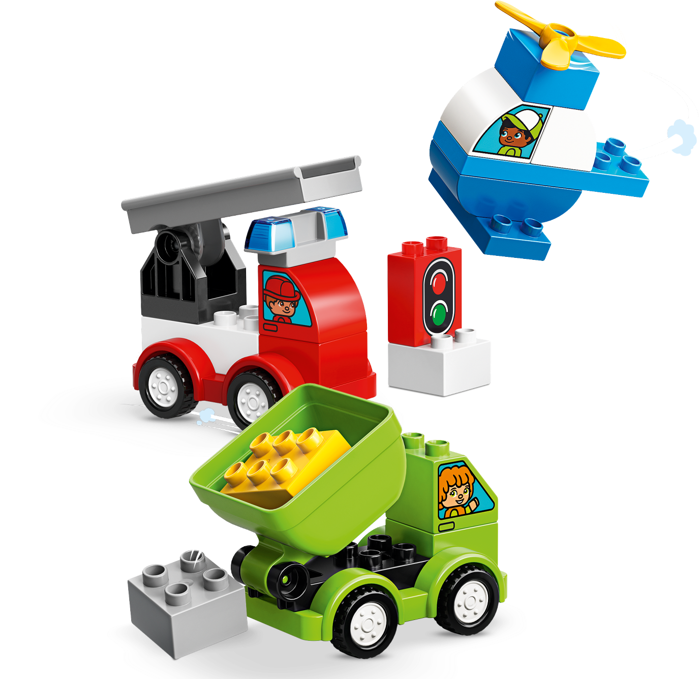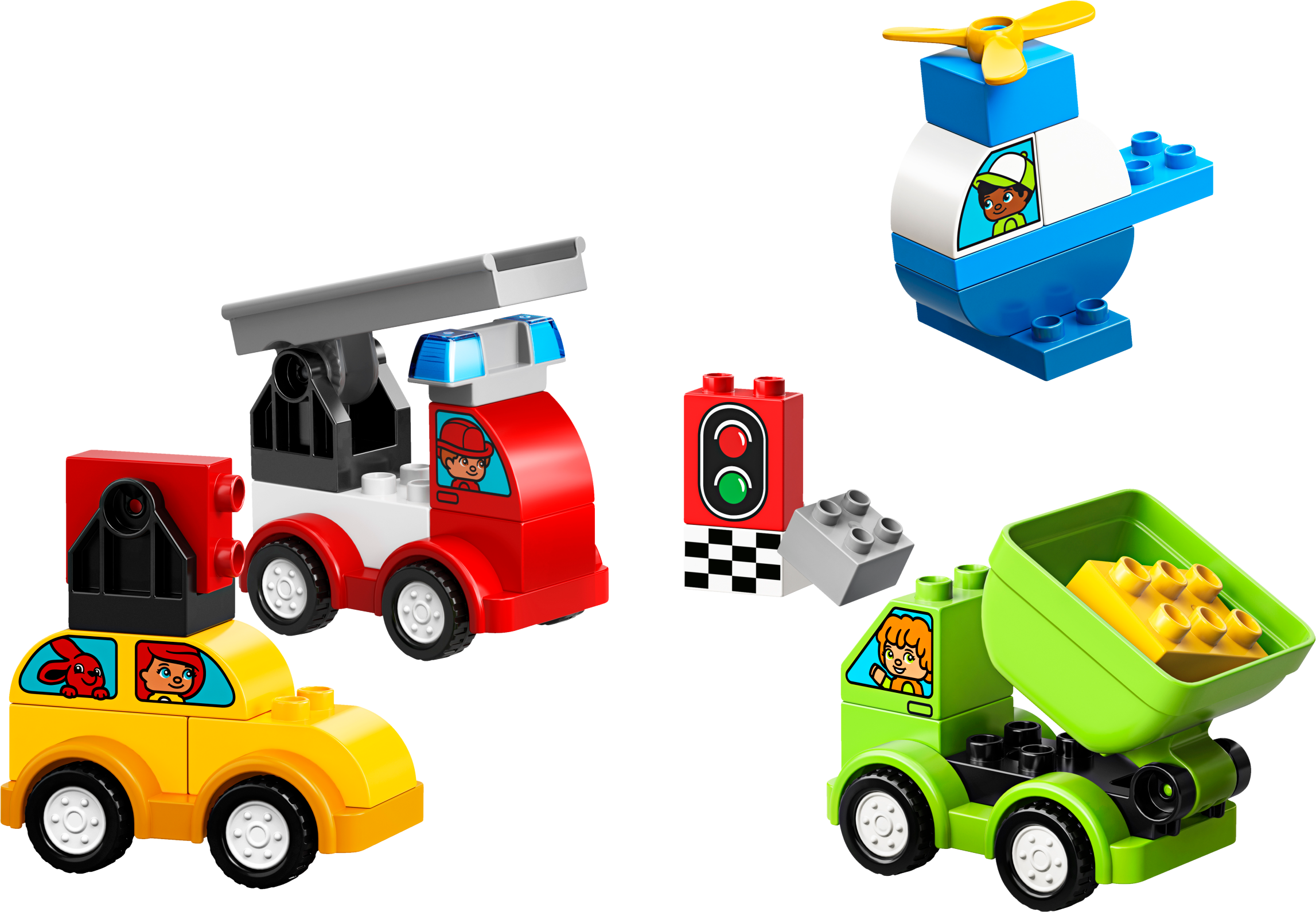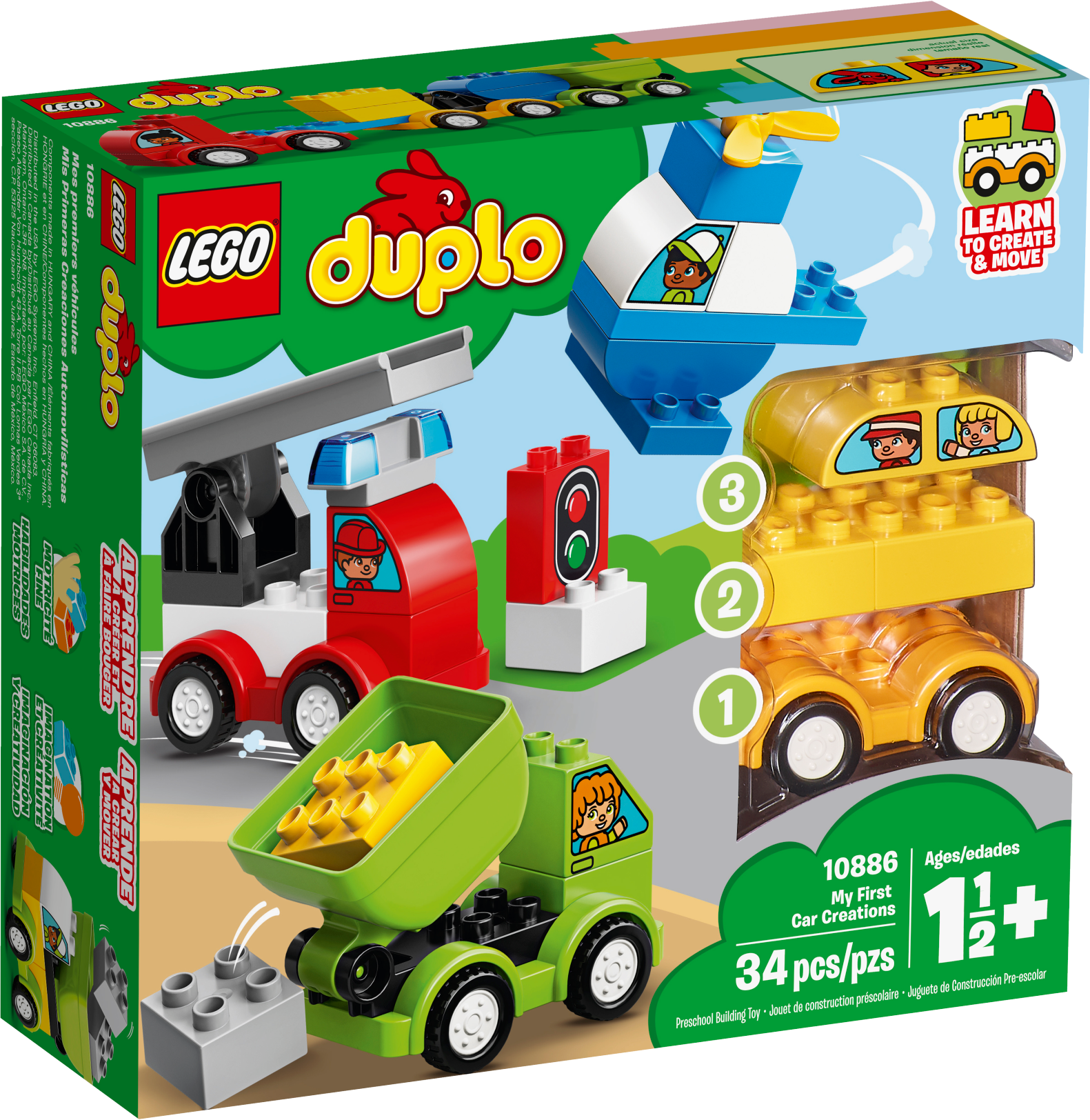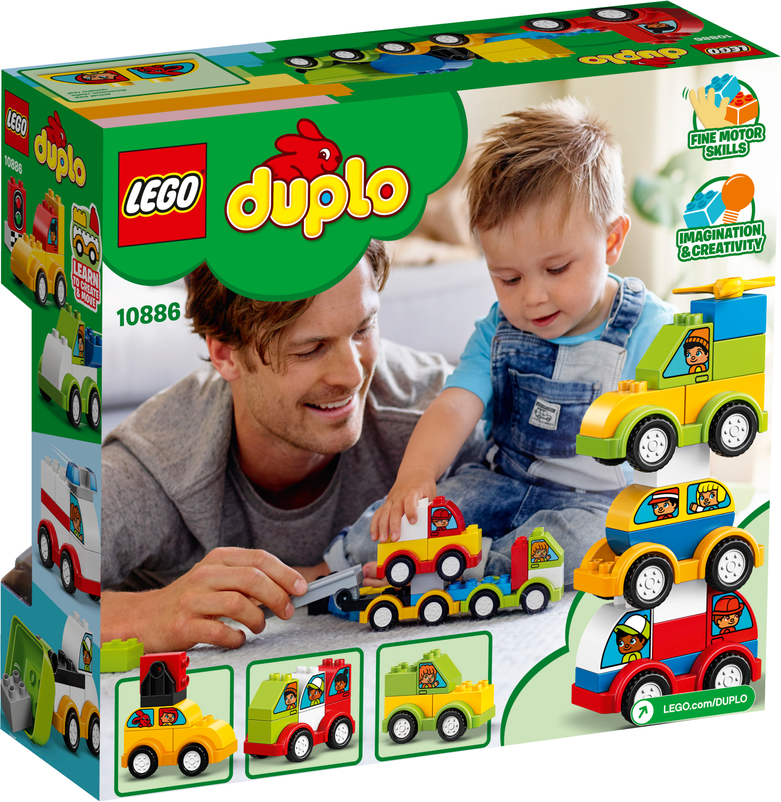 Preschoolers will love to build and rebuild colorful vehicles with LEGO® DUPLO® 10886 My First Car Creations. Help them sort the colors to build a toy helicopter, taxi, garbage truck and Fire Truck for toddlers, or mix up all the bricks and create endless easy-to-build car creations together by combining just a few chunky DUPLO bricks, developing fine motor skills as you go. This toddler toy car set is great for developing imagination as preschoolers learn to create and move with classic car play. DUPLO bricks are specially designed to be fun and safe for small hands. Features 4 buildable LEGO® DUPLO® vehicles: a fire truck, helicopter, taxi and a garbage truck. Includes a brick decorated as a traffic light and decorated bricks with different windows, drivers and passengers. Create and connect with your young child and work on fine motor skills as you build iconic vehicles. Inspire little imaginations as they create all sorts of wonderful, colorful cars of their own! Encourage social and emotional skills as toddlers enjoy role-play fun with the decorated characters traveling in these cute toy cars for kids. These toy cars and trucks for toddlers make an ideal gift for preschool children. The endless creative play possibilities of LEGO® DUPLO® toys set the stage for toddlers to become creative thinkers. LEGO® DUPLO® products are specially designed to be fun and easy for small hands. Fire truck measures over 4” (11cm) high, 3” (9cm) long and 2” (6cm) wide. Helicopter measures over 3” (9cm) high, 3” (9cm) long and 2” (6cm) wide. Taxi measures over 2” (6cm) high, 3” (9cm) long and 2” (6cm) wide. Garbage truck measures over 2” (7cm) high, 3” (10cm) long and 2” (6cm) wide.