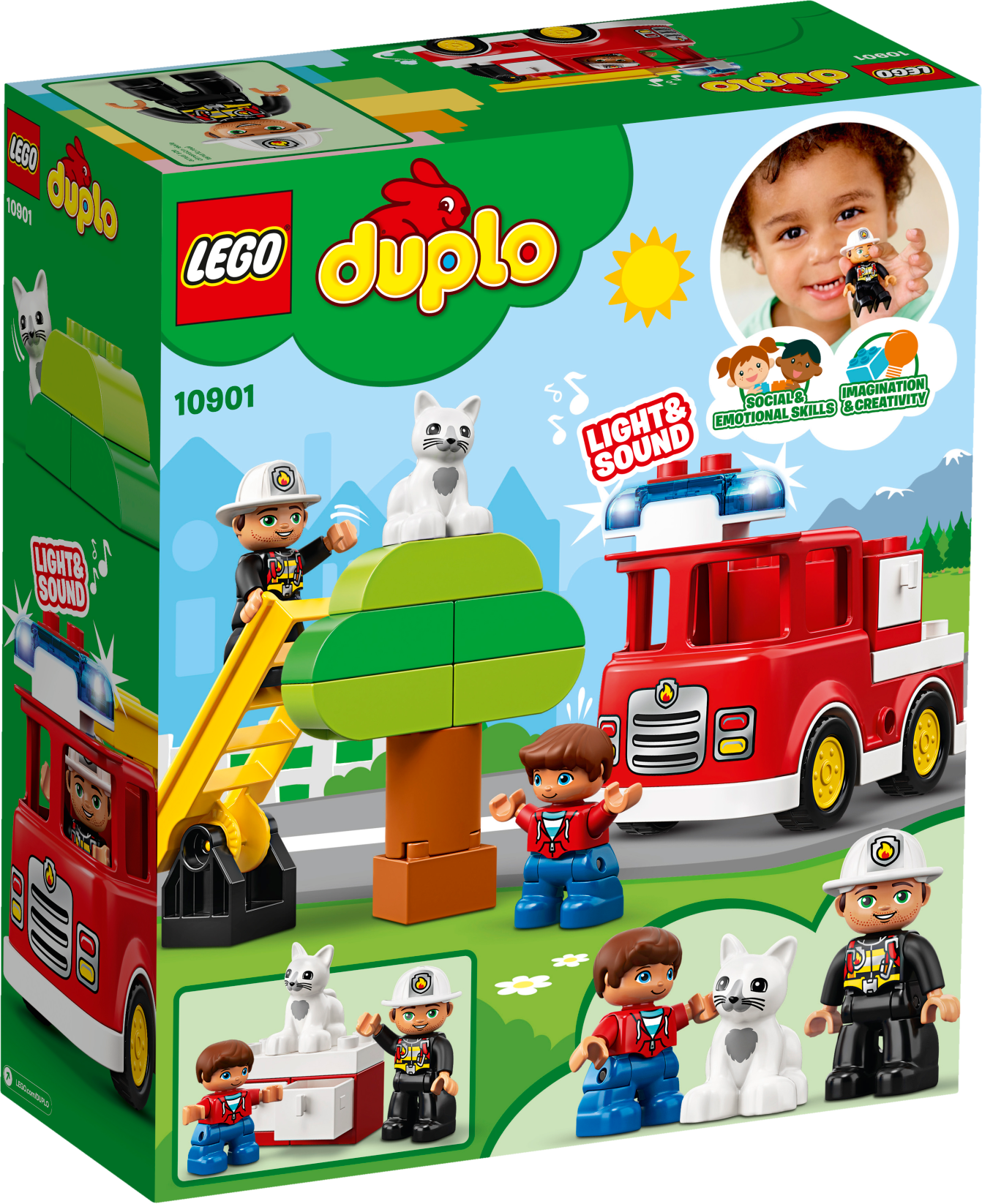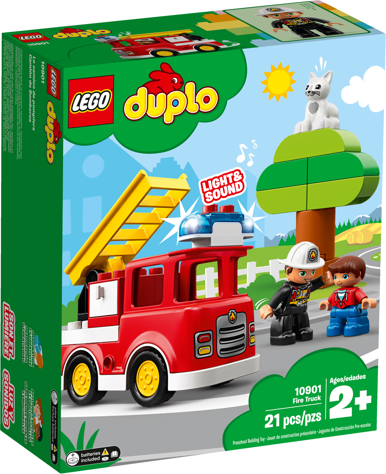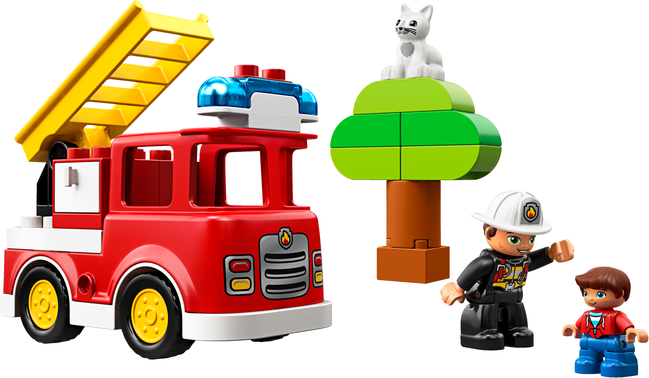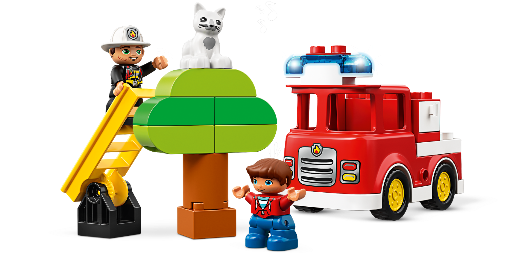 Play out real-life scenarios in LEGO® DUPLO® Town: a recognizable world with modern DUPLO figures. Help your little firefighter rush to the rescue in the 10901 Fire Truck for kids with flashing blue light and siren sound! This fire truck toy is easy to build with an opening drawer and a ladder. Toddlers will love to help the firefighter rescue the cat from the buildable tree! Includes 2 DUPLO figures and a cat figure. Includes 2 LEGO® DUPLO® figures: a firefighter and a child, plus a cat figure. Features a fire truck for children with flashing light and siren sound, tilting ladder and an opening drawer, plus a buildable tree. Press the button to activate the lights and sounds, and speed to the rescue in this red fire truck toy for toddlers! Help the brave firefighter climb the ladder to rescue the cat in the tree. Use the modern characters to have fun while role-playing rescue situations and celebrating real-life heroes. Help your child master basic construction skills with this easy-to-build model. This firefighter toy makes an ideal gift for preschool children. LEGO® DUPLO® products are specially designed to be fun and easy for little hands. There are several LEGO® DUPLO® Town products to collect and play out your child's everyday life in a recognizable DUPLO world. Combine with the 10903 Fire Station for even more firefighter-themed fun. Fire truck measures over 3” (10cm) high, 5” (14cm) long and 2” (7cm) wide.