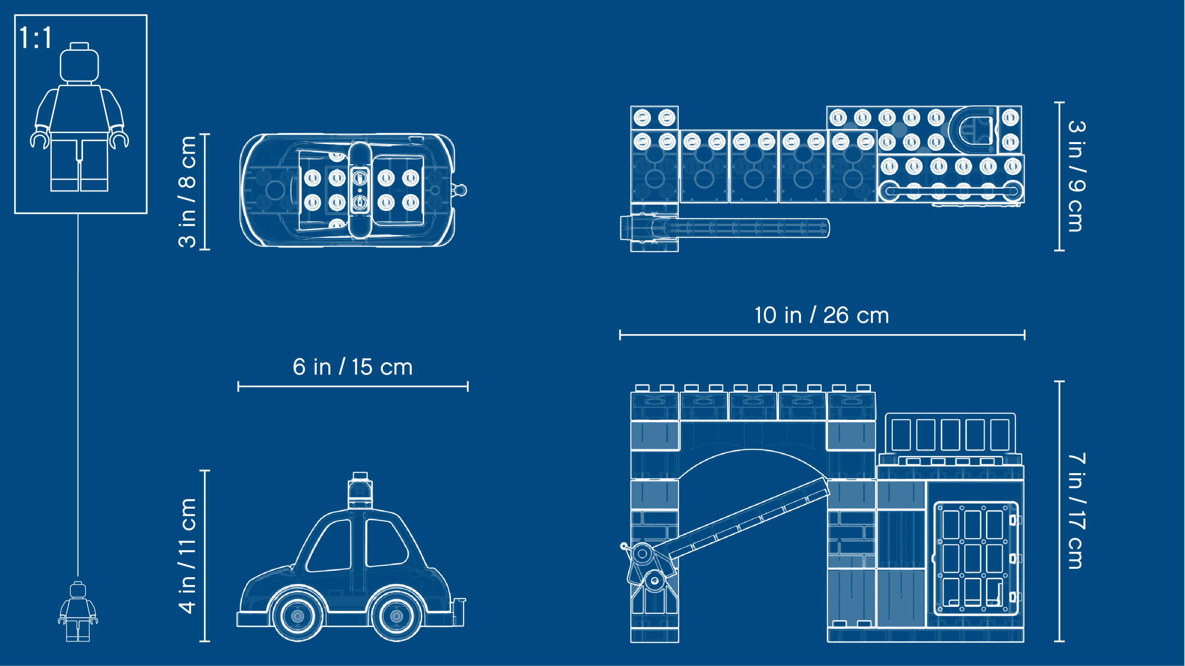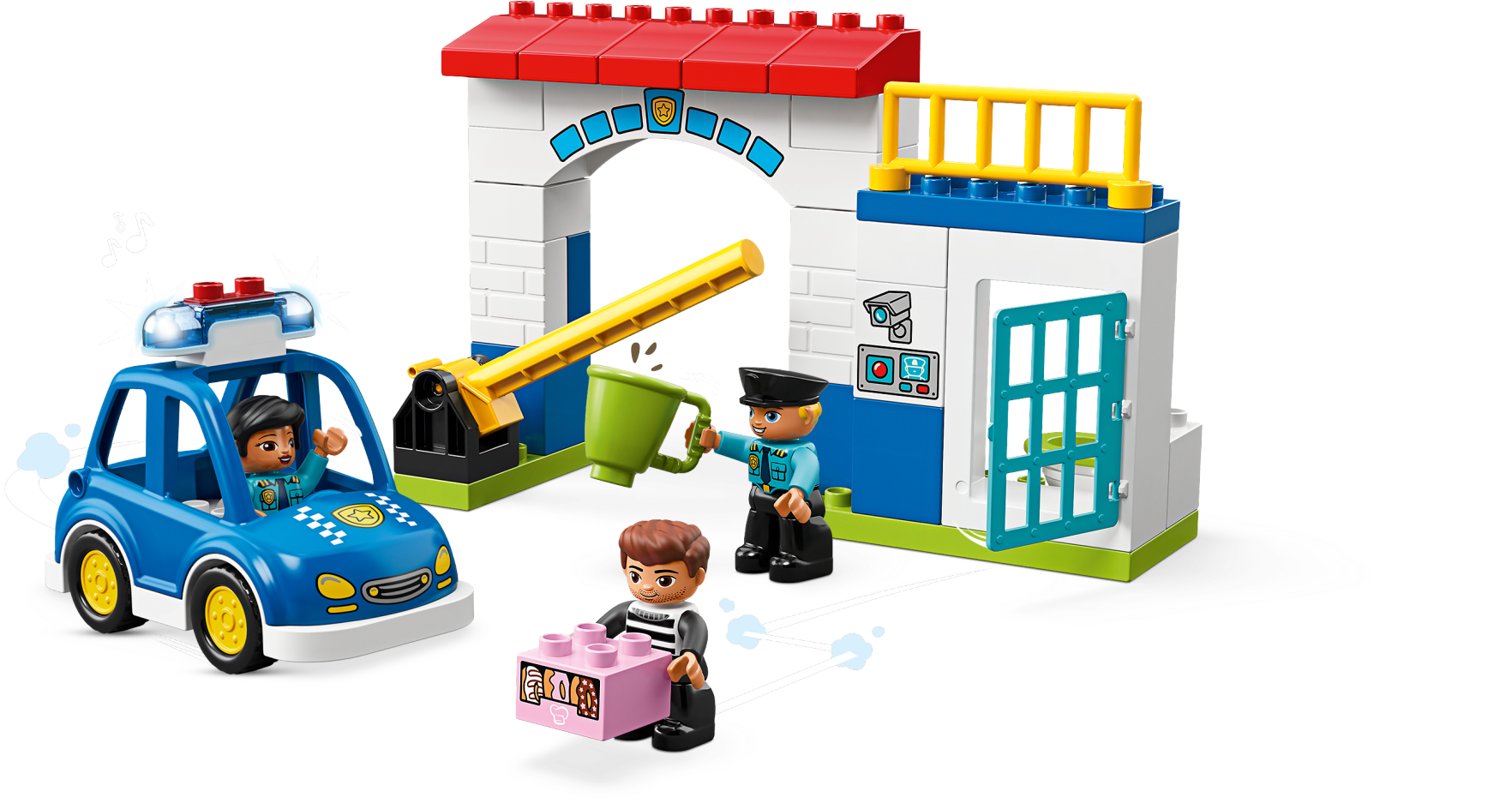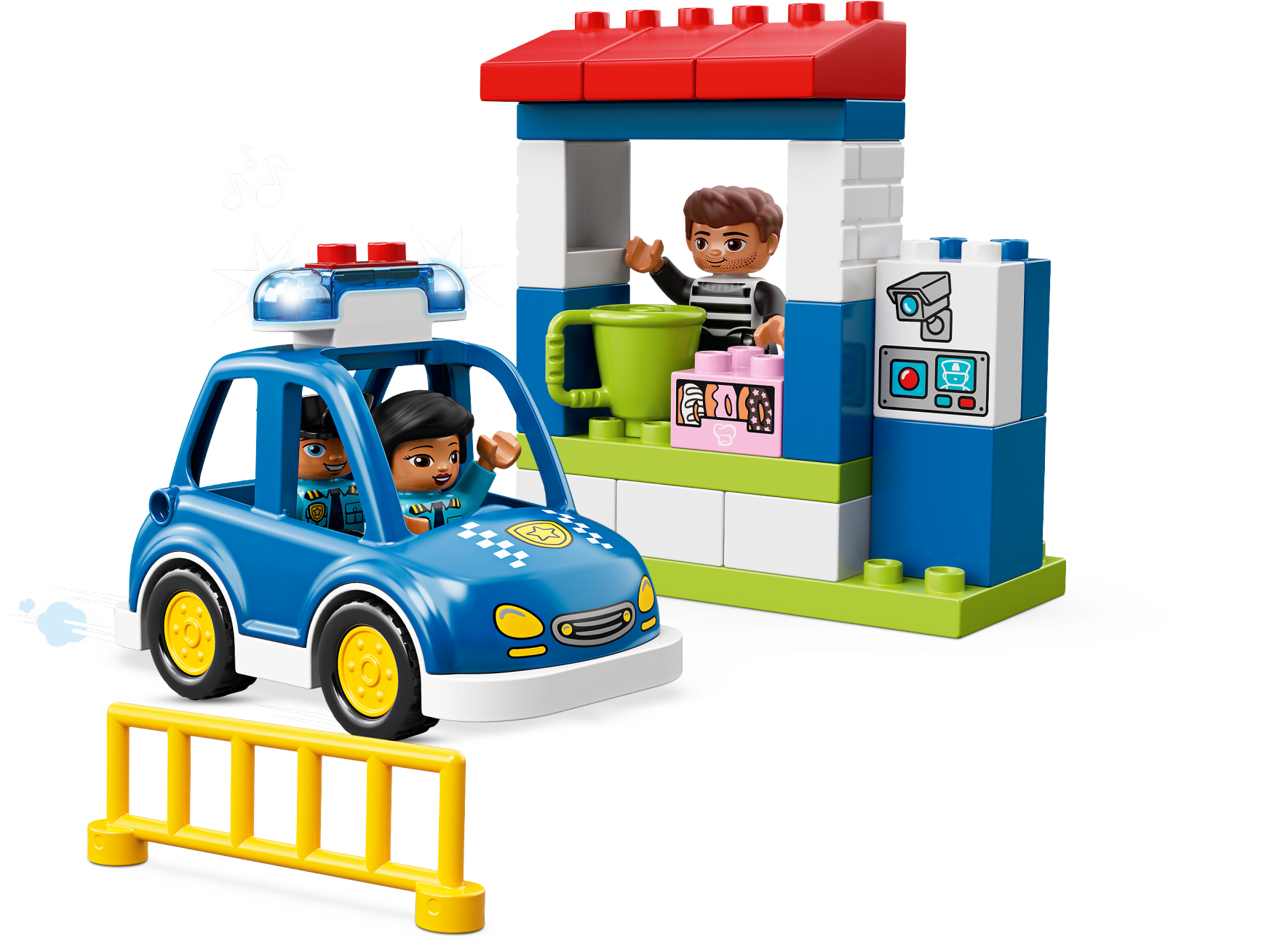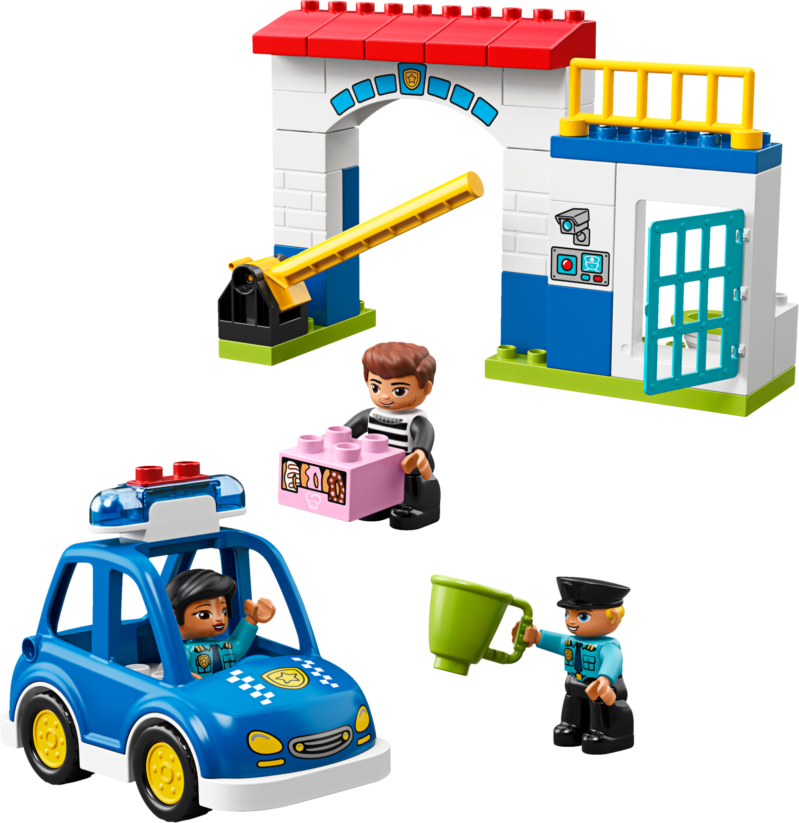 Play out real-life scenarios in LEGO® DUPLO® Town: a recognizable world with modern DUPLO figures. Preschoolers will love creating stories through pretend play at the easy-to-build 10902 Police Station. Help the police officers whizz out in the police car with flashing lights and siren sound to catch the crook on the run with the police officer's doughnuts! Then take him back to the toy police station and lock him safely in the jail cell. Includes 3 DUPLO figures. Includes 3 LEGO® DUPLO® figures: 2 police officers and a crook. Features an easy-to-build police station with opening cell door and a toy police car with lights and siren sound. Accessory elements include a mug, plus bricks decorated as doughnuts and a security camera. Press the button to activate the police car siren and lights. Catch the crook and take him to the toy police station with jail. Use the modern characters, accessories and decorated bricks to have fun while helping your toddler learn about the police and how they help us. Help your child master basic construction skills with this easy-to-build model. This police toy for kids makes an ideal gift for preschool children. LEGO® DUPLO® products are specially designed to be fun and easy for little hands. There are several LEGO® DUPLO® Town products to collect and play out your child's everyday life in a recognizable DUPLO world. Combine with the 10900 Police Bike for even more police-themed fun. Police station measures over 6” (17cm) high, 9” (25cm) wide and 3” (10cm) deep. Police car measures over 4” (11cm) high, 5” (15cm) long and 2” (7cm) wide.